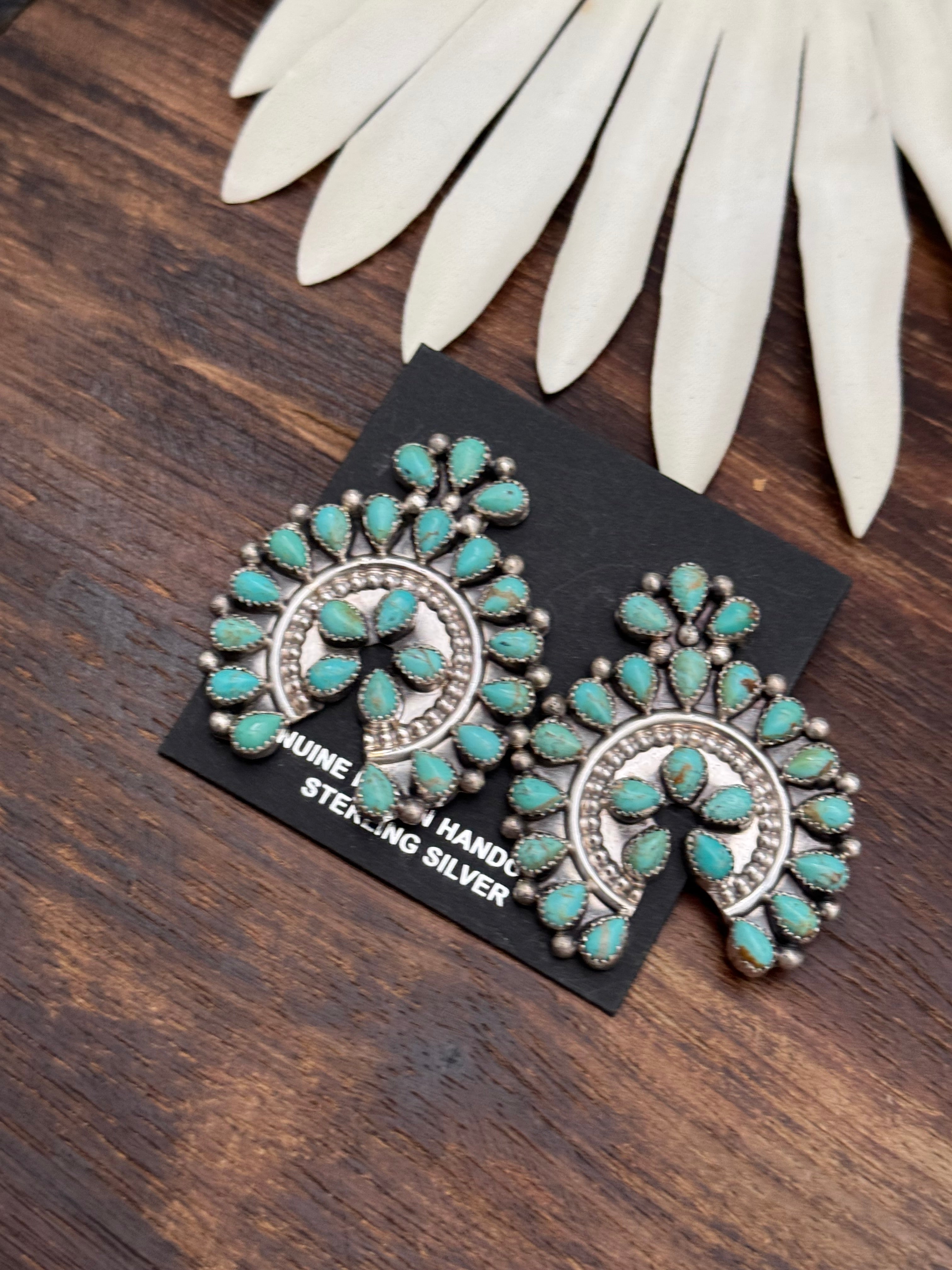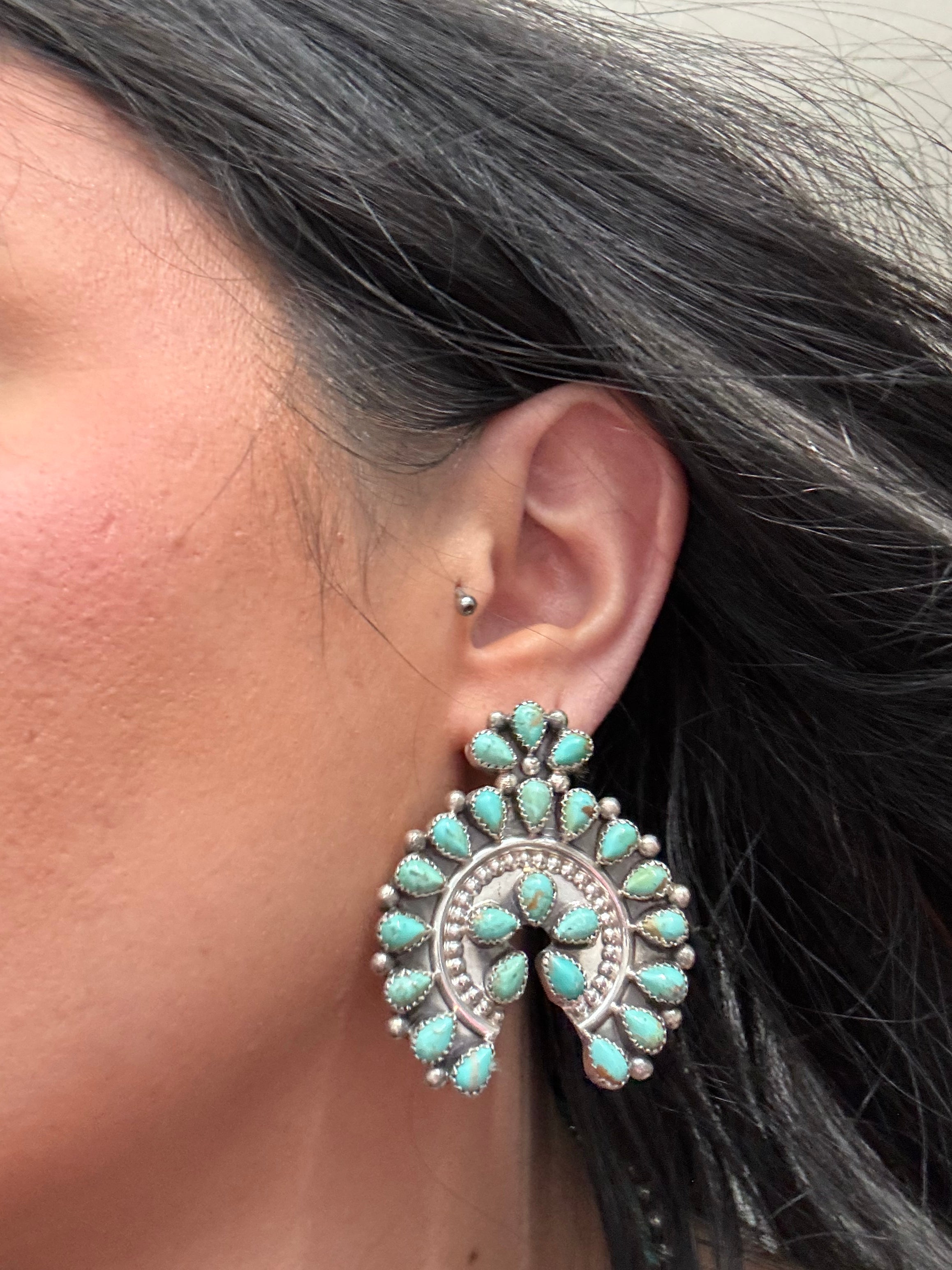 Beautiful dangle earrings. Navajo Made Kingman Turquoise & Sterling Silver Post Dangle Cluster Naja Earrings. It measures 2 7/8 inches long and 1 5/8 inches wide.