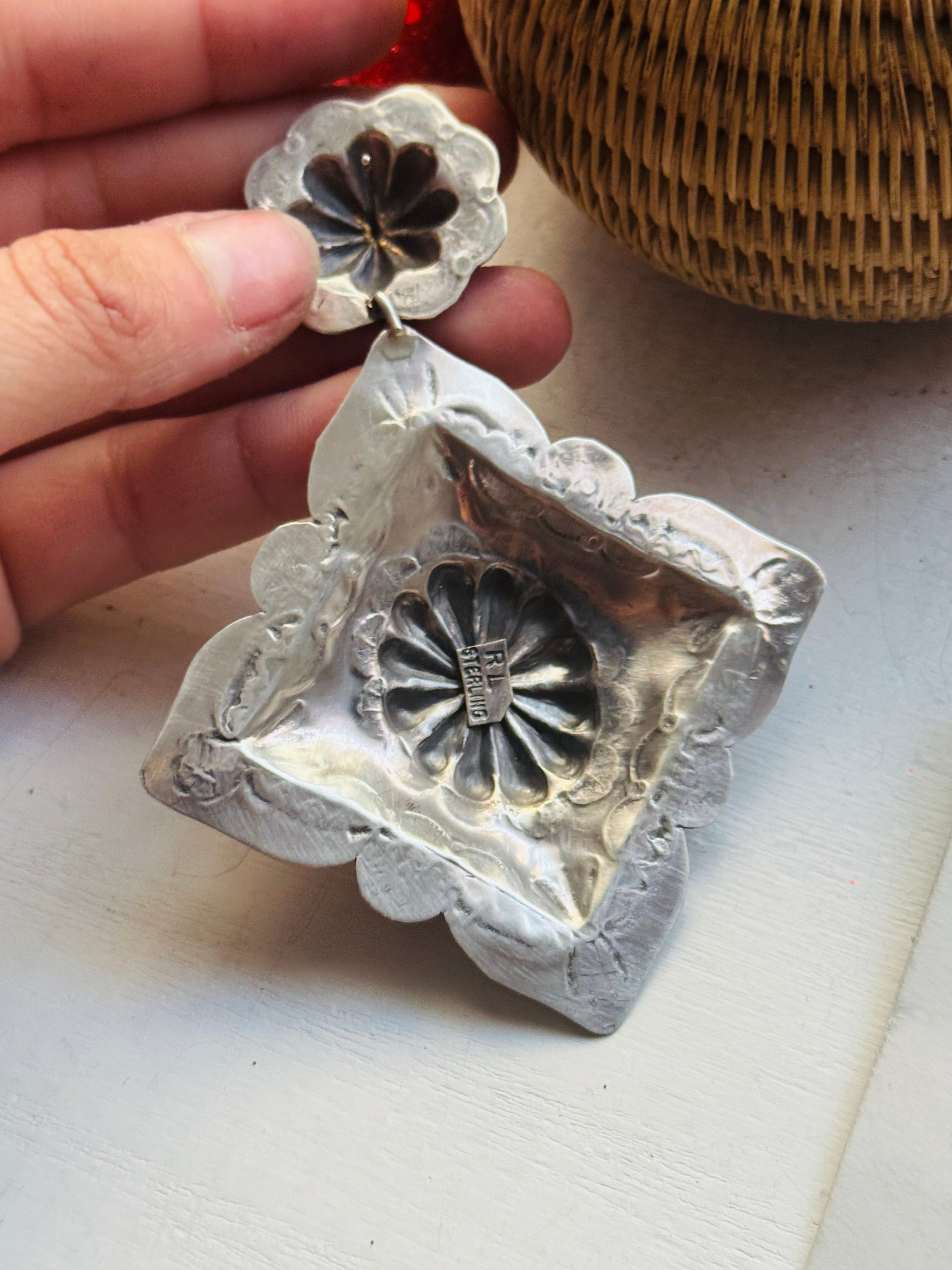 In love with these everyday dangle earrings. Rita Lee Kingman Turquoise & Sterling Silver Post Dangle Concho Earrings. It measures 4 inches long and 2 7/8 inches wide. Stamped and signed.