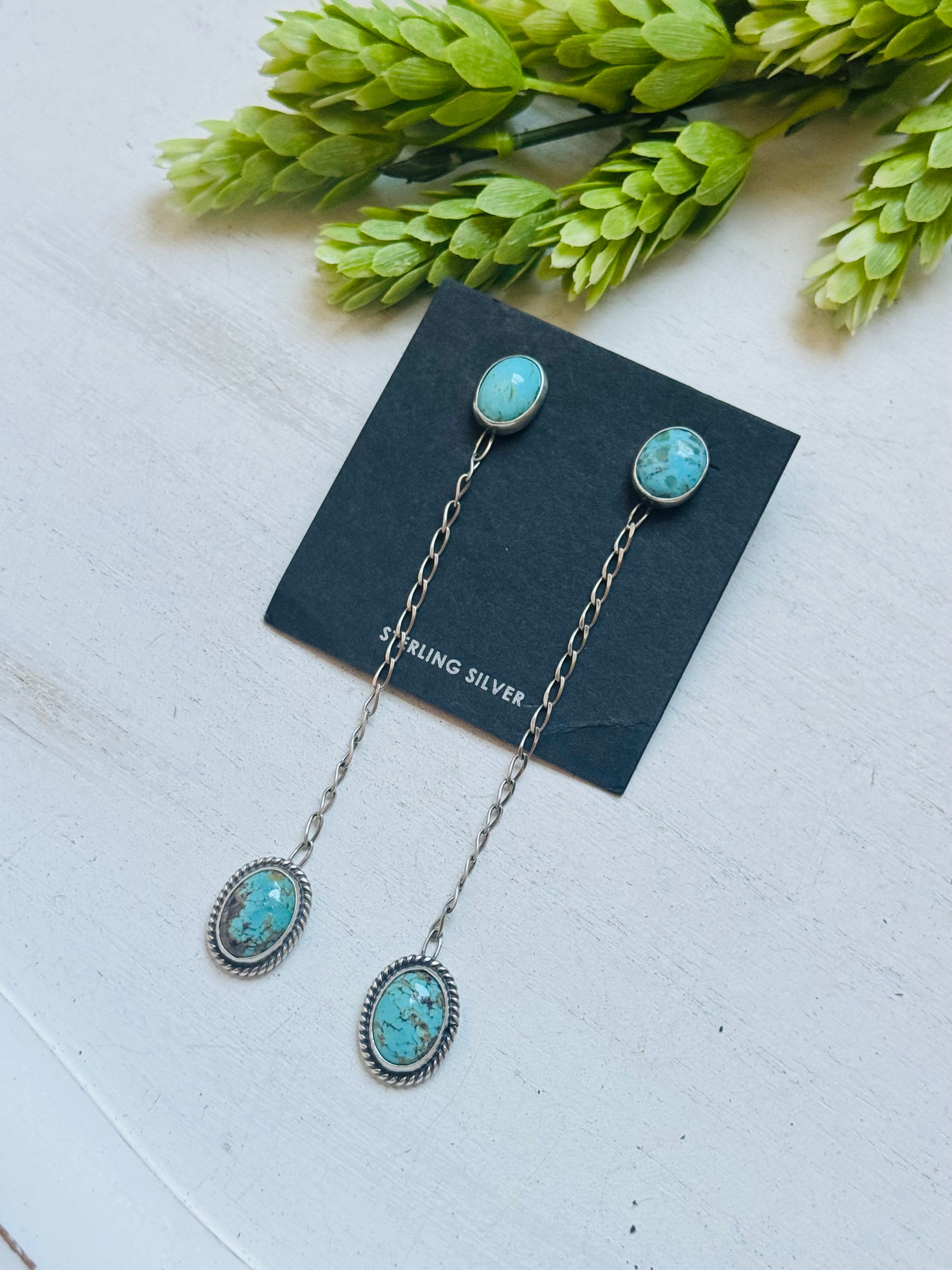 Beautiful dangle earrings.Navajo Made Kingman Turquoise & Sterling Silver Post Dangle Earrings. It measures 3 3/8 inches long and 1/2 of an inch wide. Stamped and signed.
