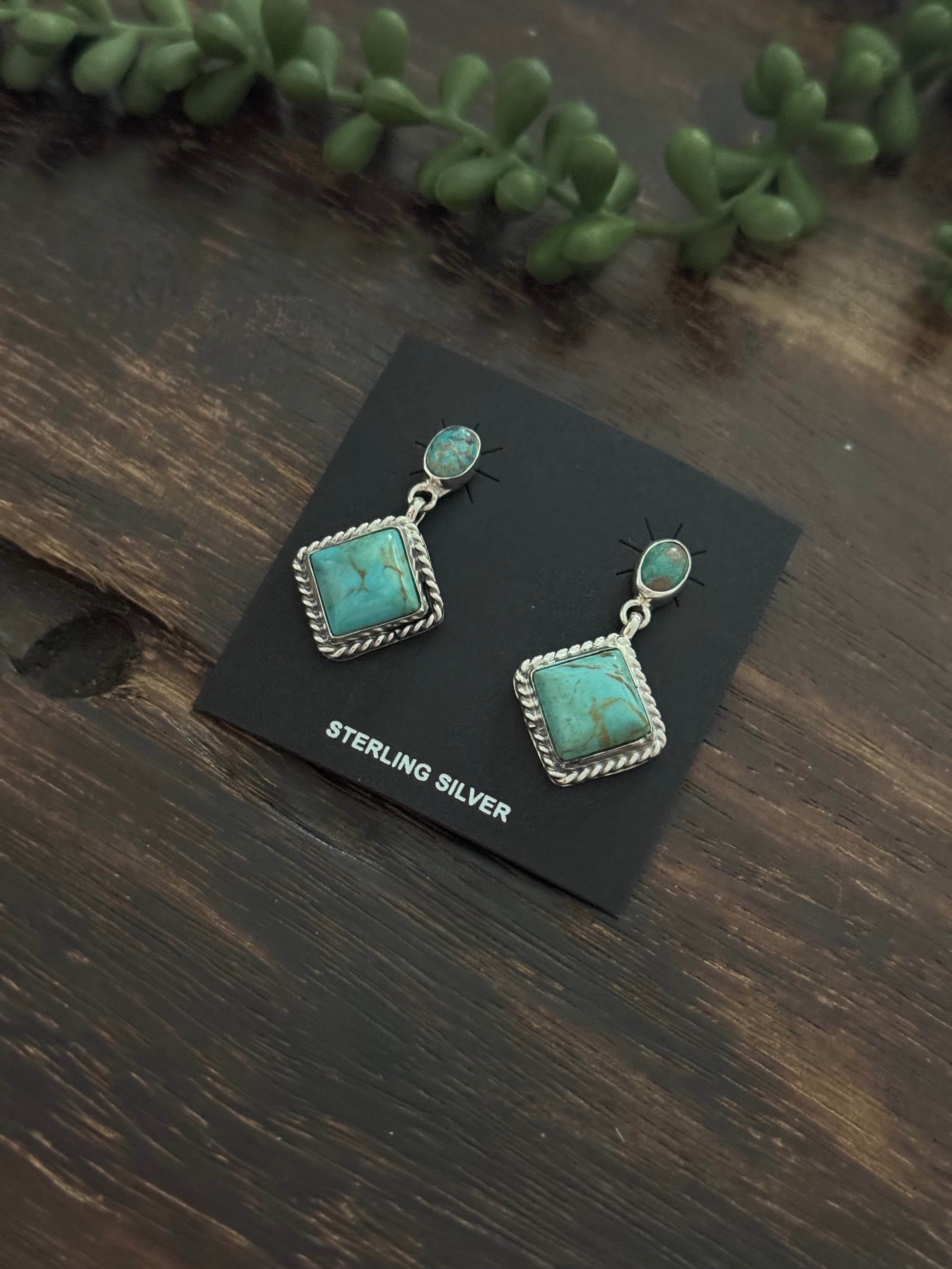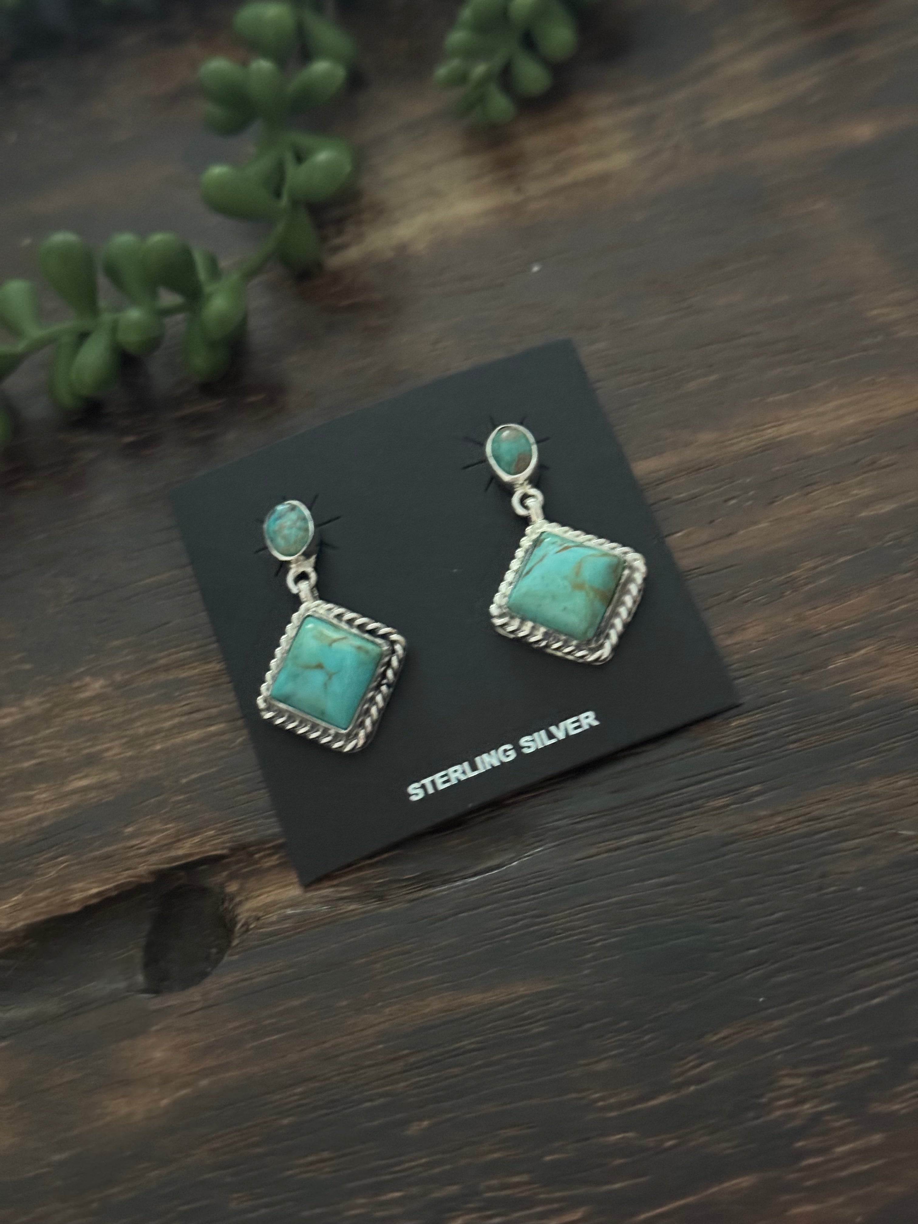 Navajo Made Kingman Turquoise & Sterling Silver Post Dangle Earrings