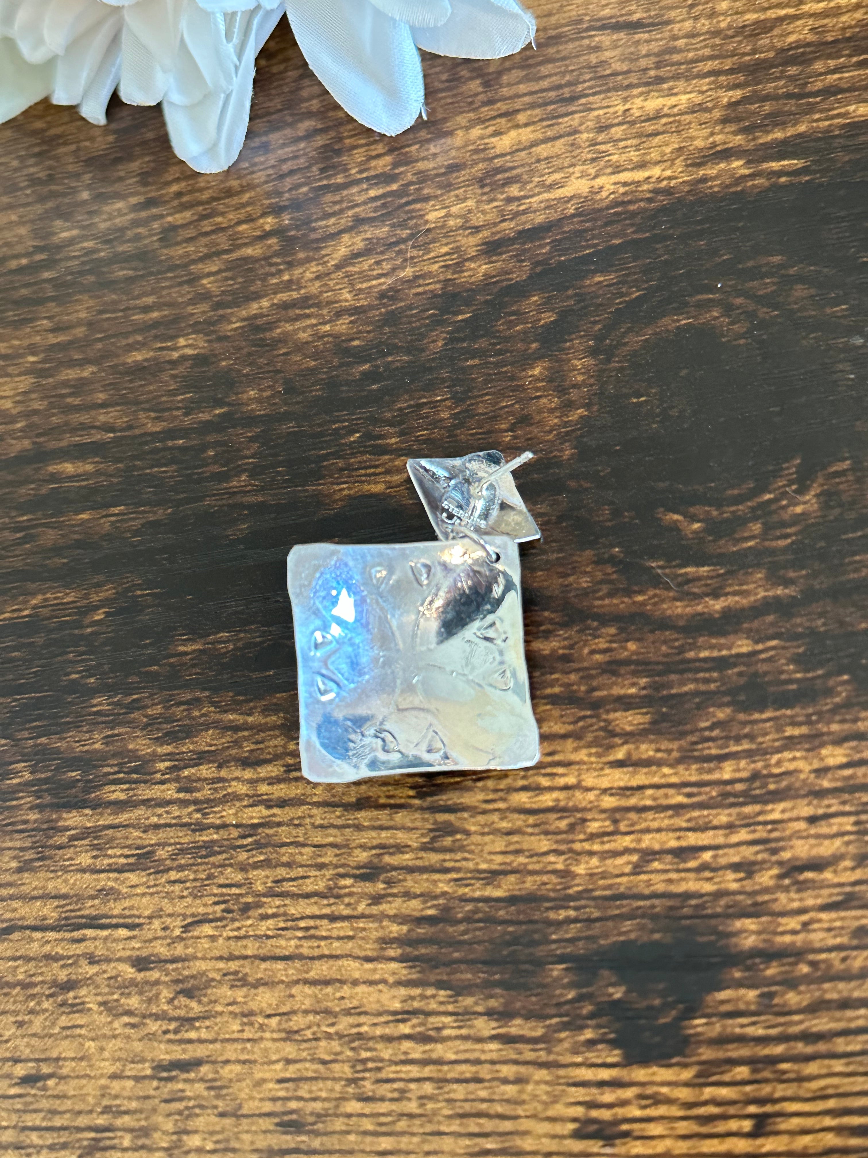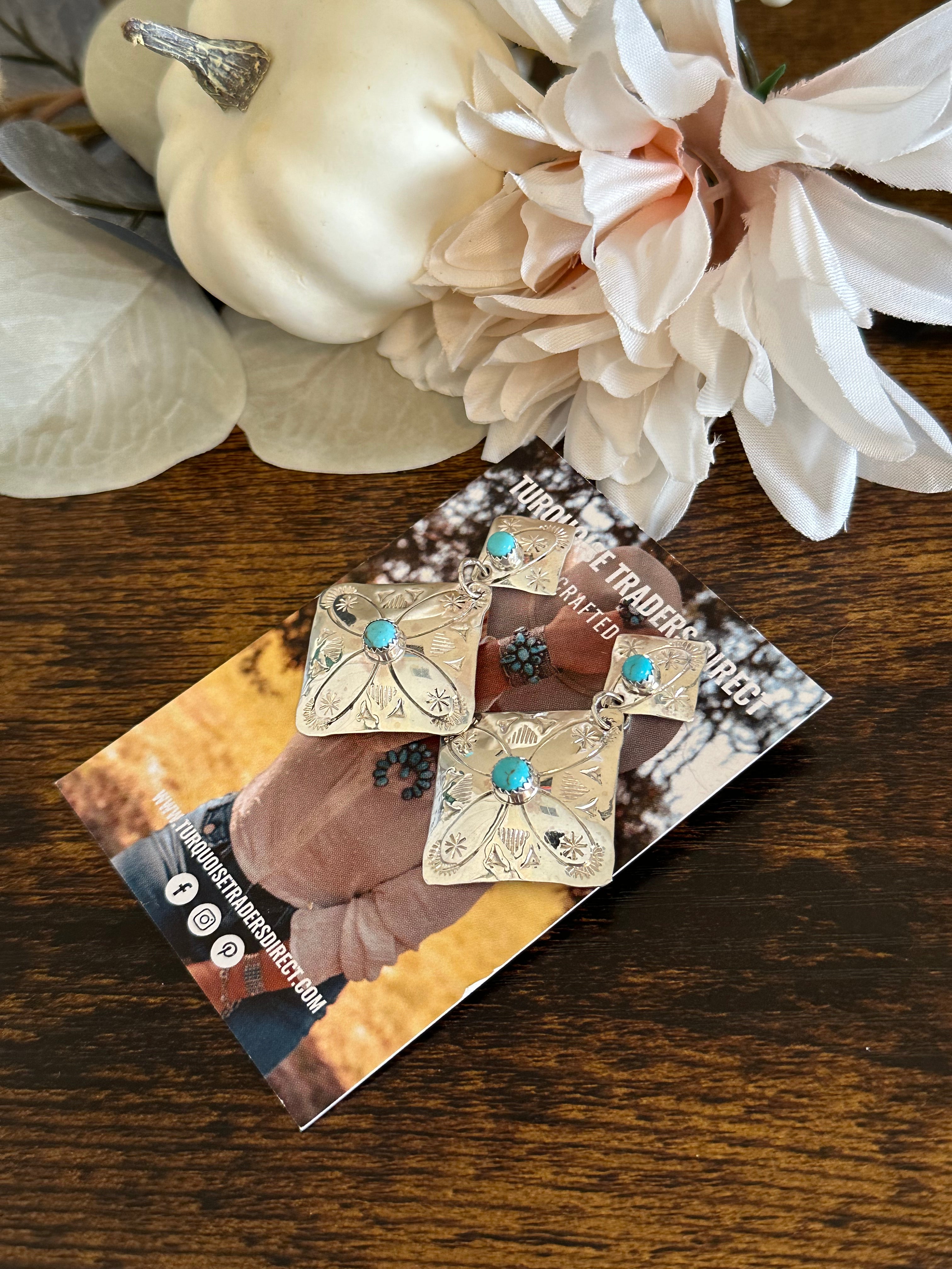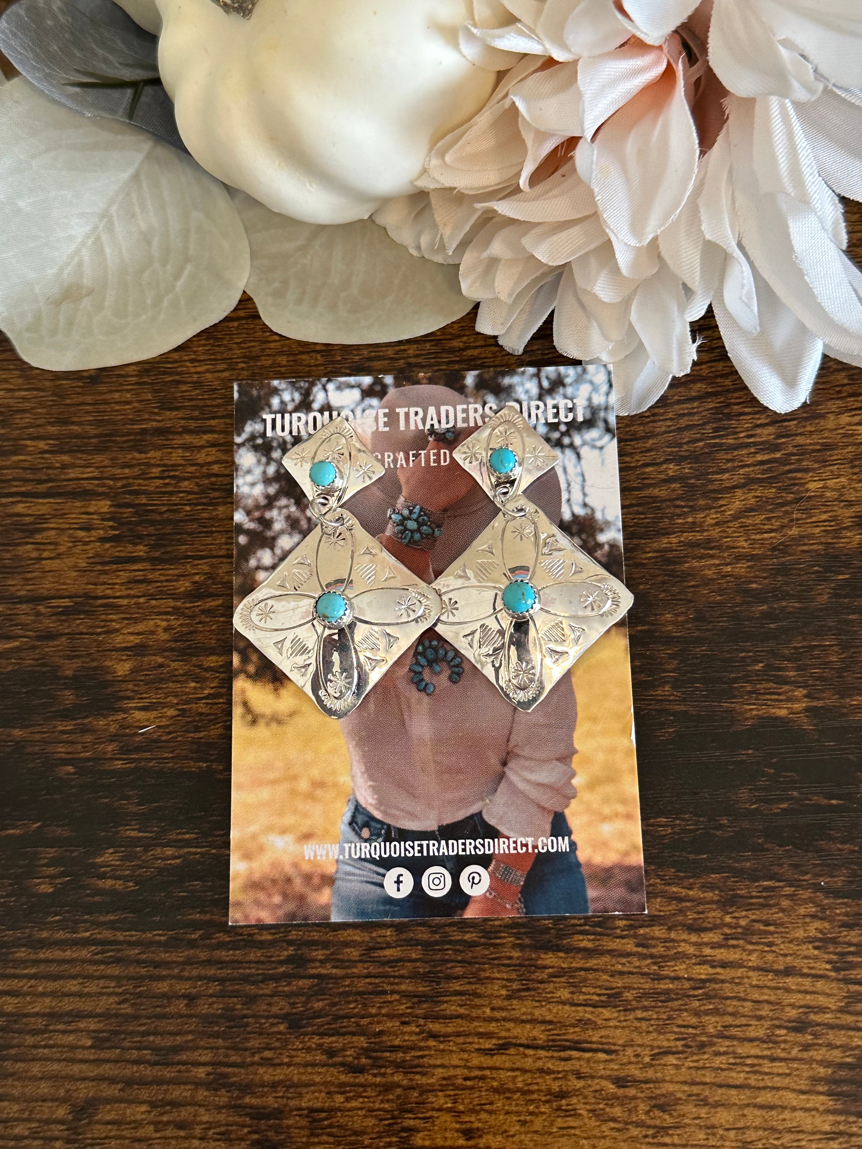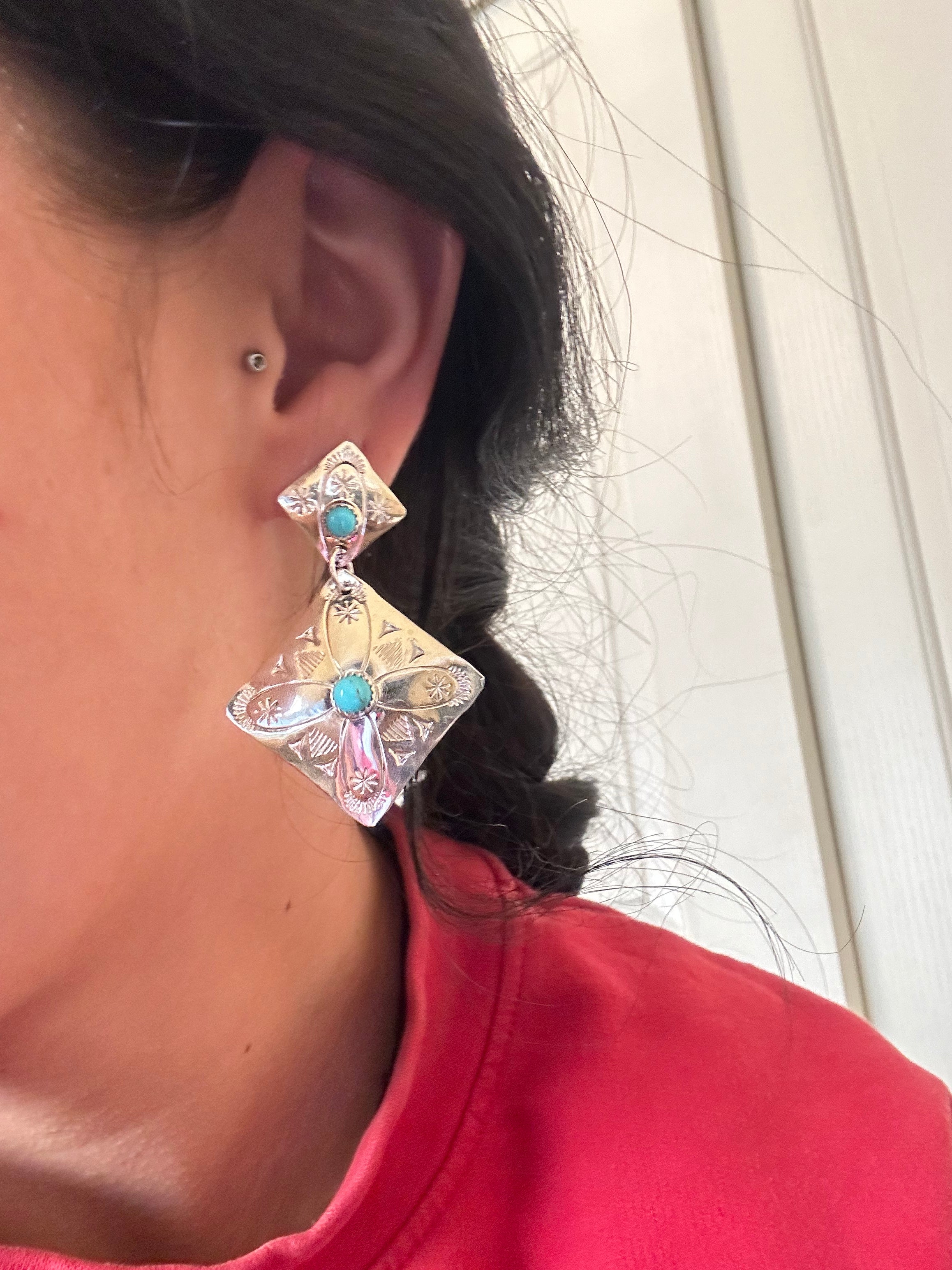 Dreamy earrings. Navajo Made Kingman Turquoise & Sterling Silver Post Dangle Earrings. It measures just over 2 1/8 inches long and 1 3/8 inches wide. Stamped and signed.
