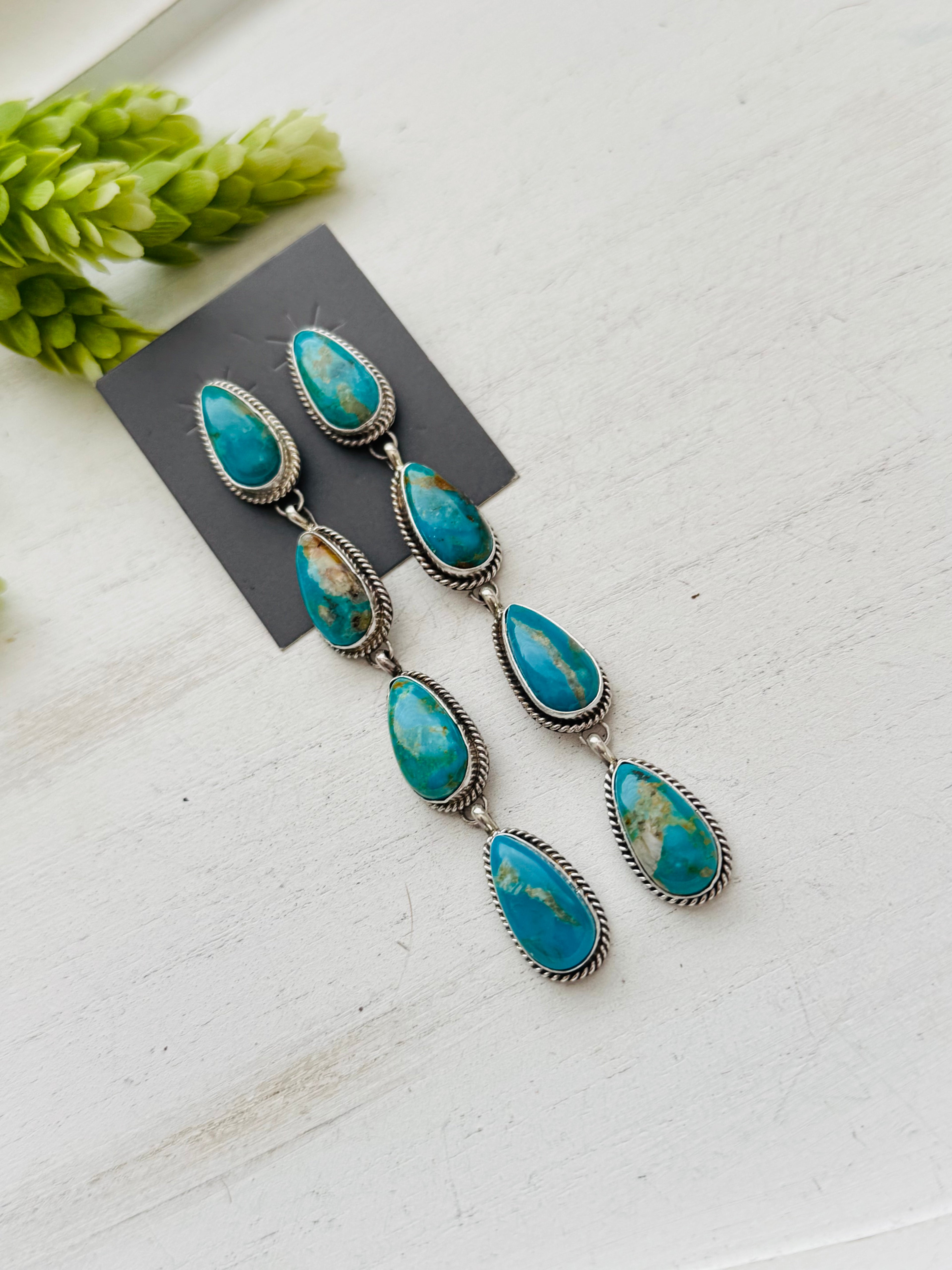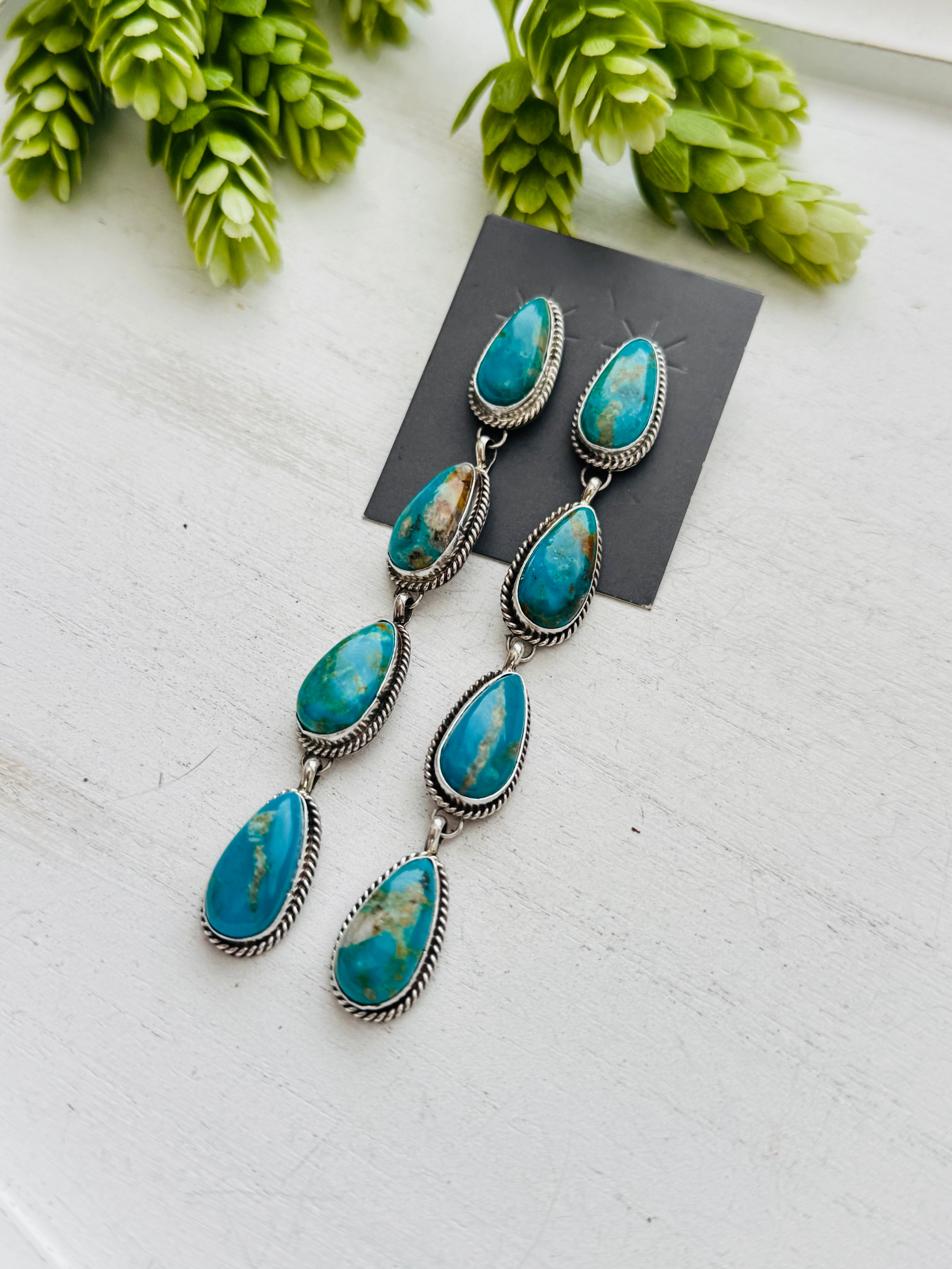 Navajo Made Kingman Turquoise & Sterling Silver Post Earrings. They measure 3 7/8 inches long and just under 1/2 of an inch wide. Signed by the artist and stamped sterling silver.