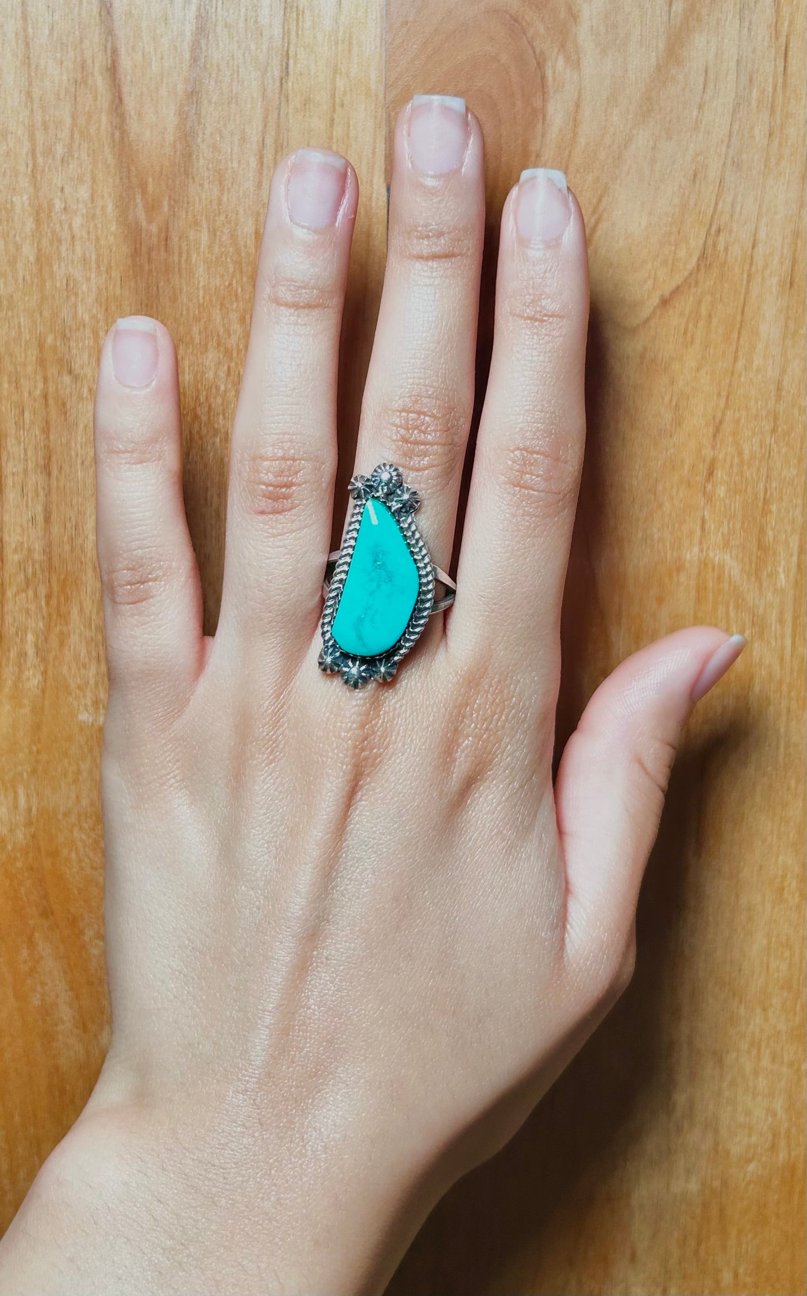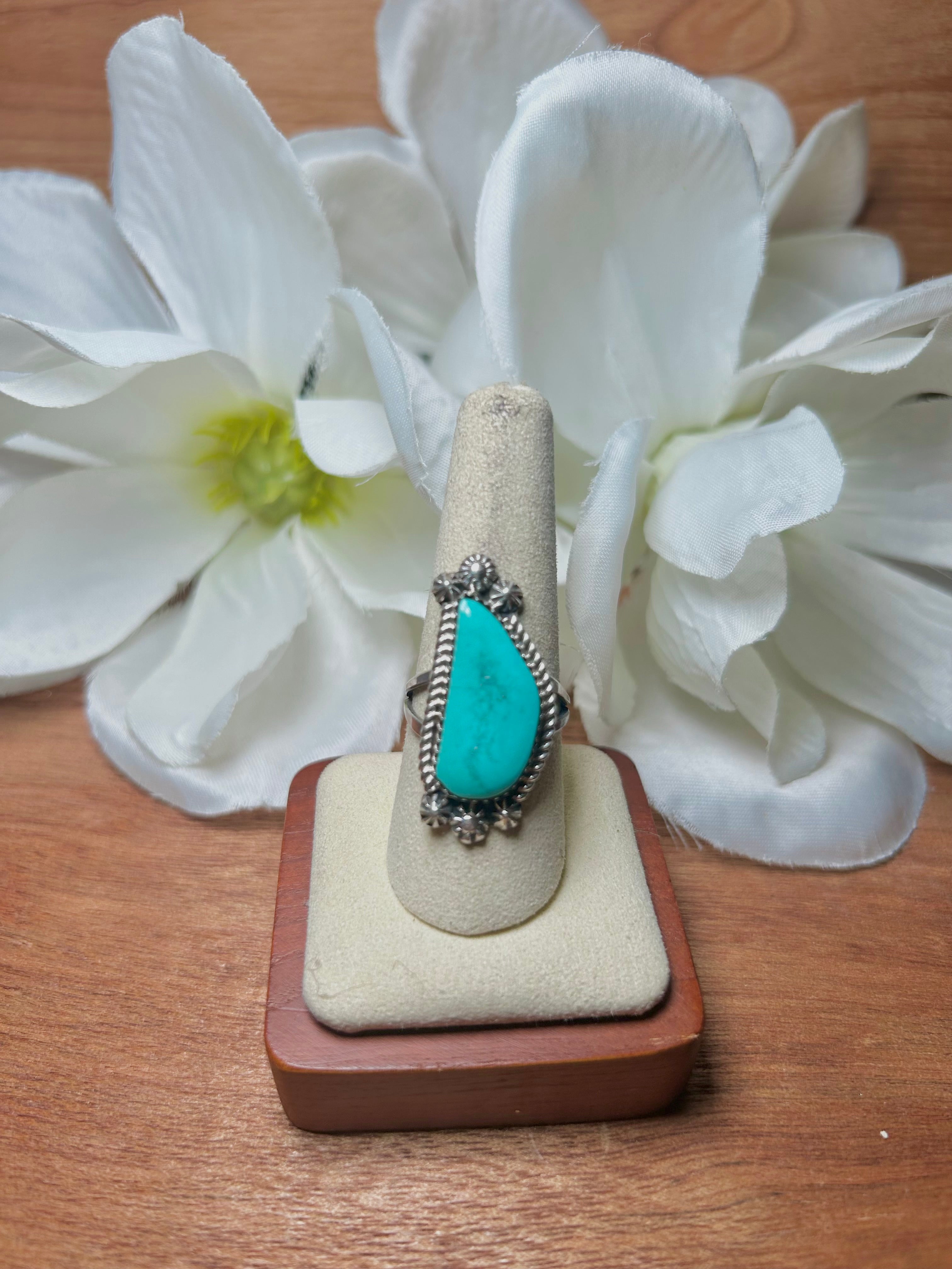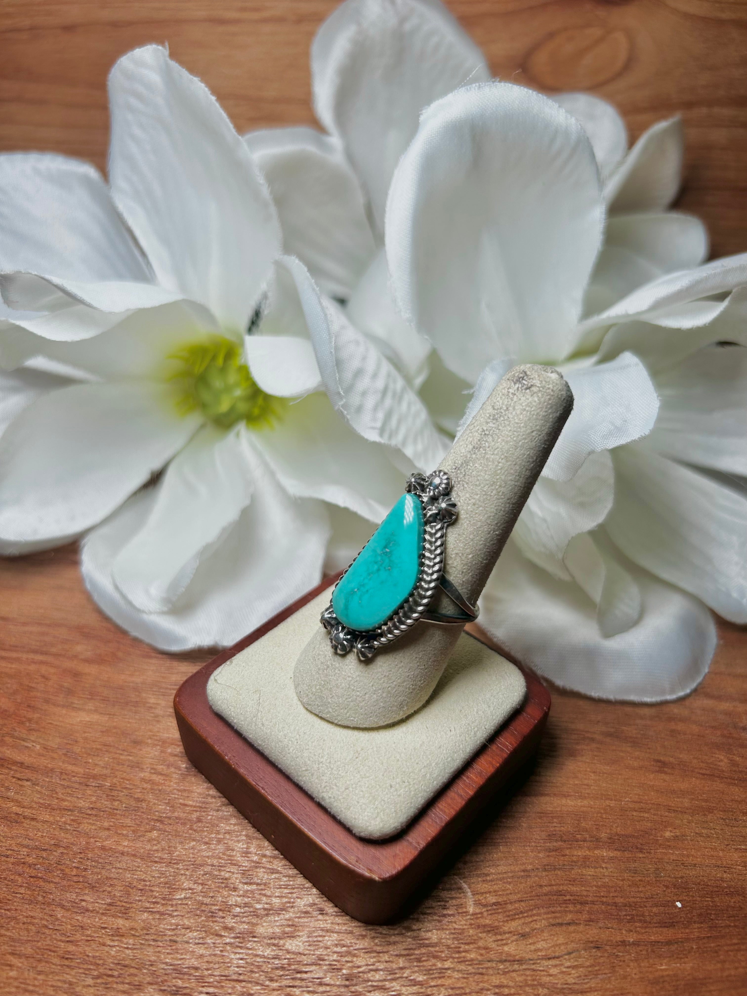 Navajo Made Kingman Turquoise & Sterling Silver Ring Size 9. It measures 1 3/8 inches long and 5/8 of an inch wide. Signed by the artist and stamped sterling silver.