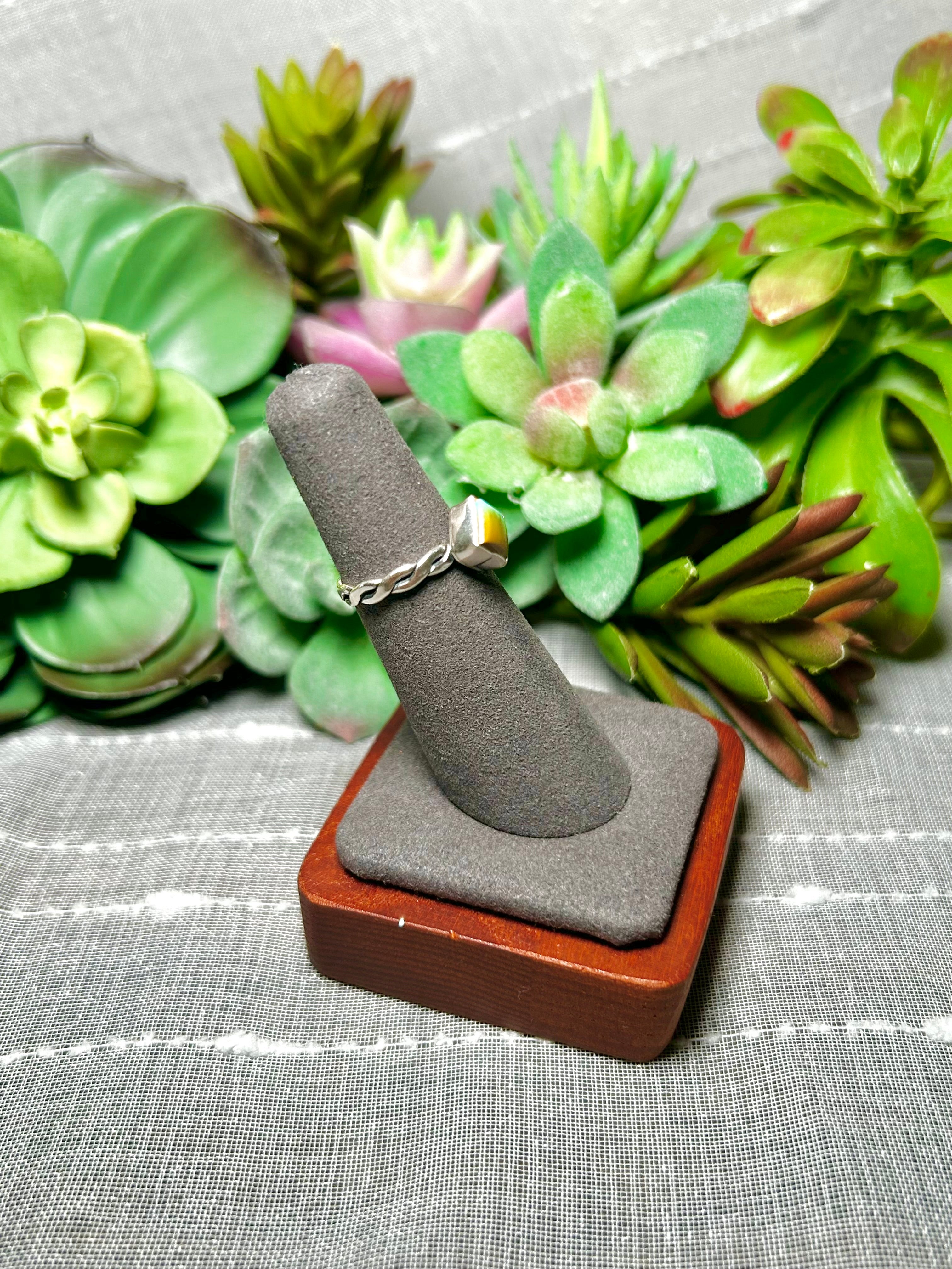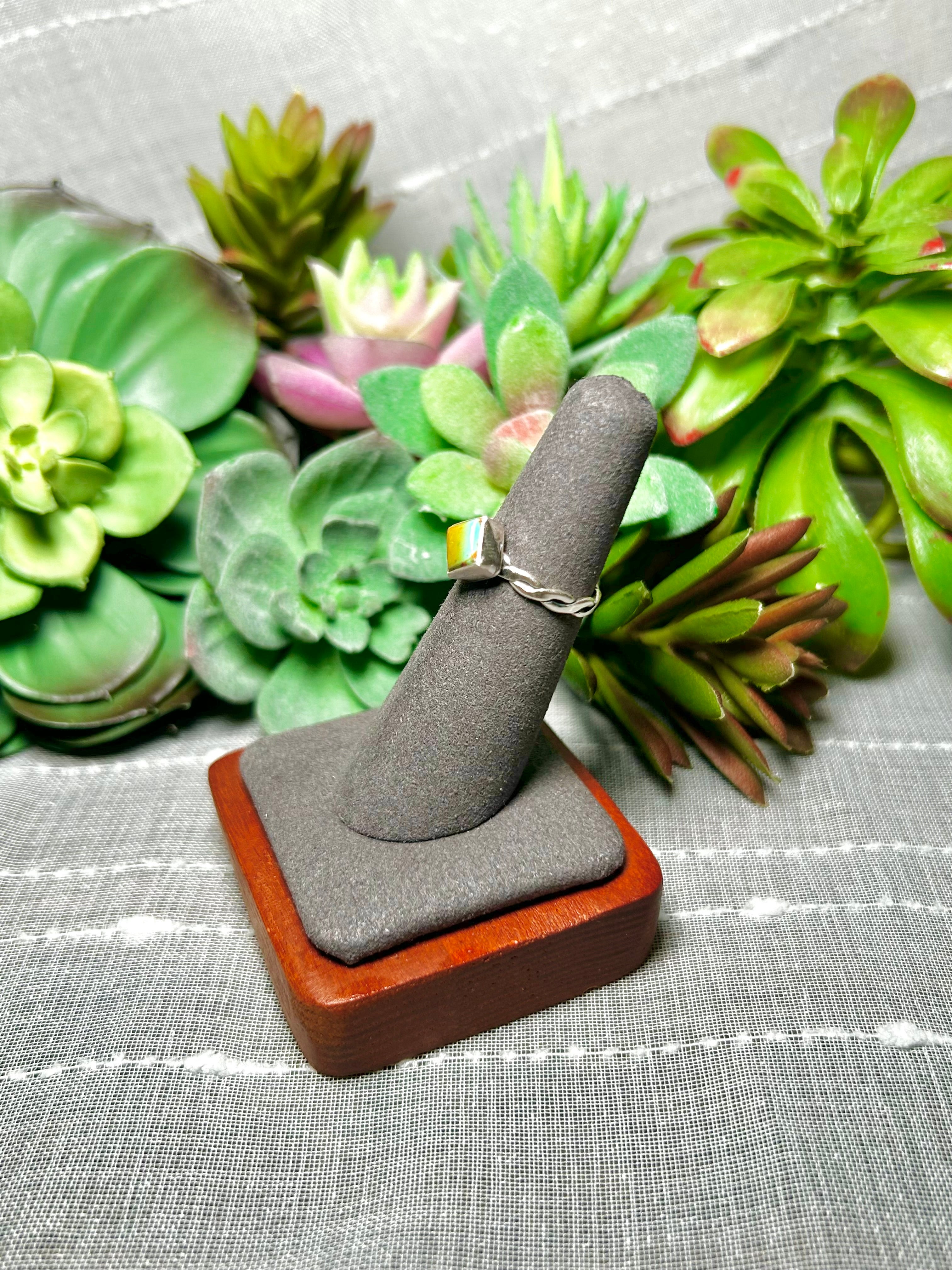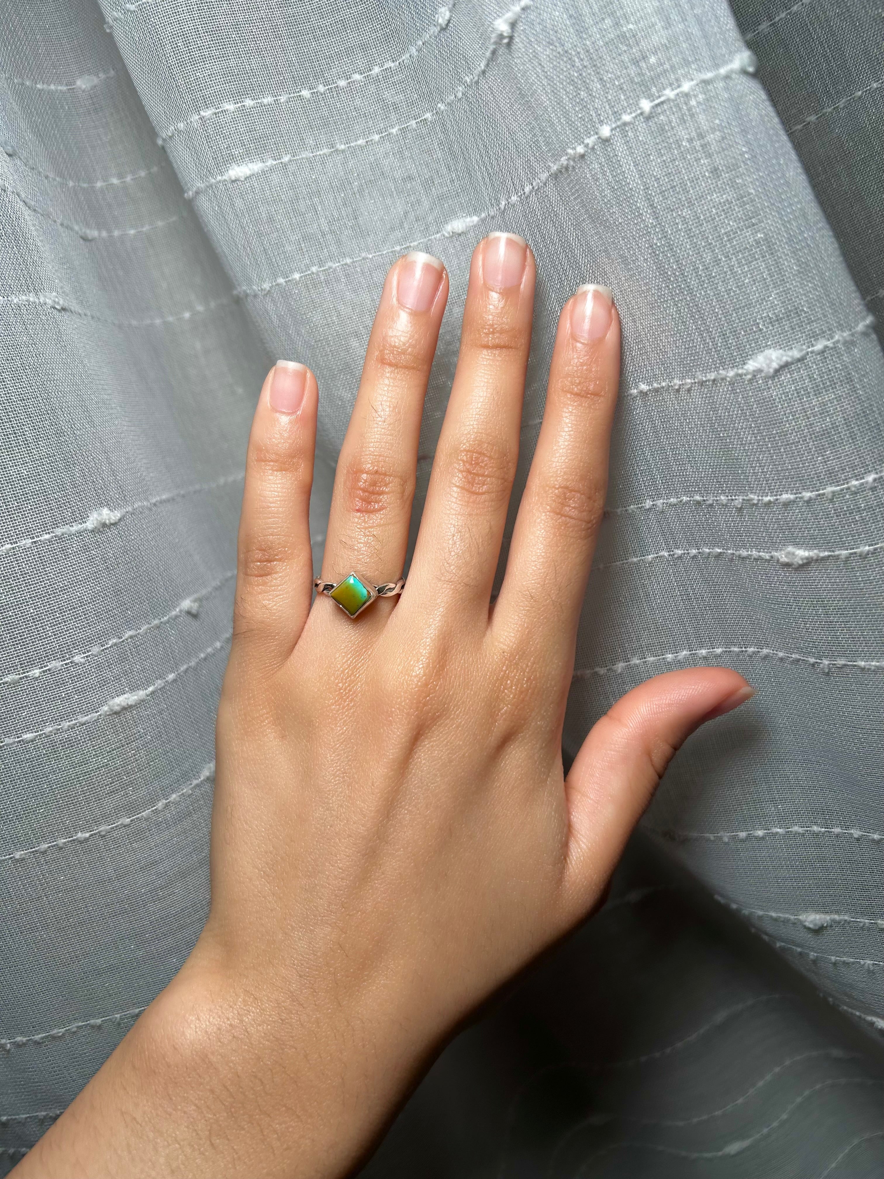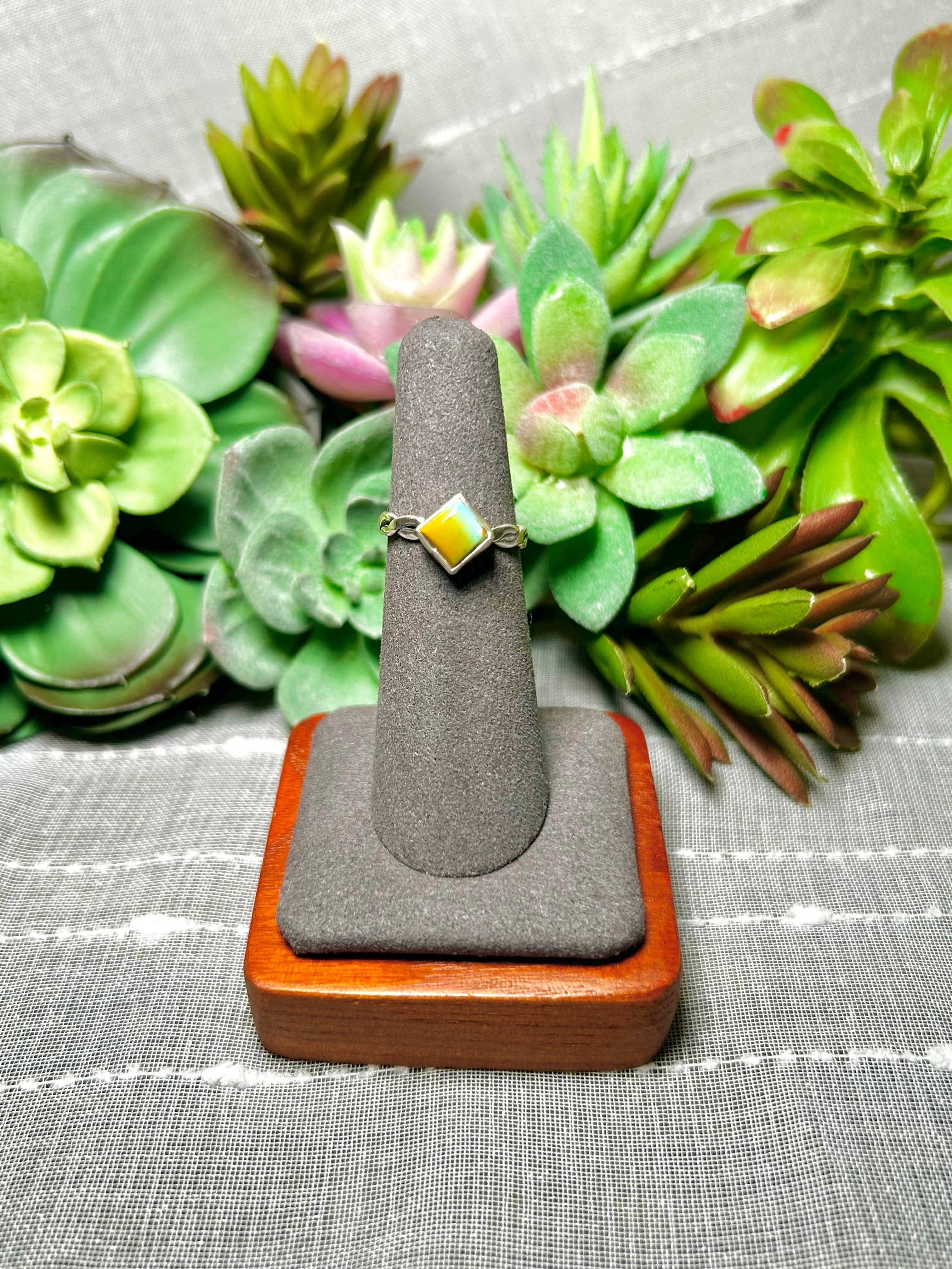 Navajo Made Kingman Turquoise & Sterling Silver Ring Size 5. It measures 3/8 of an inch long and 3/8 of an inch wide. Signed by the artist and stamped sterling silver.
