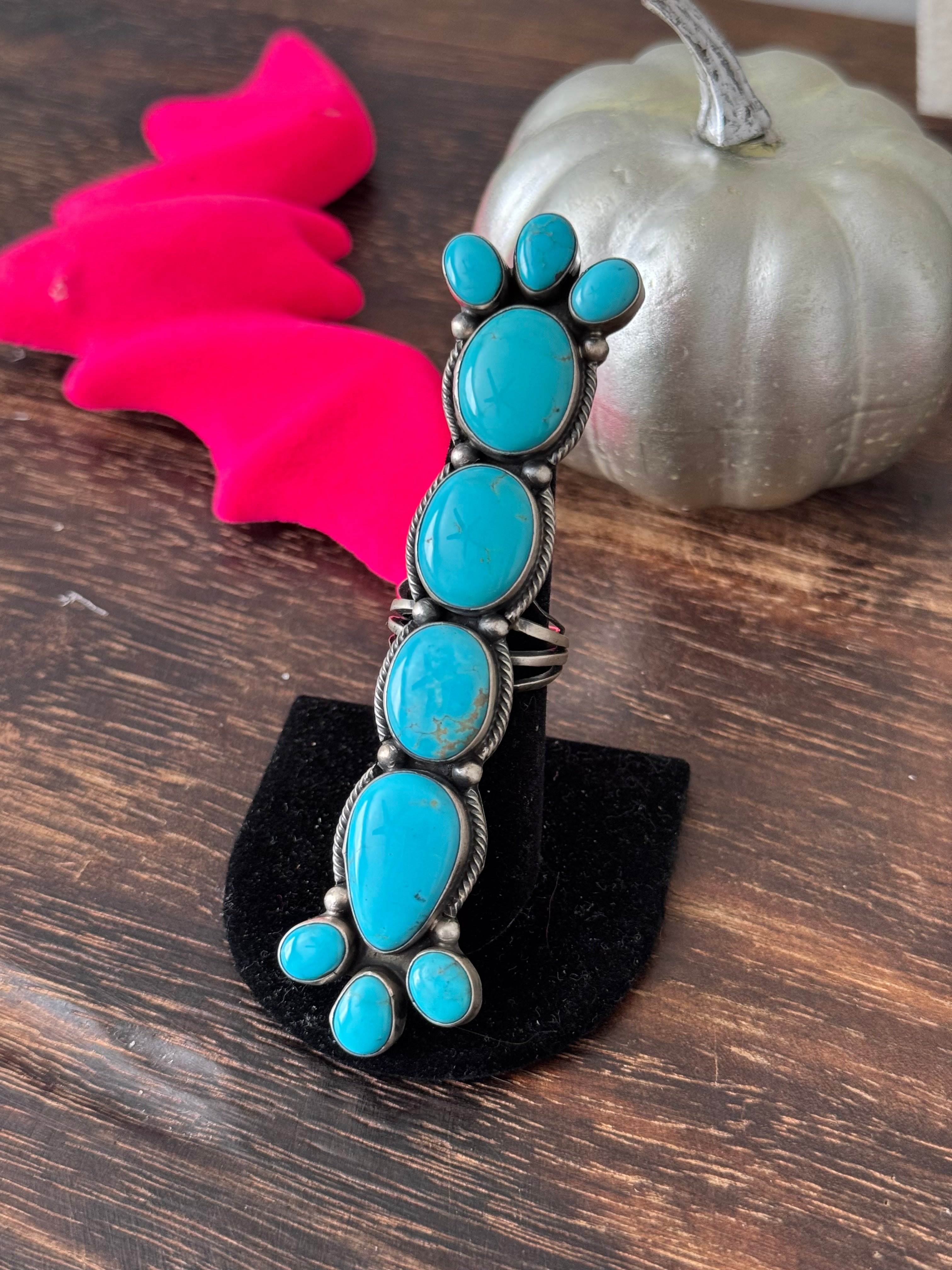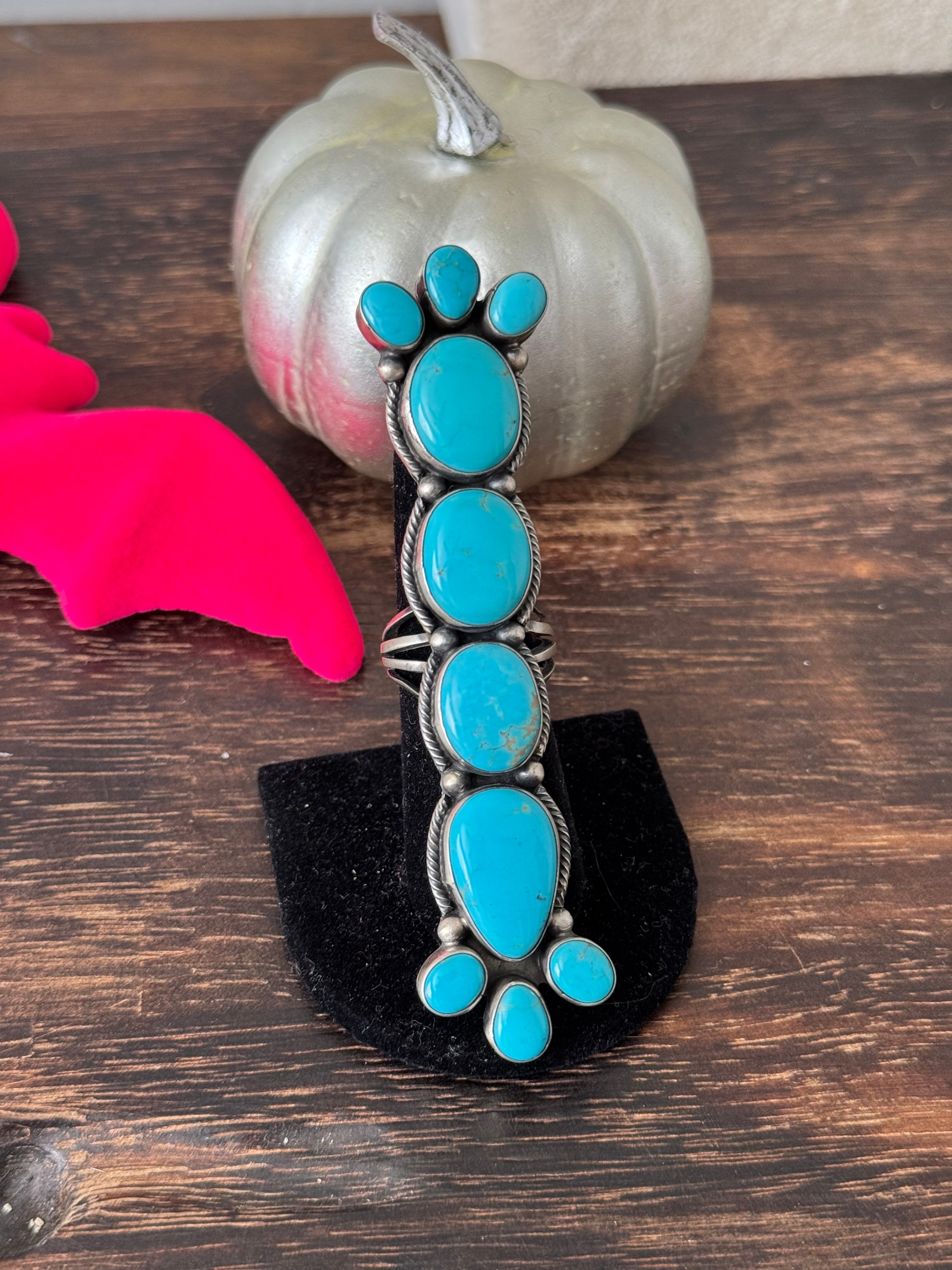 Beautiful ring. Navajo Made Kingman Turquoise & Sterling Silver Ring Size 8.75. It measures 4 inches long and 7/8 of an inch wide. Stamped sterling silver and stamped by the artist.
