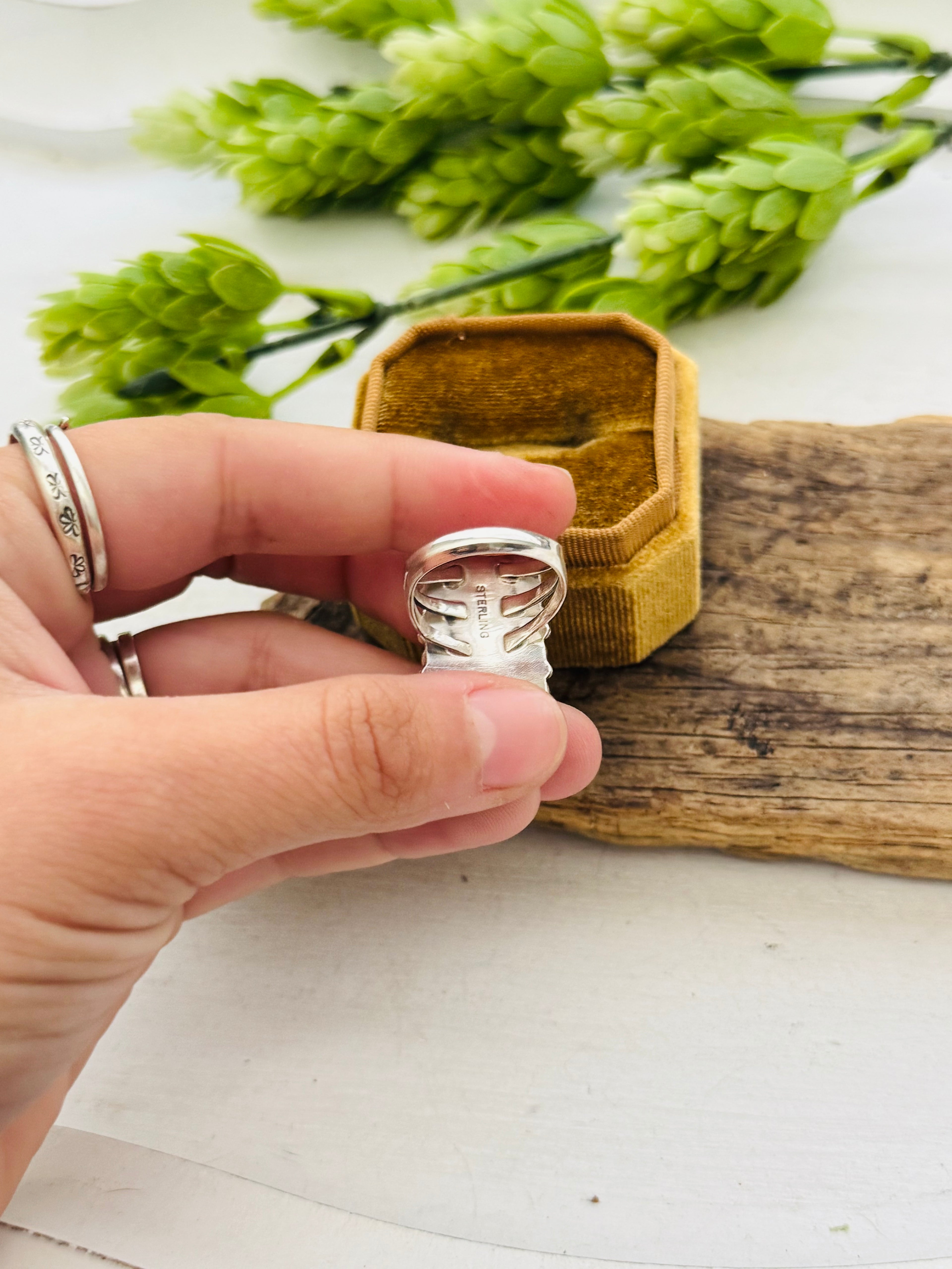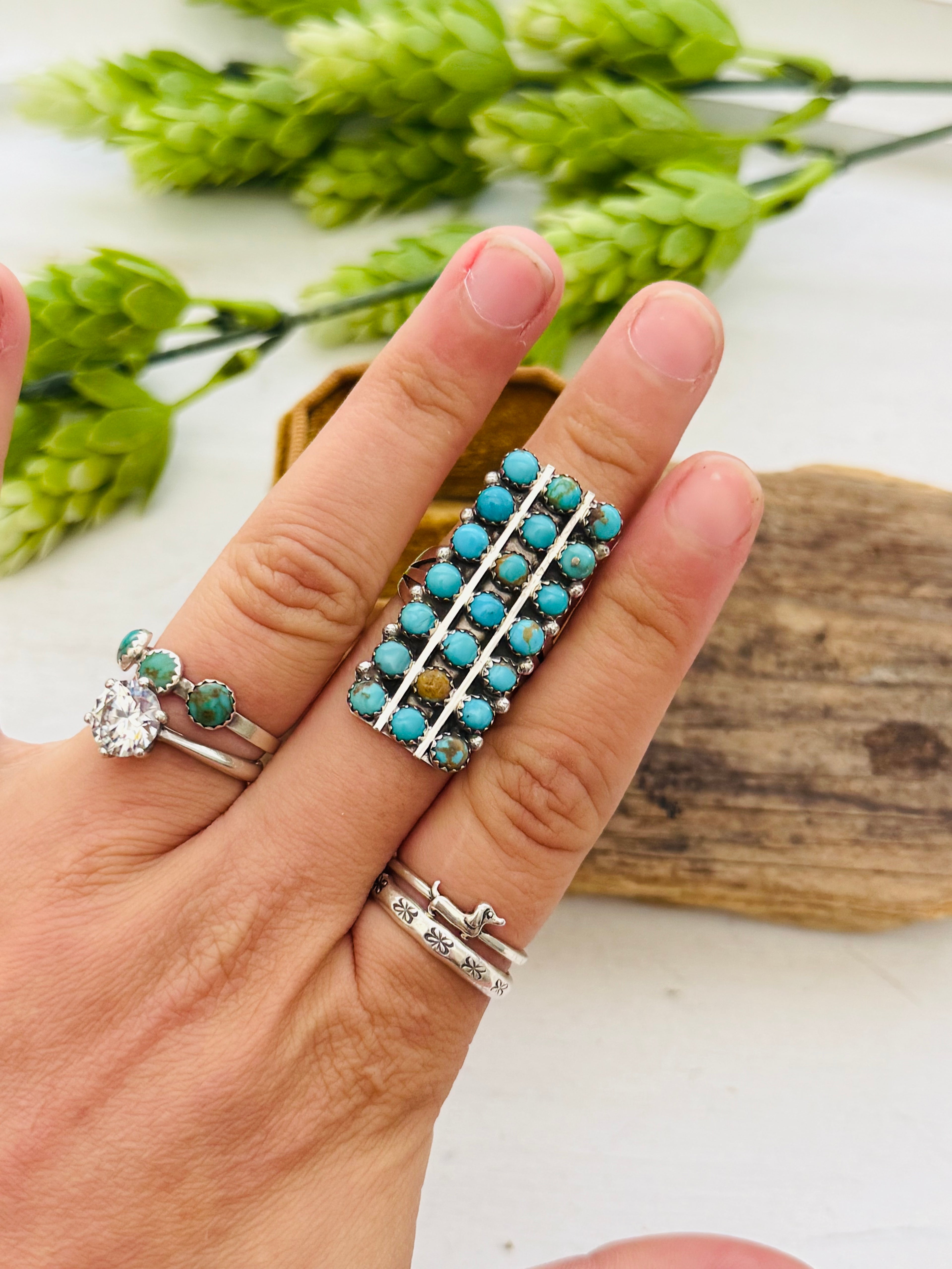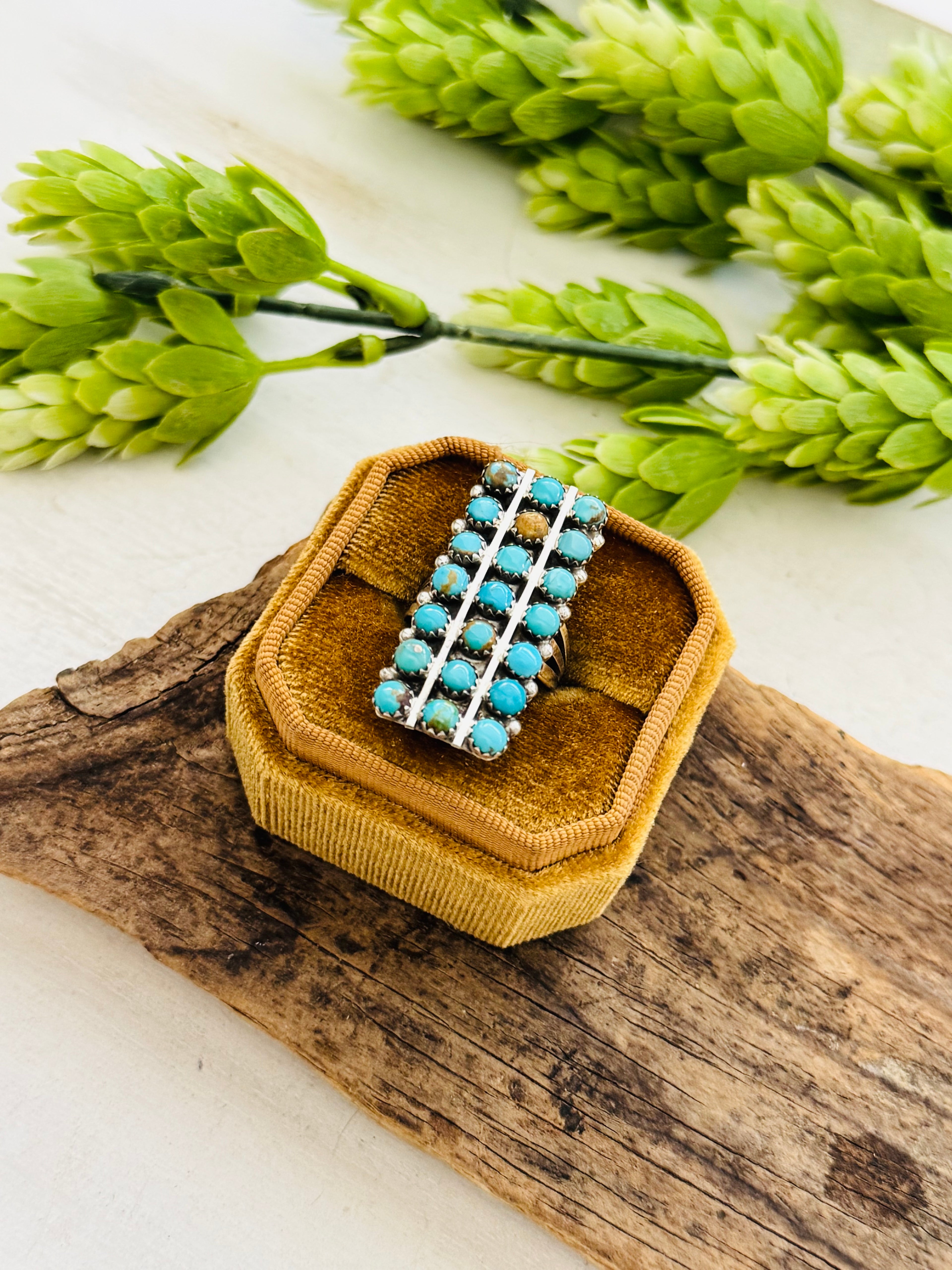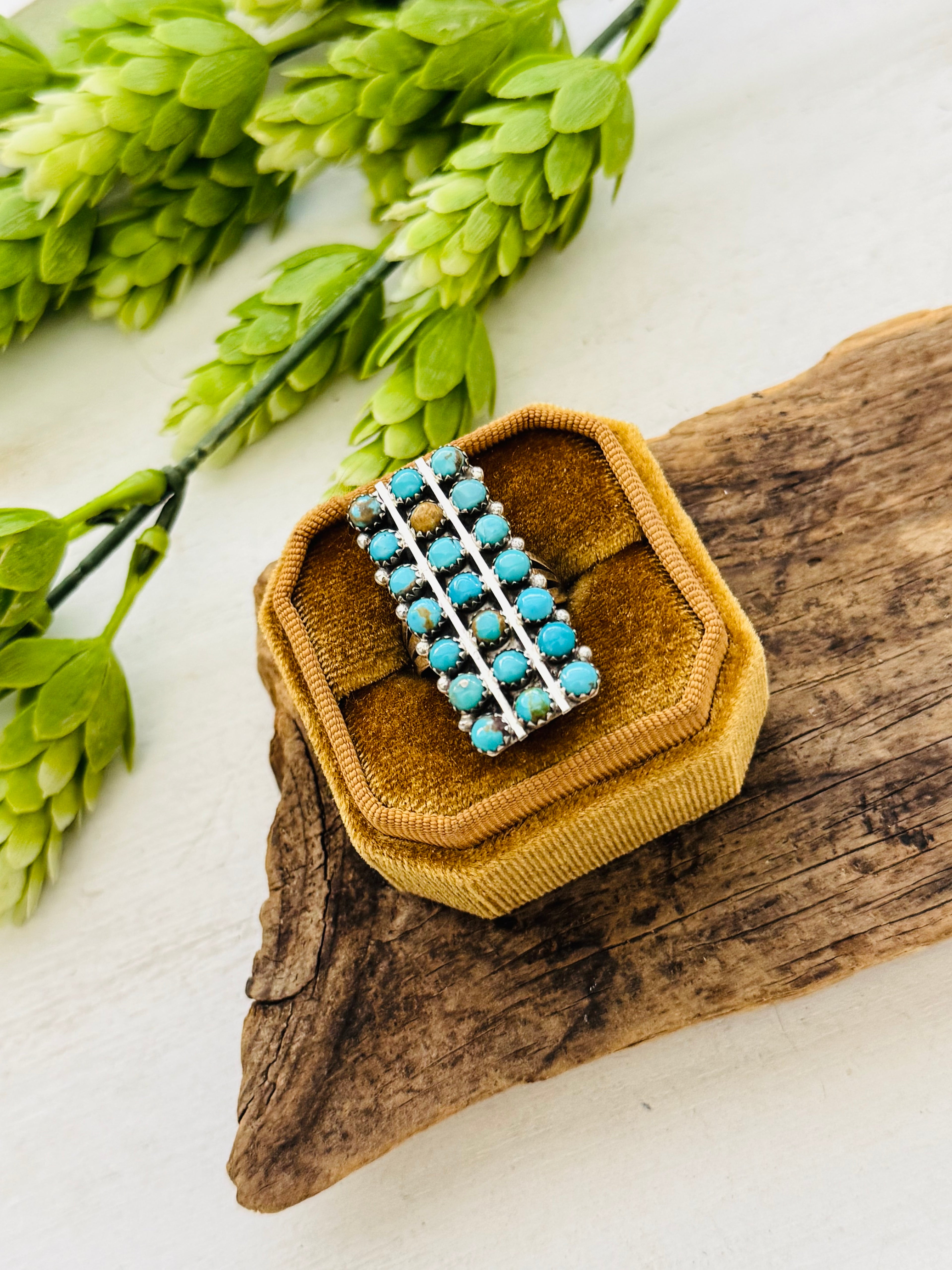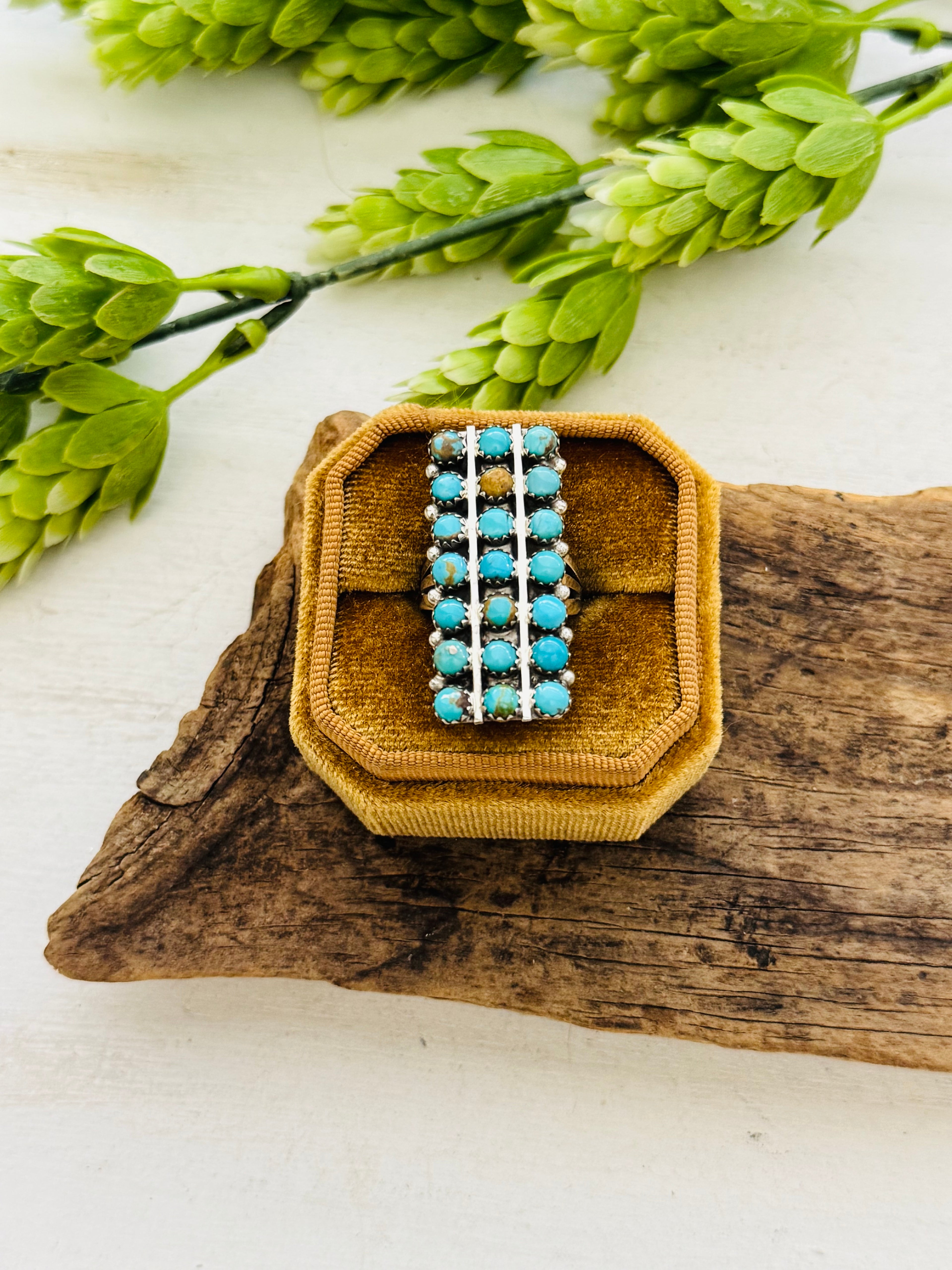 Navajo Made Kingman Turquoise & Sterling Silver Cluster Ring. It measures 1 3/8 inches long and 5/8 of an inch wide. Signed by the artist and stamped sterling silver. Stones will differ due to natural stones.