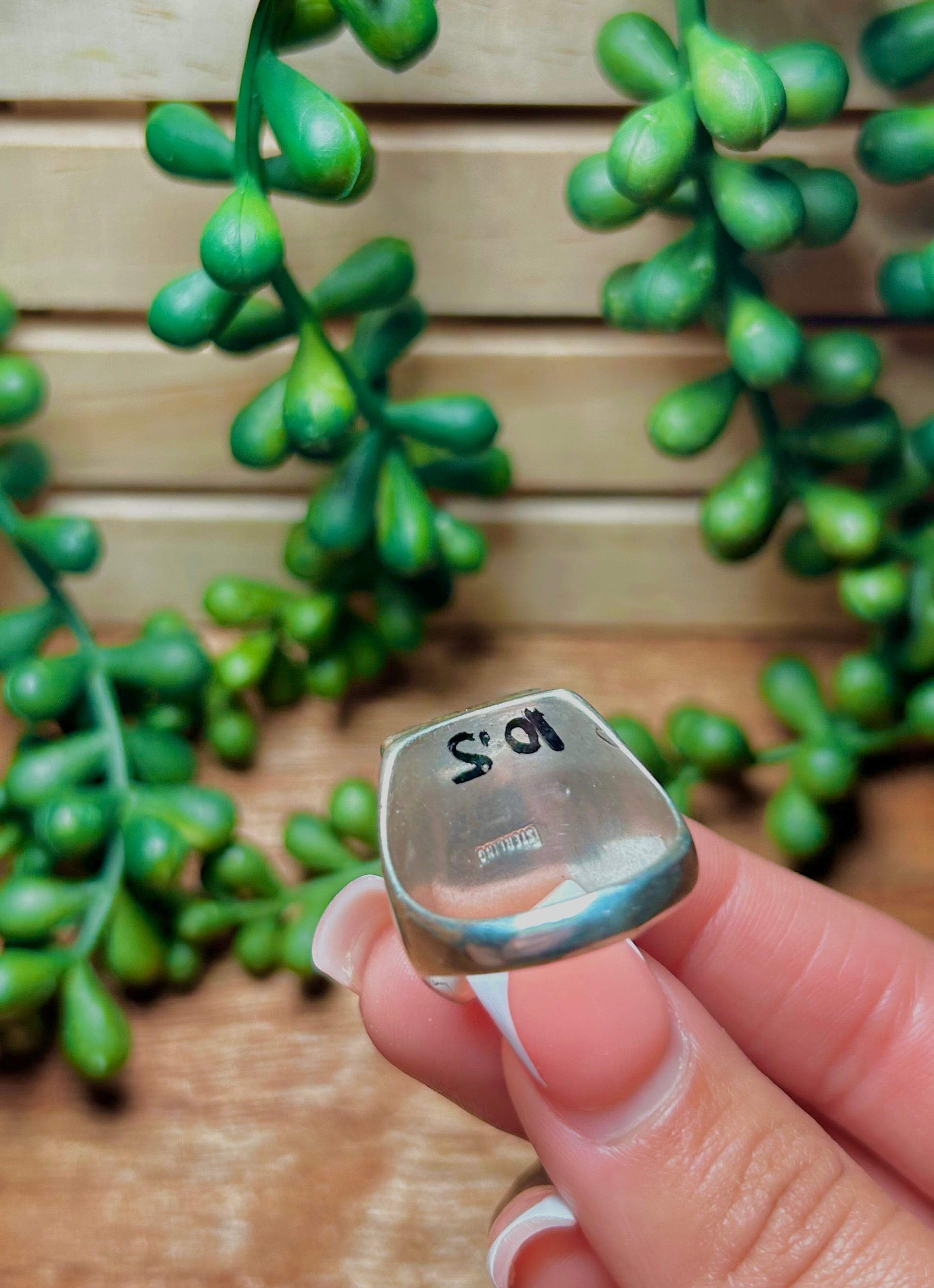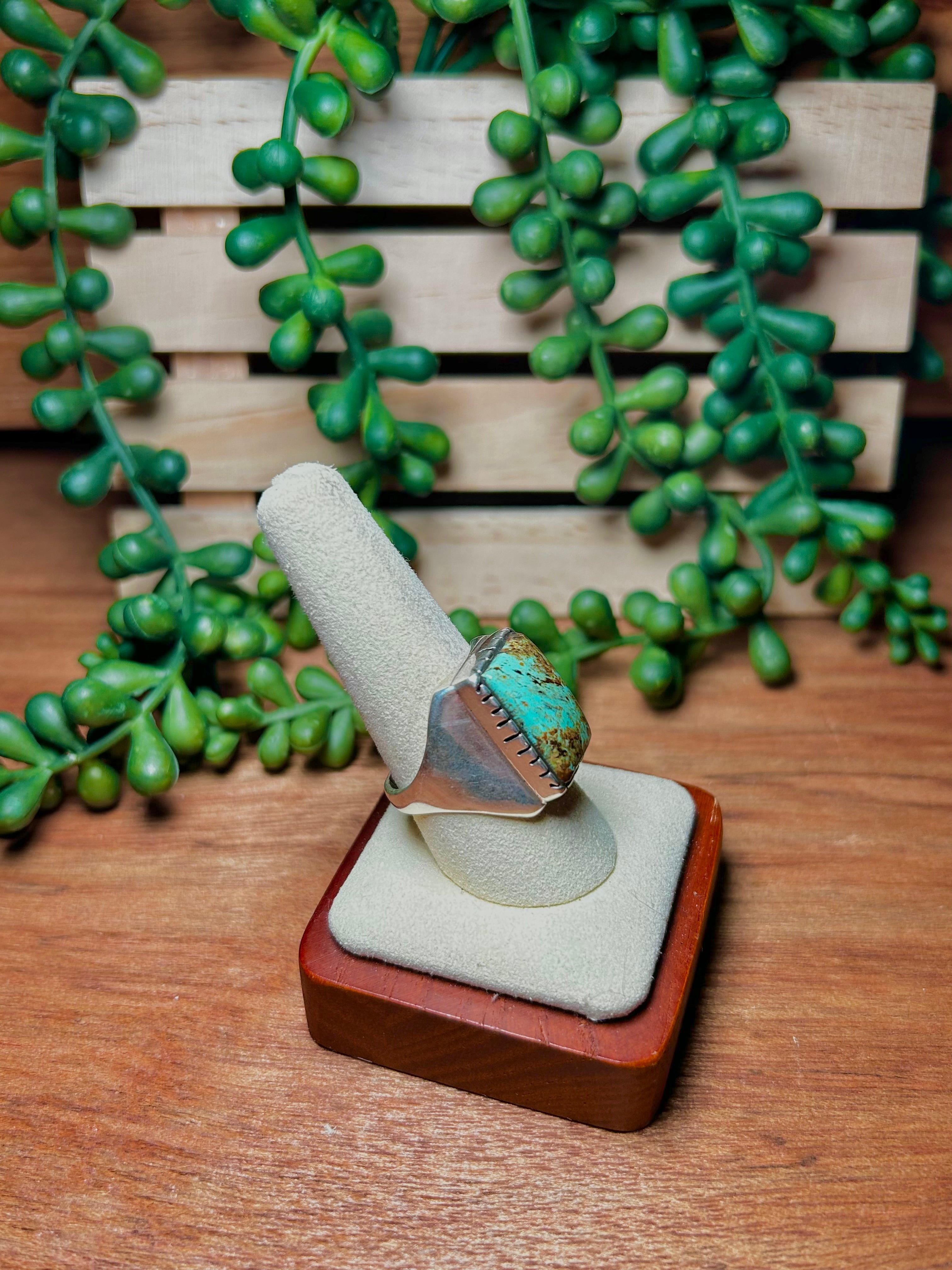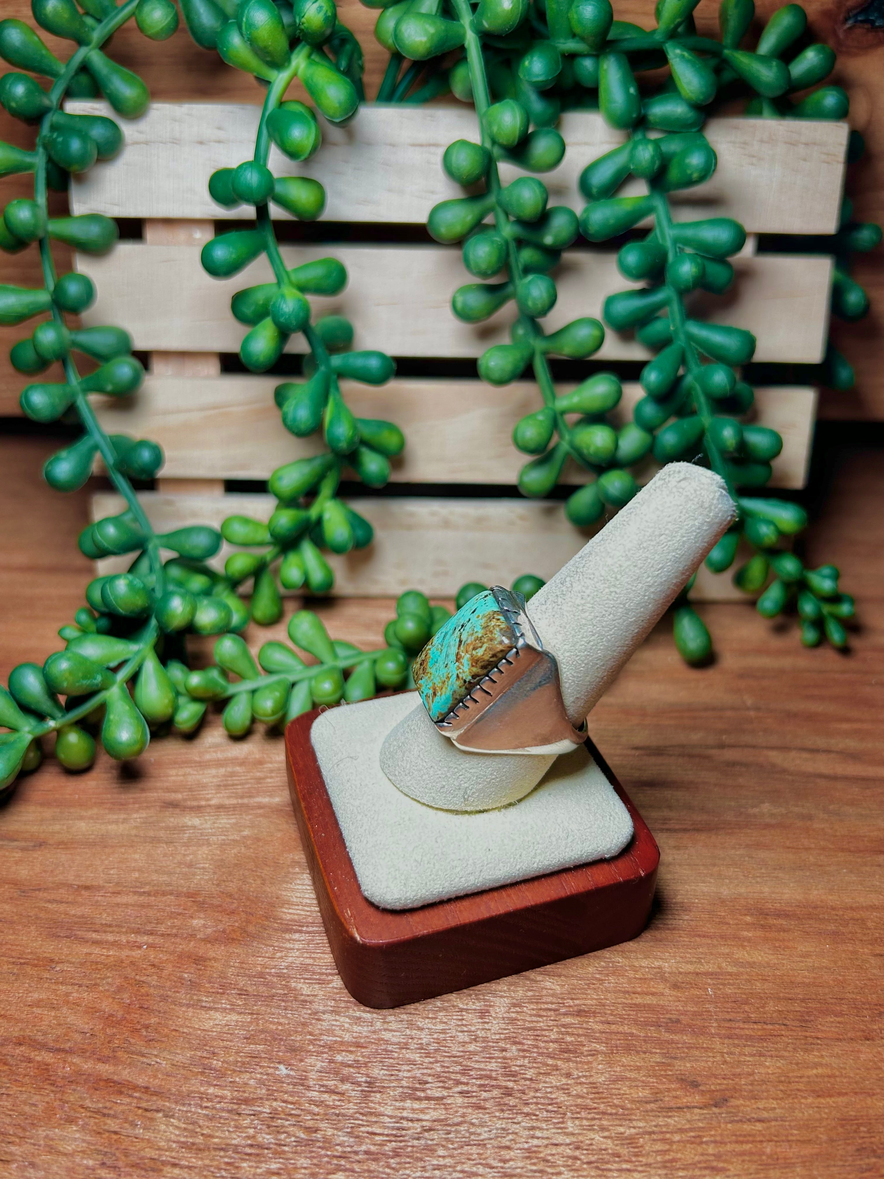 Navajo Made Kingman Turquoise & Sterling Silver Ring Size 10.5. It measures 7/8 of an inch long and 1/2 of an inch wide. Signed by the artist and stamped sterling silver.