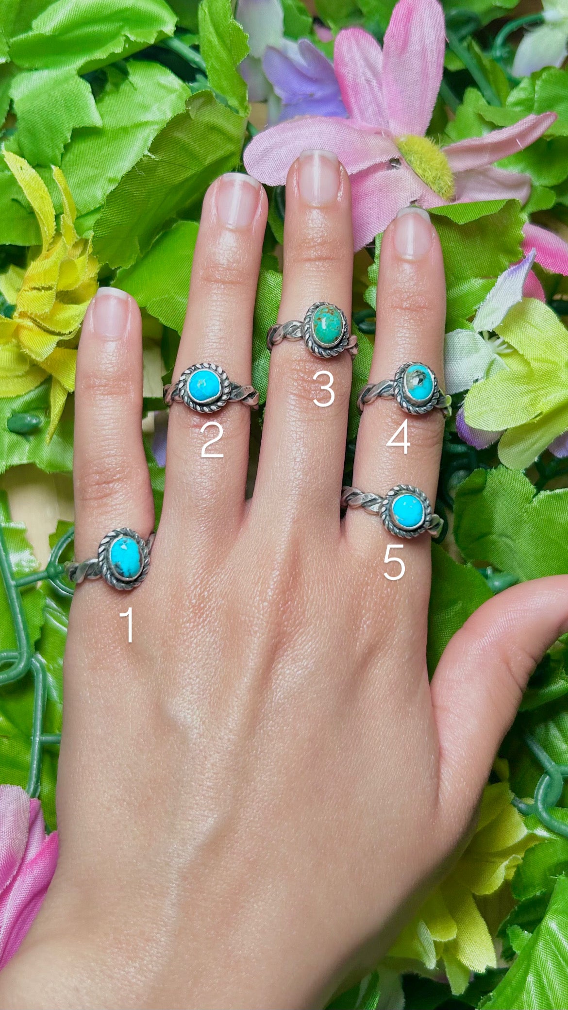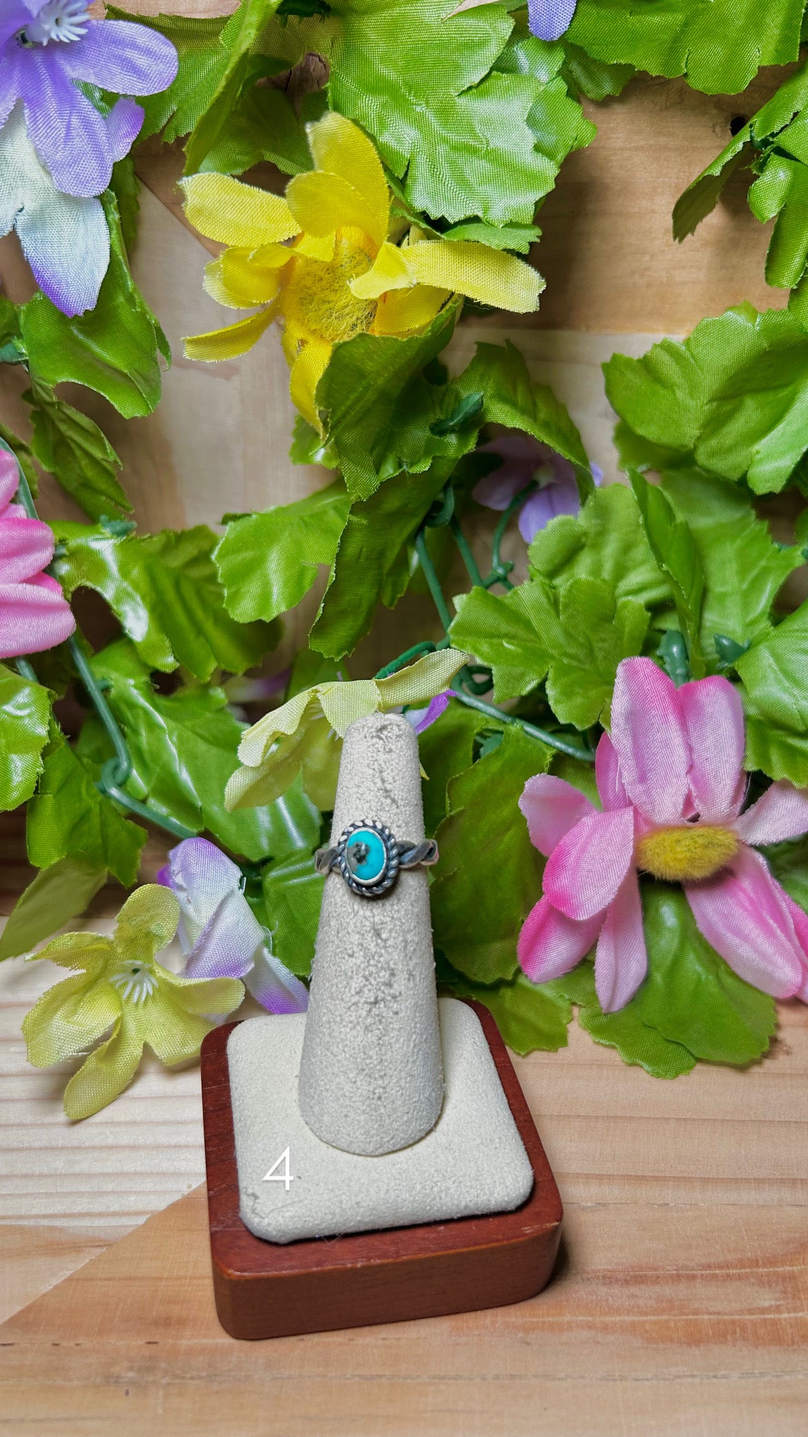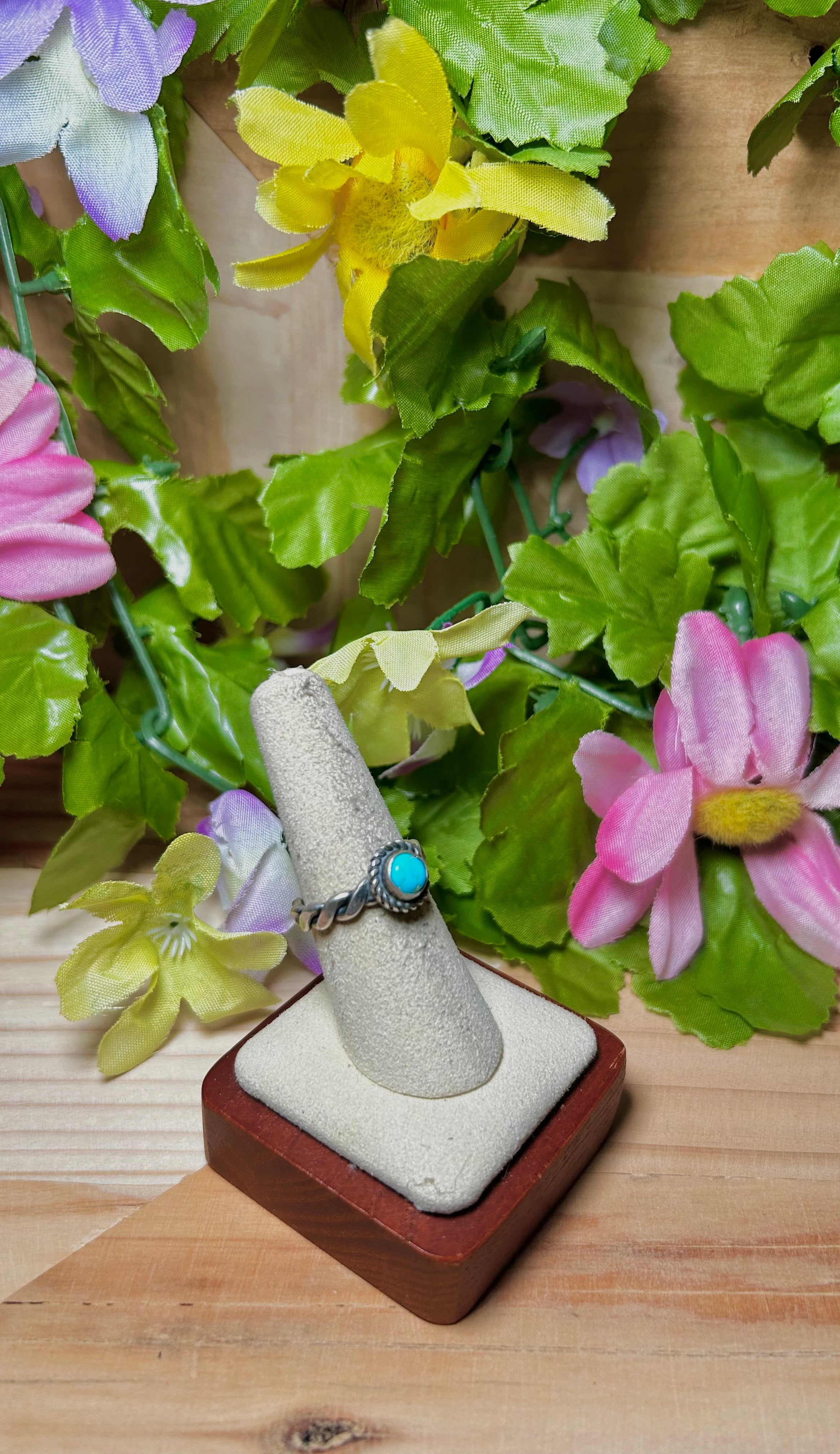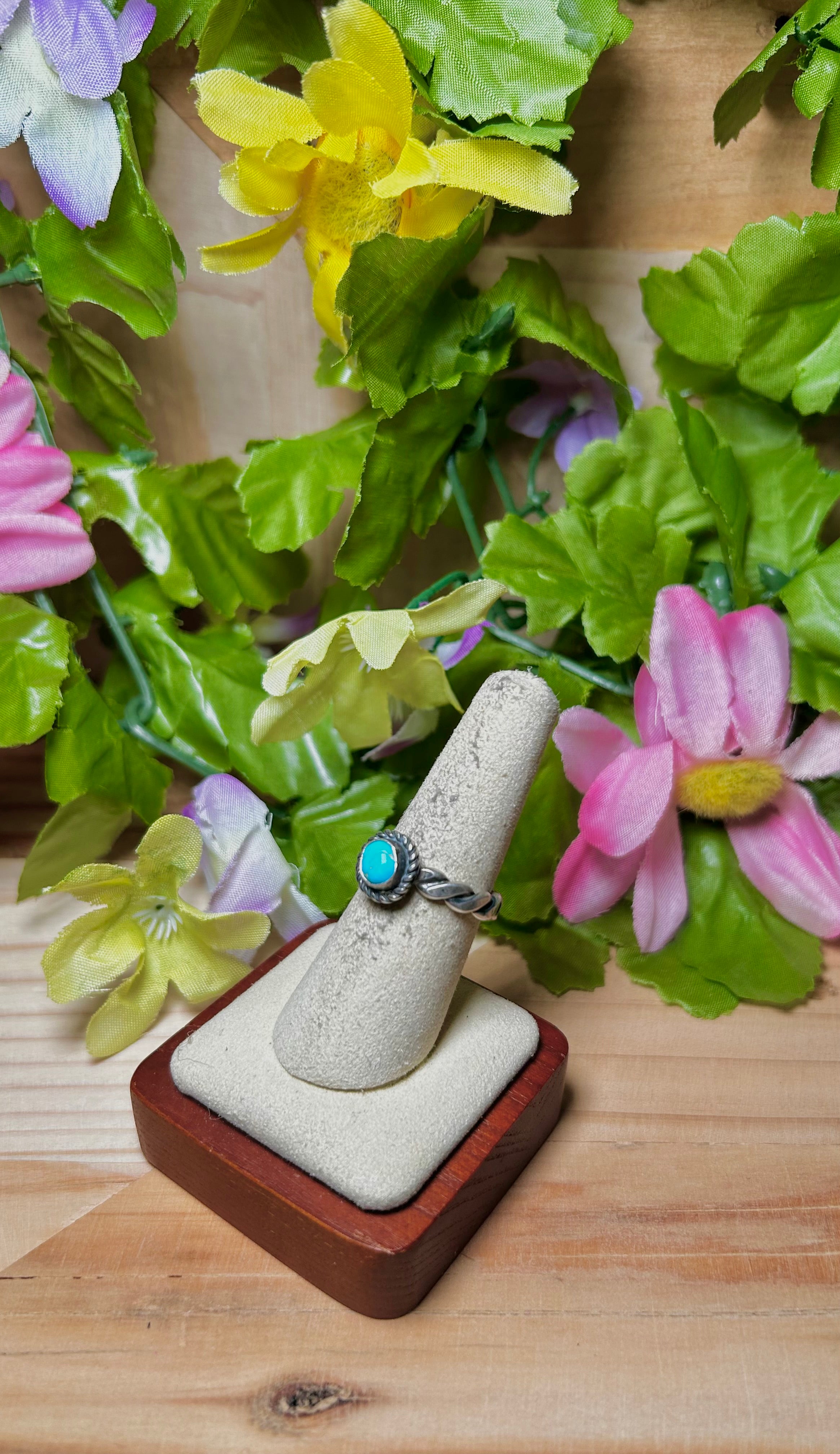 Navajo Made Kingman Turquoise & Sterling Silver Ring. It measures 3/8 of an inch long and 3/8 of an inch wide. Stamped sterling silver.