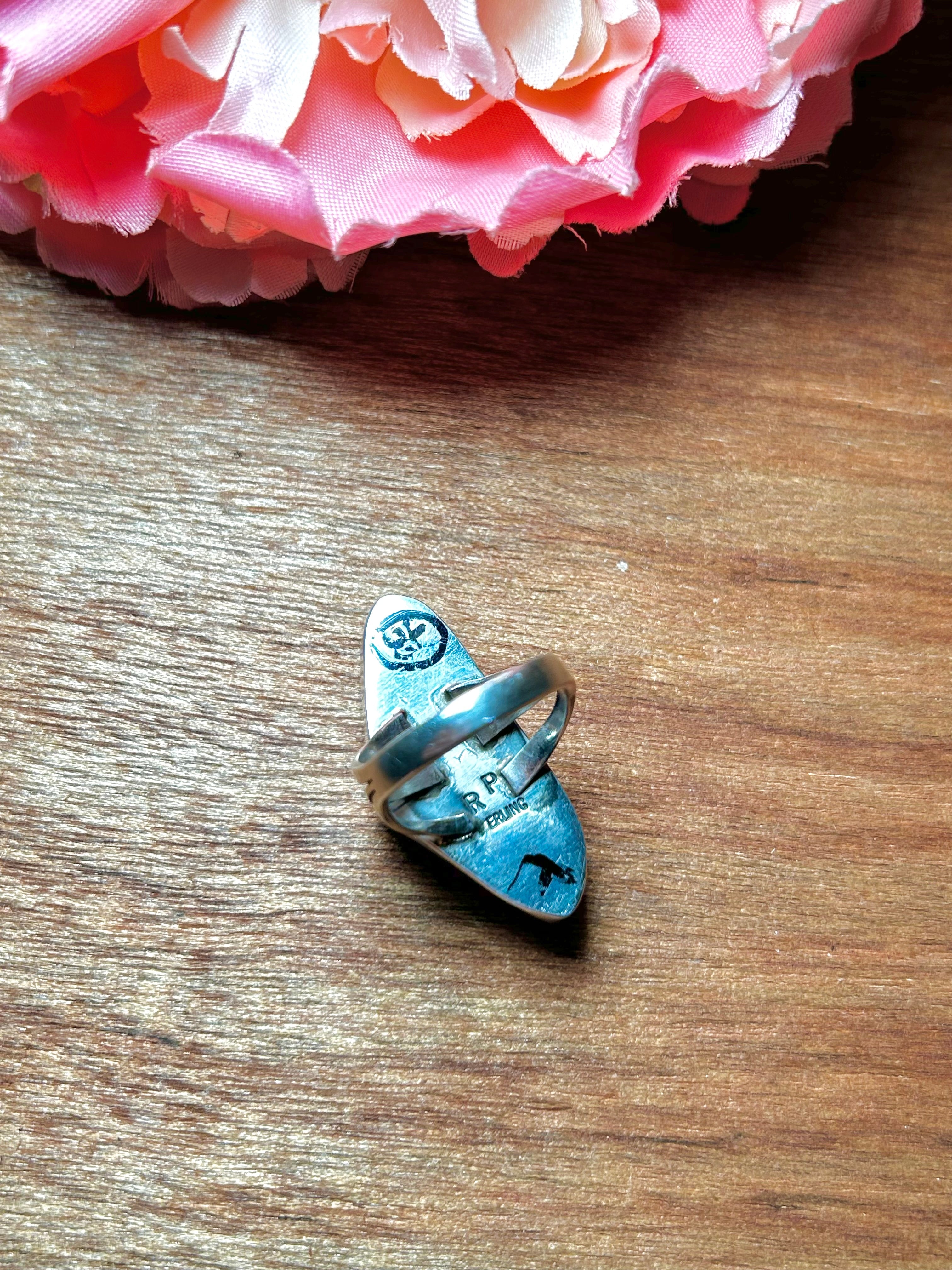 Navajo Made Royston Turquoise & Sterling Silver Ring Size 7. It measures 1 3/8 inches long and 1/2 of an inch wide. Stamped sterling silver and signed.