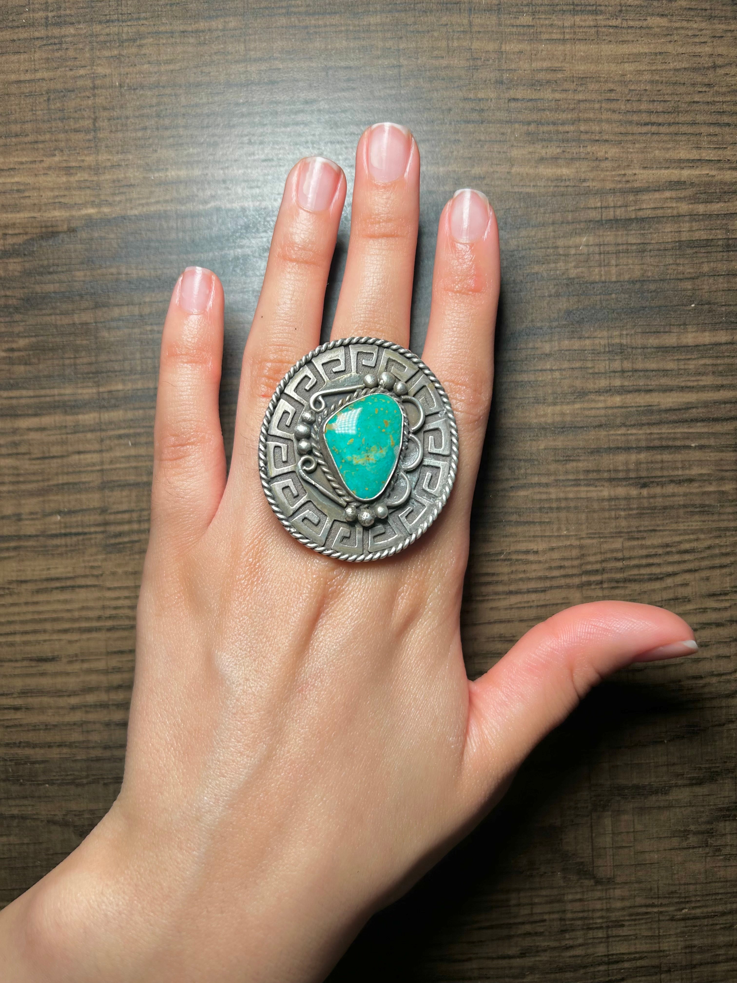 Navajo Made Kingman Turquoise & Sterling Silver Ring Size 7.25. It measures 1 7/8 inches long and 1 3/4 inches wide.