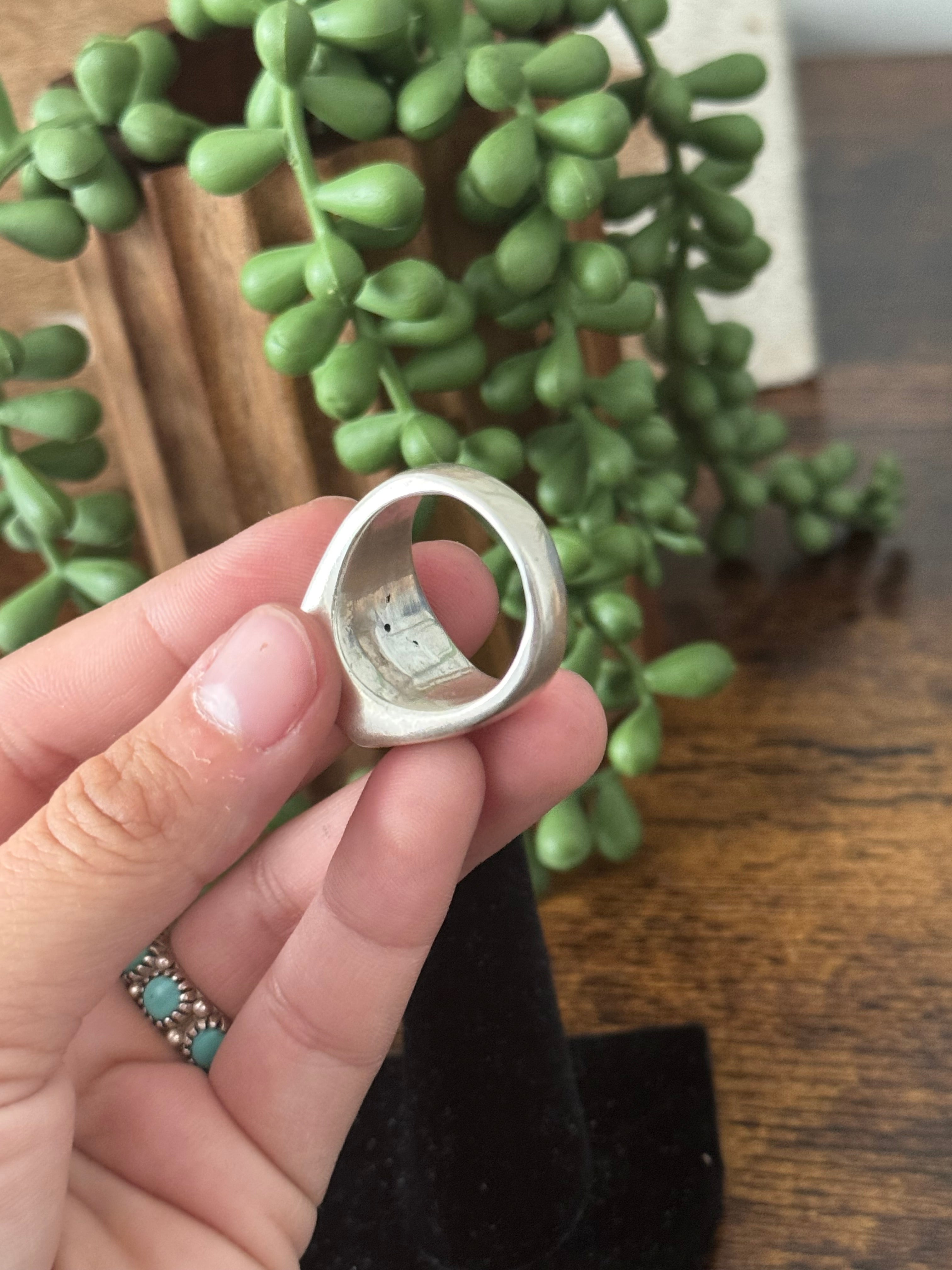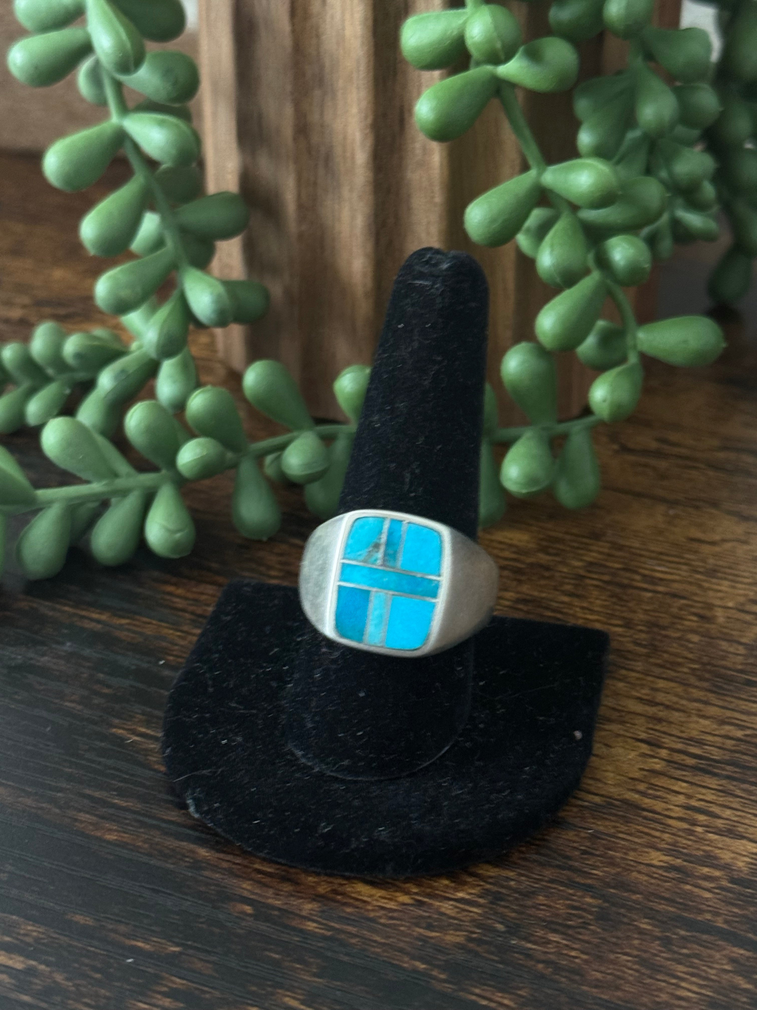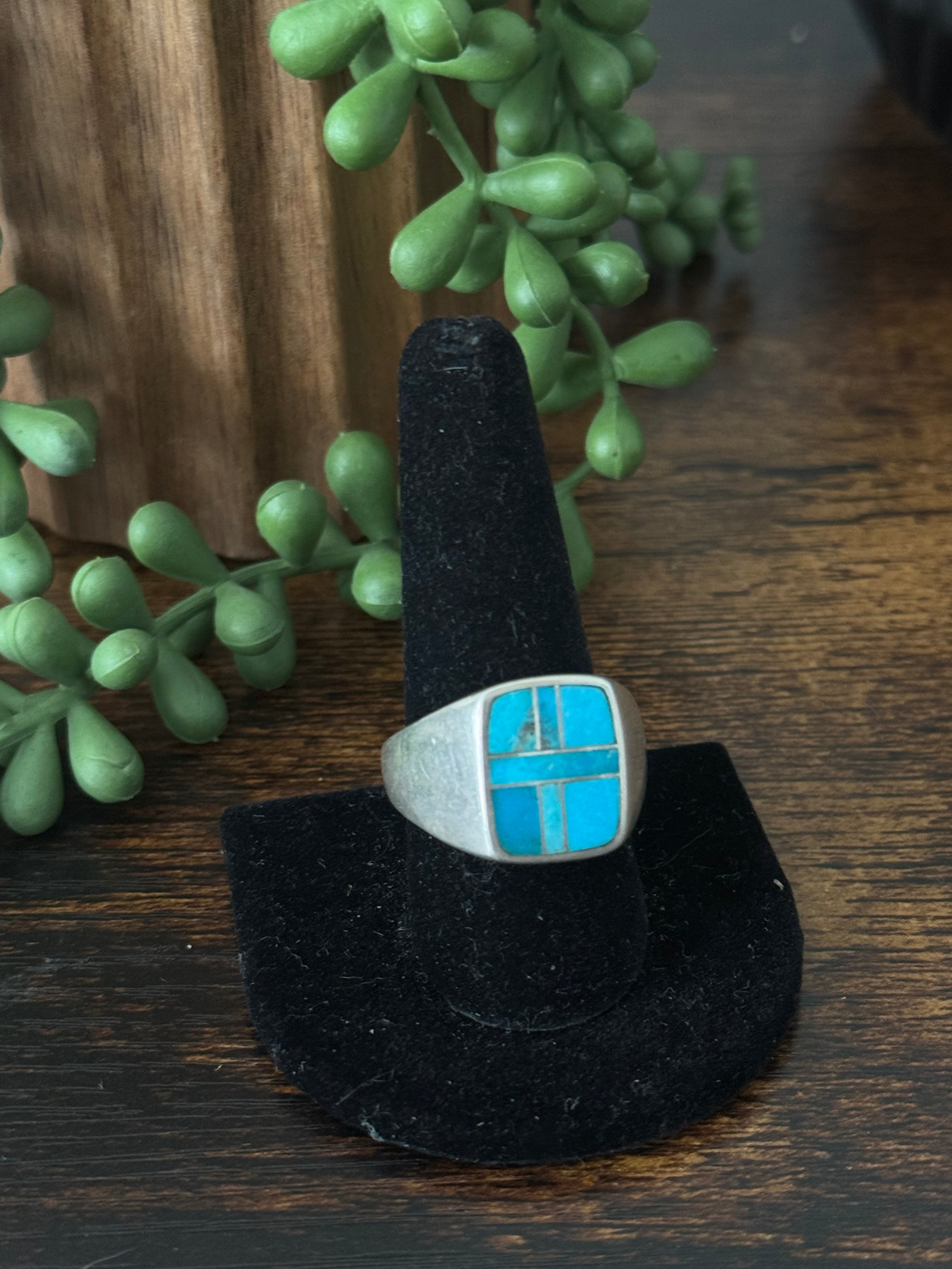 Navajo Made Kingman Turquoise & Sterling Silver Inlay Ring Size 10
