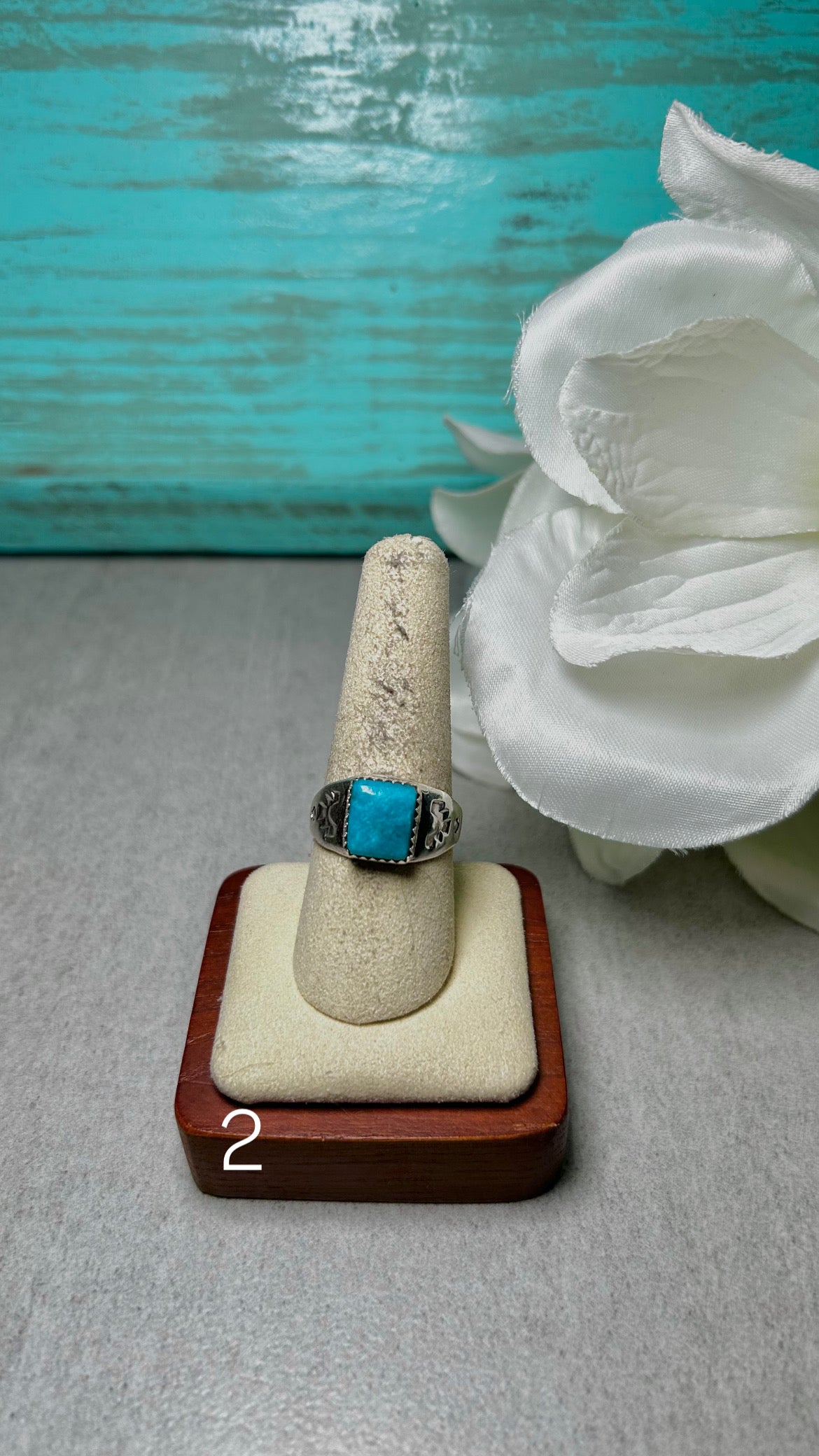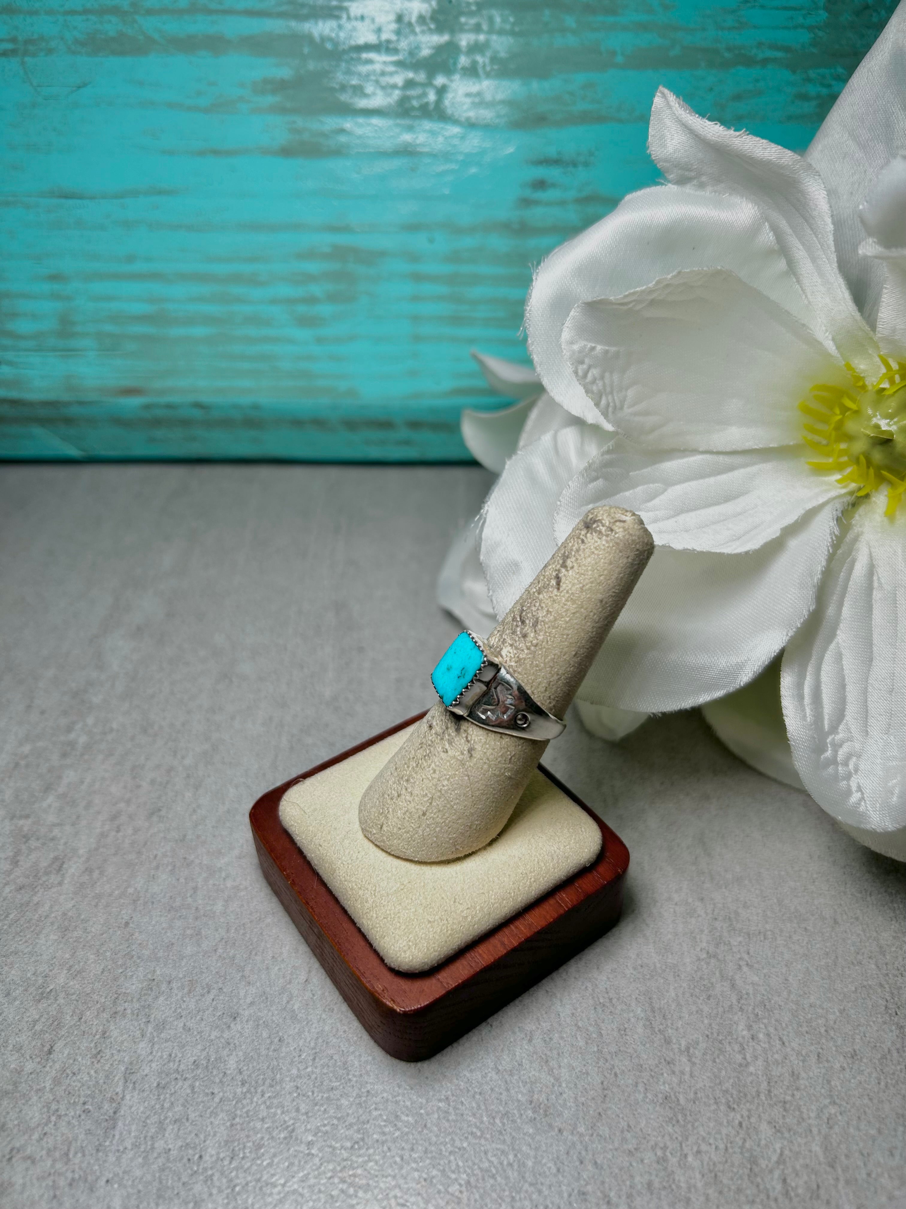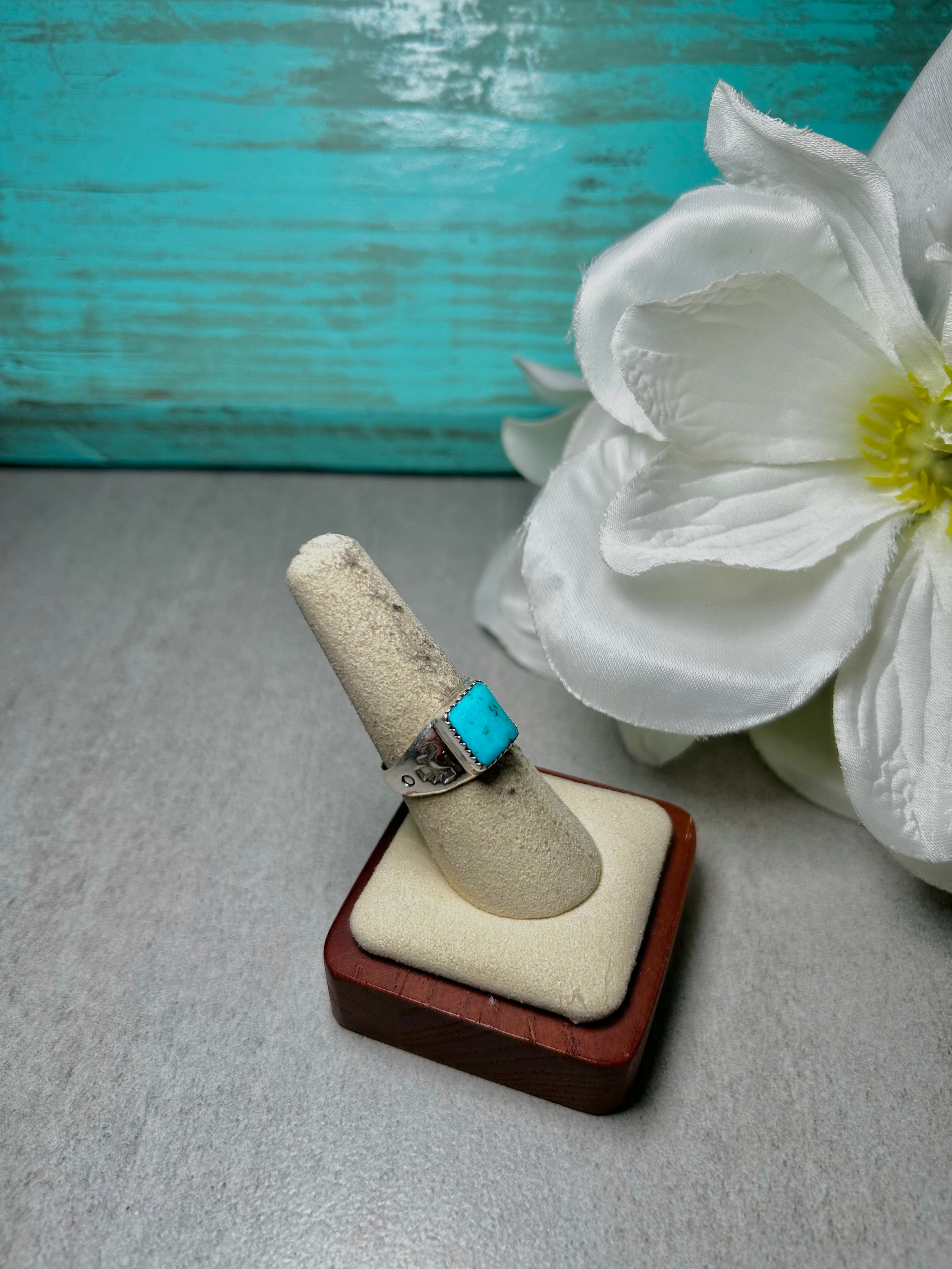 Navajo Made Kingman Turquoise & Sterling Silver Ring. It measures 1/2 of an inch long and 3/8 of an inch wide. Signed by the artist and stamped sterling silver.