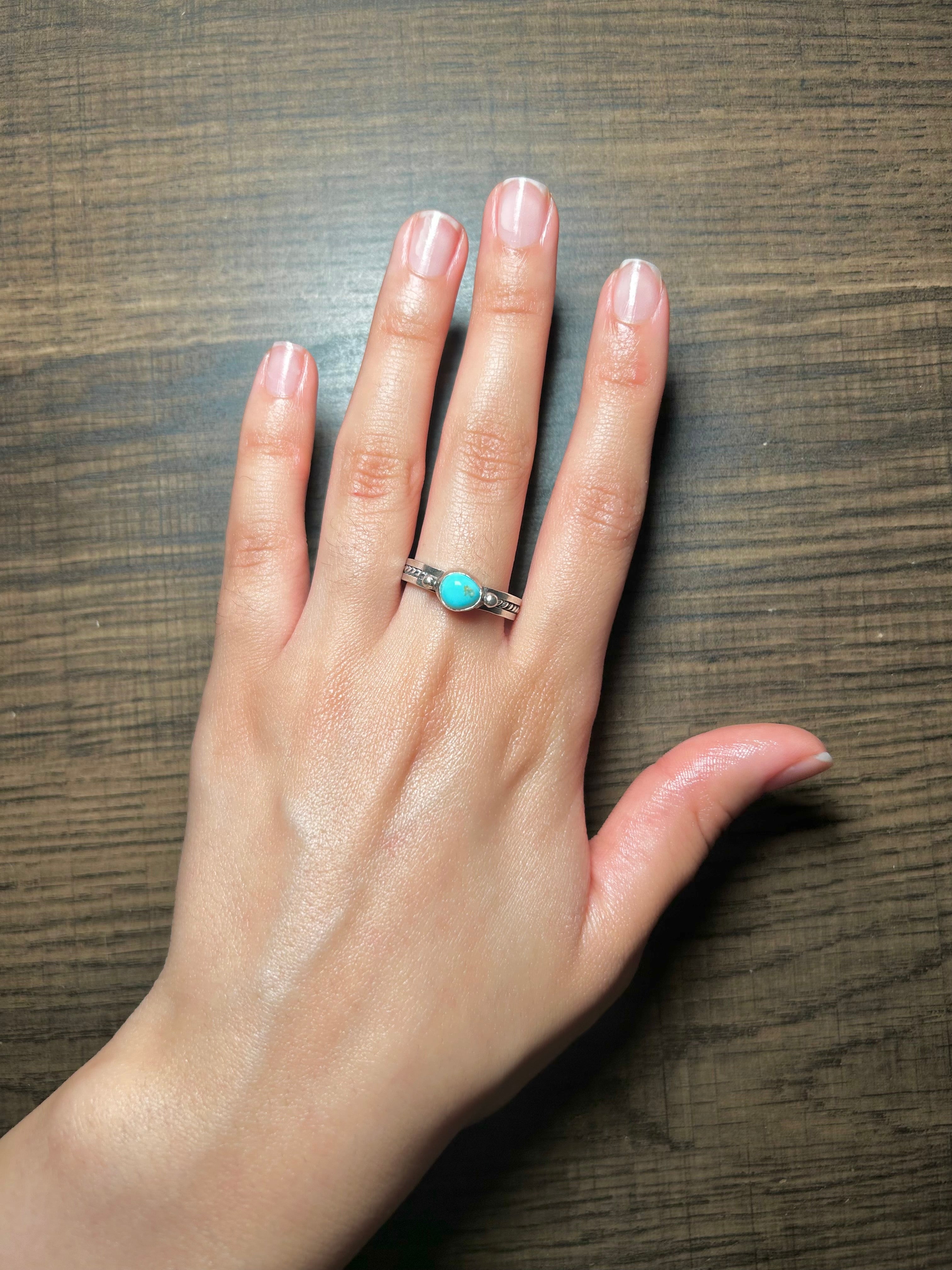 Navajo Made Kingman Turquoise & Sterling Silver Ring Size 9. It measures 1/4 of an inch long and 1/2 of an inch wide.