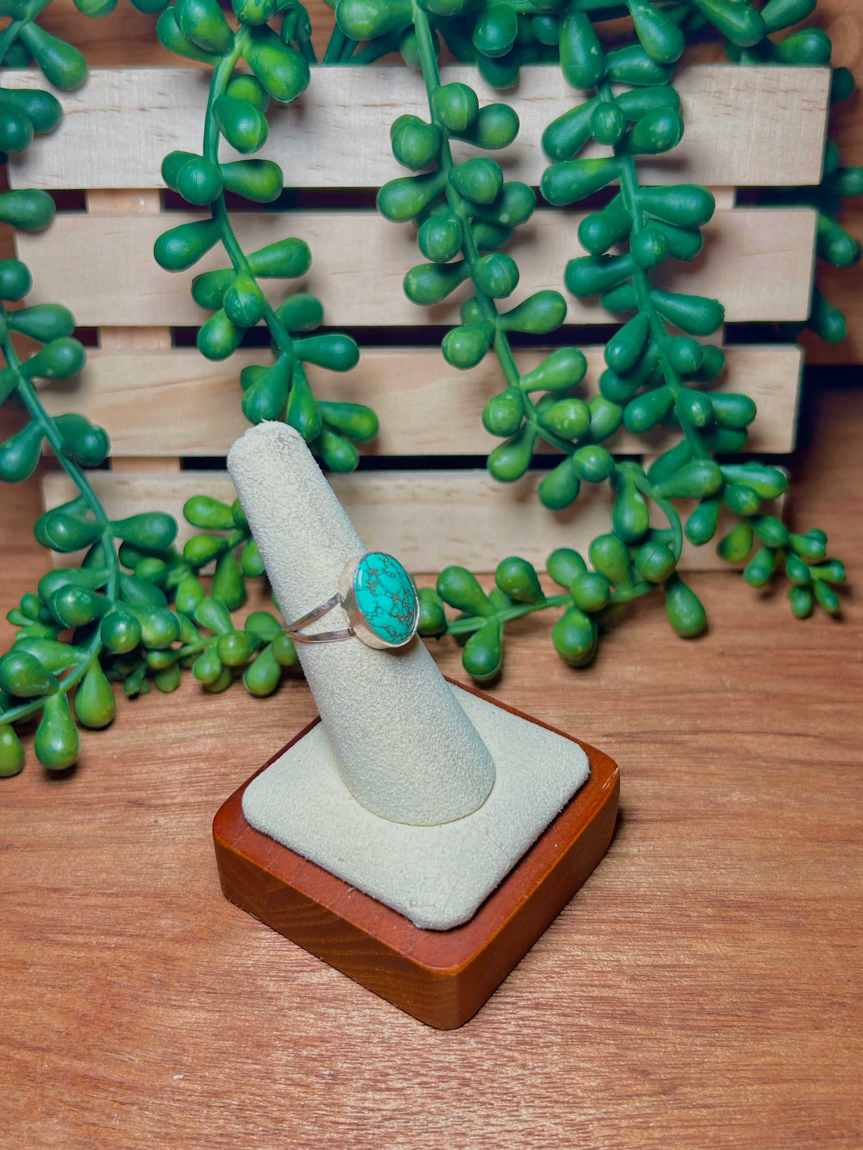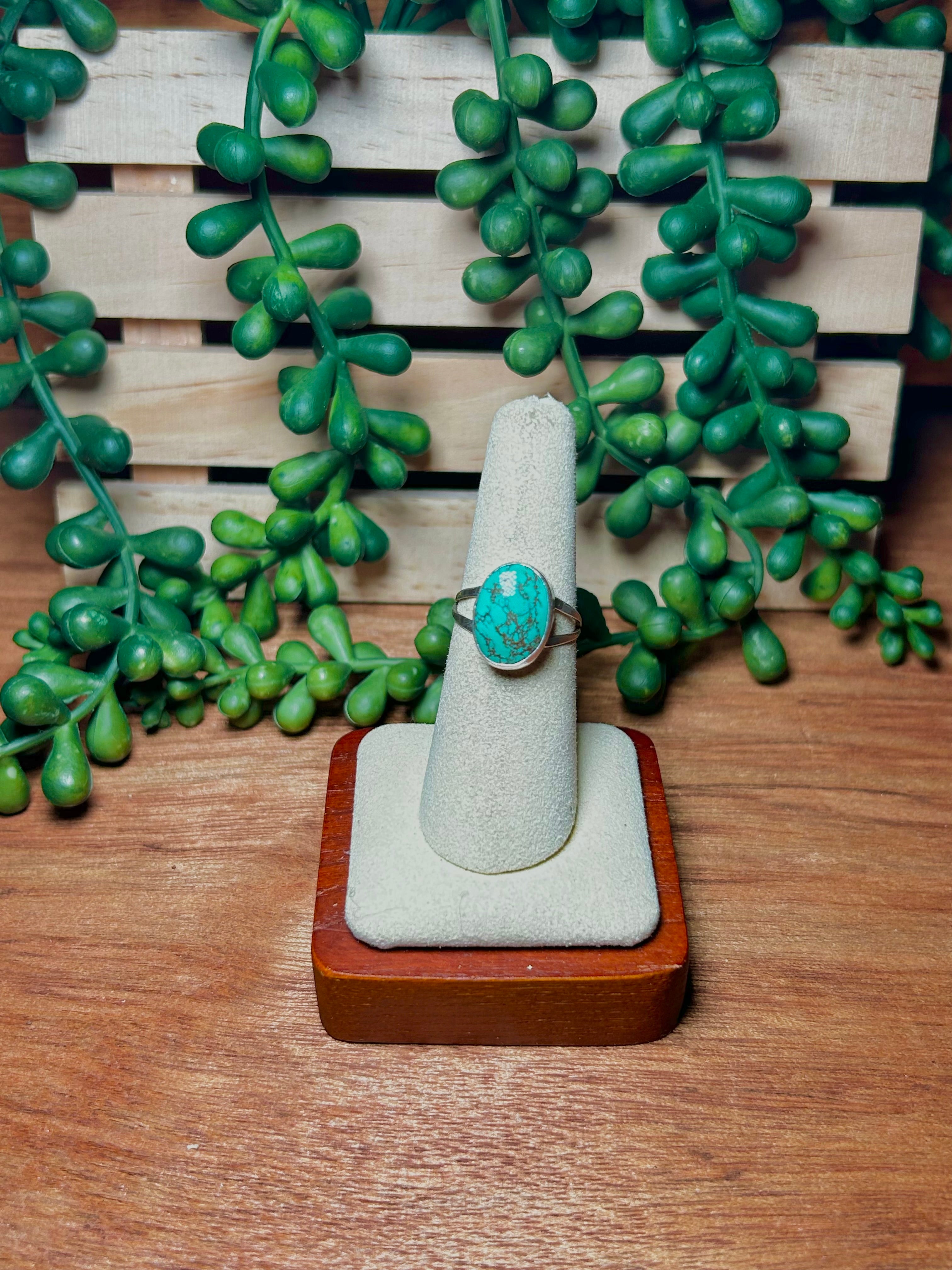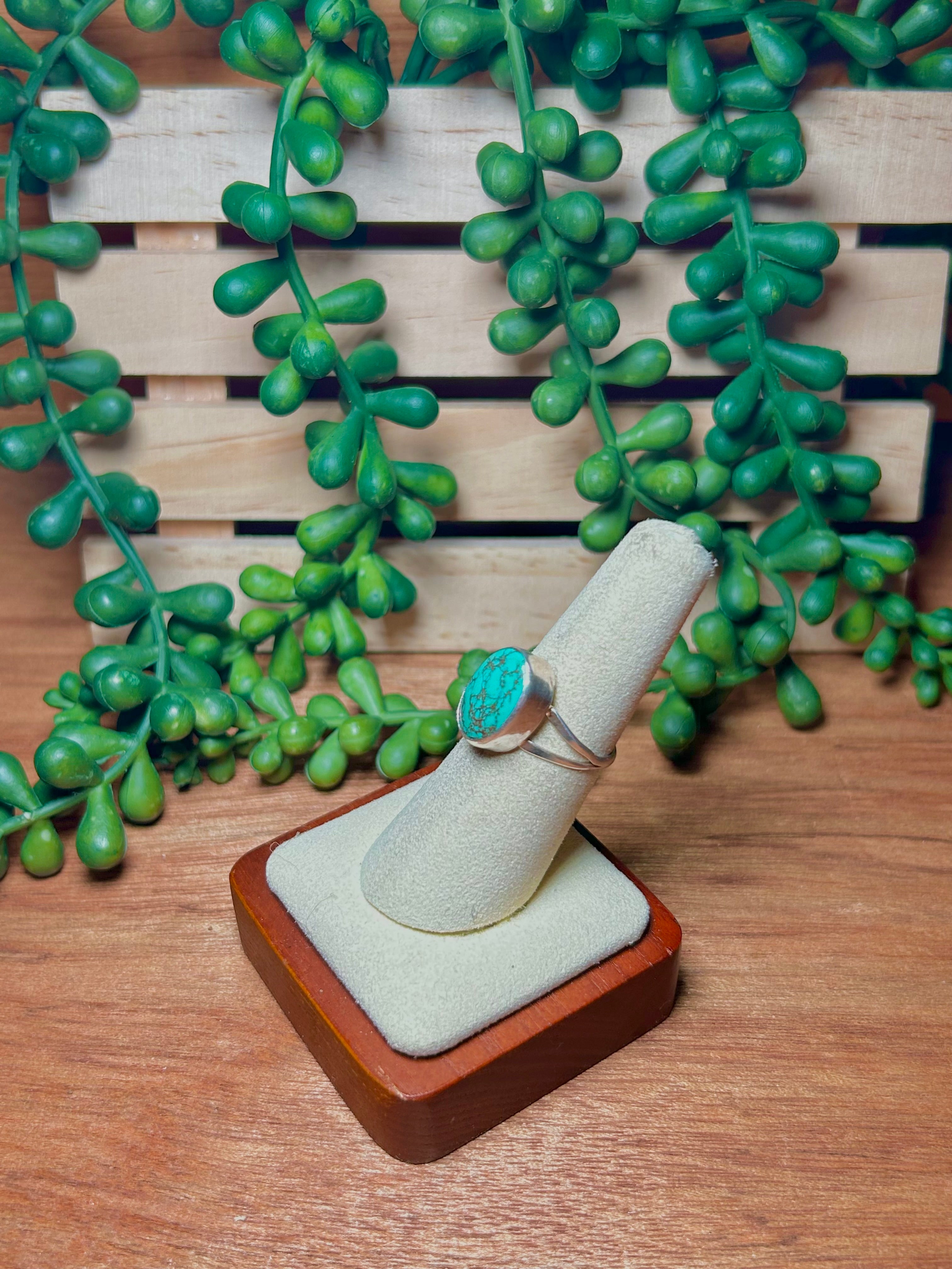 Navajo Made Kingman Turquoise & Sterling Silver Ring Size 6.25. It measures 5/8 of an inch long and 3/8 of an inch wide. Signed by the artist and stamped sterling silver.