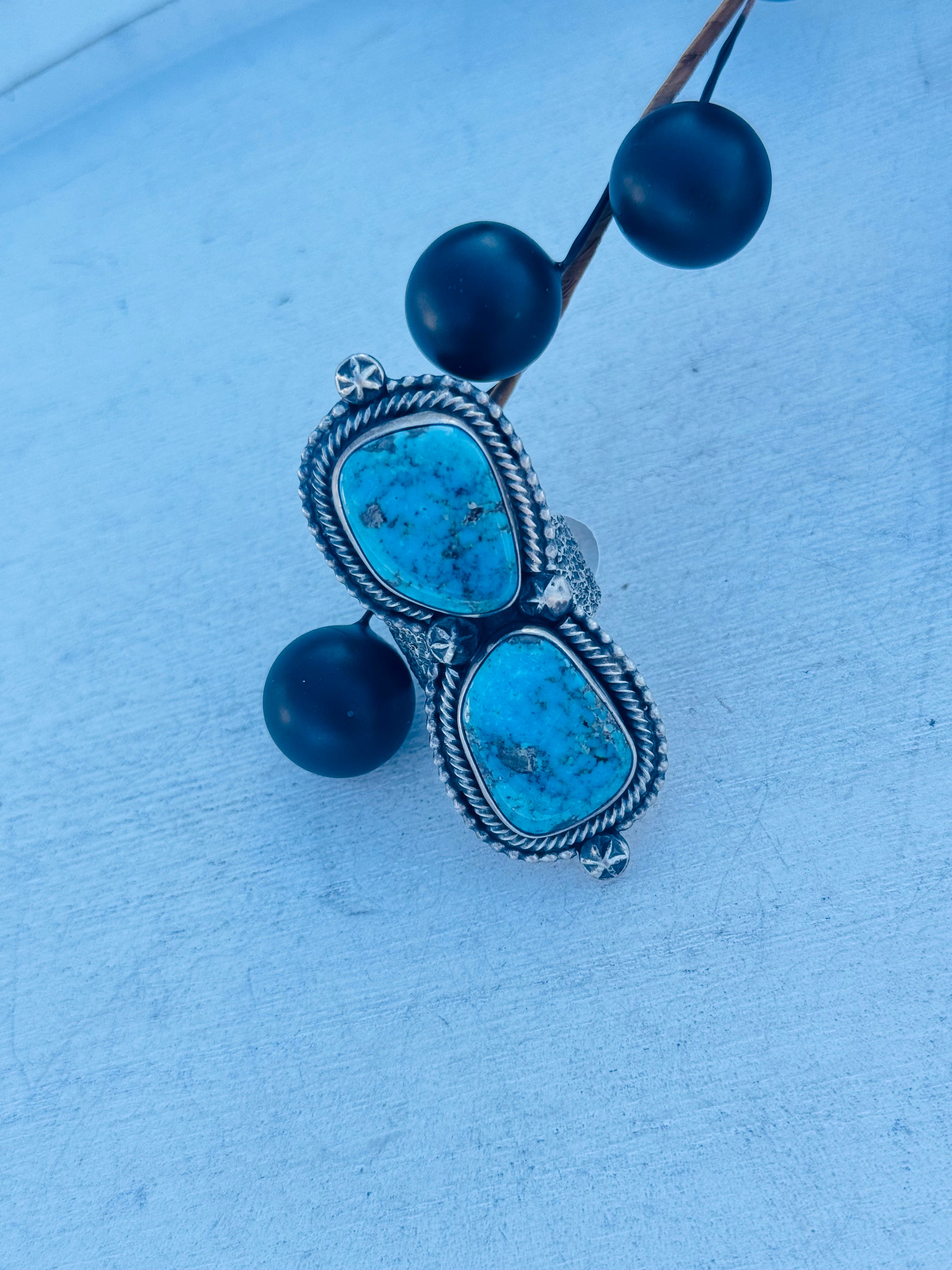 Navajo Made High Grade Kingman Turquoise & Sterling Silver Ring Size 8.5. It measures 2 3/8 inches long and 1 inch wide. Signed by the artist and stamped sterling silver.