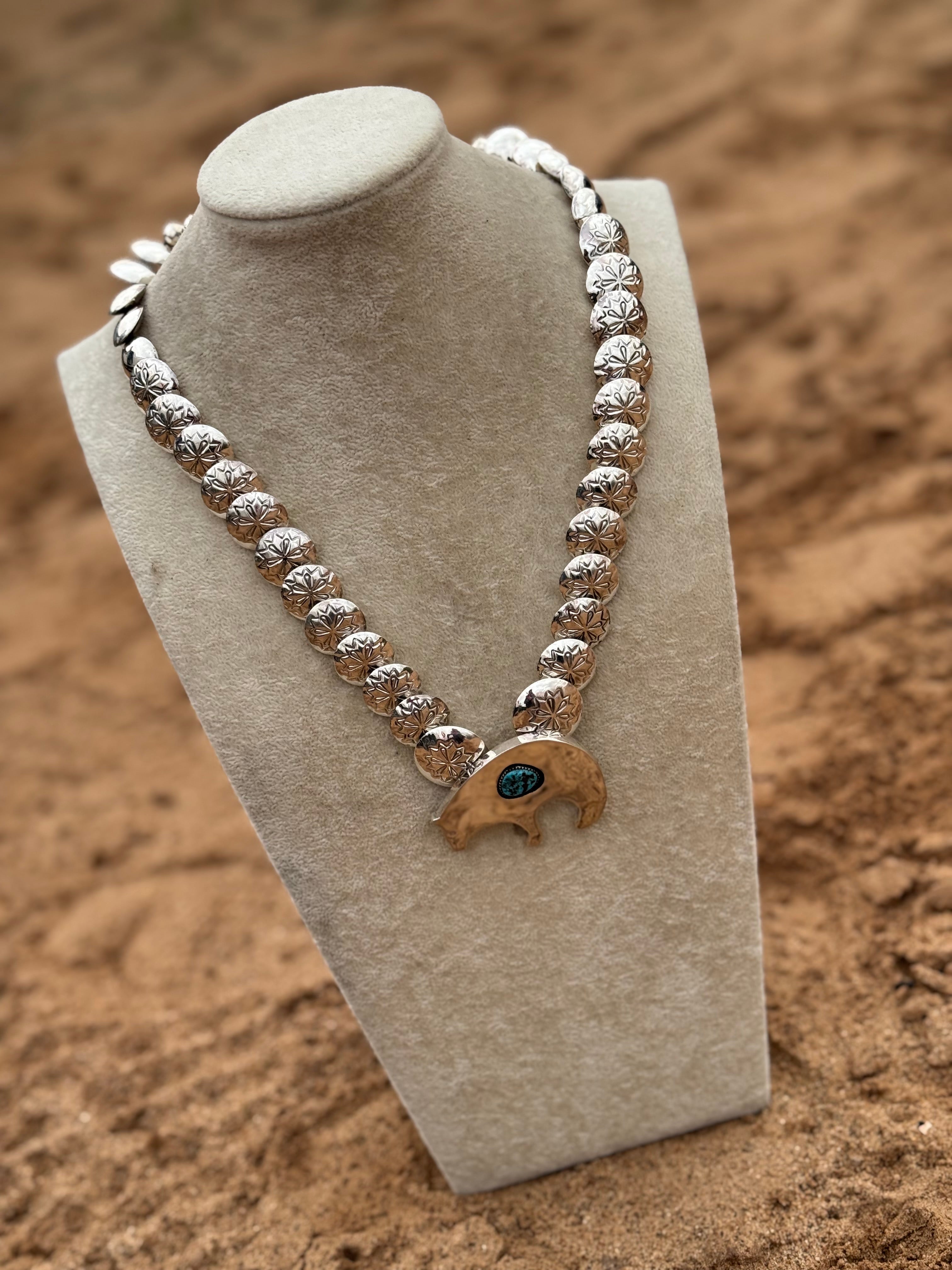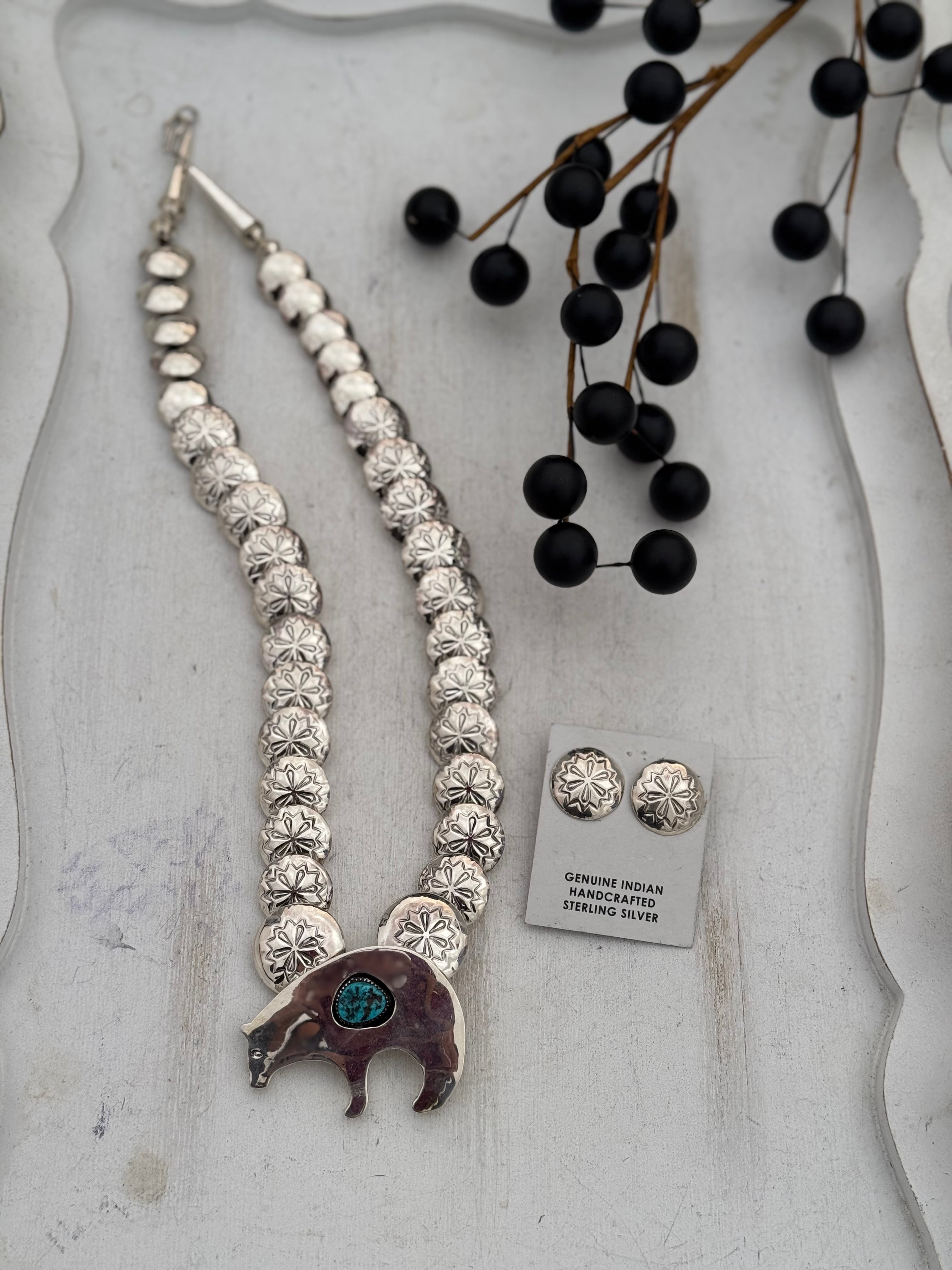 Navajo Made Kingman Turquoise & Sterling Silver Pearl Necklace Set. It measures 23 inches long with hang while the chain measures 20 1/2 inches long. Signed by the artist and stamped sterling silver.