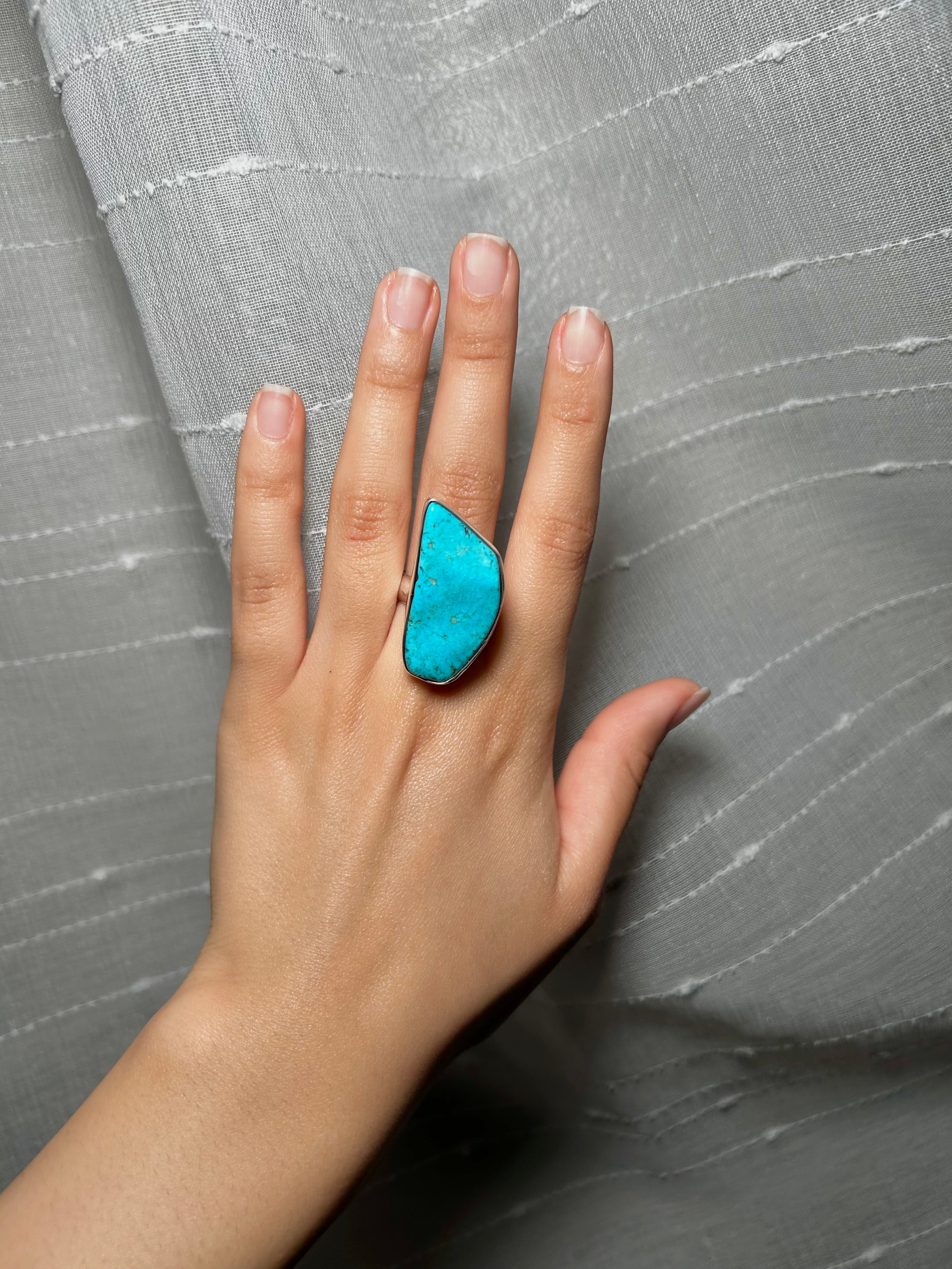 Navajo Made Kingman Turquoise & Sterling Sliver Ring Size 9. It measures 1 1/2 inches long and 3/4 of an inch wide. Signed by the artist and stamped sterling silver.