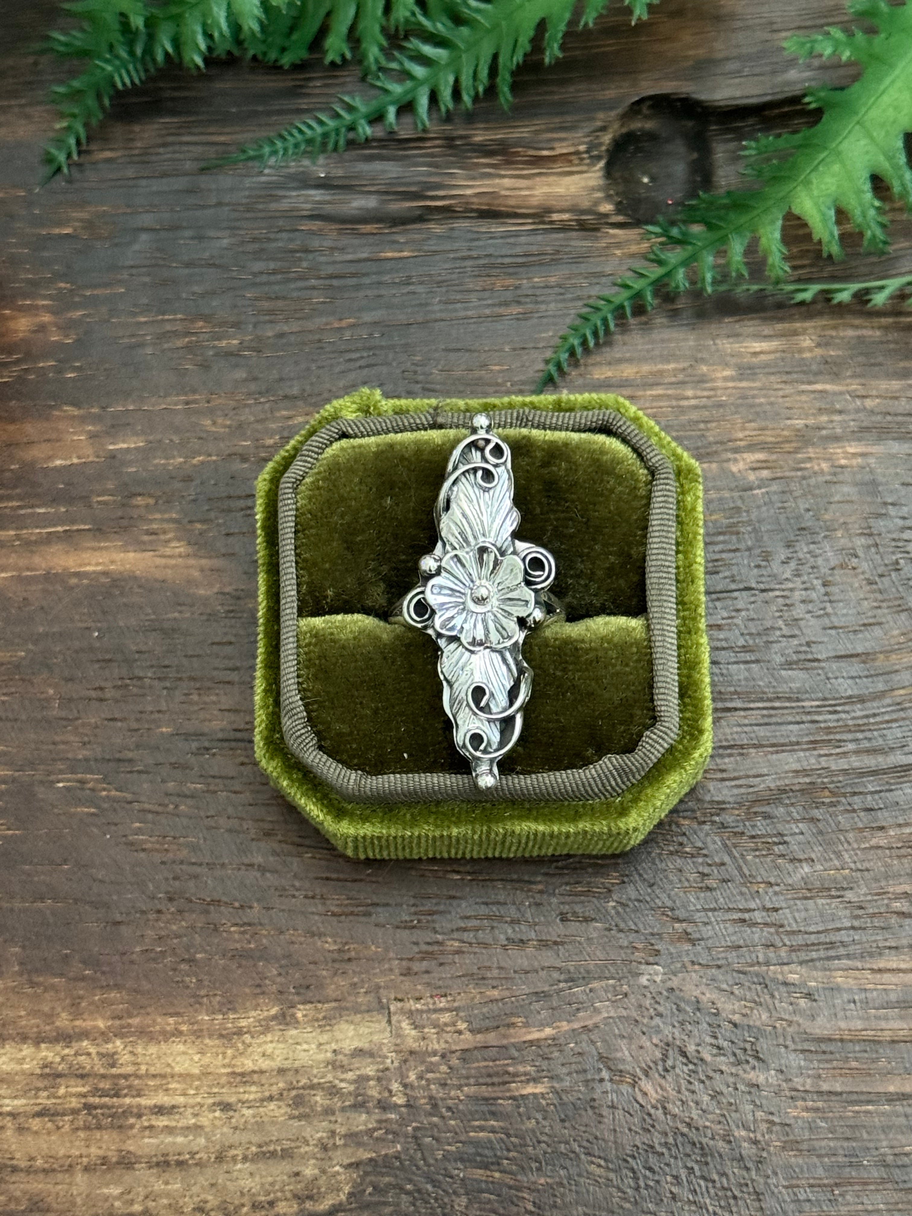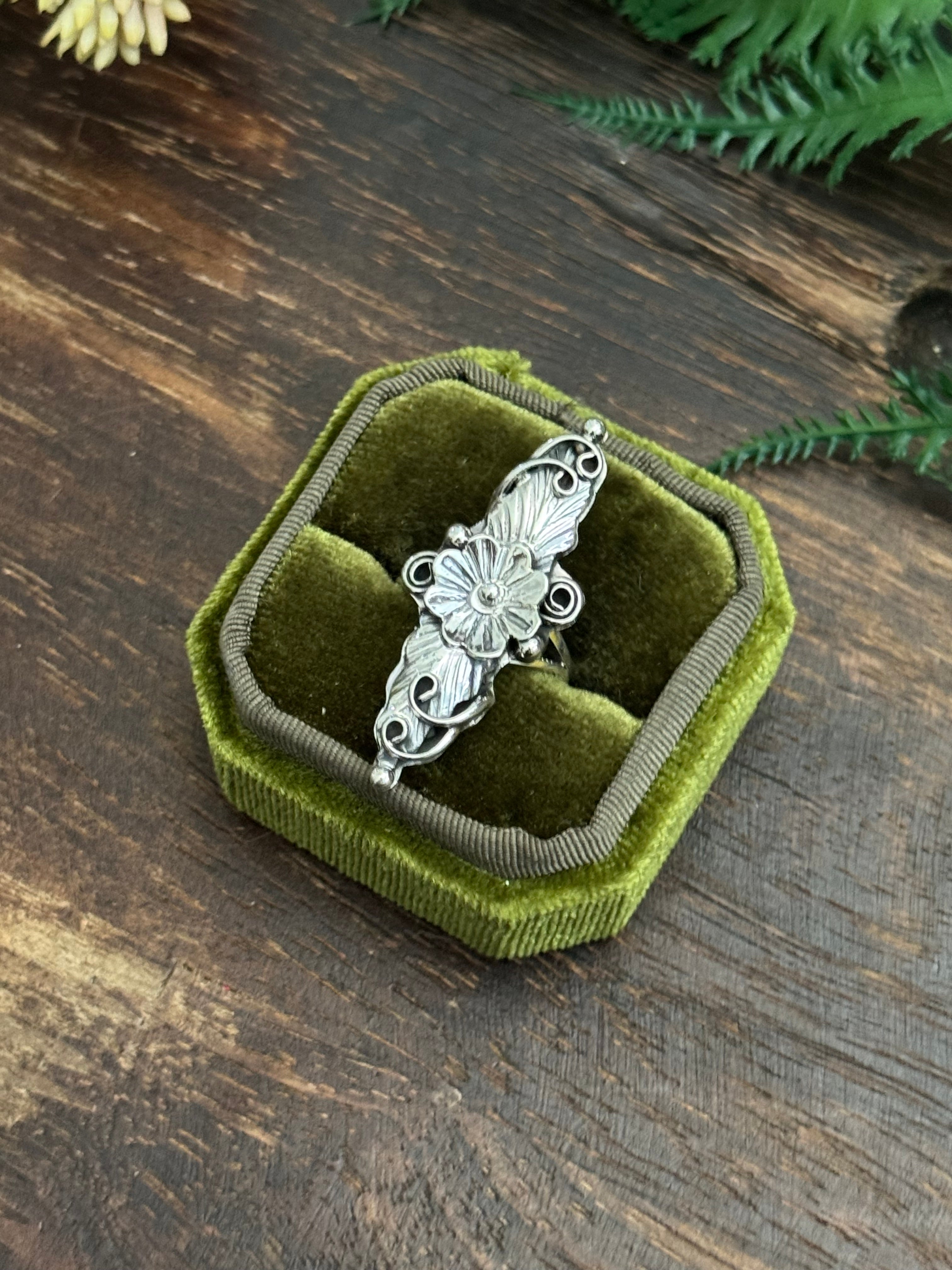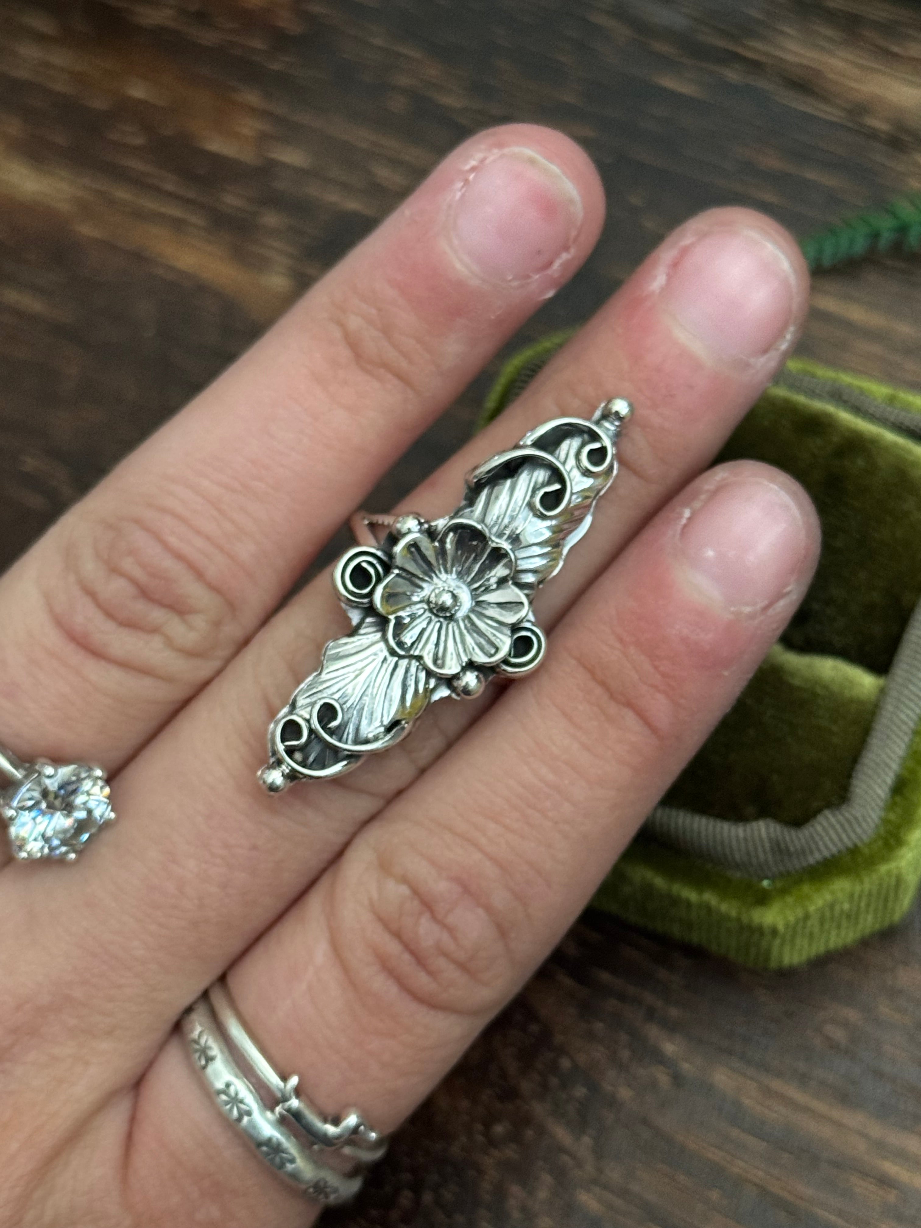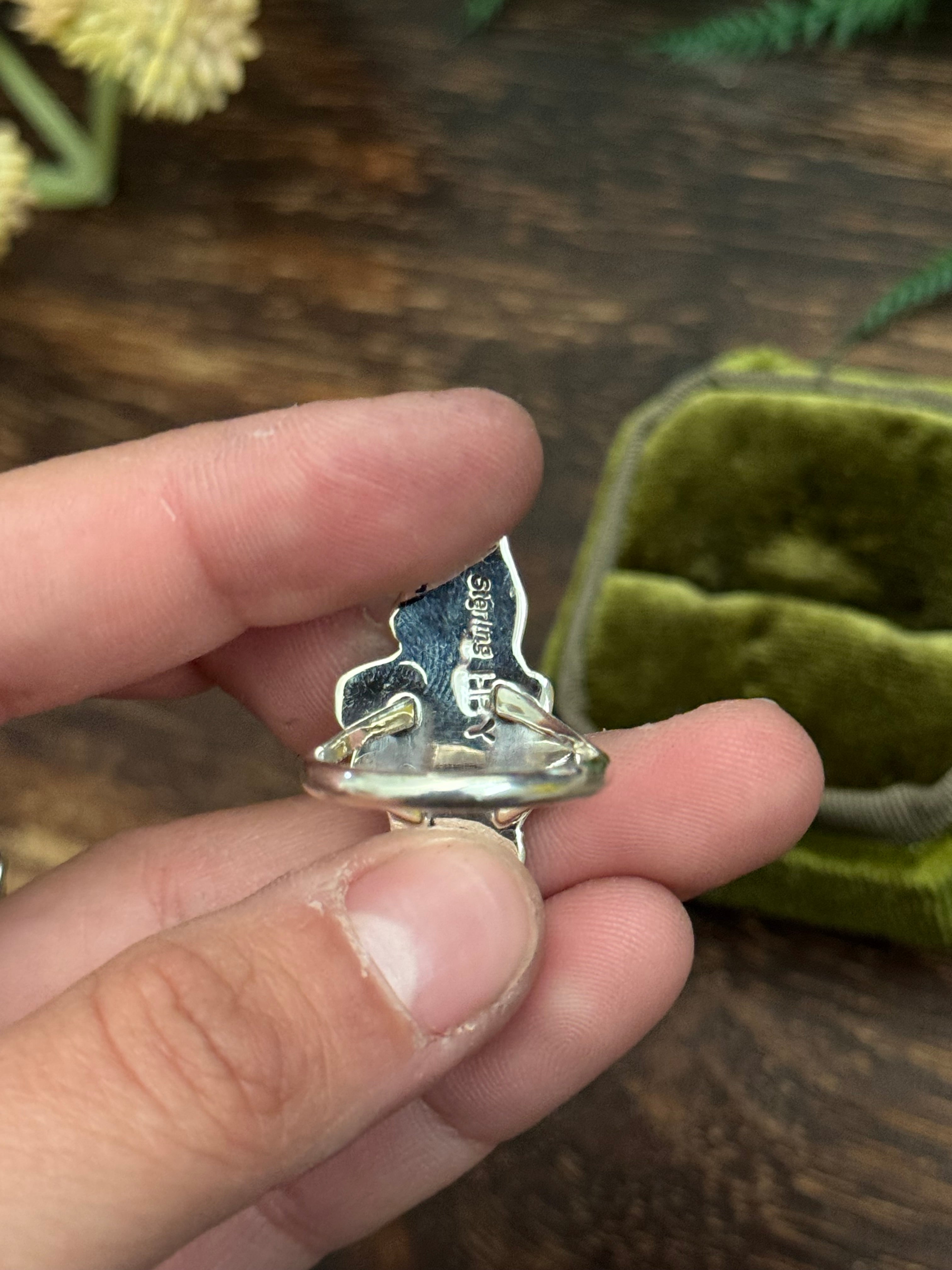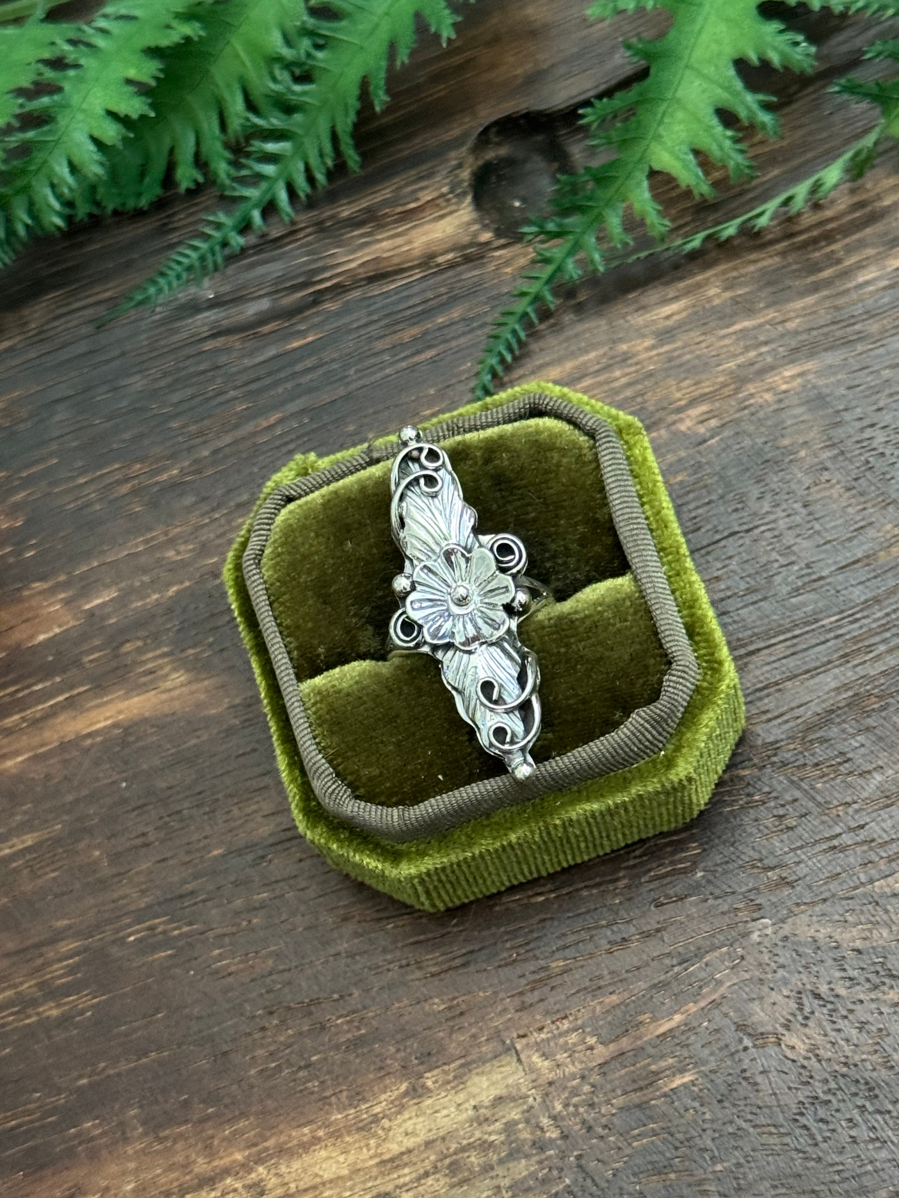 Navajo Made Sterling Sliver Ring. It measures 1 5/8 inches long and 5/8 of an inch wide. Signed by the artist and stamped sterling silver.
