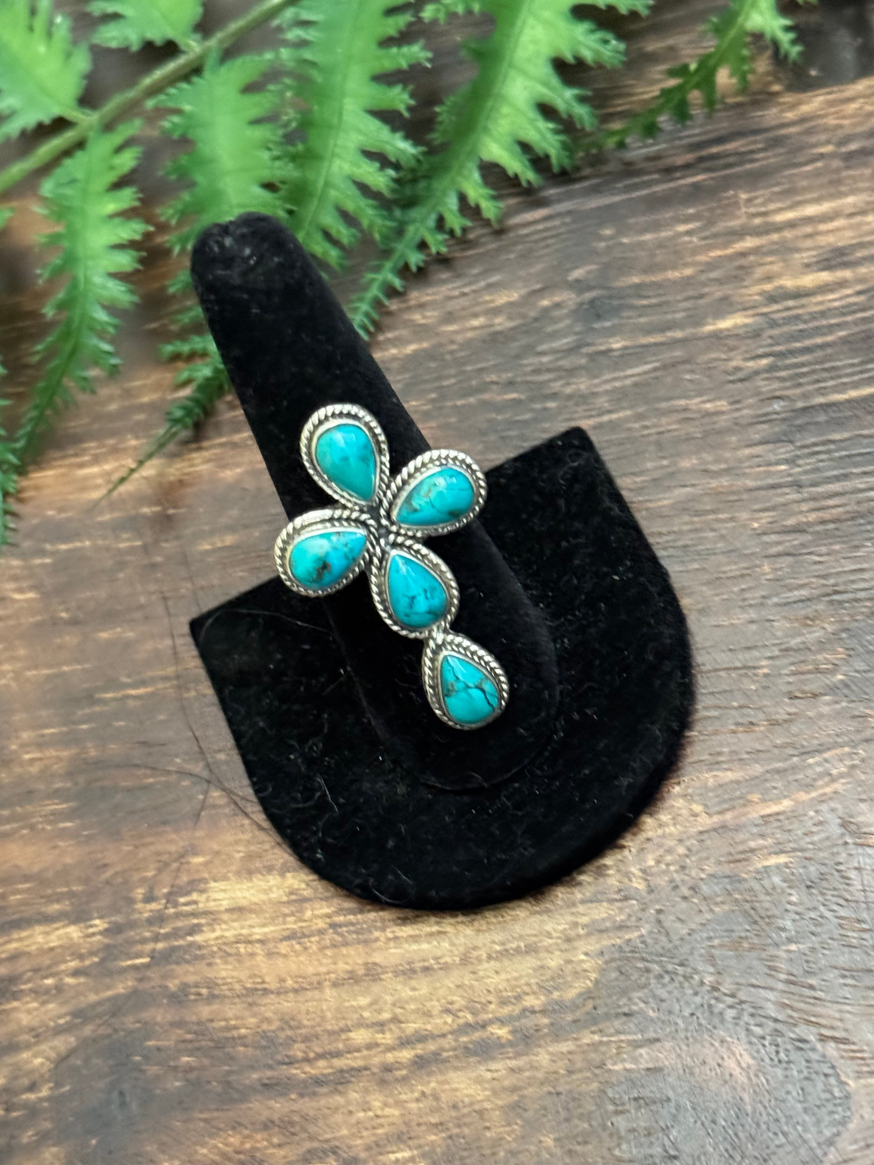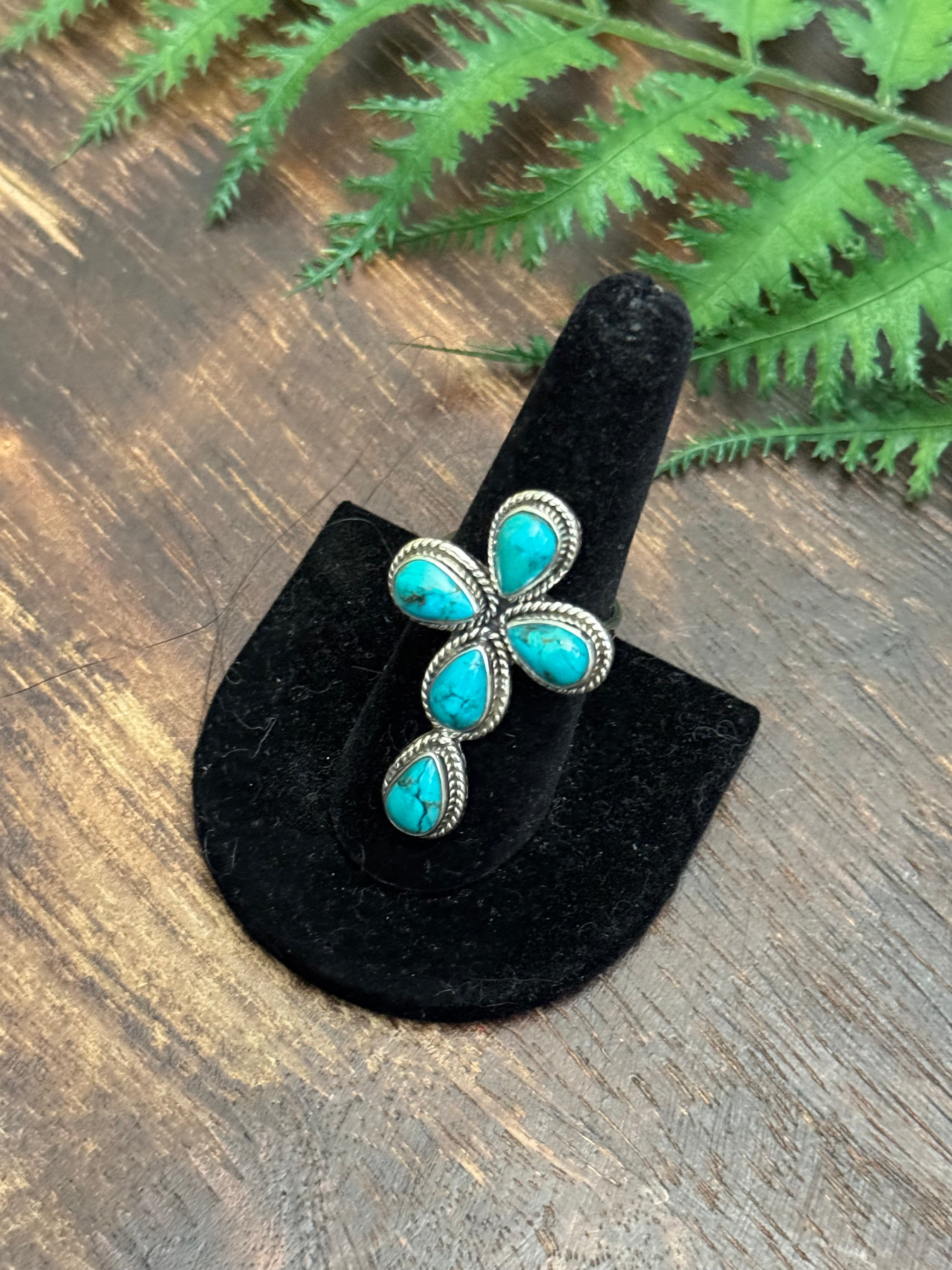 Navajo Made Mohave Kingman Turquoise & Sterling Silver Cross Ring. It measures just over 1 3/8 inches long and 1 inch wide. Signed by artist and stamped sterling silver. Stones will differ due to natural stones.