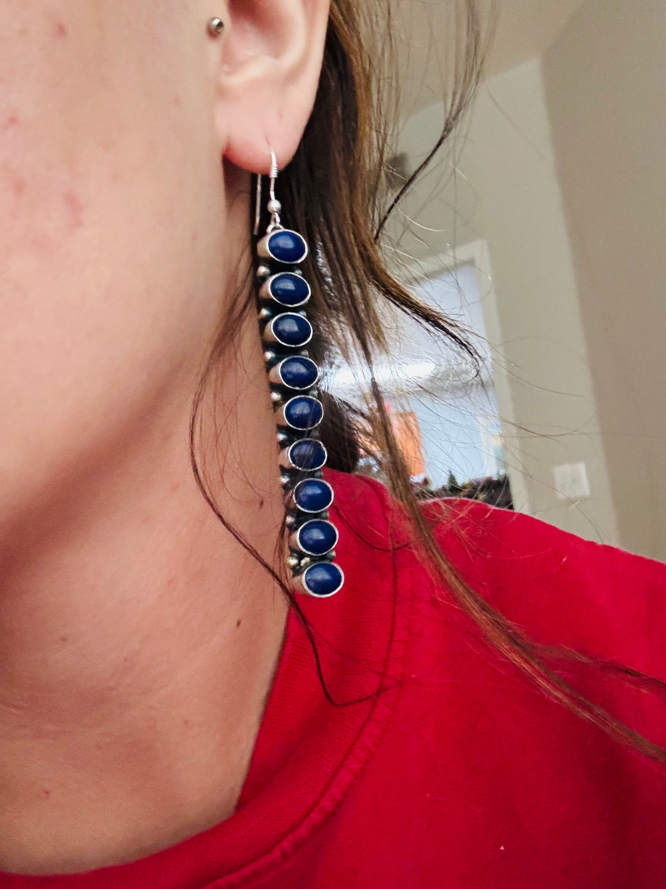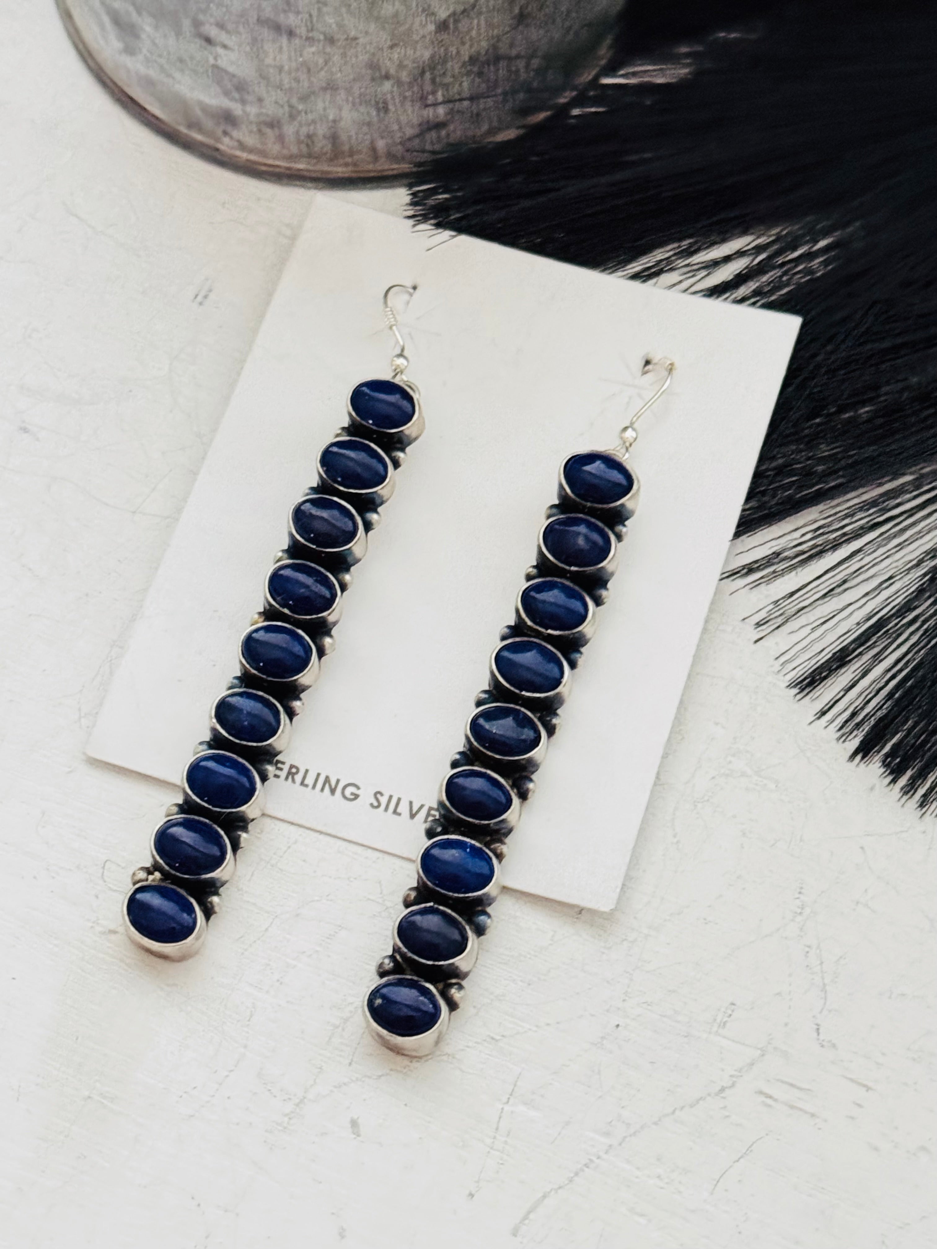 Have a spice in your everyday. Navajo Made Lapis & Sterling Silver Dangle Earrings. It measures 3 1/2 inches long and 3/8 of an inch wide.