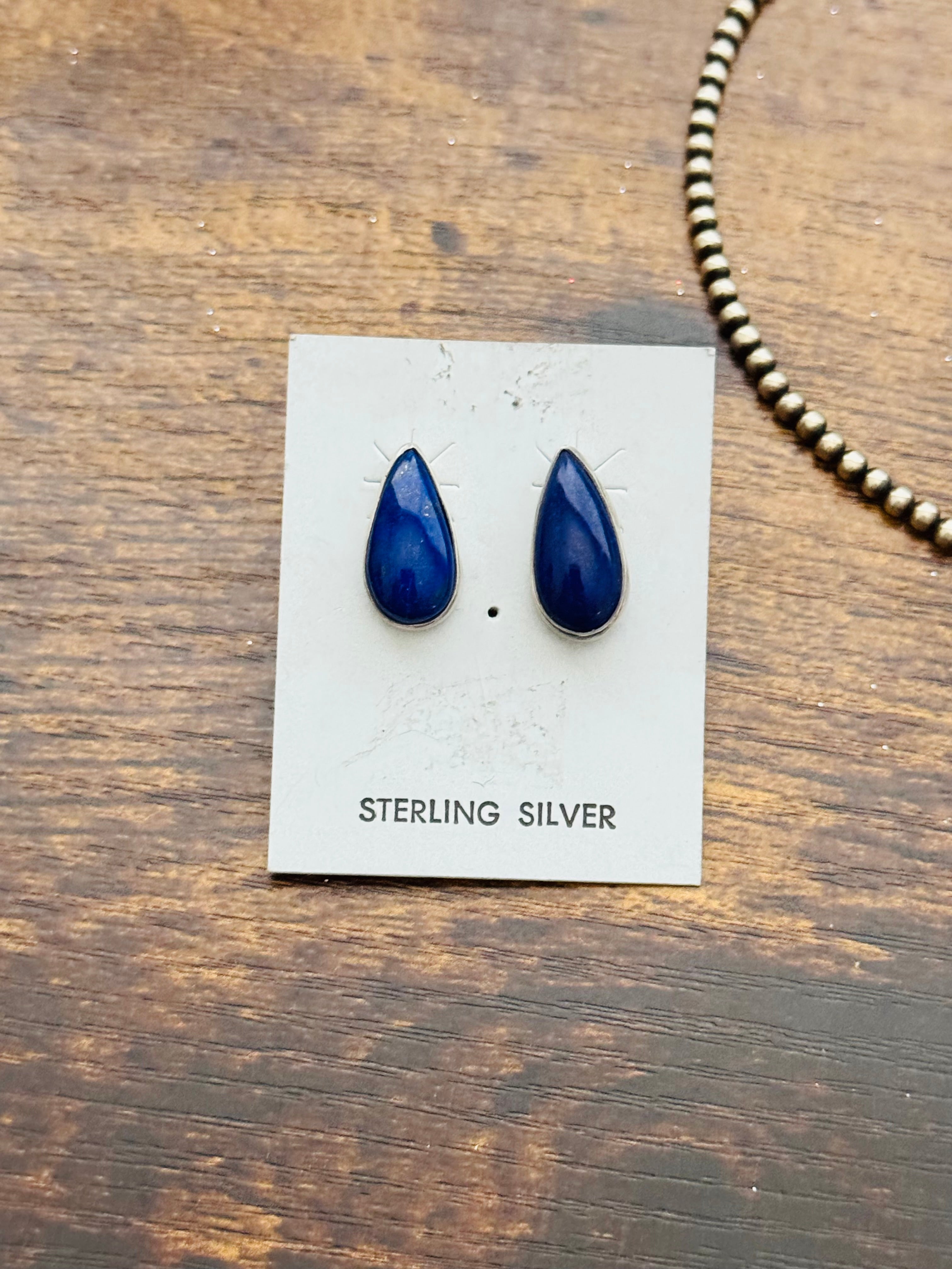 Navajo Made Lapis & Sterling Silver Necklace Set. It measures 22 inches long with hang but can adjust down to just over 18 inches long. Stamped sterling silver.