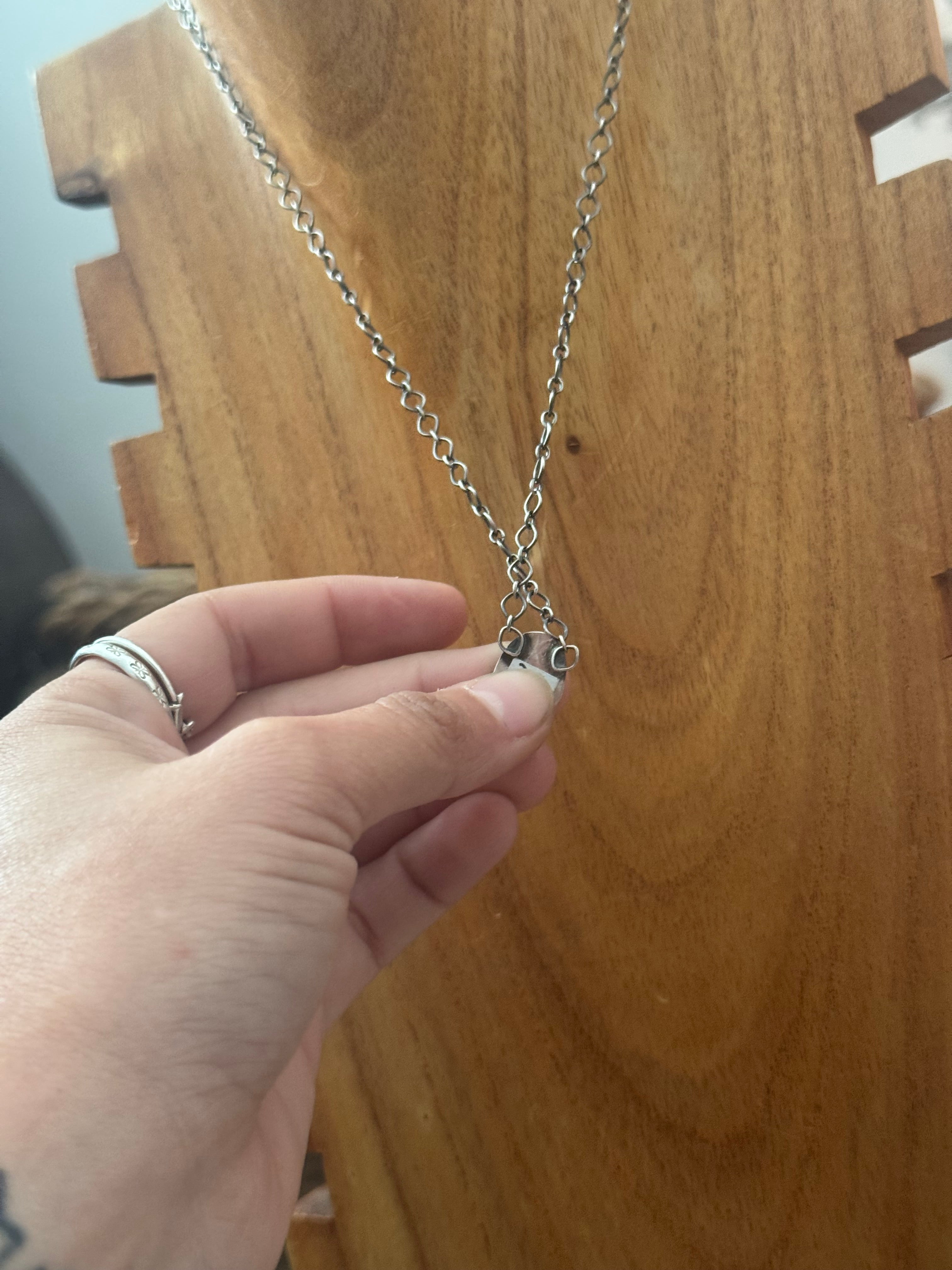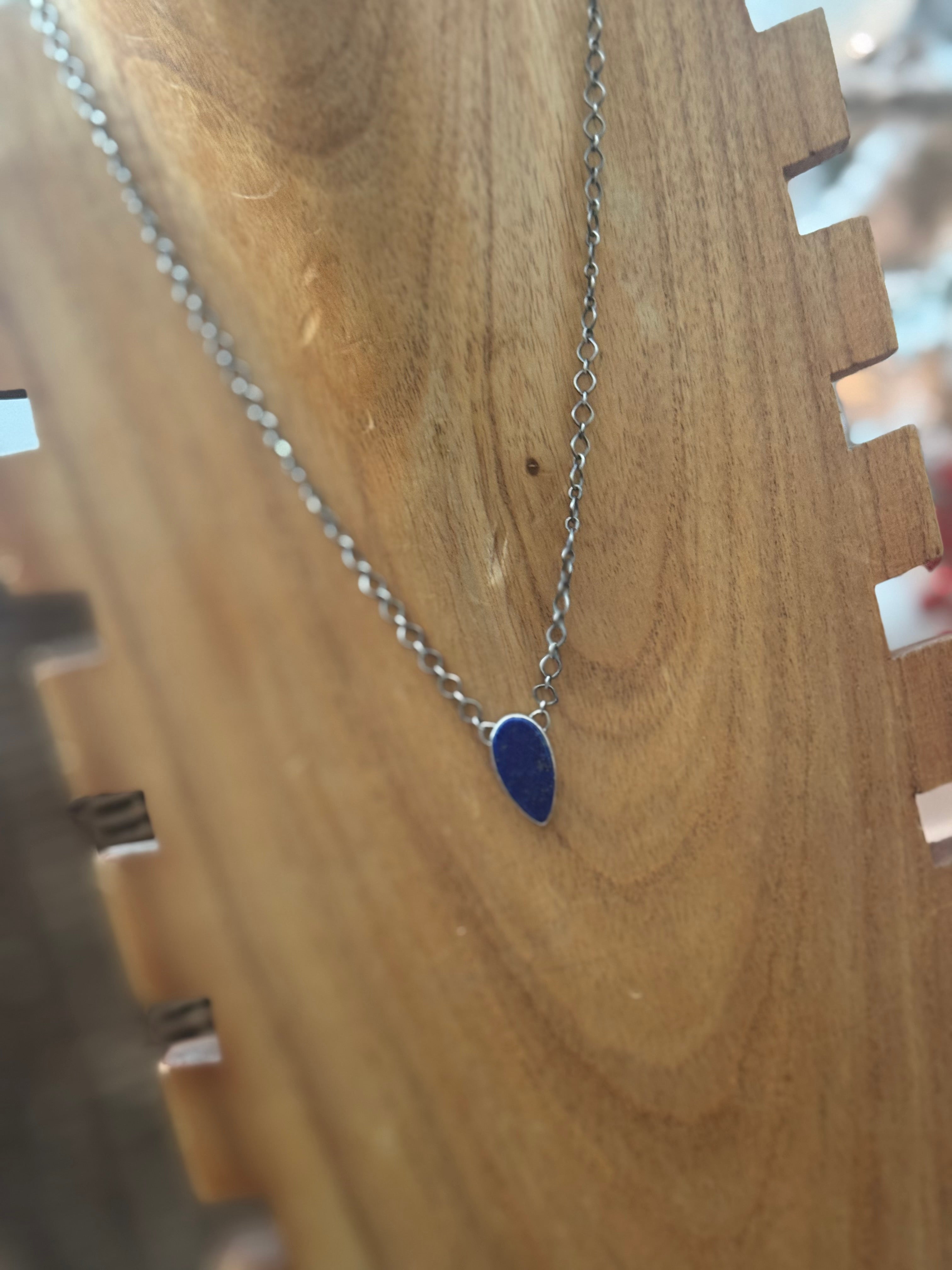 Navajo Made Lapis & Sterling Silver Necklace. It measures 19 inches long with hang while the chain measures 17 1/2 inches long. Signed by the artist and stamped sterling silver.
