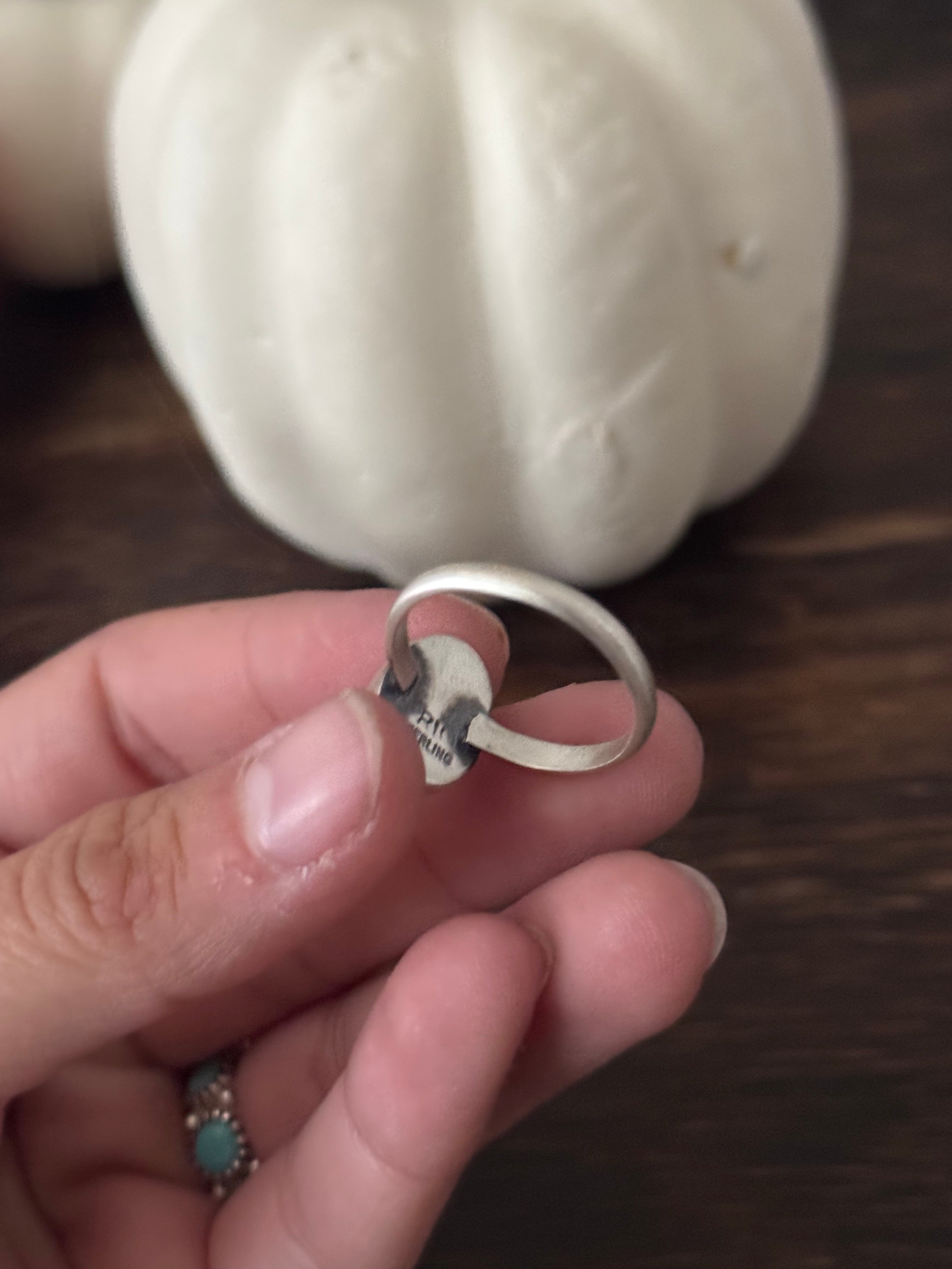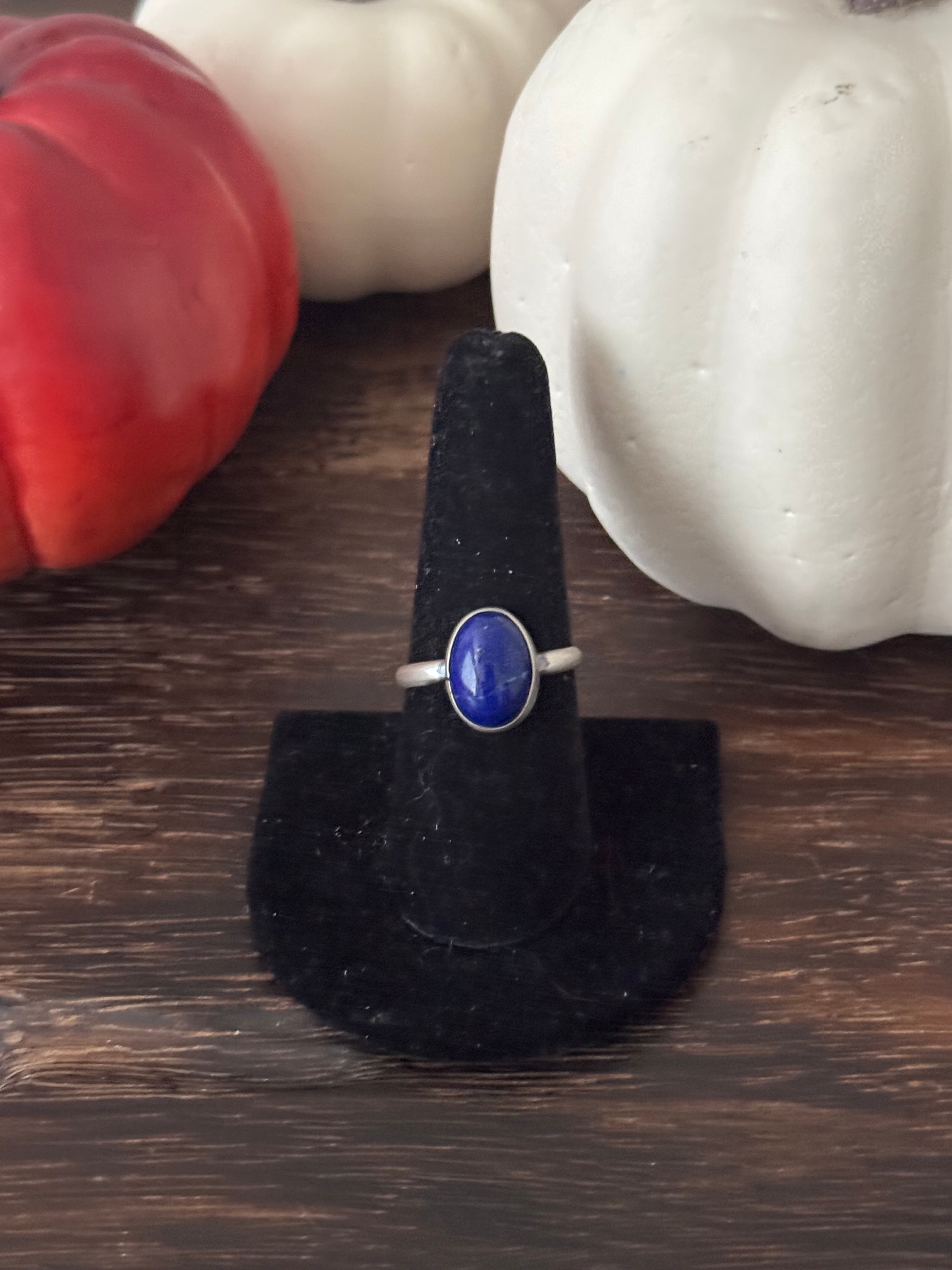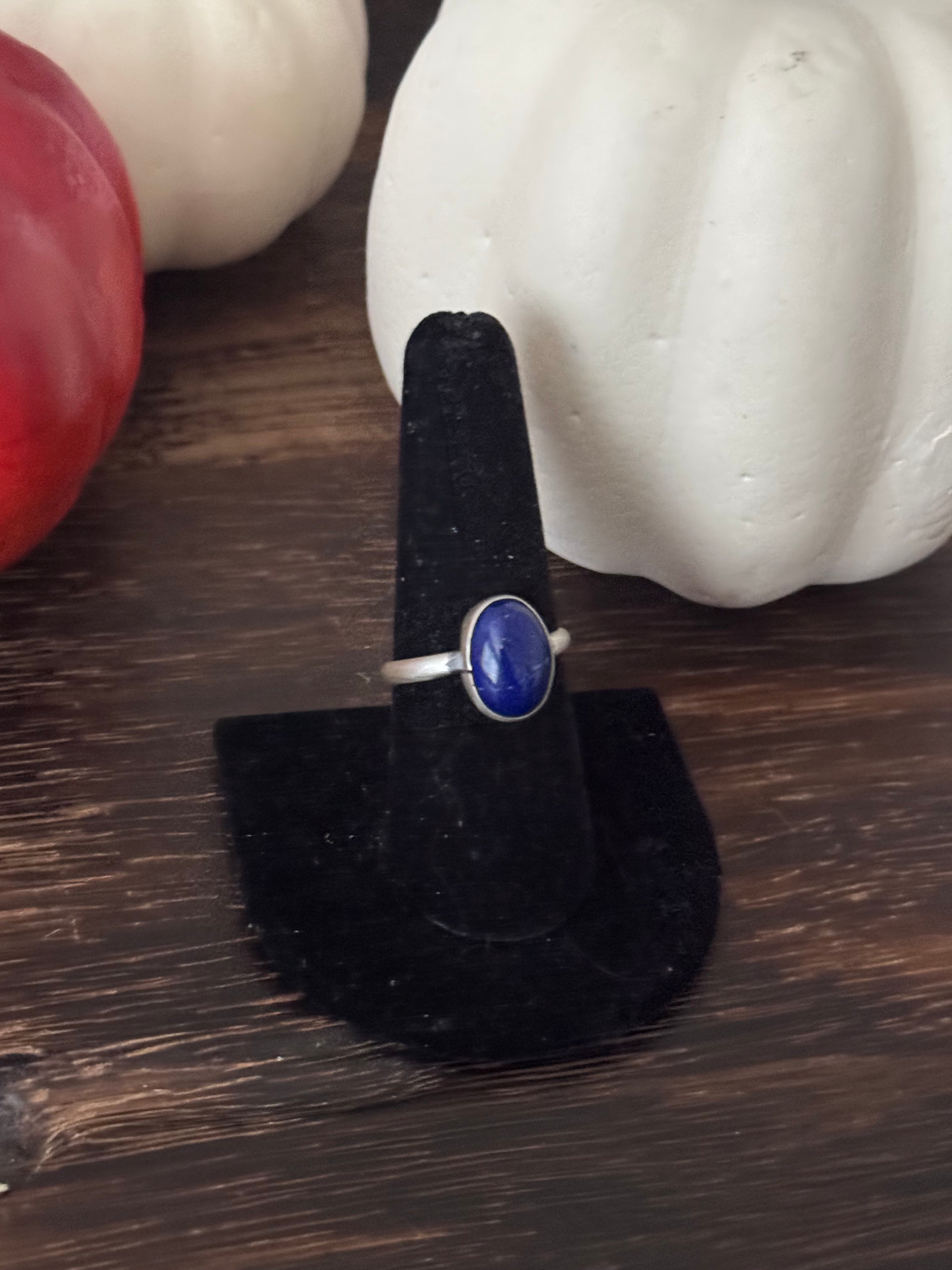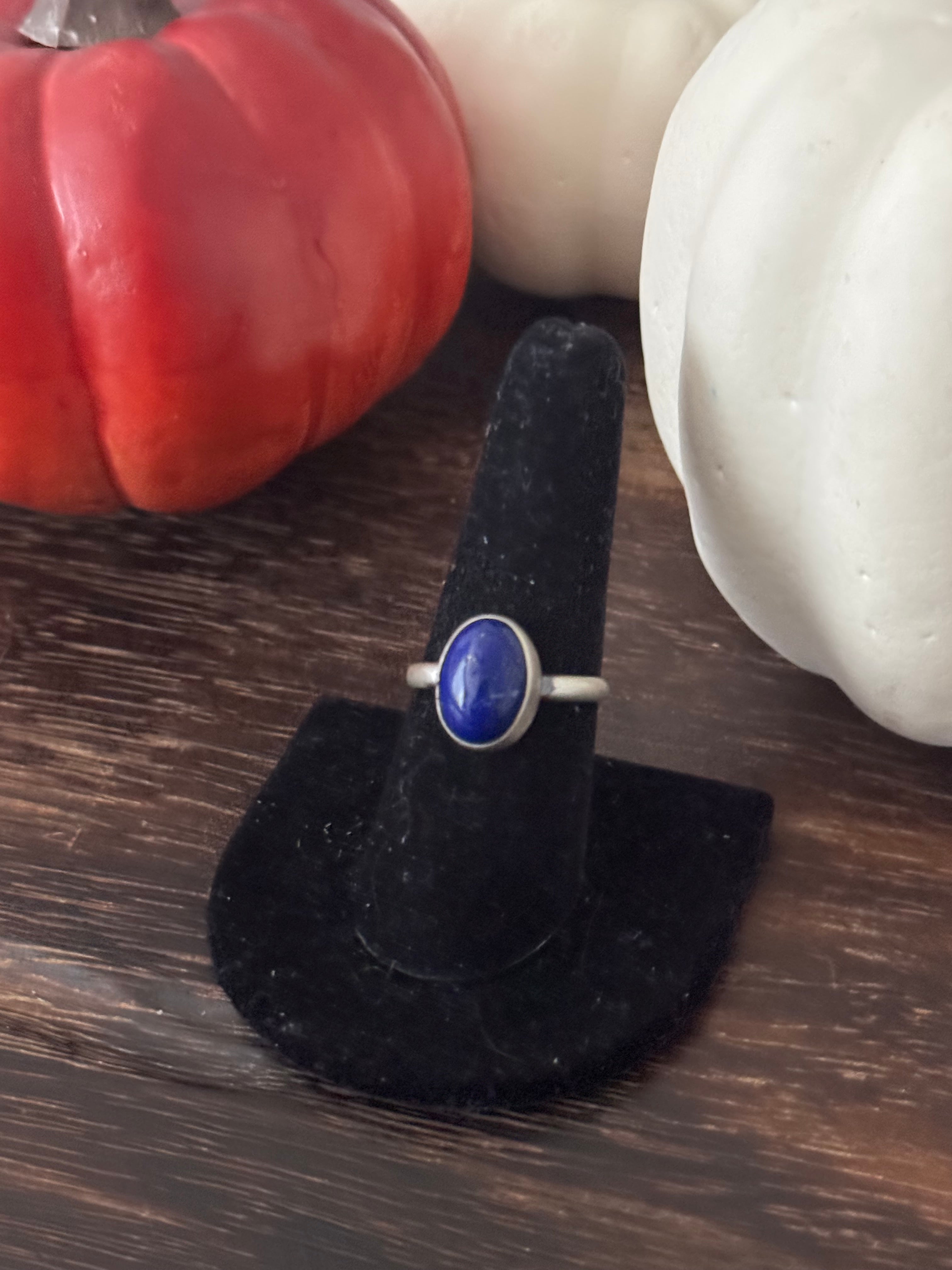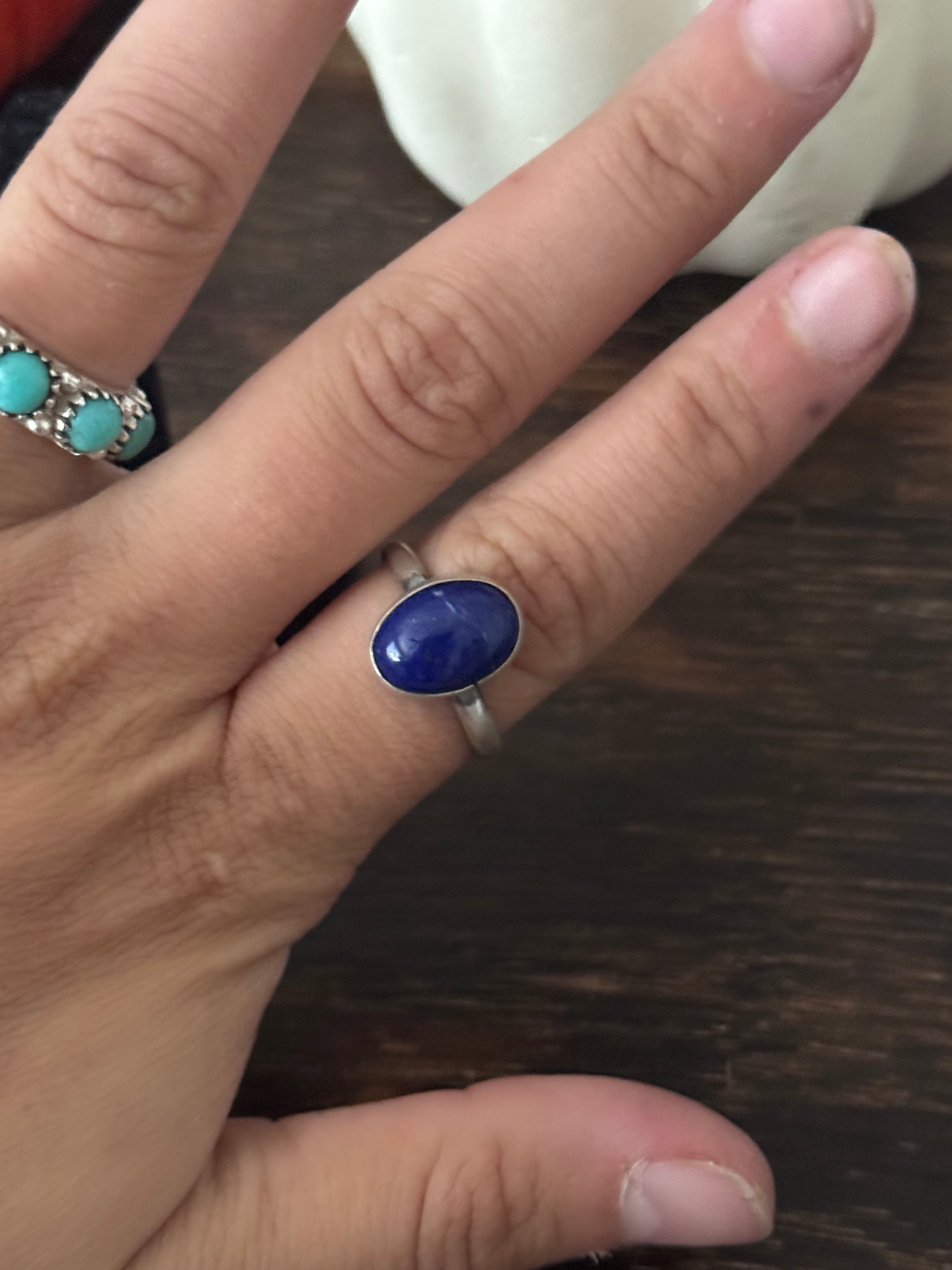 Navajo Made Lapis & Sterling Silver Ring. It measures 5/8 of an inch long and just over 1/2 of an inch wide. Signed by artist and stamped sterling silver.