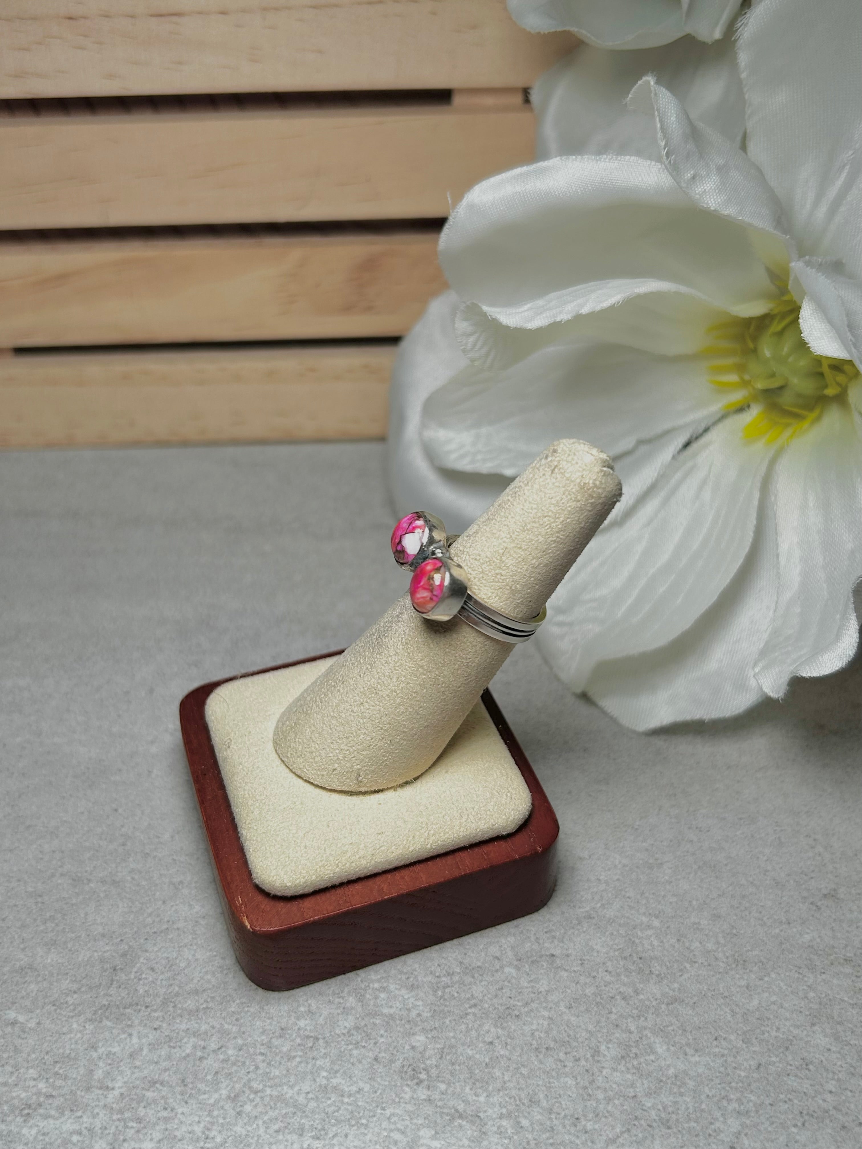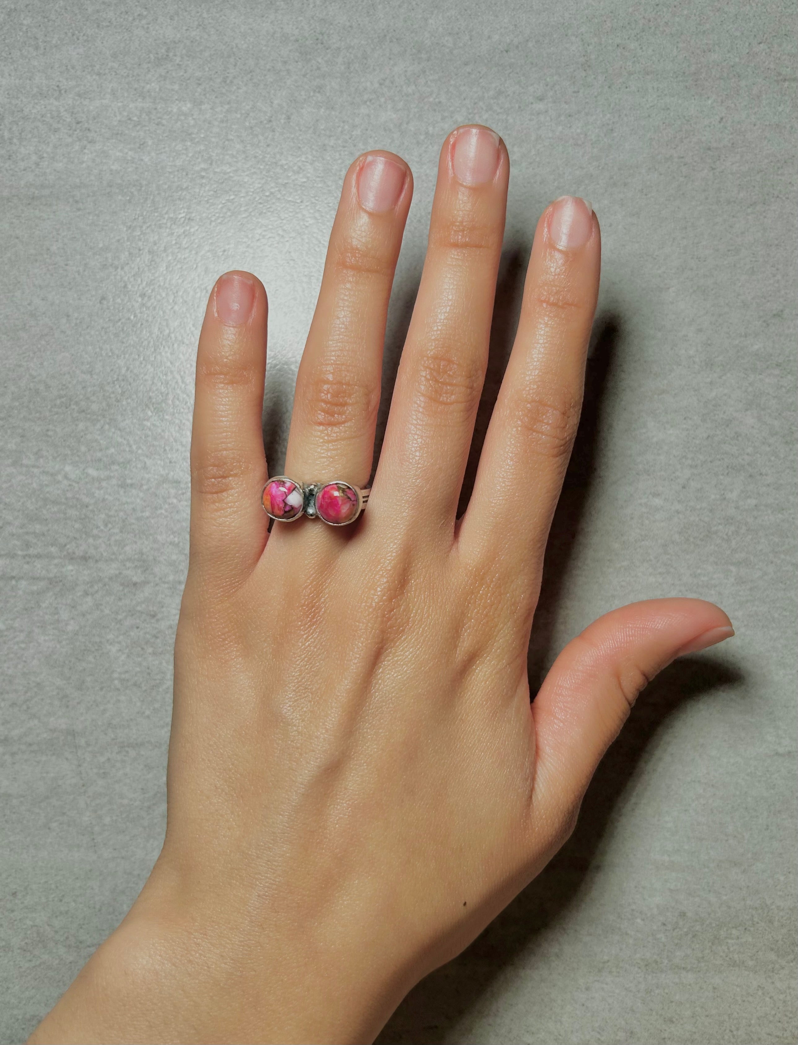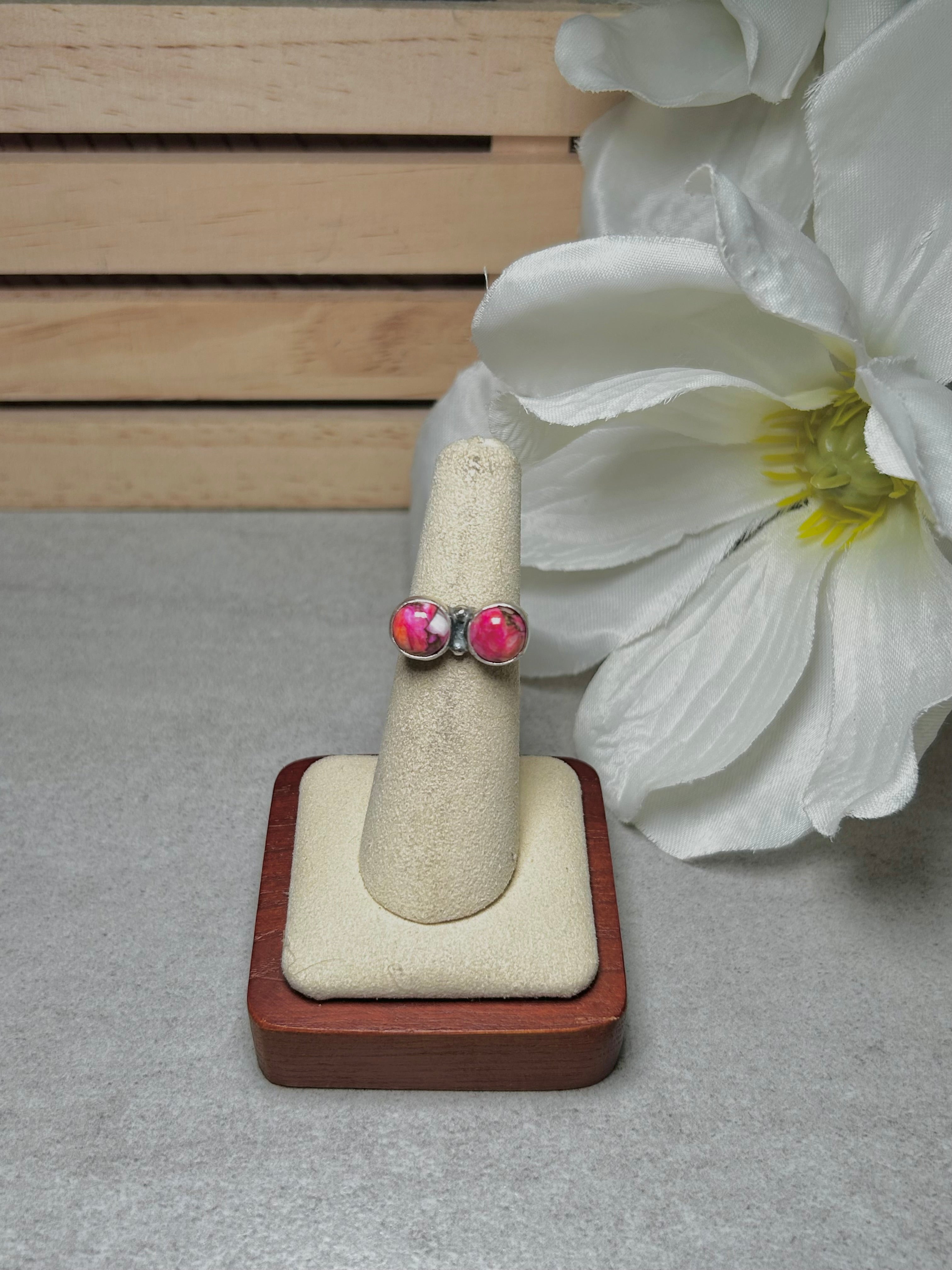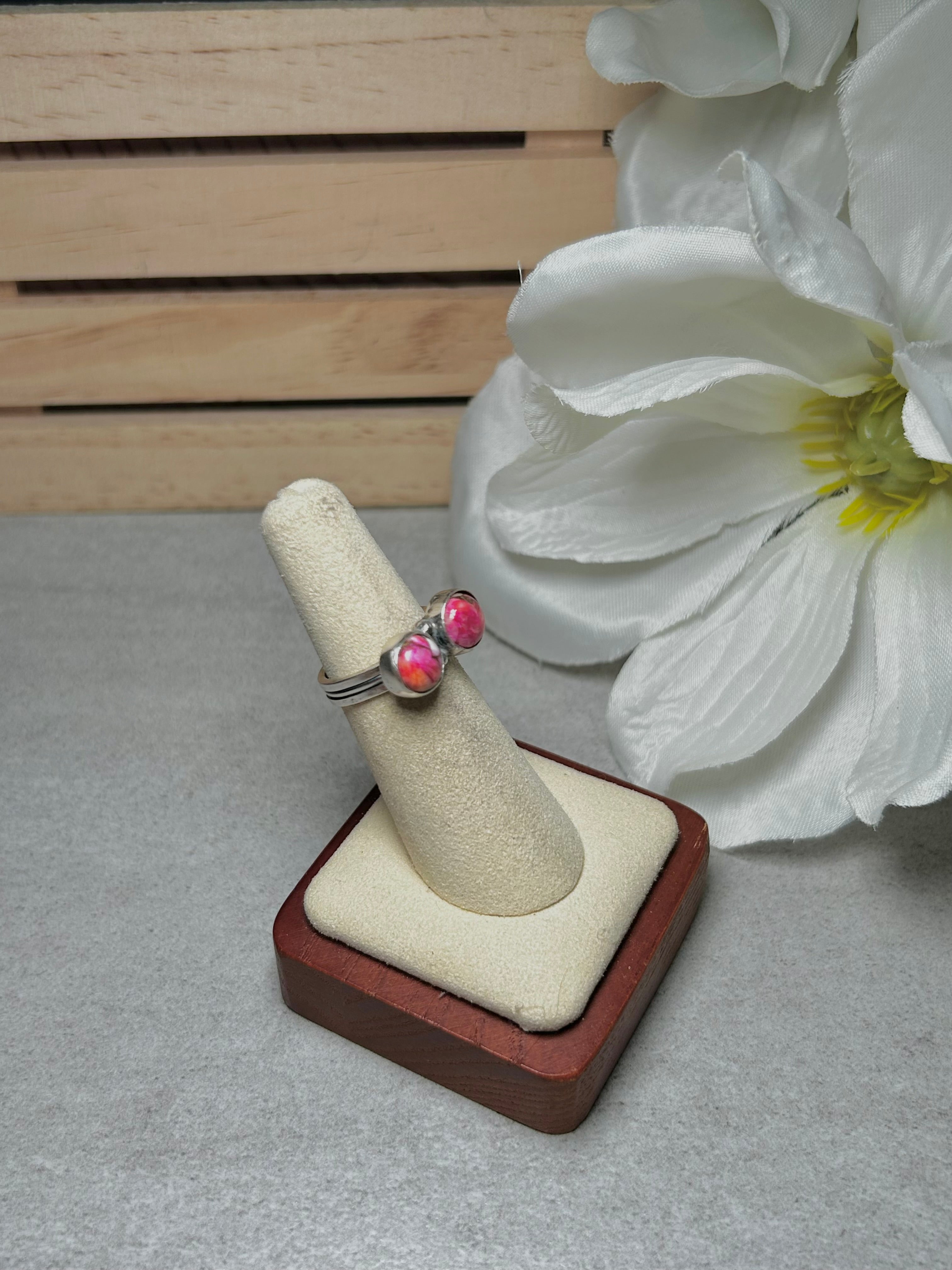 Navajo Made Mohave Turquoise & Sterling Silver Ring. It measures 5/8 of an inch long and 1/4 of an inch wide. Signed by the artist and stamped sterling silver. Stones may vary due to natural stones