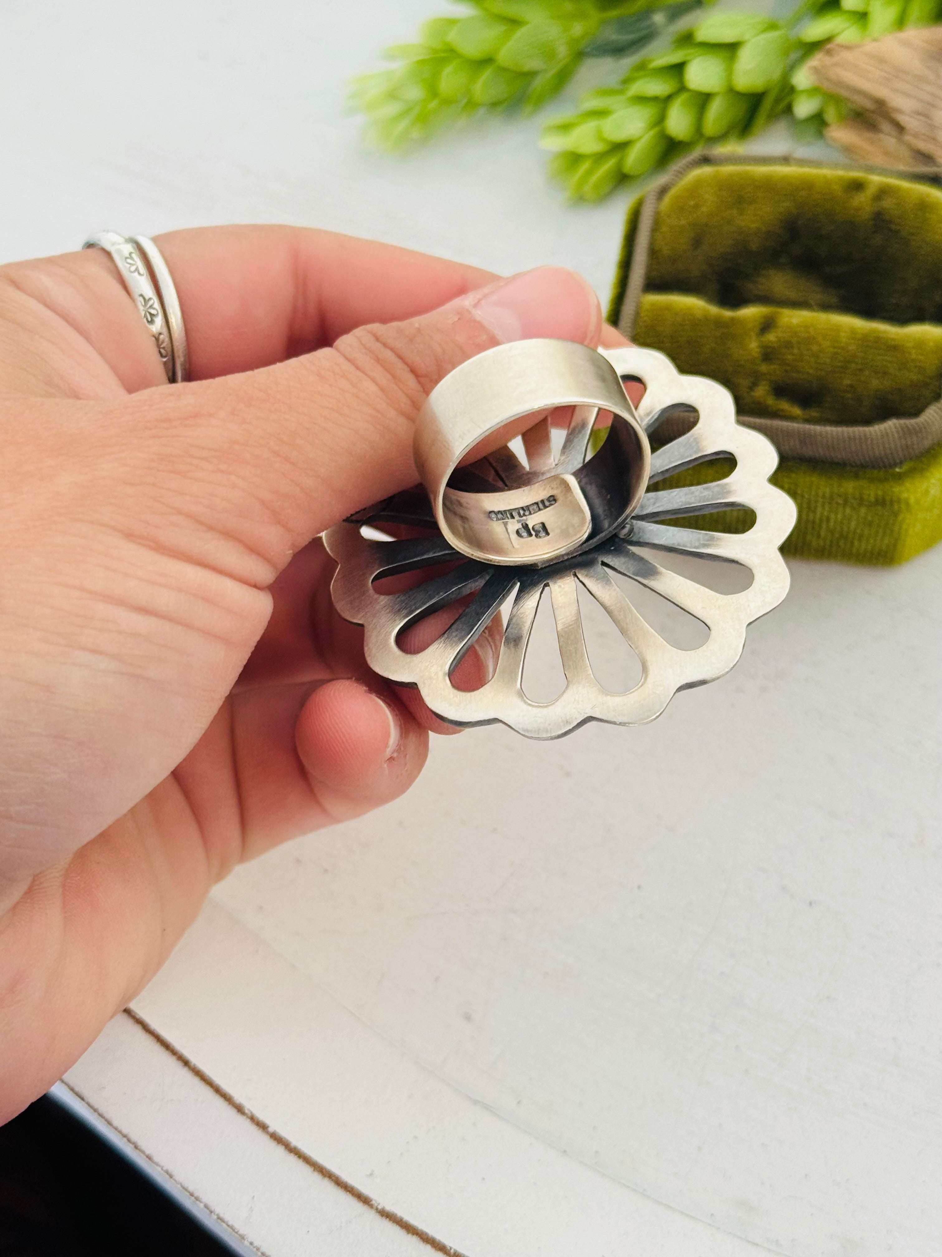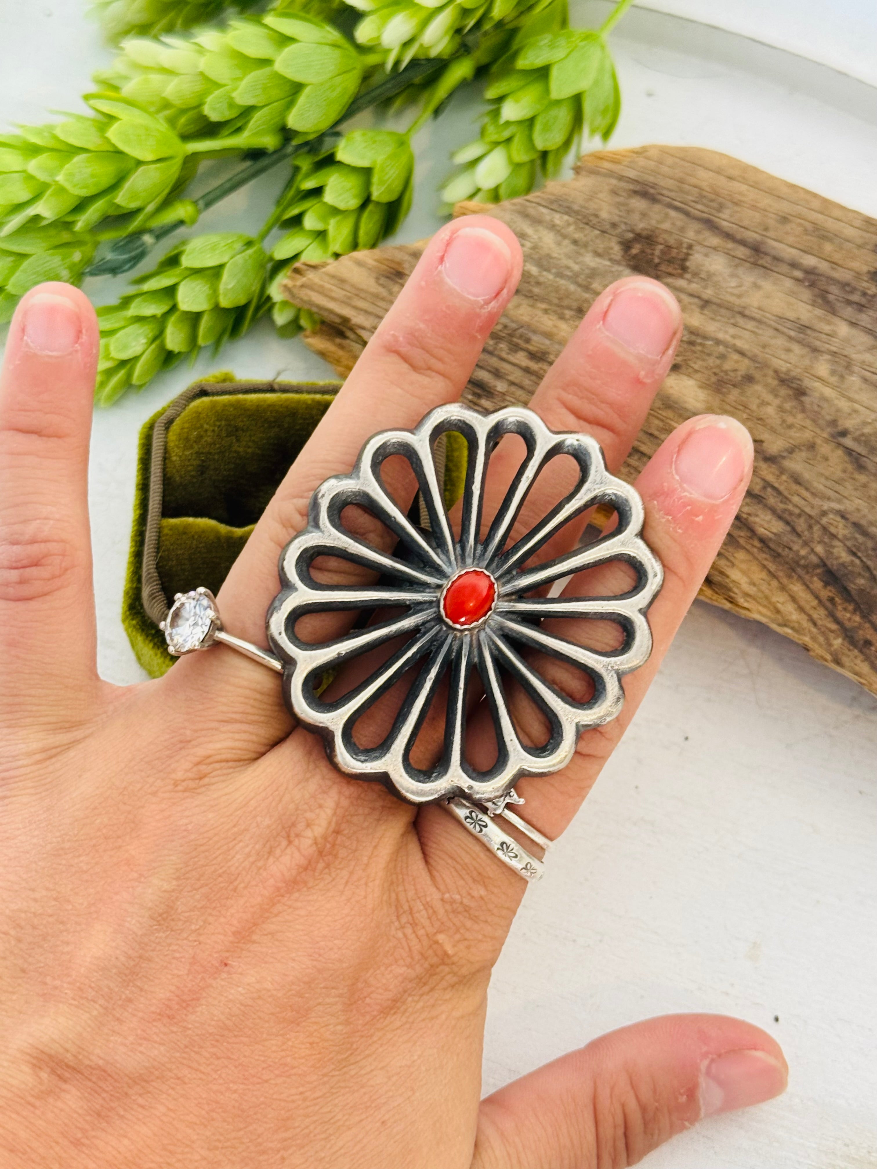 Navajo Made Mediterranean Coral & Sterling Sliver Adjustable Ring. It measures 2 1/8 inches long and 2 inches wide. Signed by the artist and stamped sterling silver.