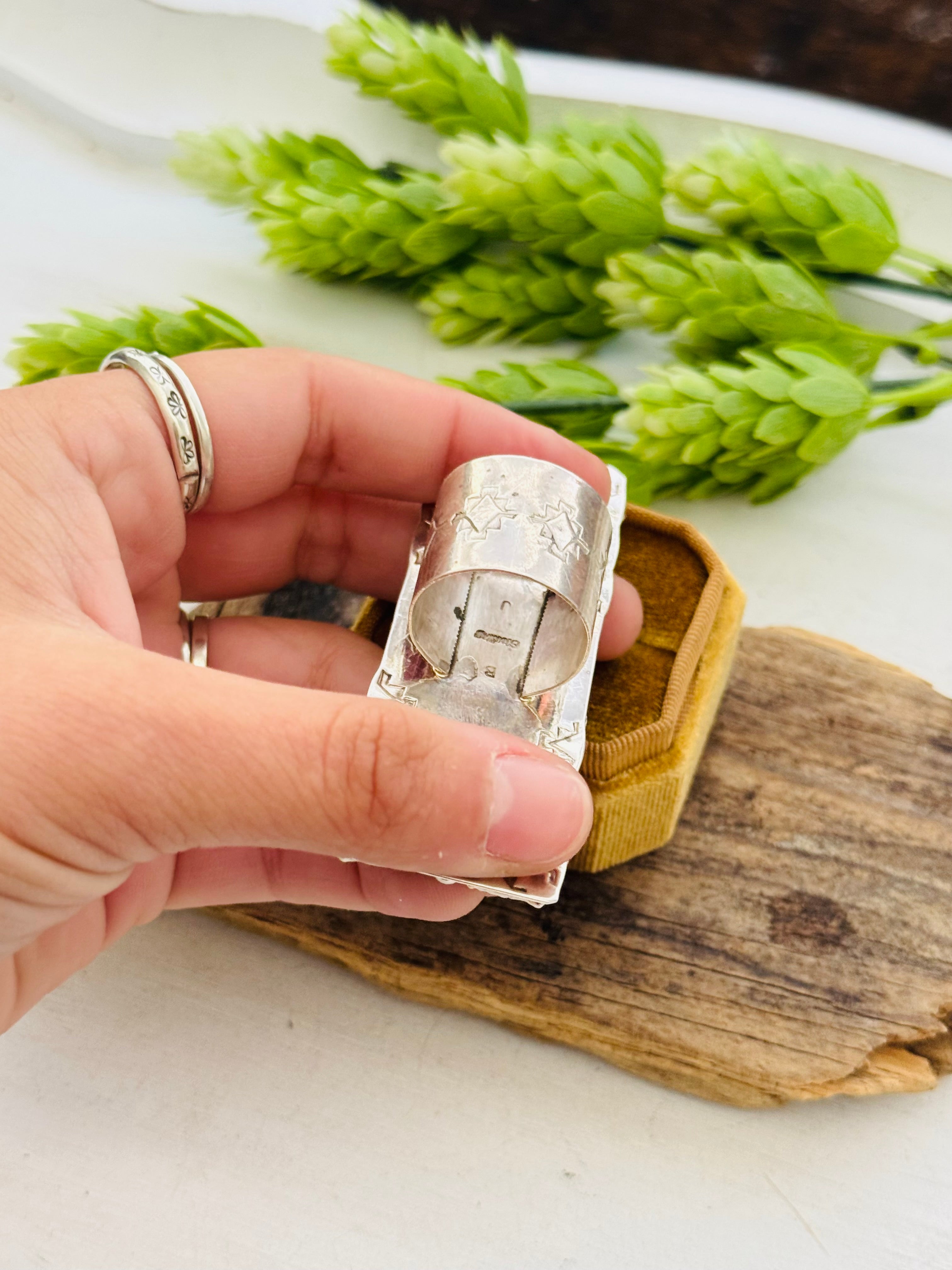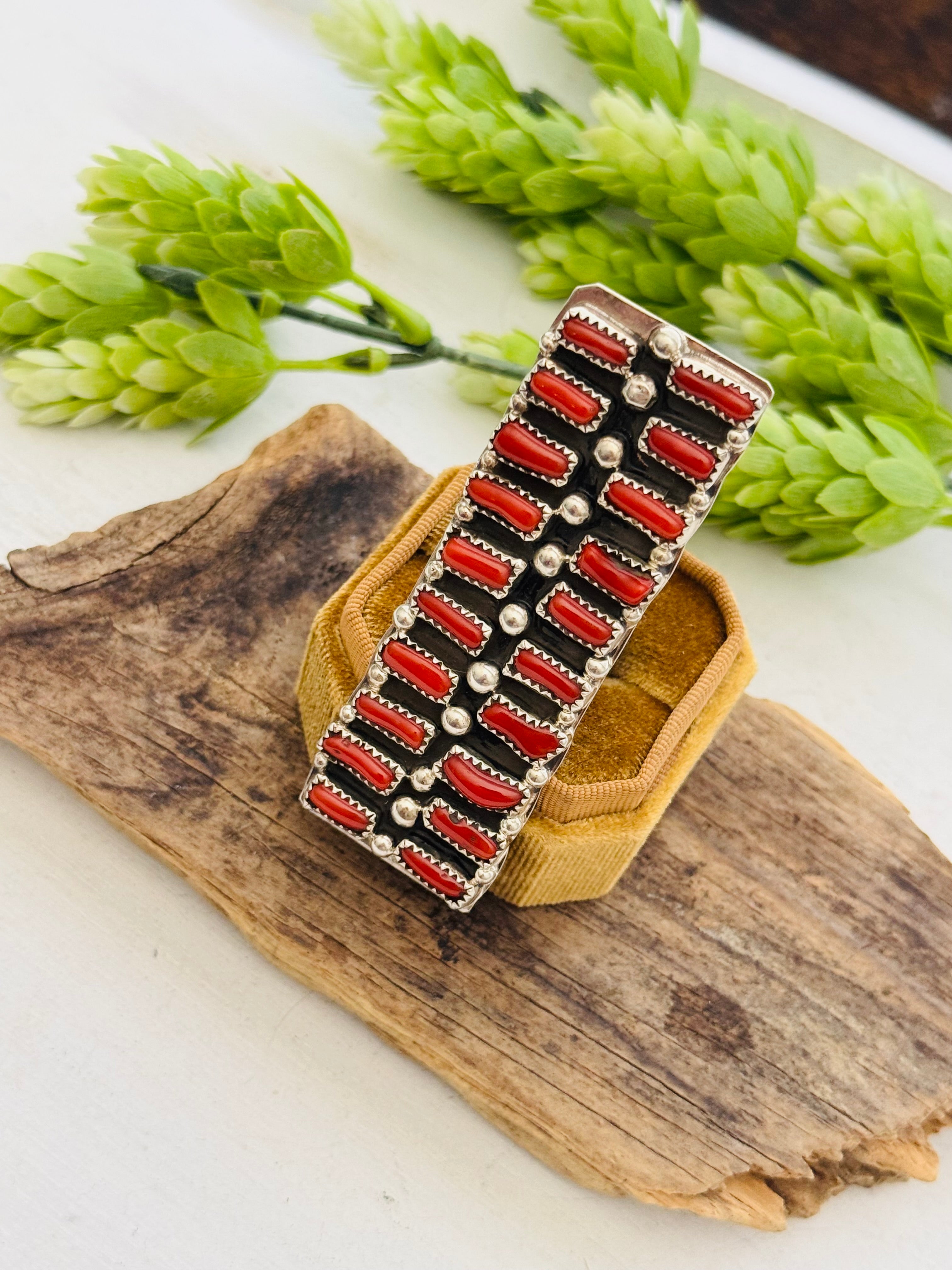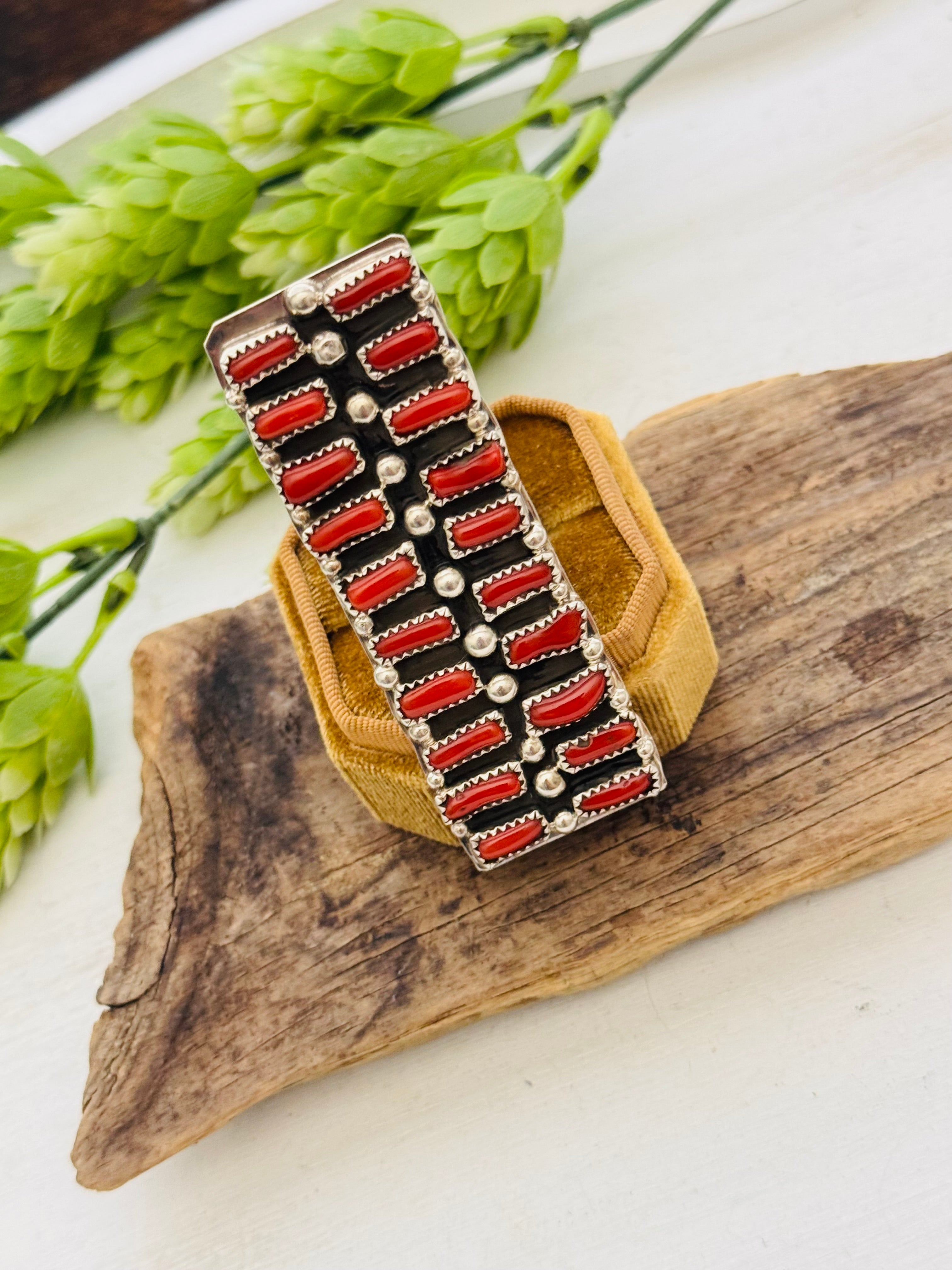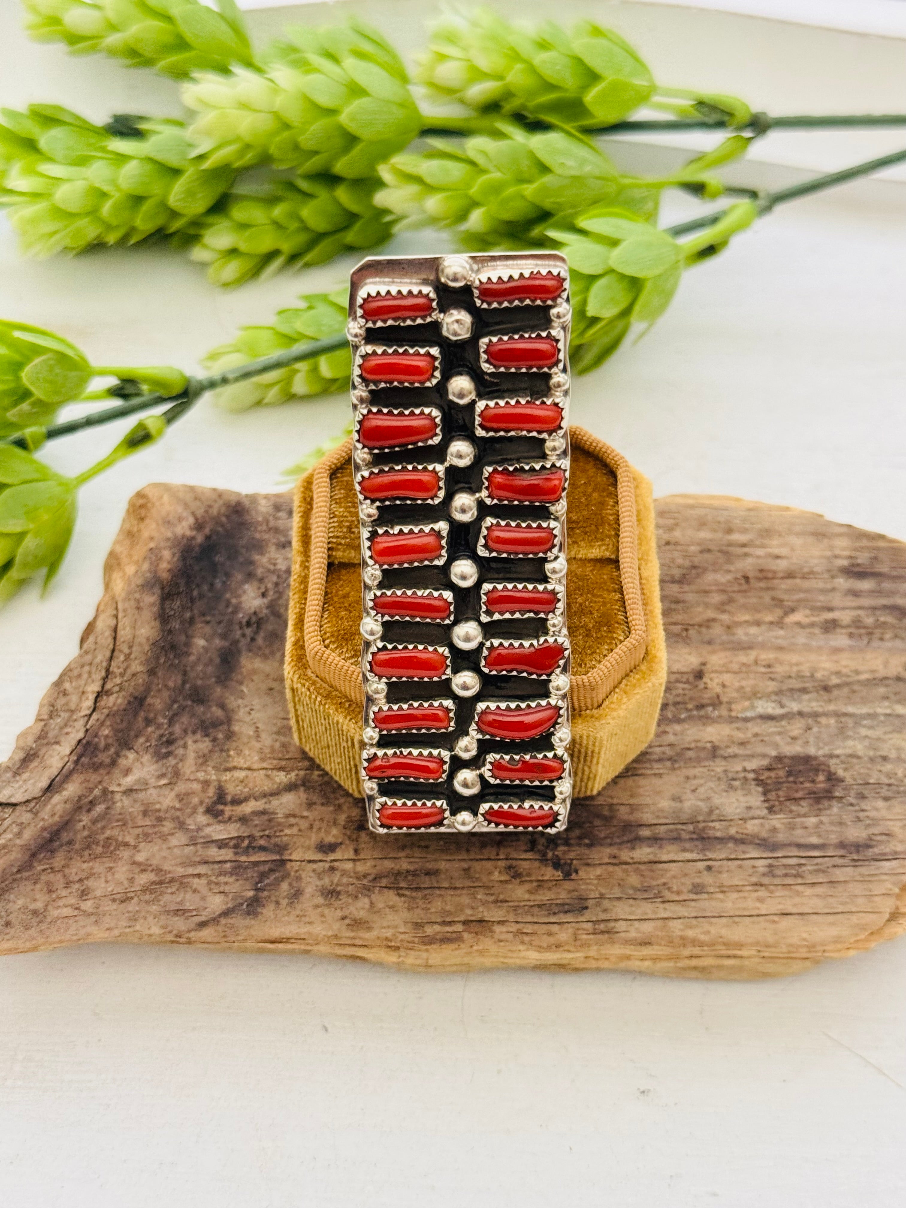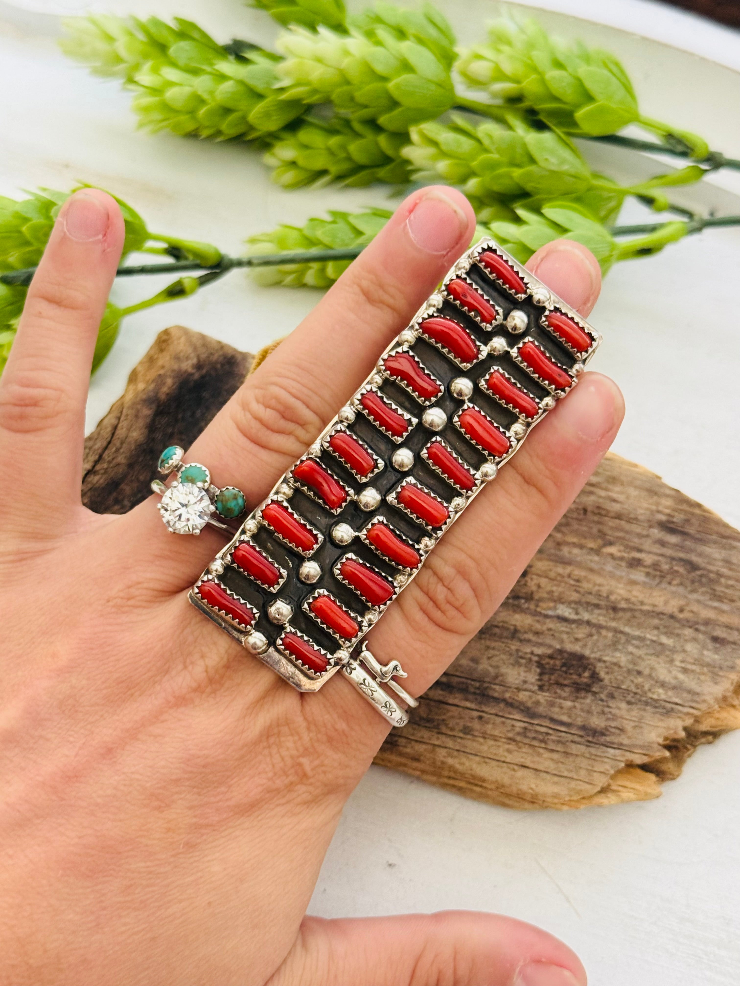 Navajo Made Mediterranean Coral & Sterling Sliver Cluster Ring Size 9.75. It measures 3 inches long and 1 inch wide. Signed by the artist and stamped sterling silver.