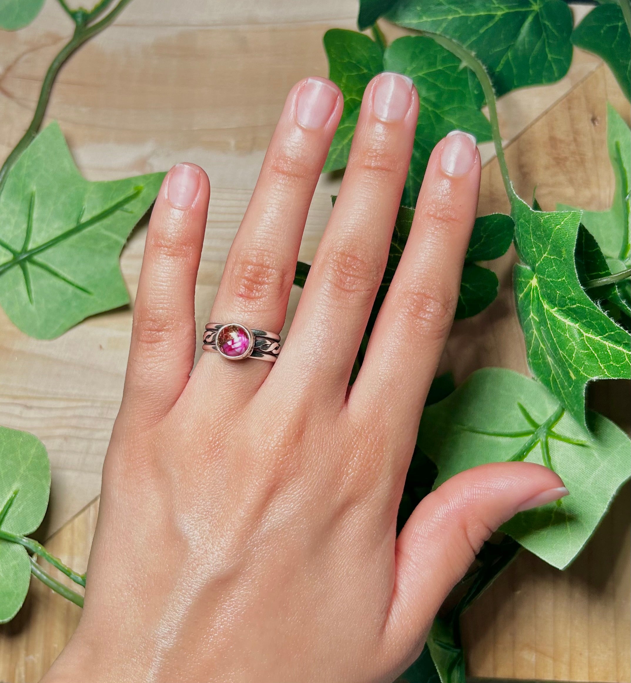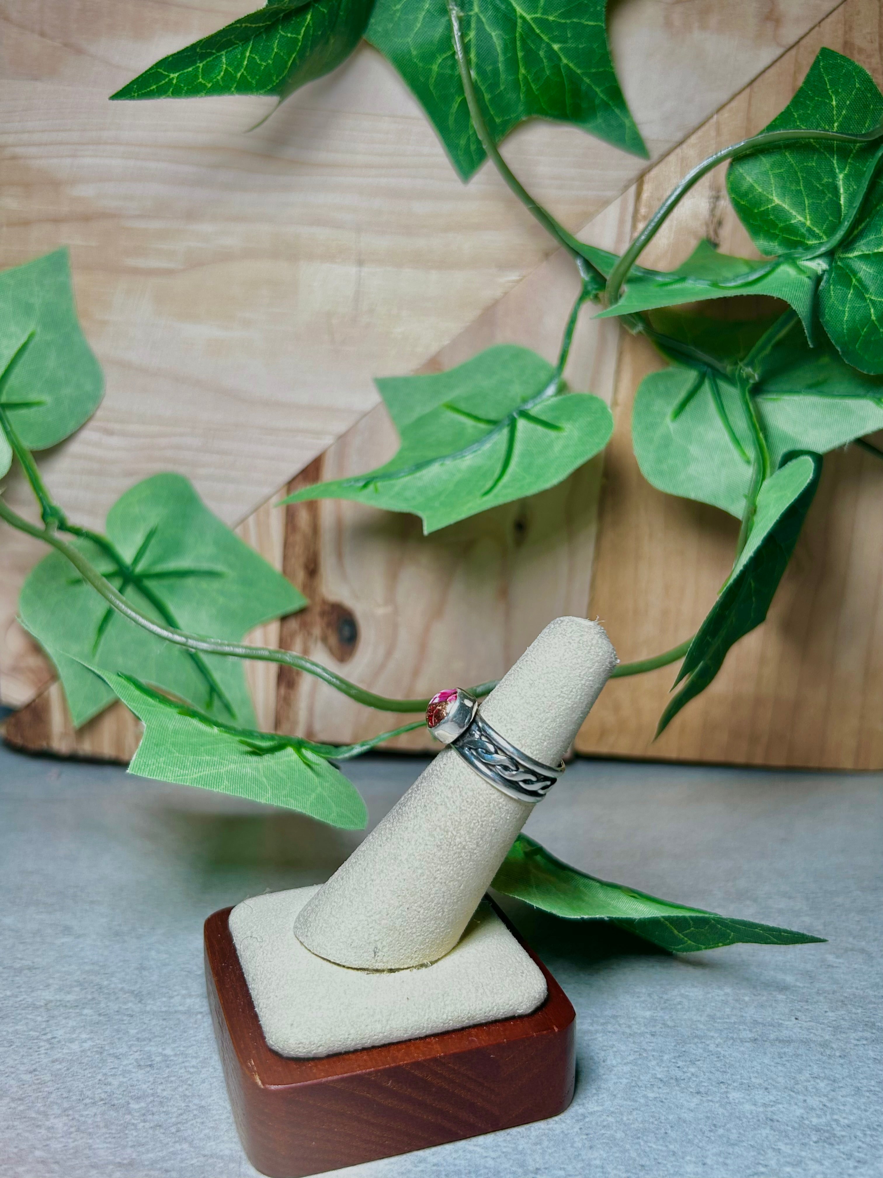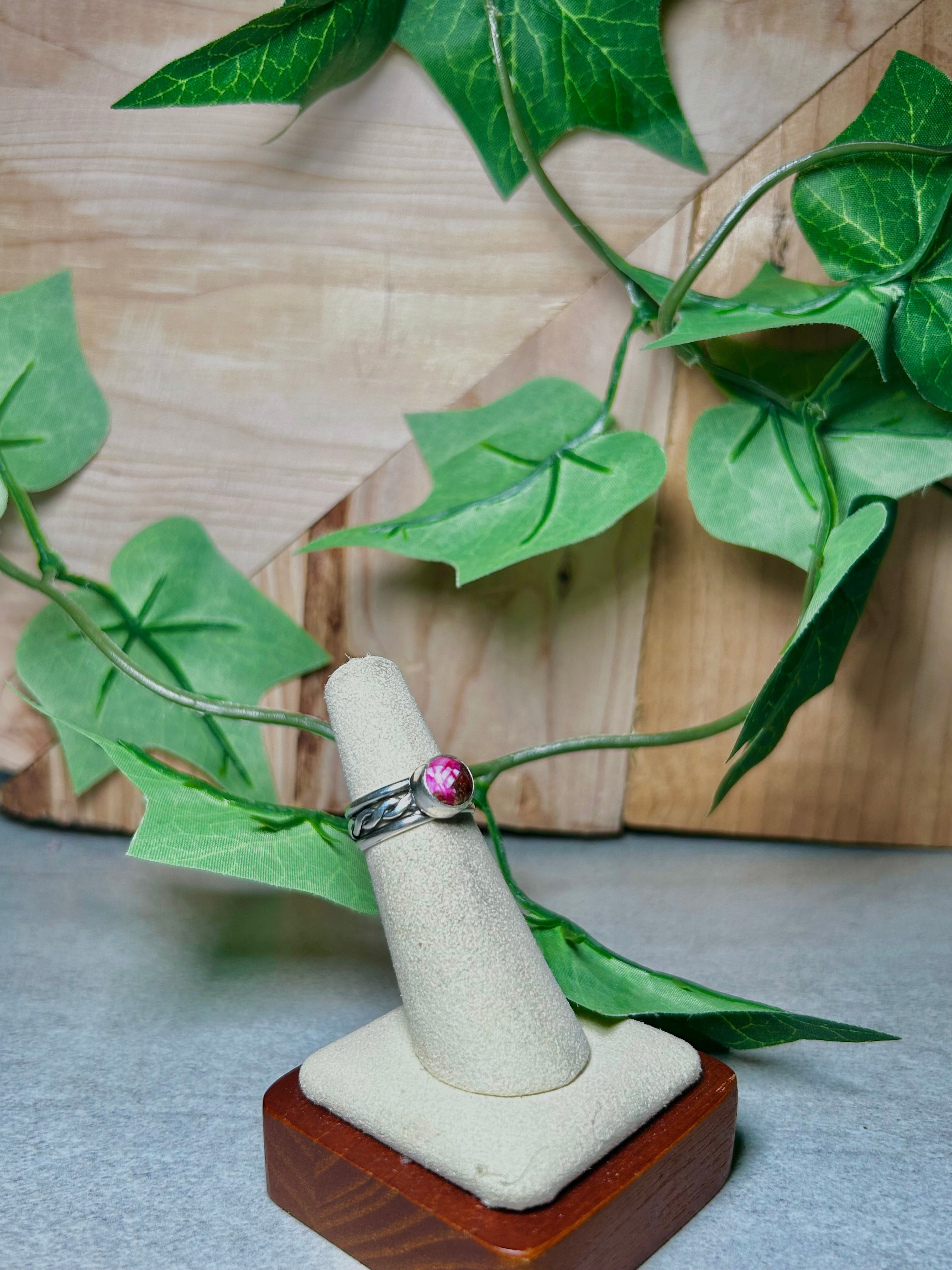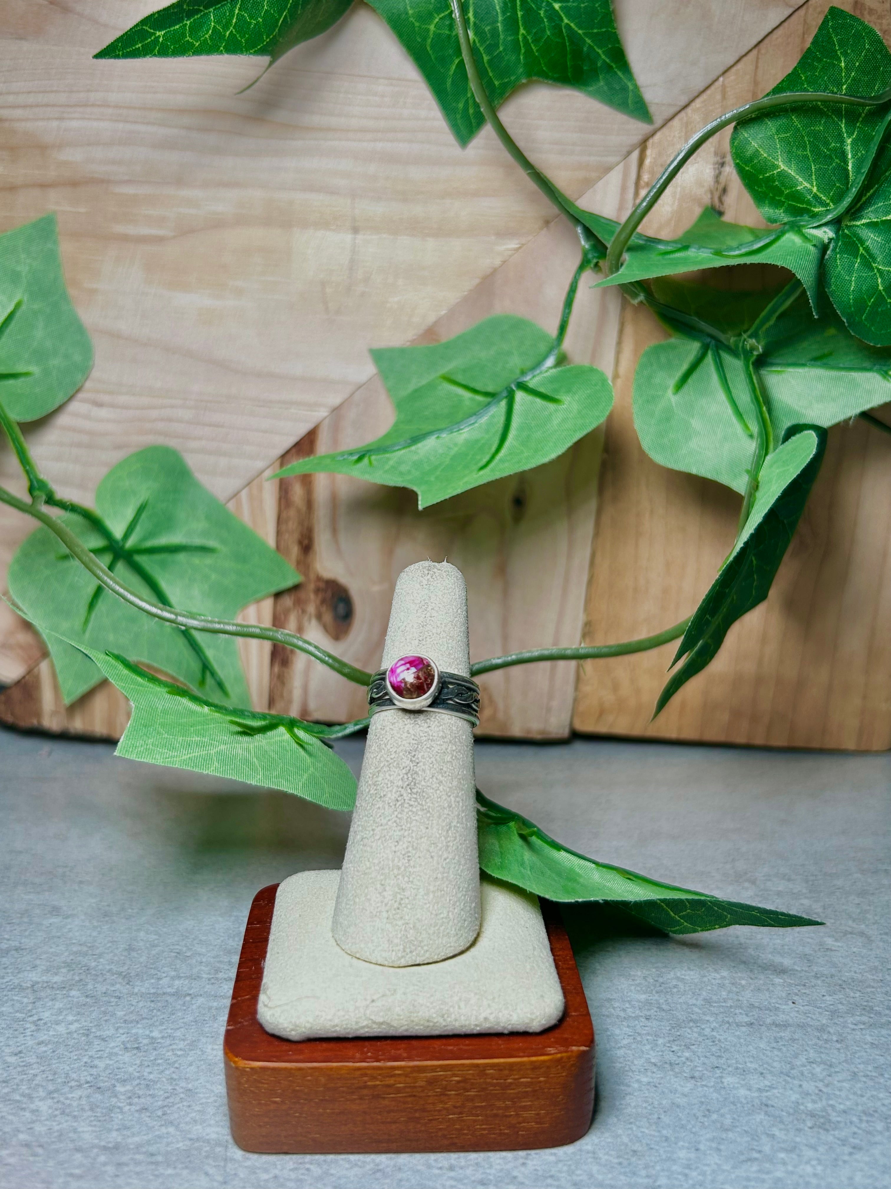 Navajo Made Mohave Turquoise and Sterling Silver Ring Size 5. It measures 3/8 of an inch long and 3/8 of an inch wide. Signed by the artist and stamped sterling silver.