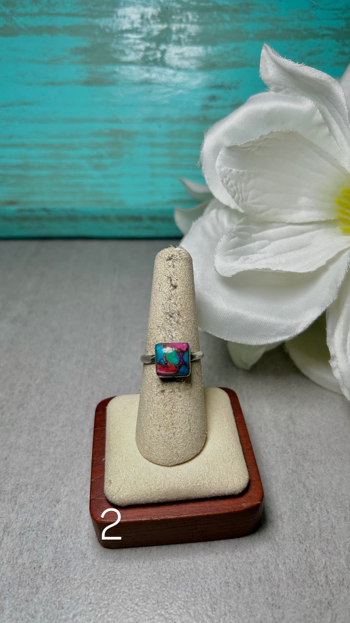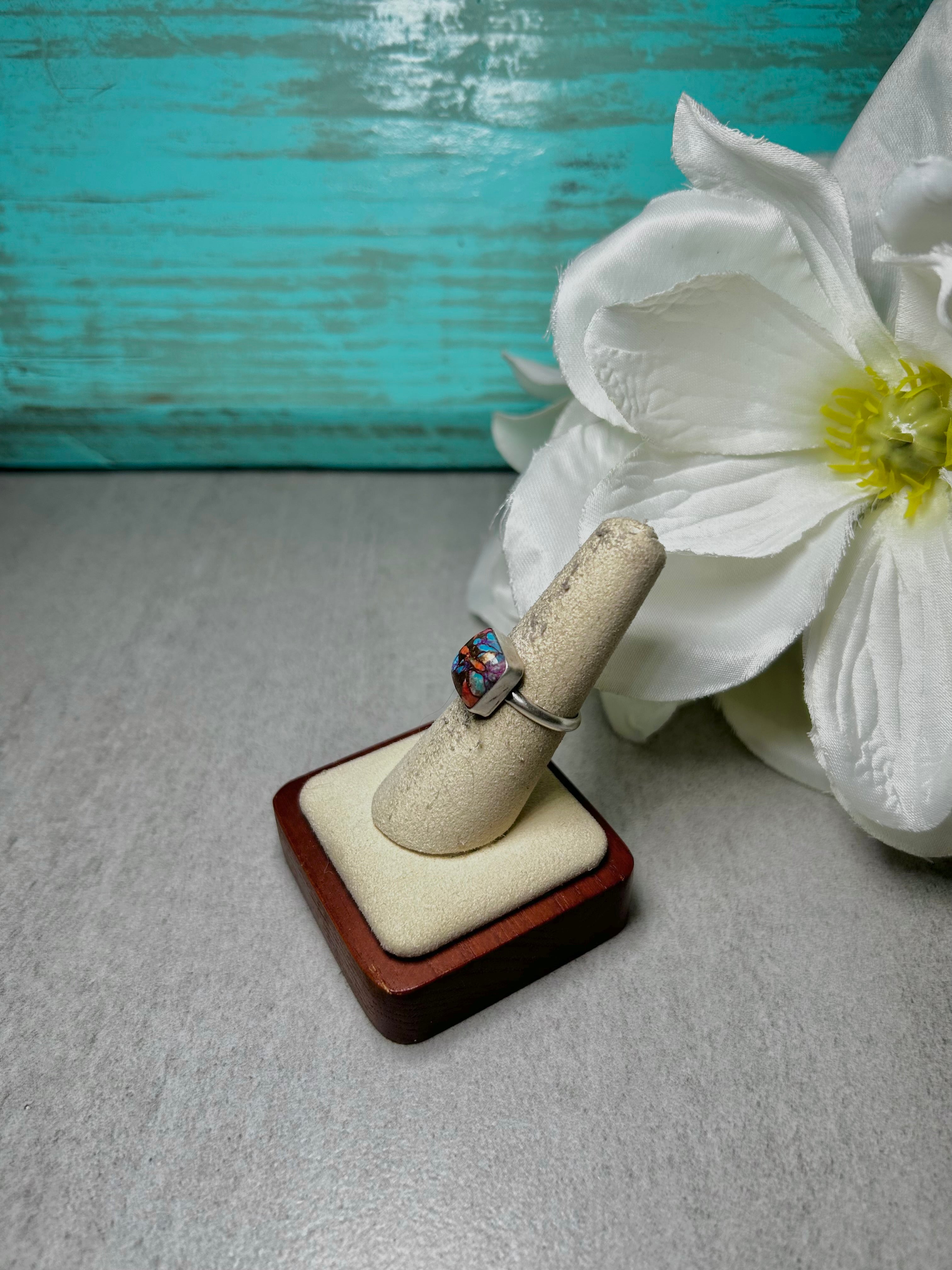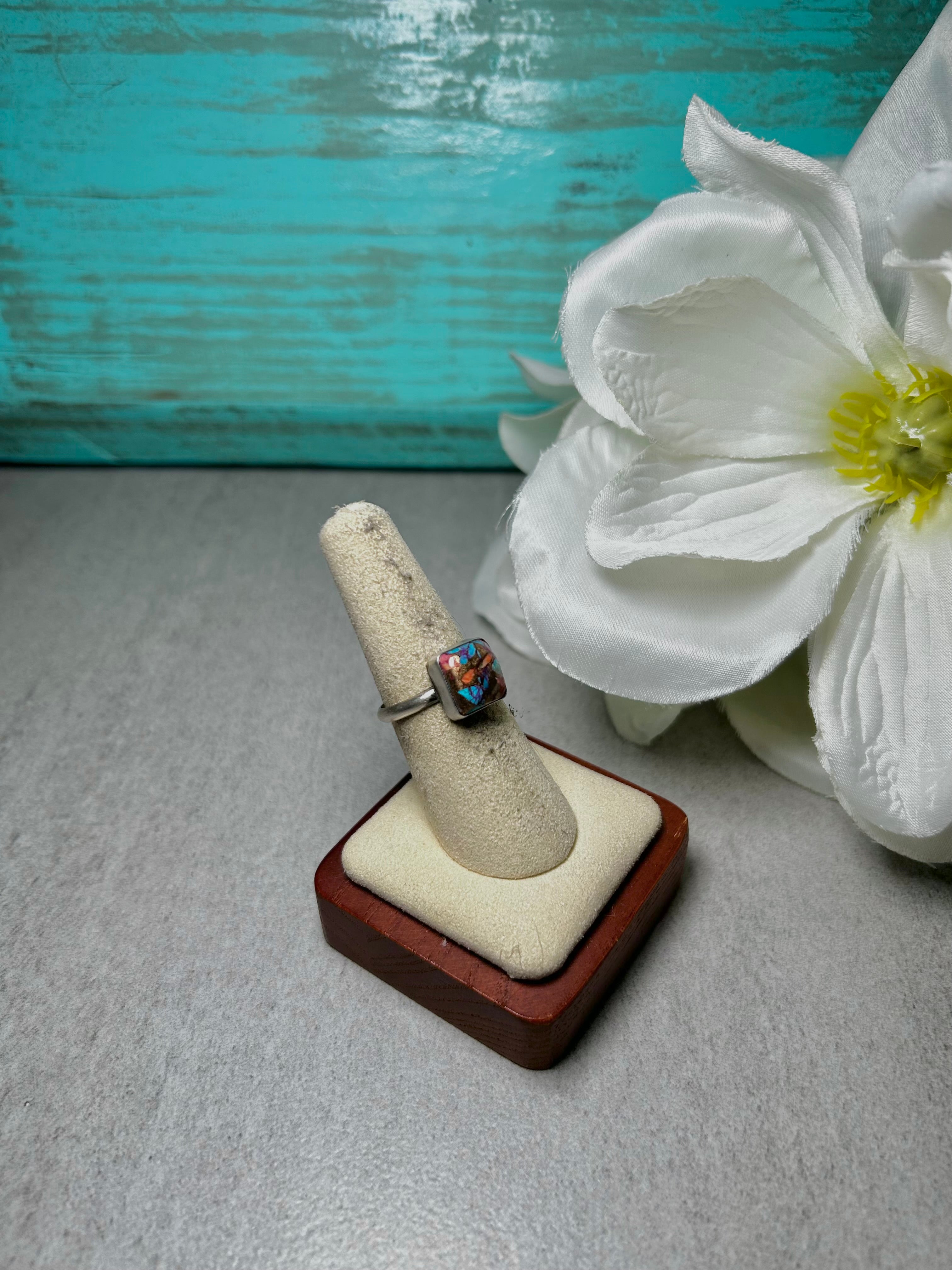 Navajo Made Mohave Turquoise & Sterling Silver Ring Size. It measures 3/8 of an inch long and 3/8 of an inch wide. Signed by the artist and stamped sterling silver.
