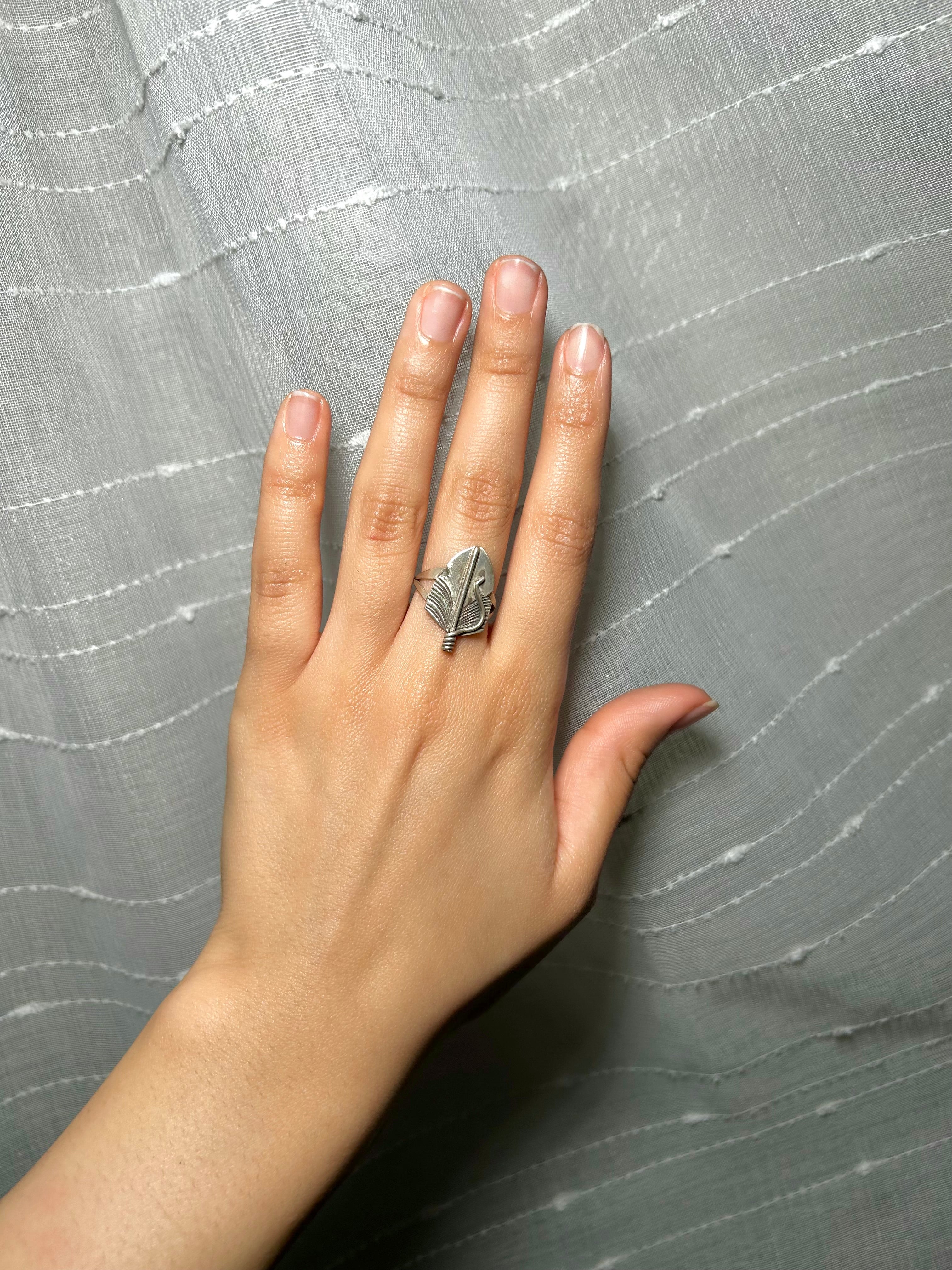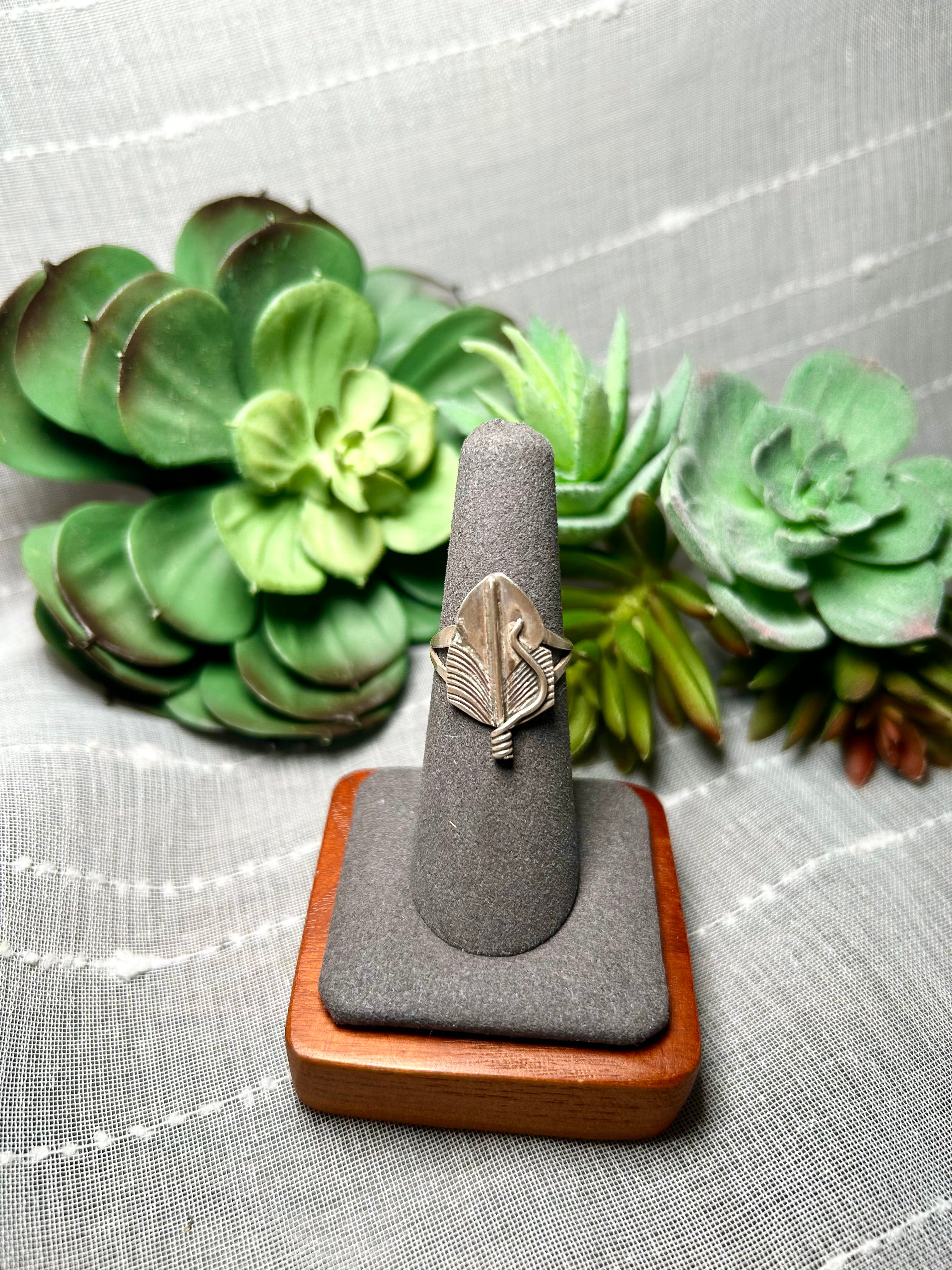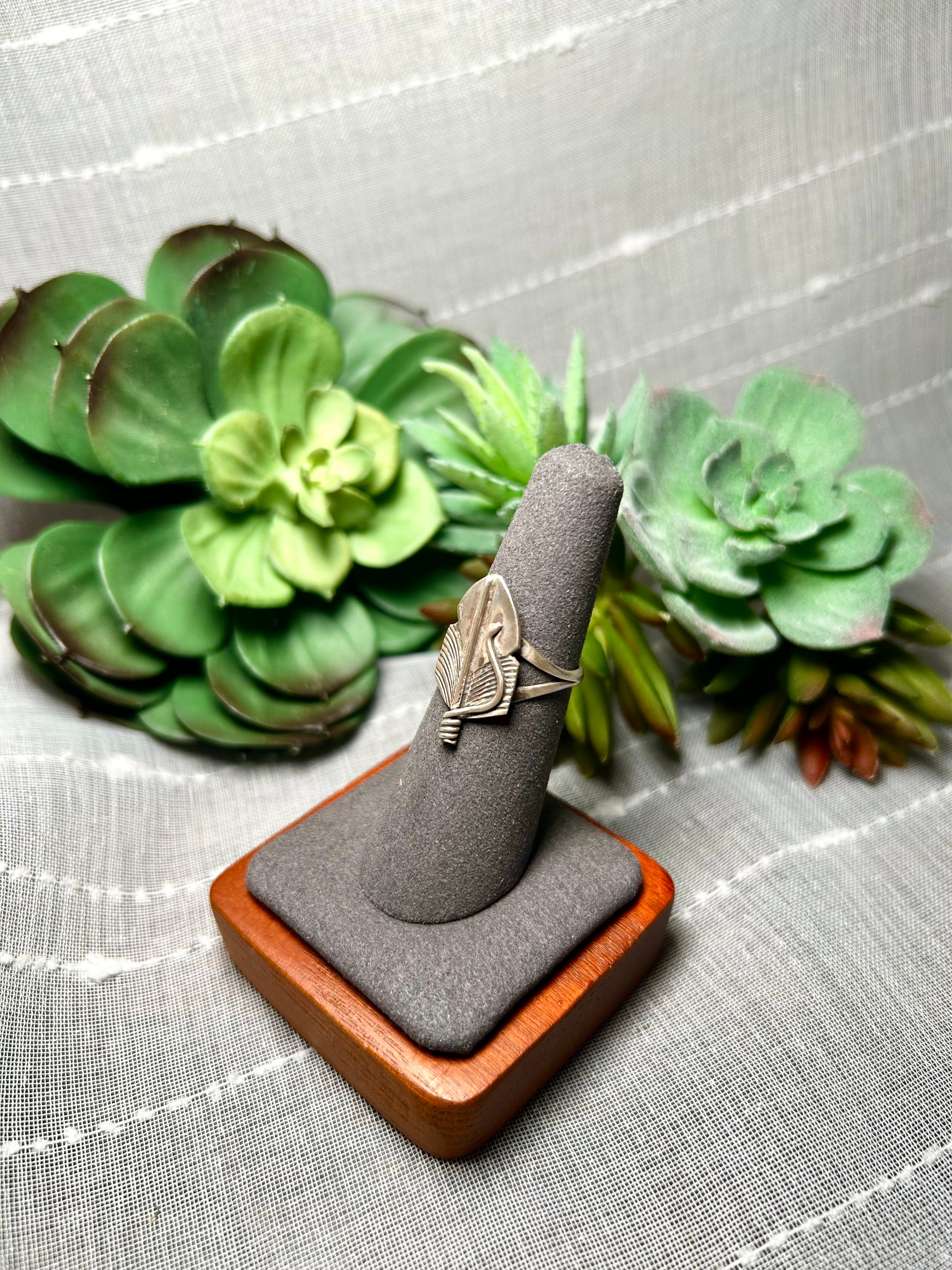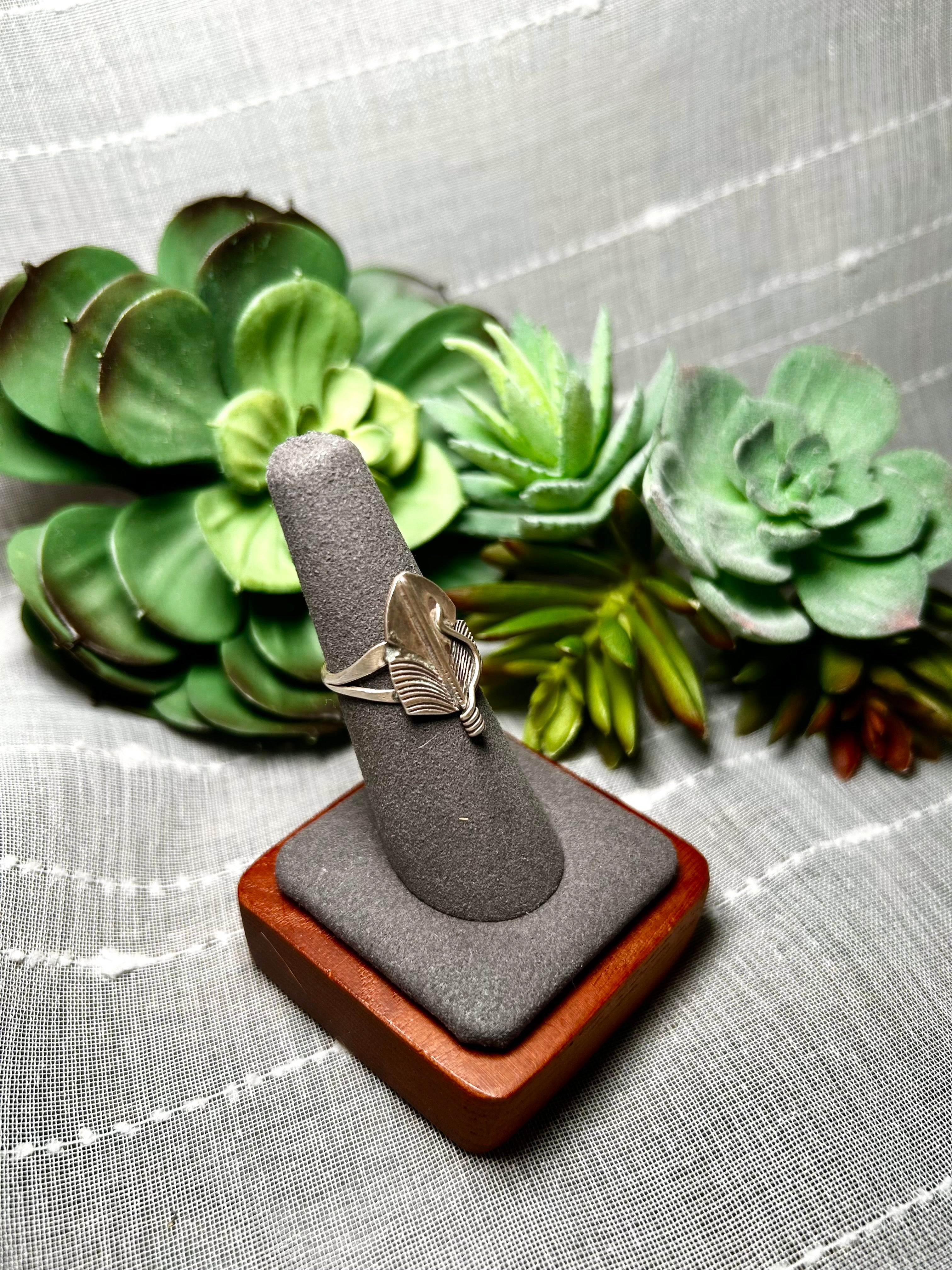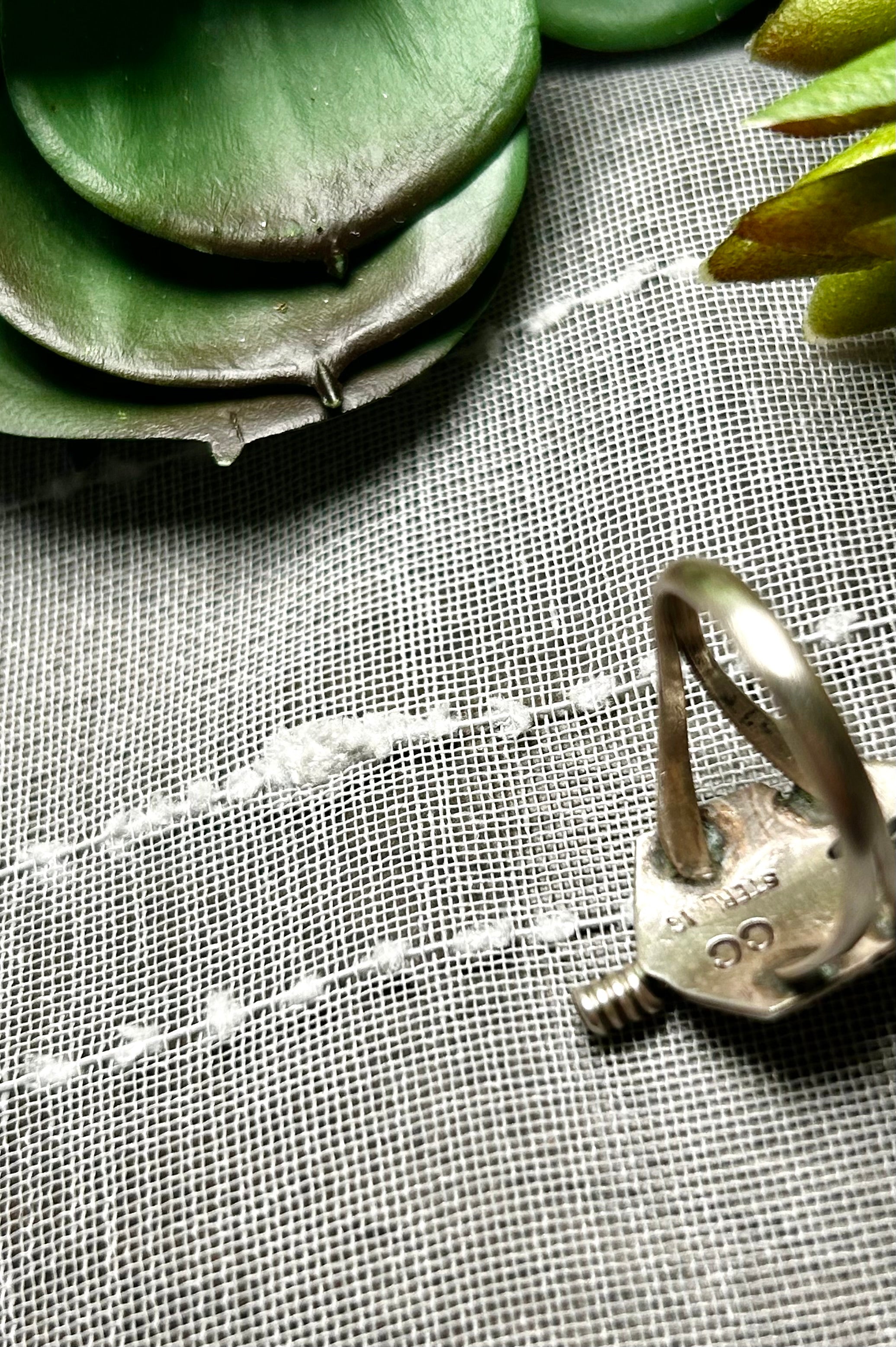Navajo Made Sterling Silver Ring Size. It measures 7/8 of an inch long and 1/2 of an inch wide. Signed by the artist and stamped sterling silver.