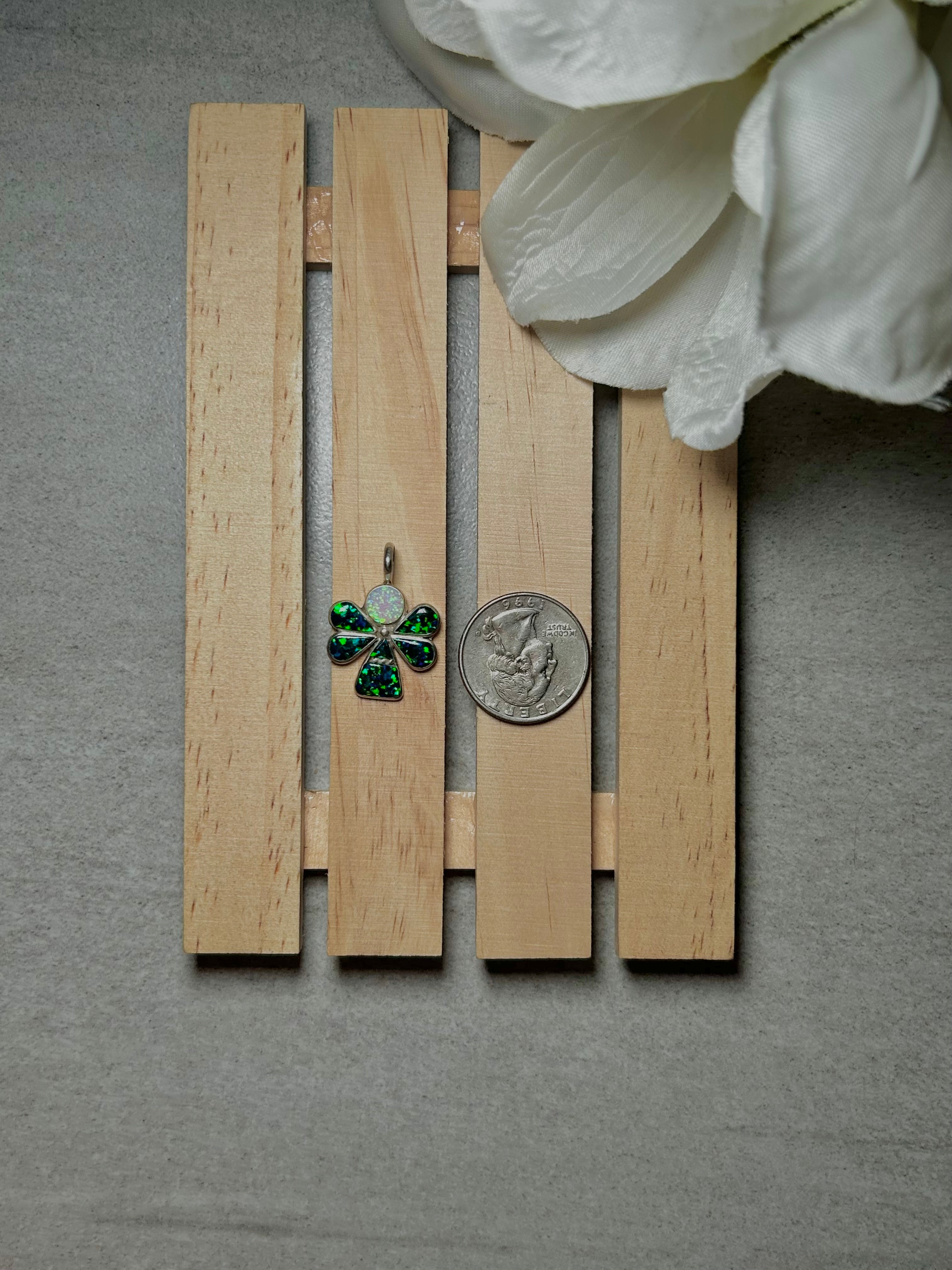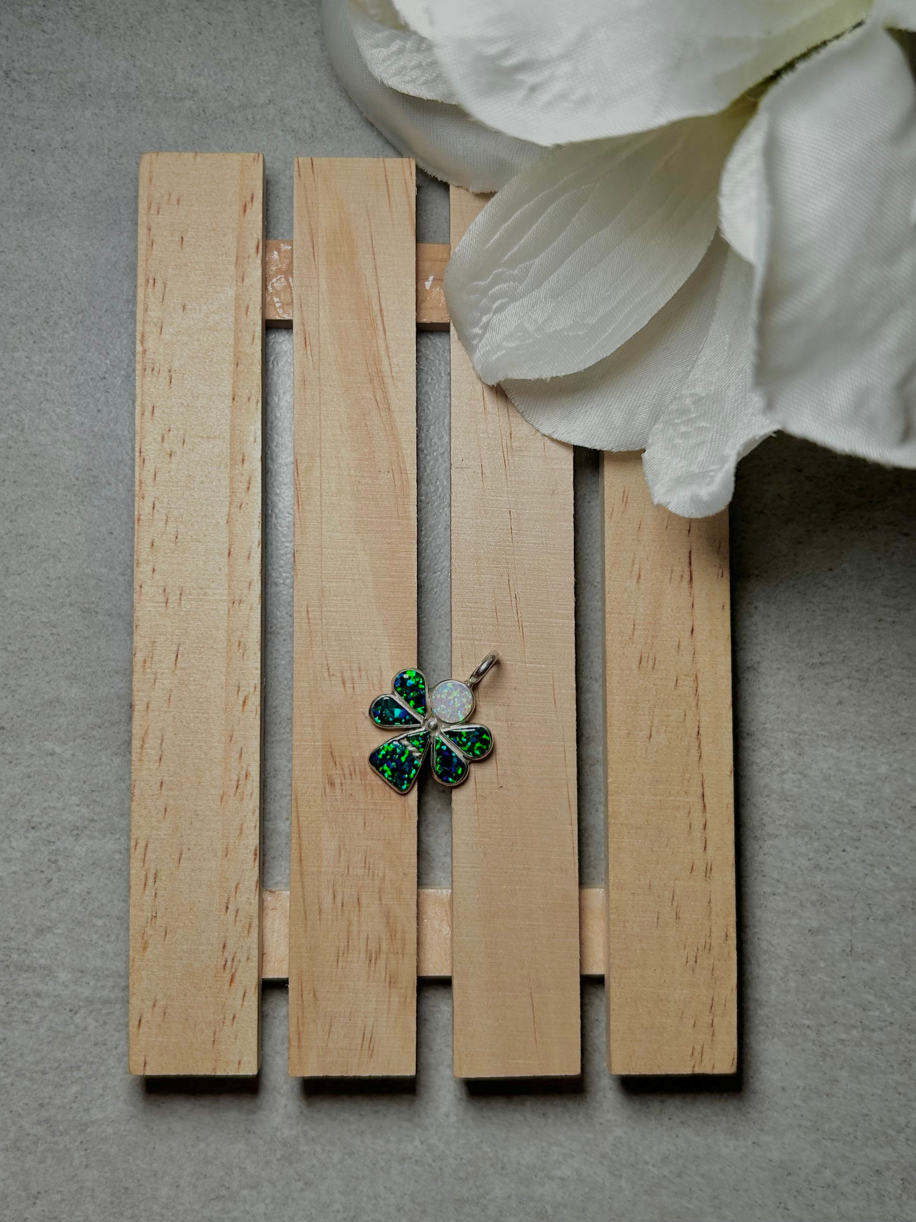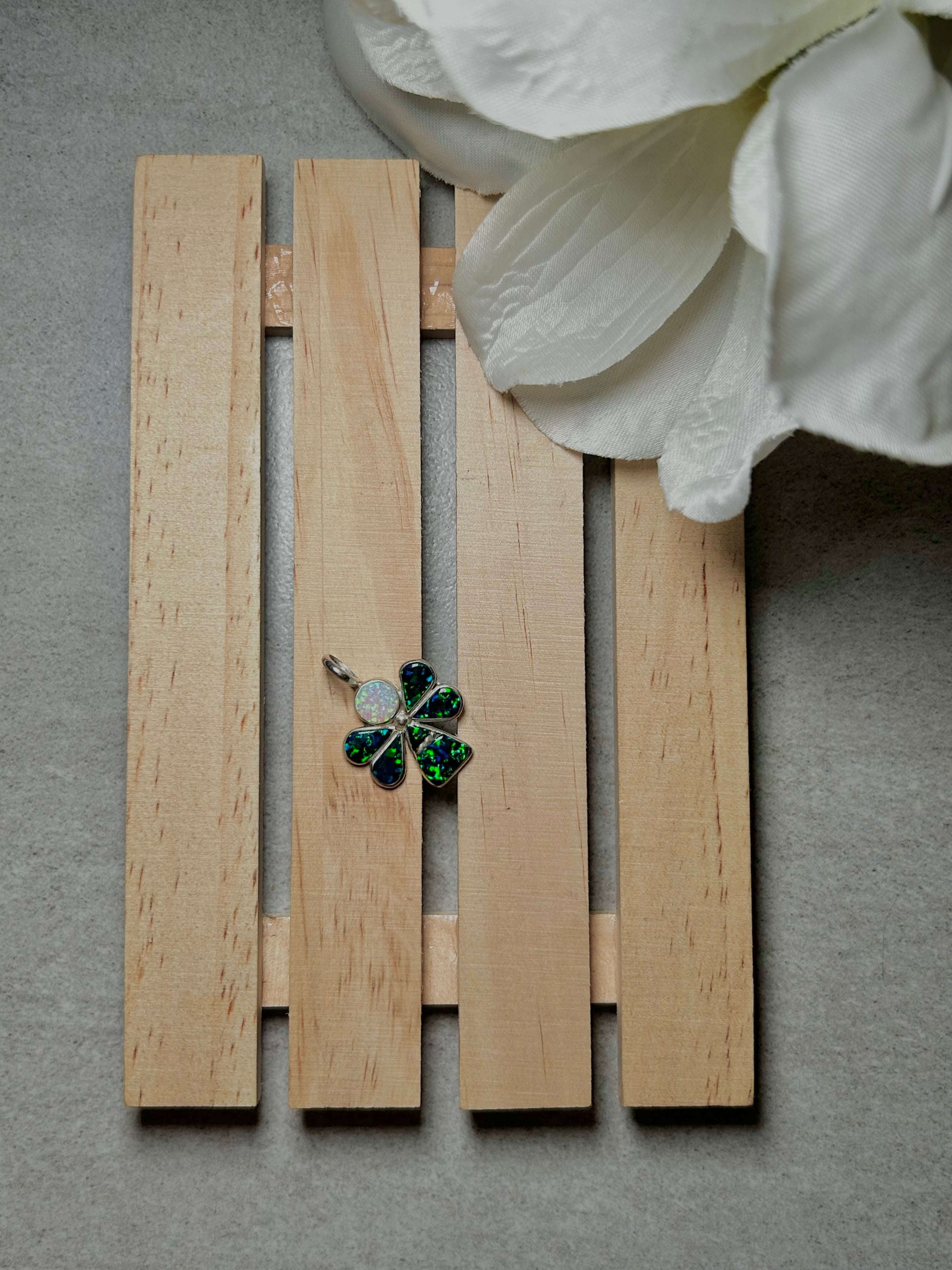 Zuni Multi Opal & Sterling Silver Pendant. It measures 1 1/8 inches long and 3/4 of an inch wide. Pendant Only. Signed by the artist and stamped sterling silver.