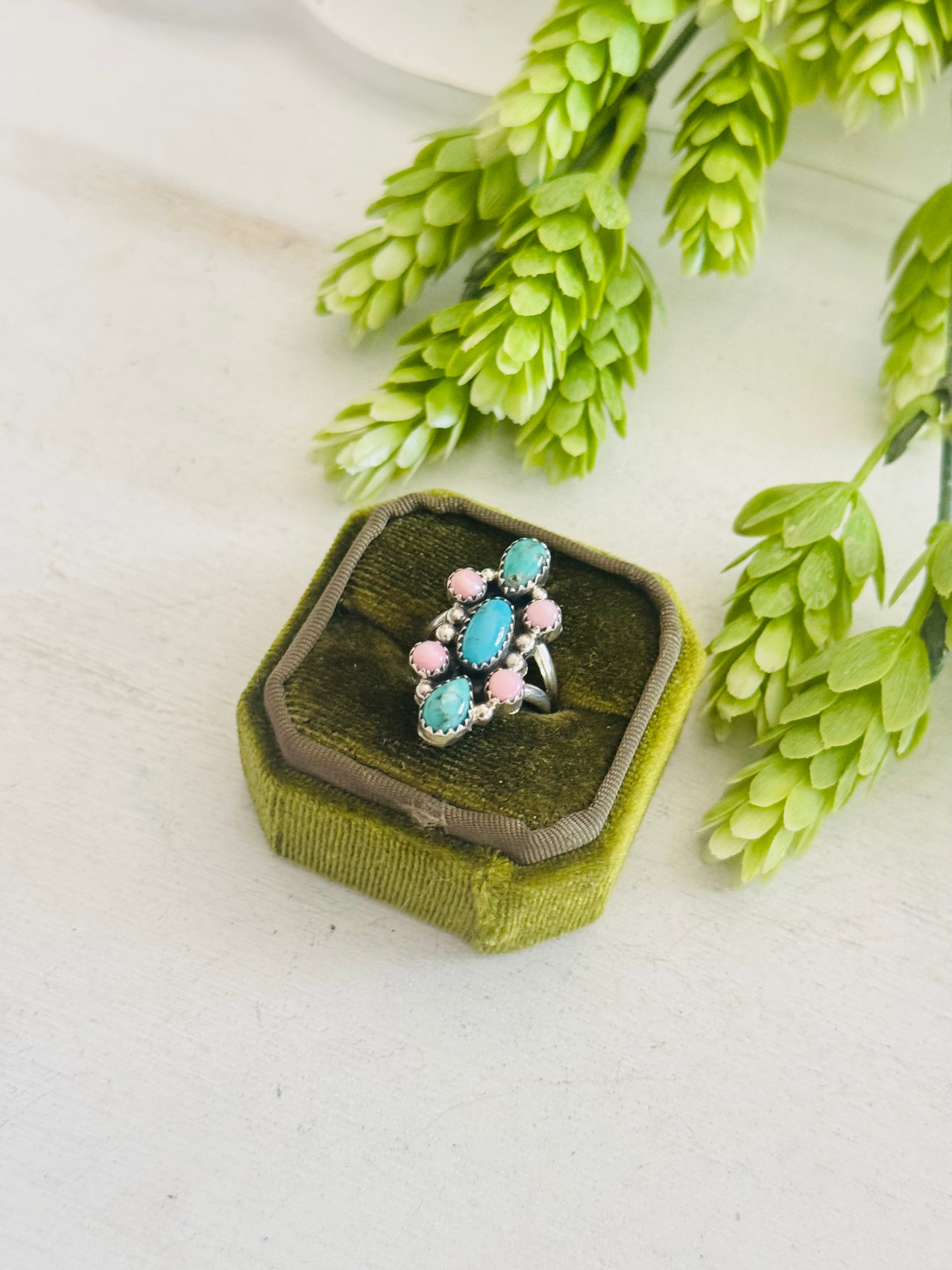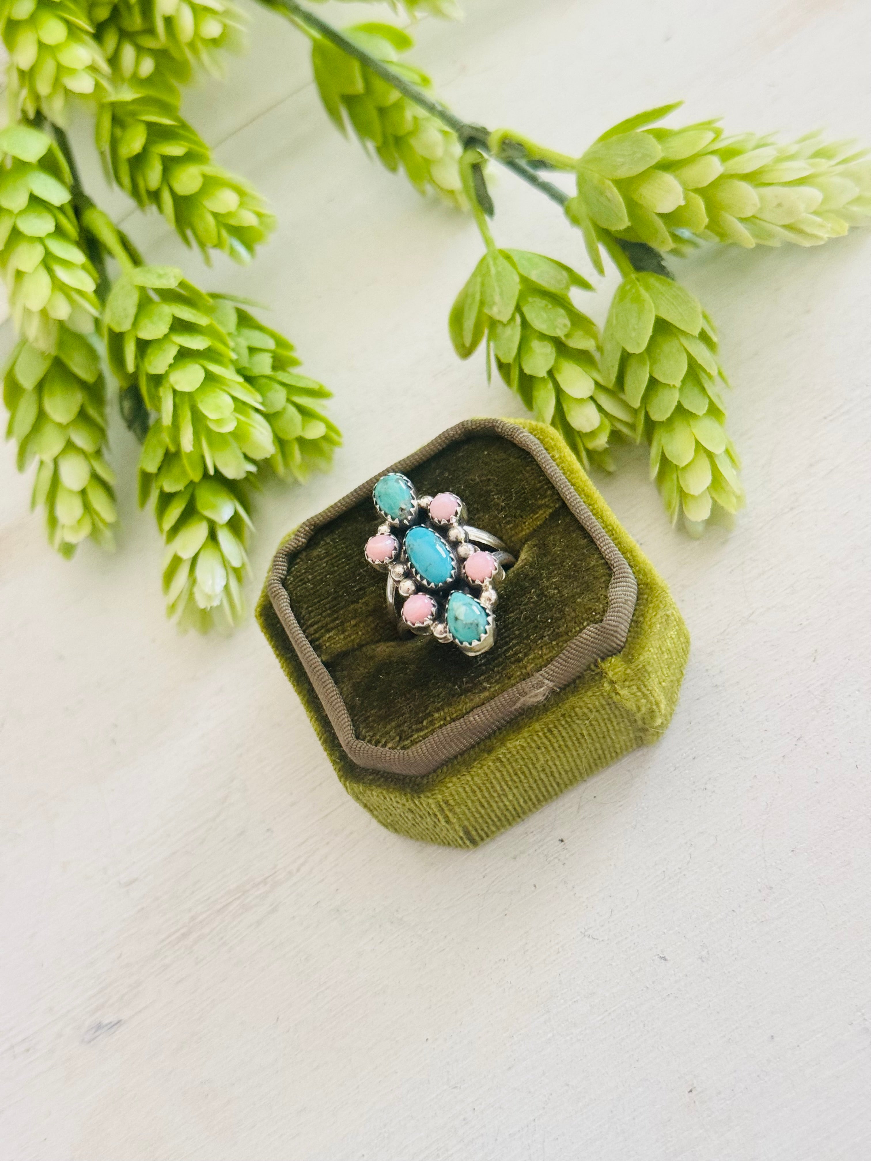 Navajo Made Multi Stone & Sterling Silver Cluster Ring. It measures 1 1/8 inches long and 5/8 of an inch wide. Signed by the artist and stamped sterling silver. Sinned will differ due to natural stones.