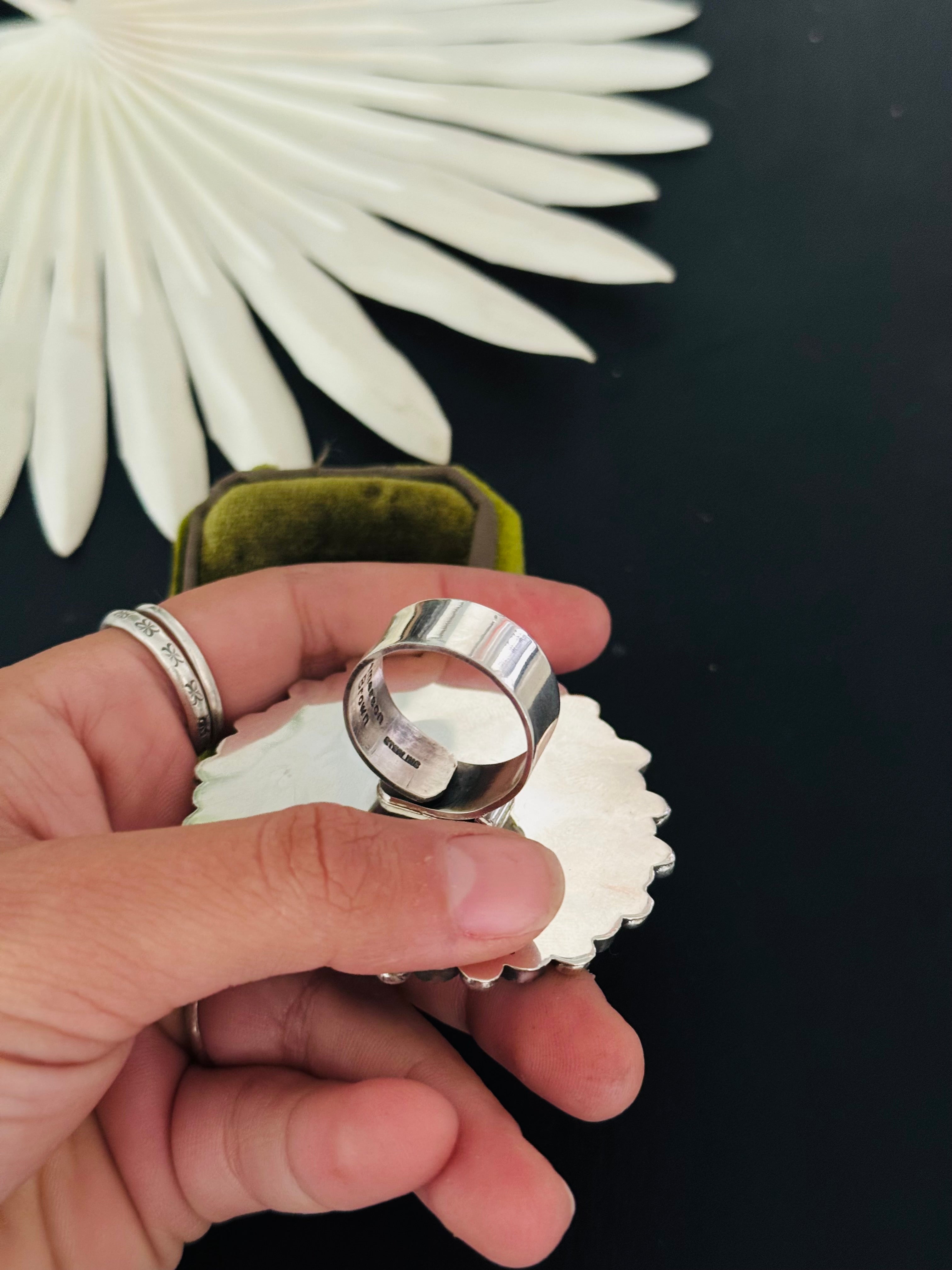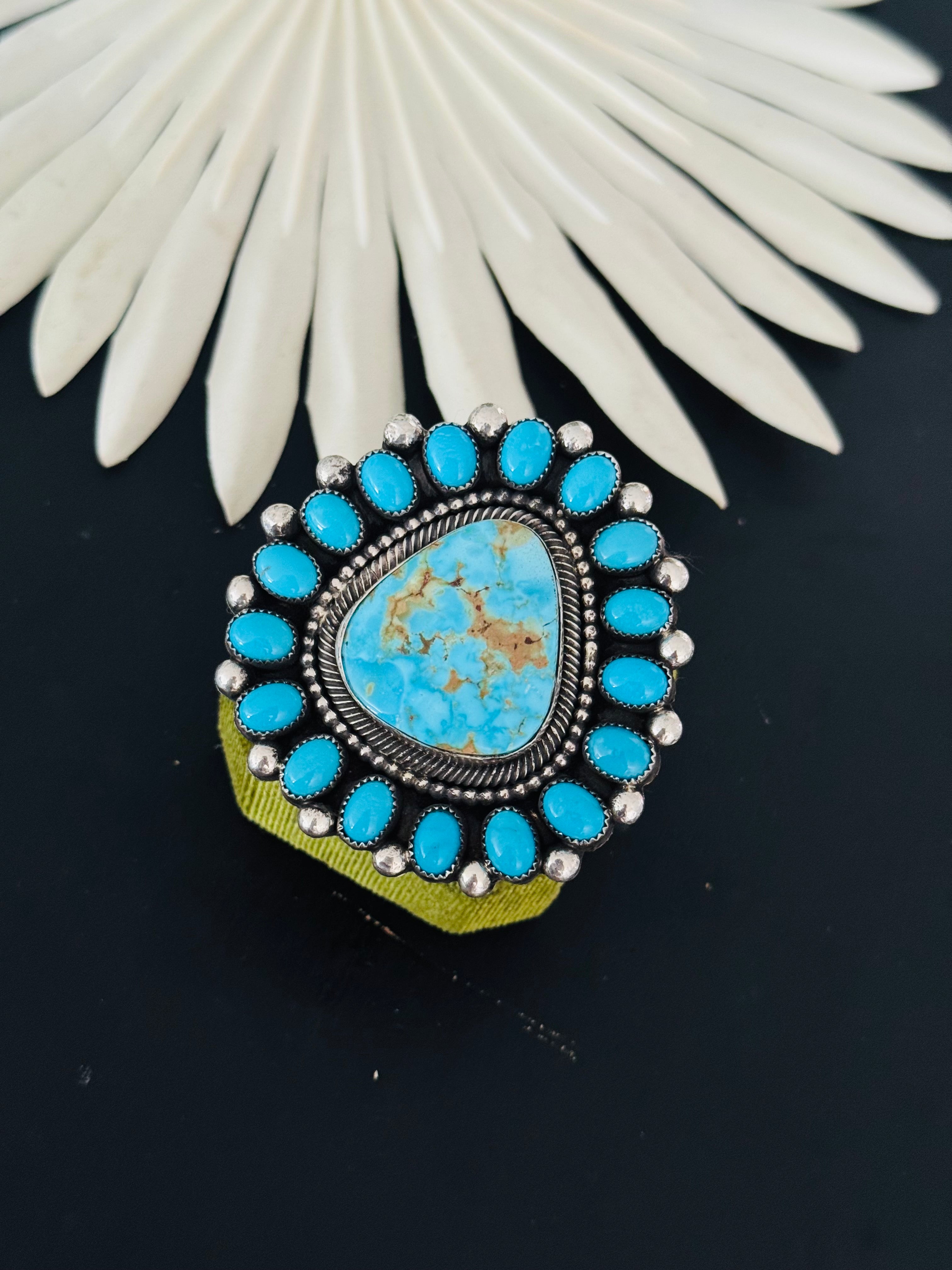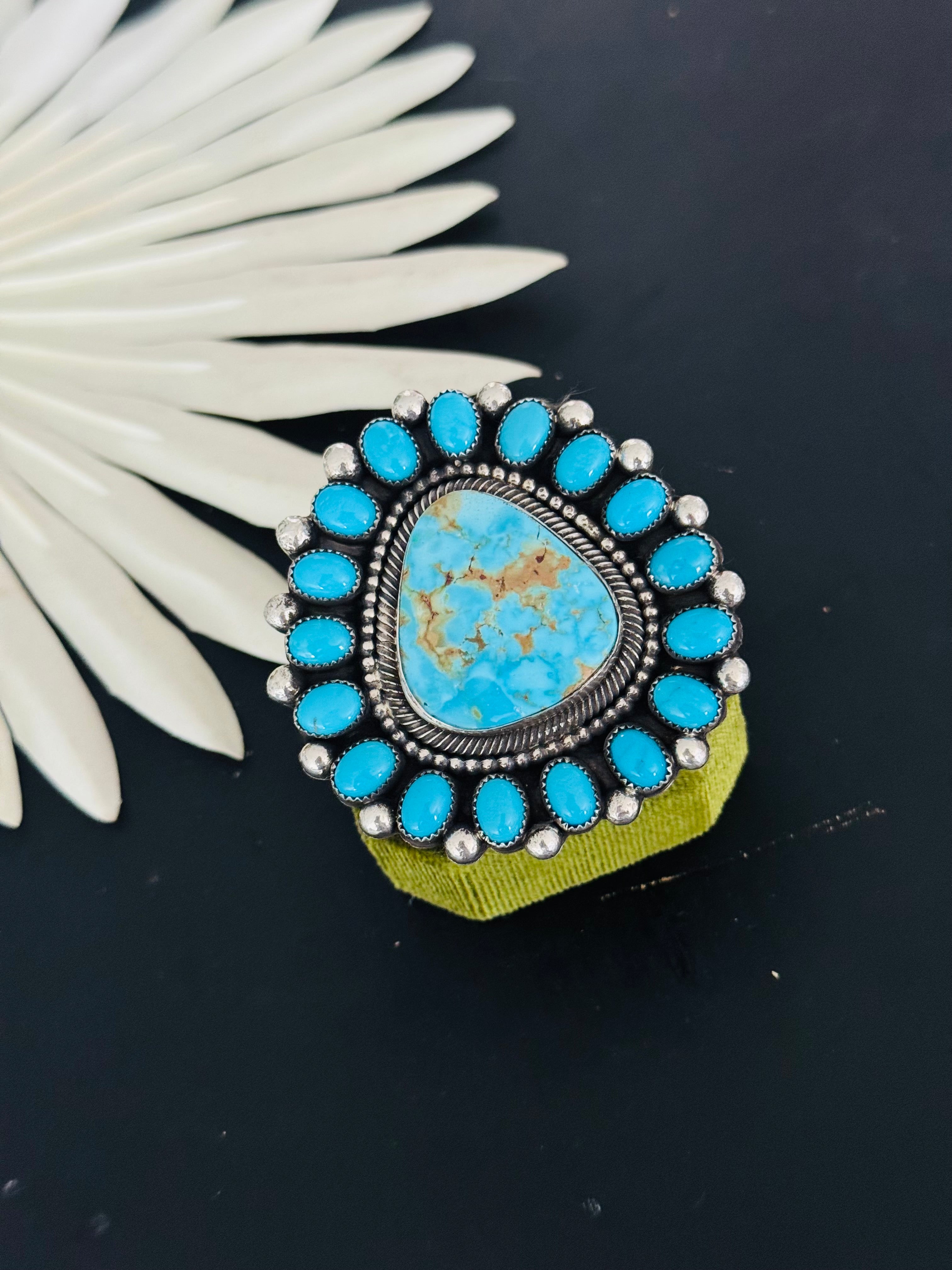 Hemerson Brown Birds Eye Kingman Turquoise & Sterling Silver Adjustable Cluster Ring. It measures 2 3/8 inches long and 2 1/4 inches wide. Signed by the artist and stamped sterling silver.