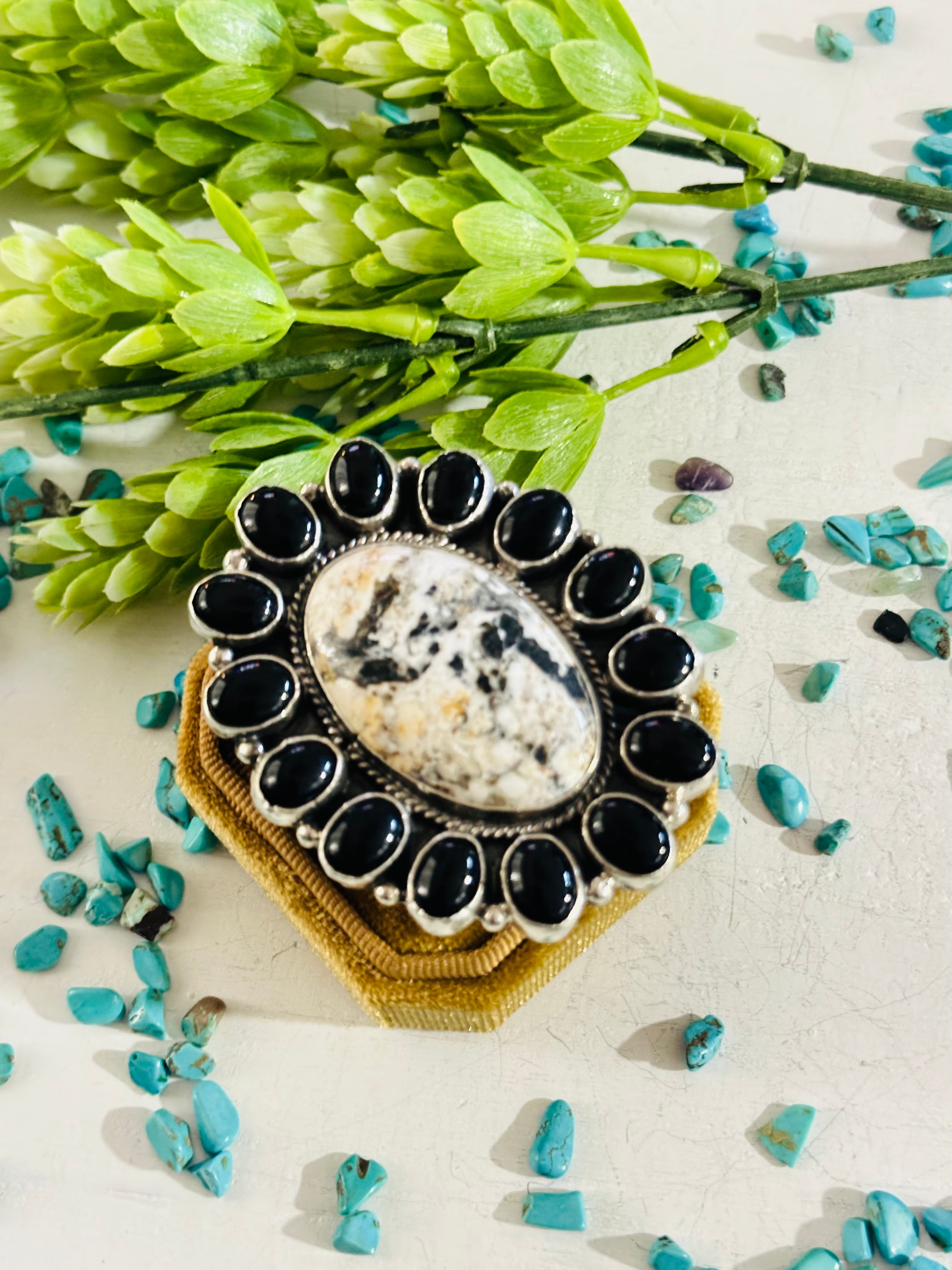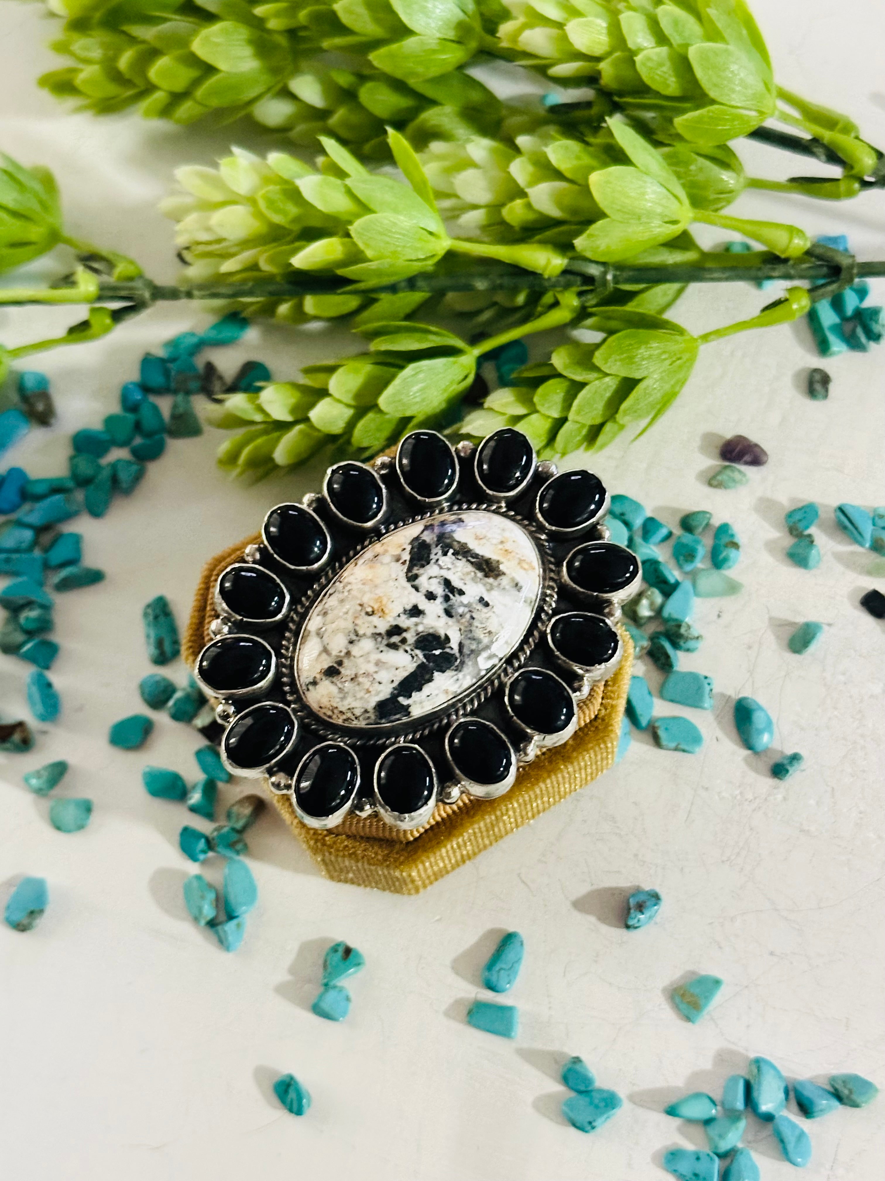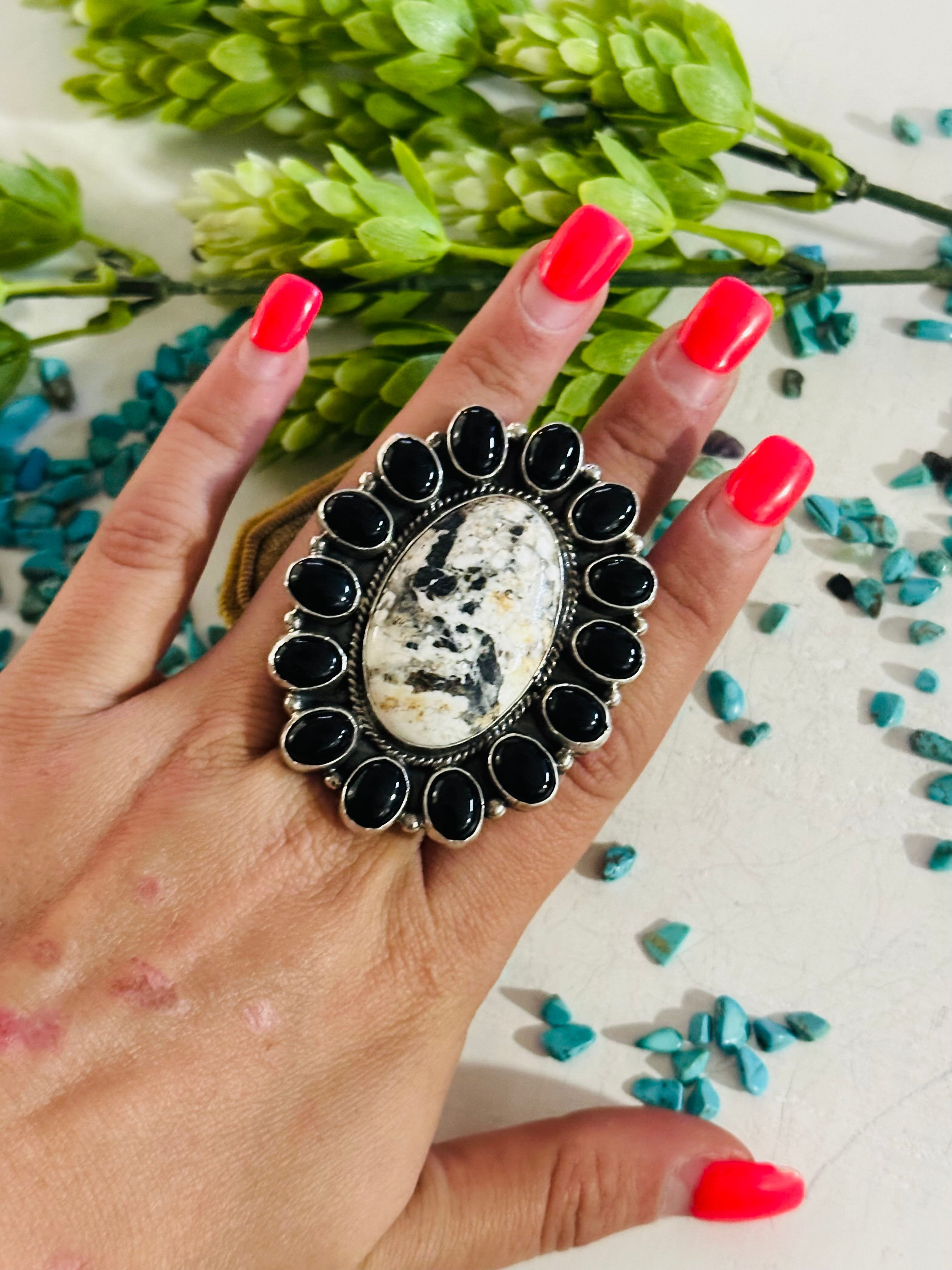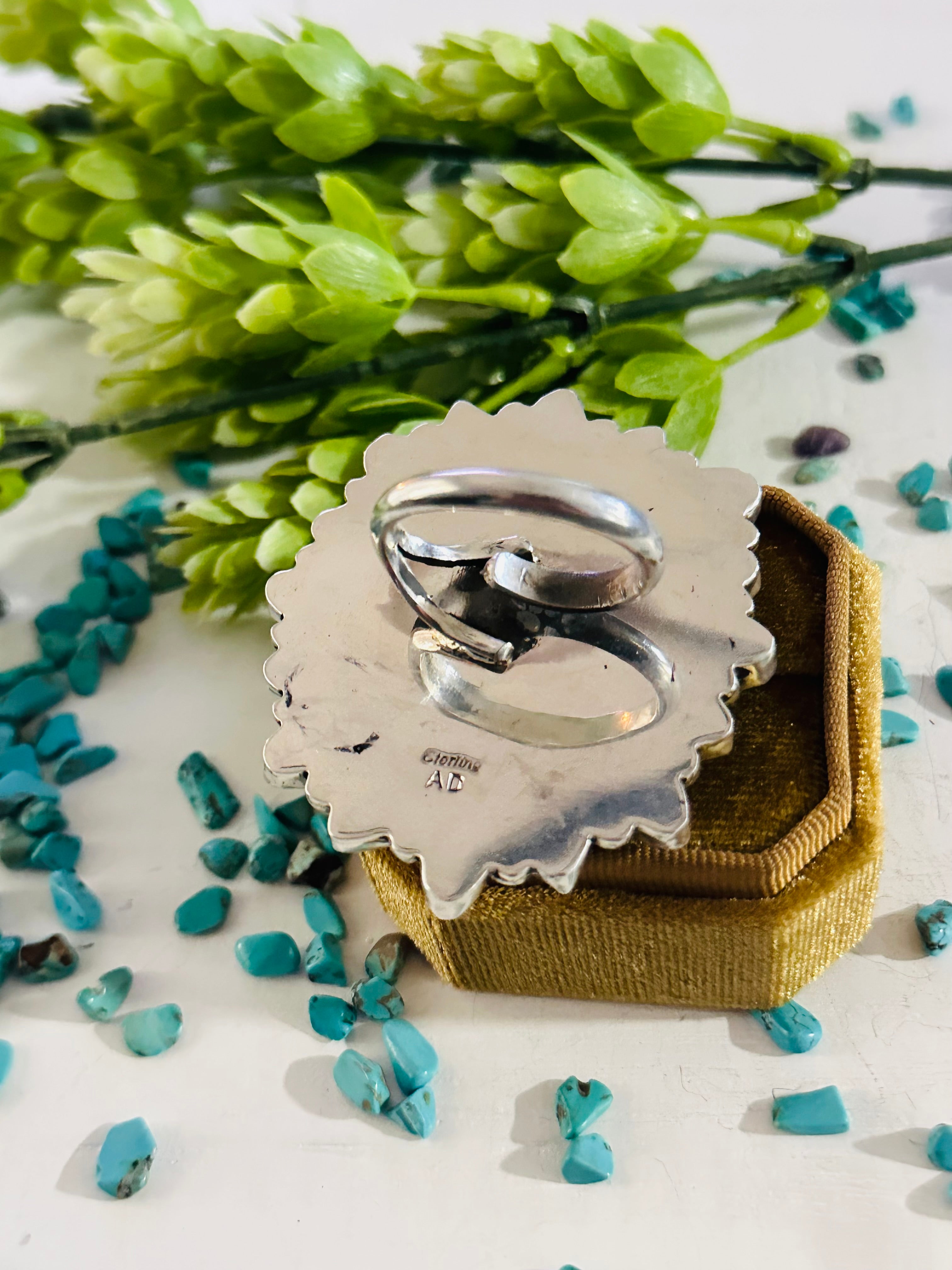 Beautiful ring. Navajo Made Multi Stone & Sterling Silver Adjustable Ring. It measures 2 1/8 inches long and 2 inches wide. Stamped sterling silver and signed.