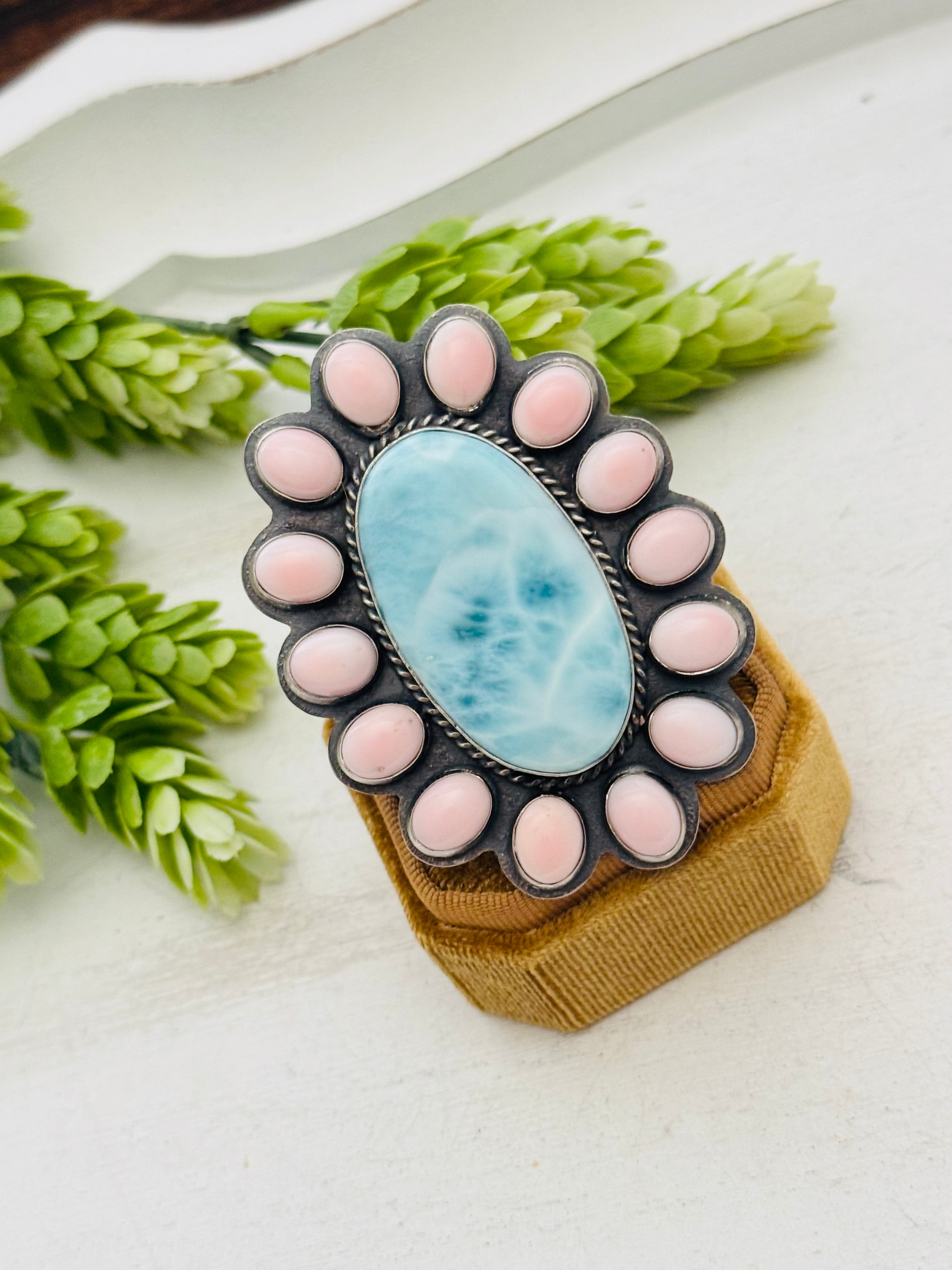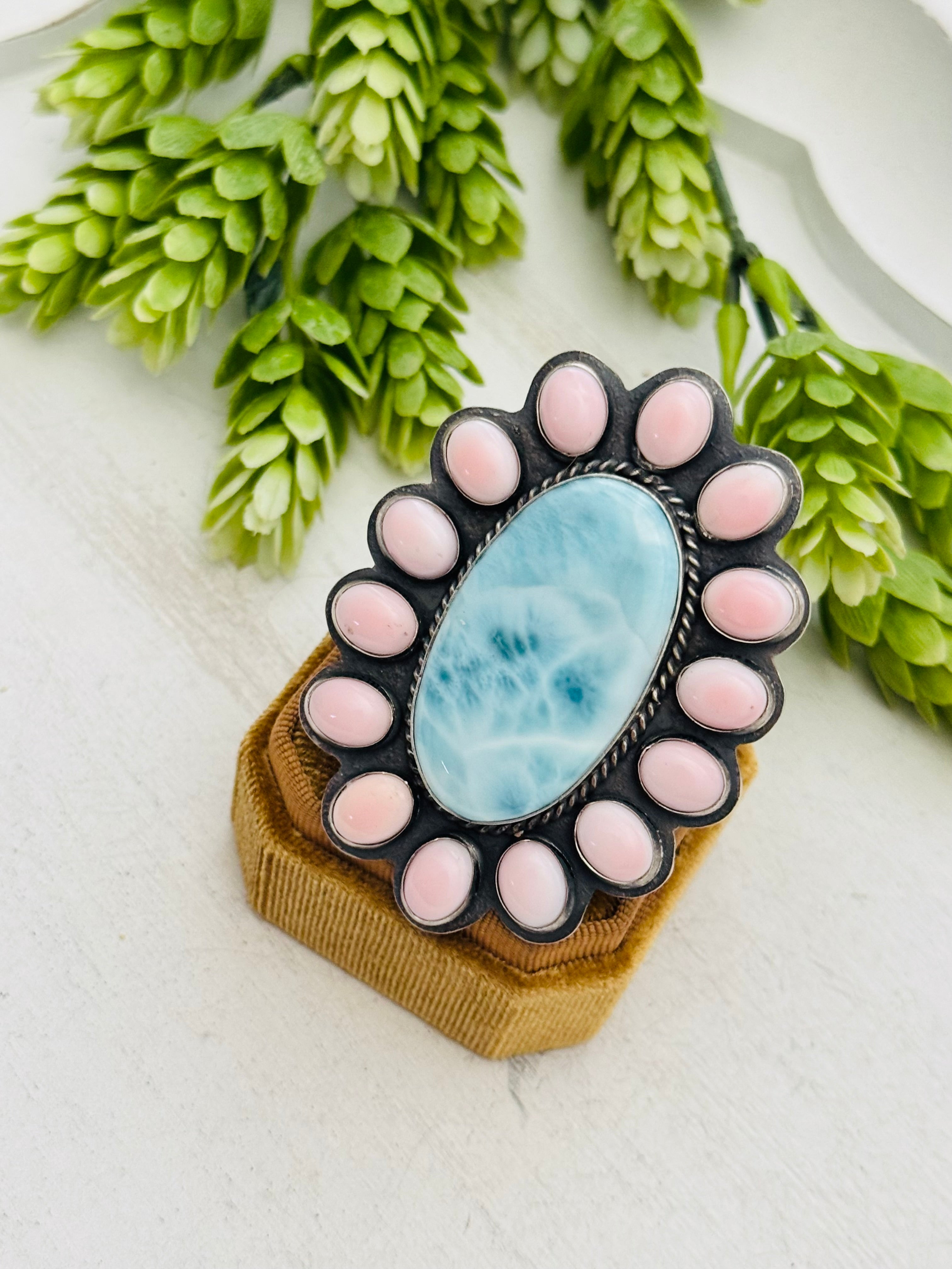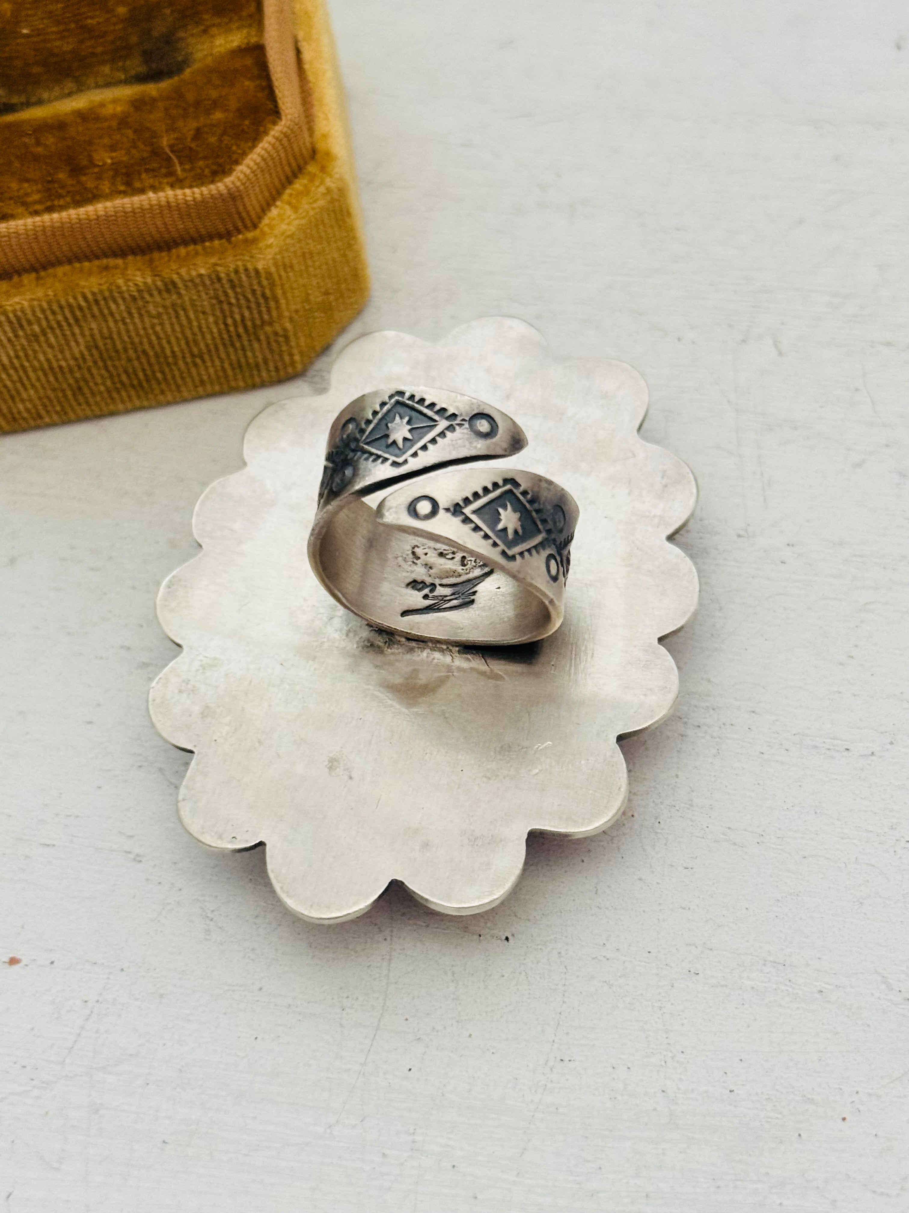 Navajo Made Multi Stone & Sterling Silver Adjustable Ring. It measures 2 5/8 inches long and 2 inches wide. Signed by the artist and stamped sterling silver.