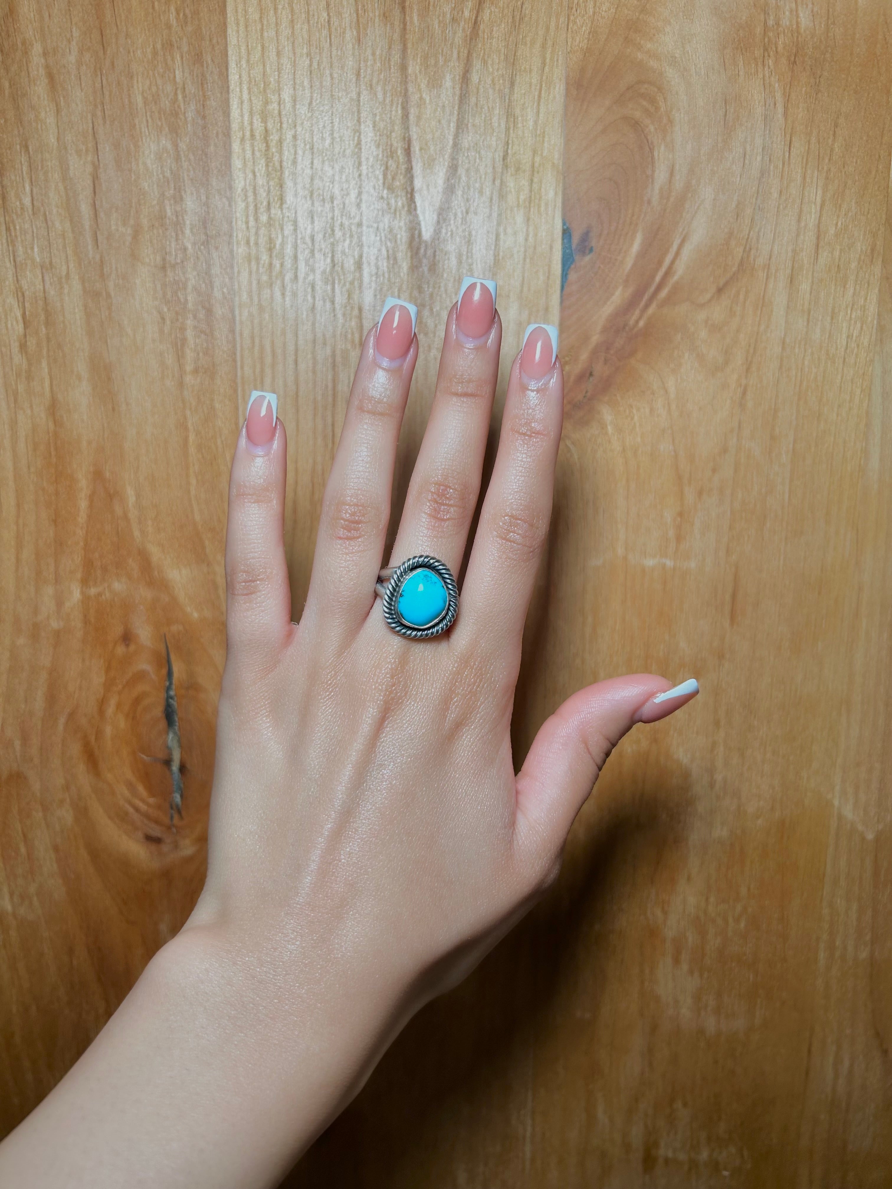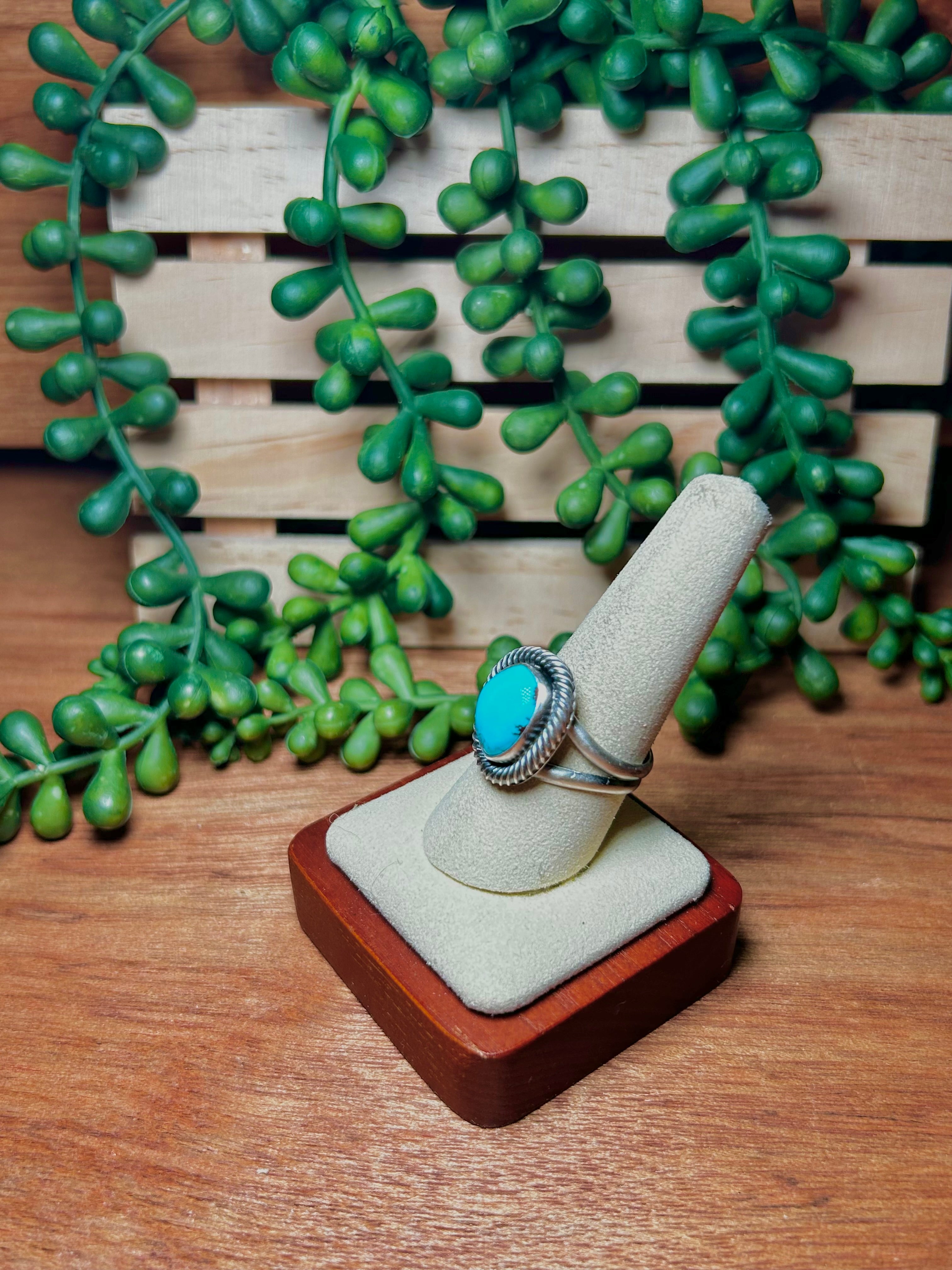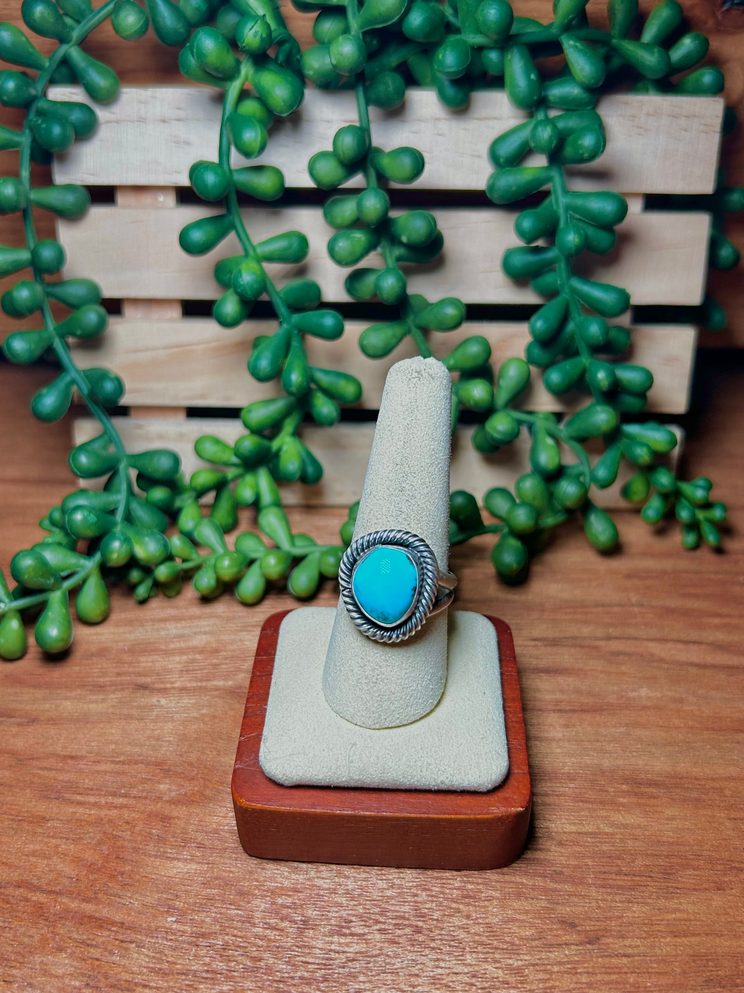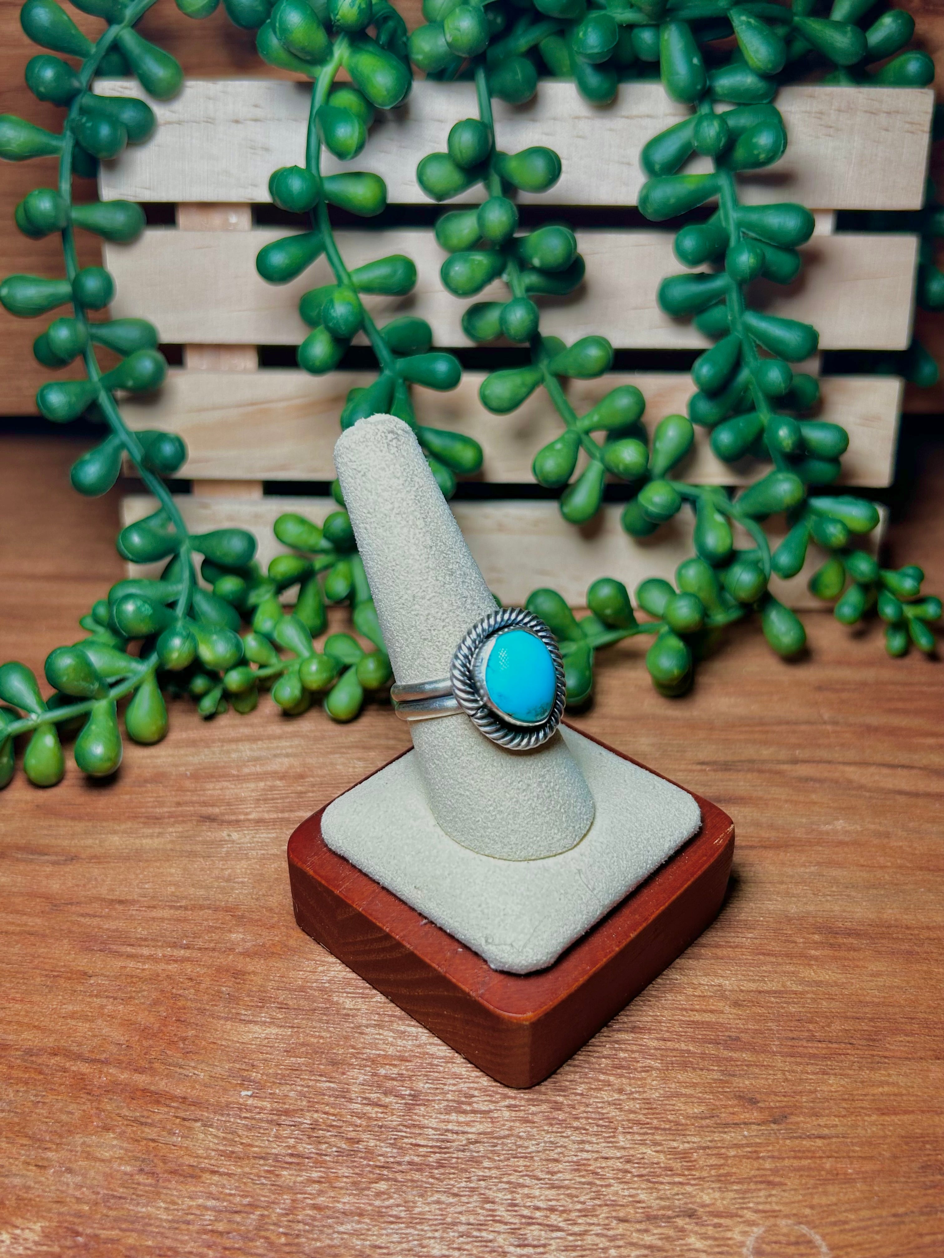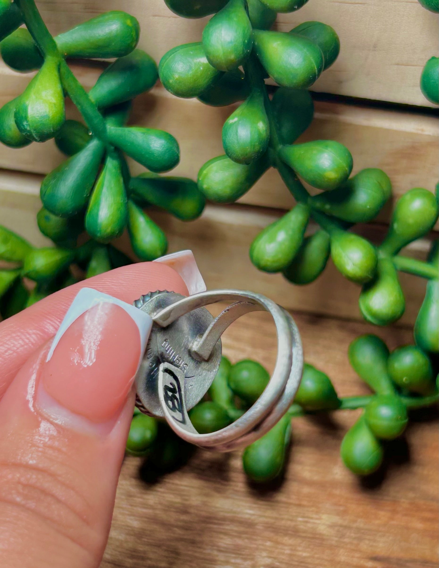 Danny Henio Kingman Turquoise & Sterling Silver Adjustable Ring. It measures 3/4 of an inch long and 5/8 of an inch wide. Signed by the artist and stamped sterling silver.