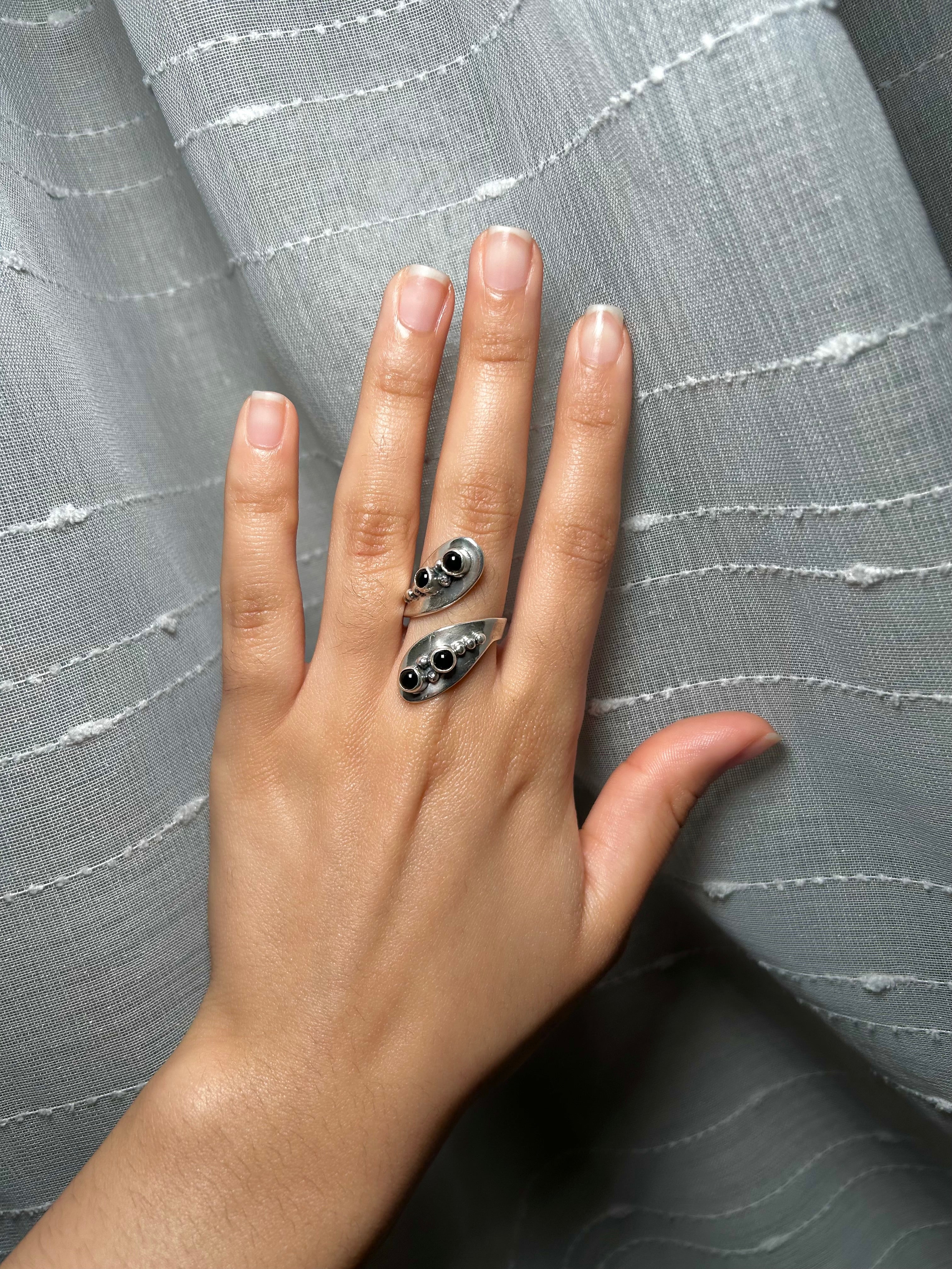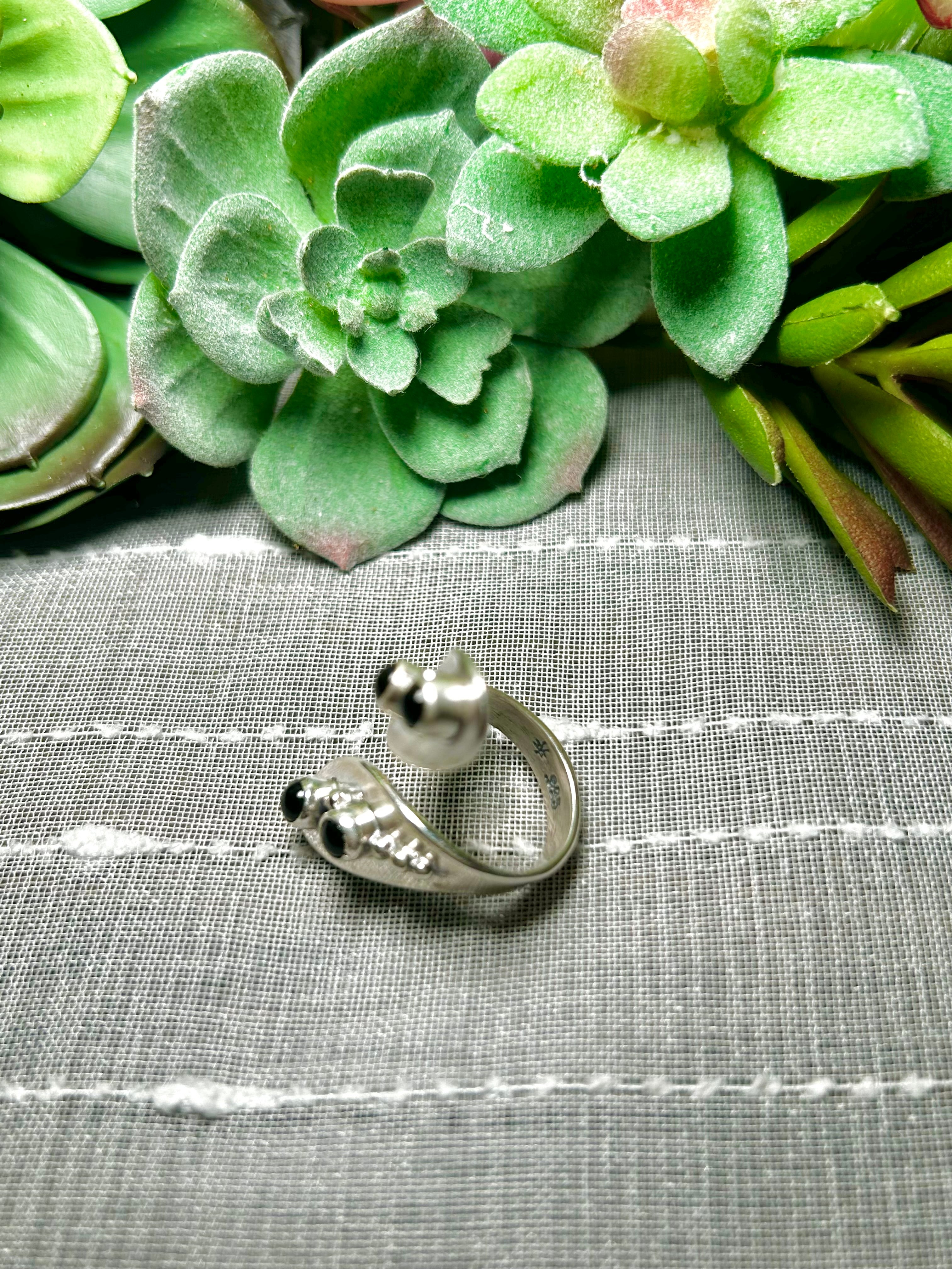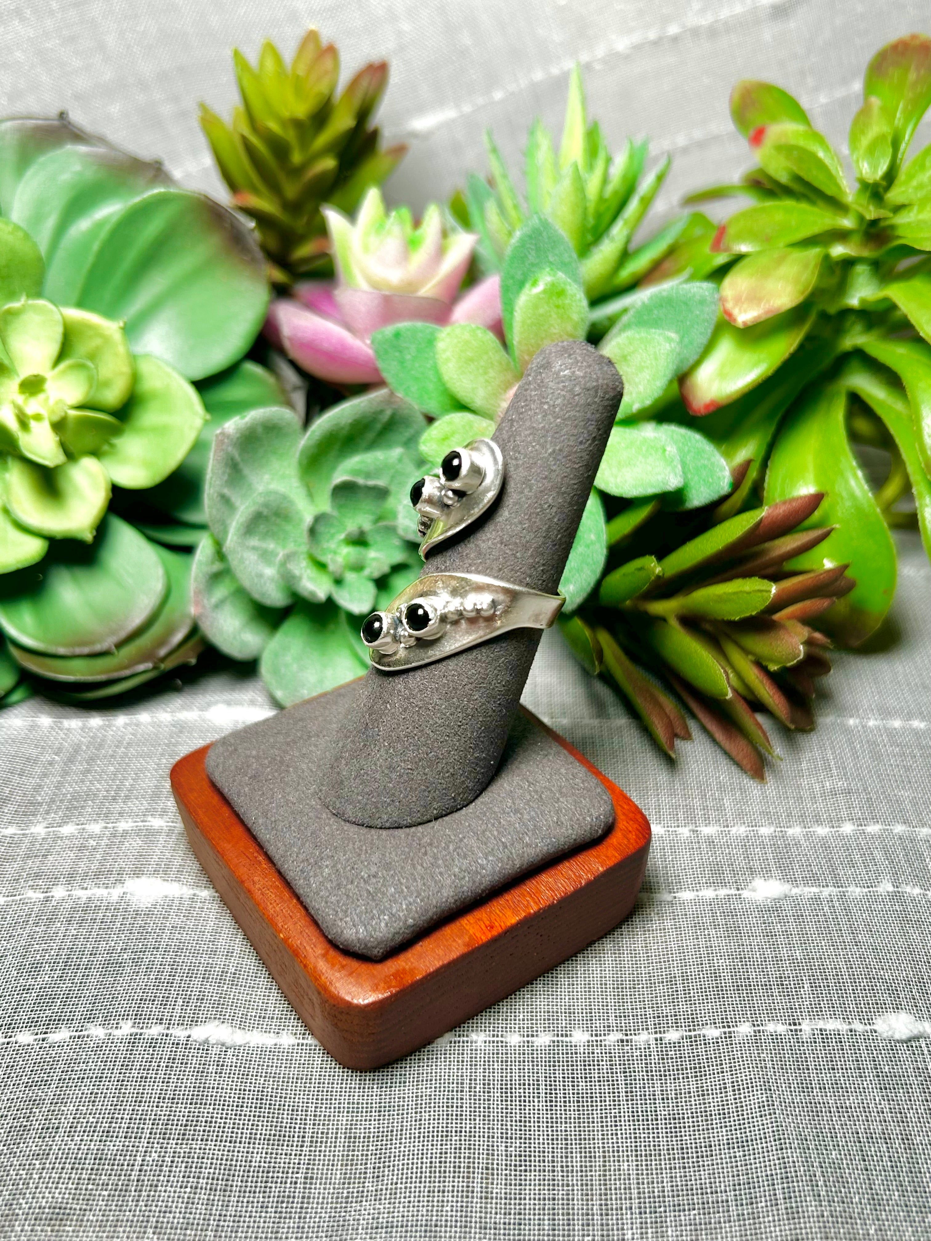 Navajo Made Onyx & Sterling Silver Adjustable Ring. It measures 1 1/2 inches long and 3/4 of an inch wide. Signed by the artist and stamped sterling silver.