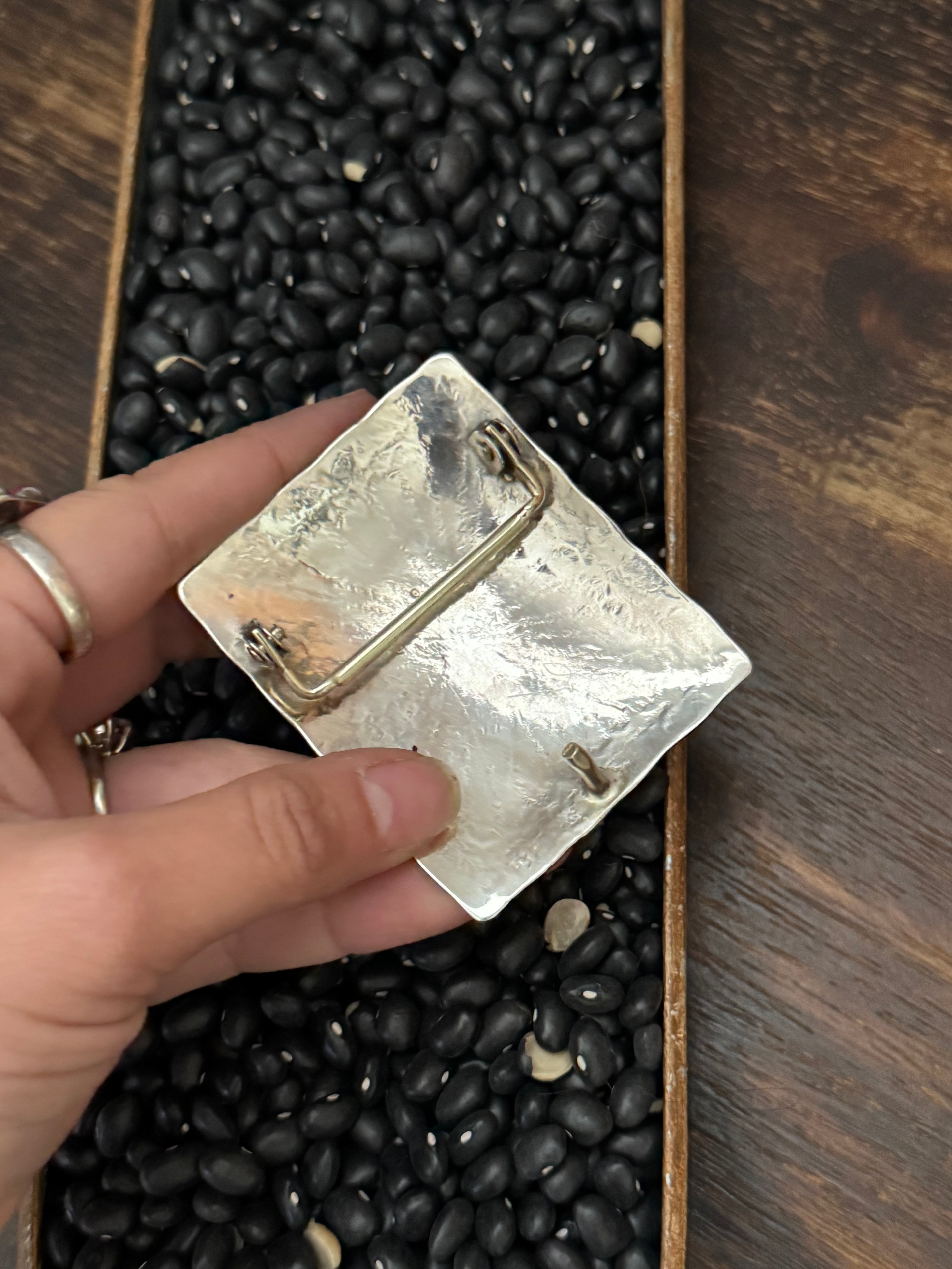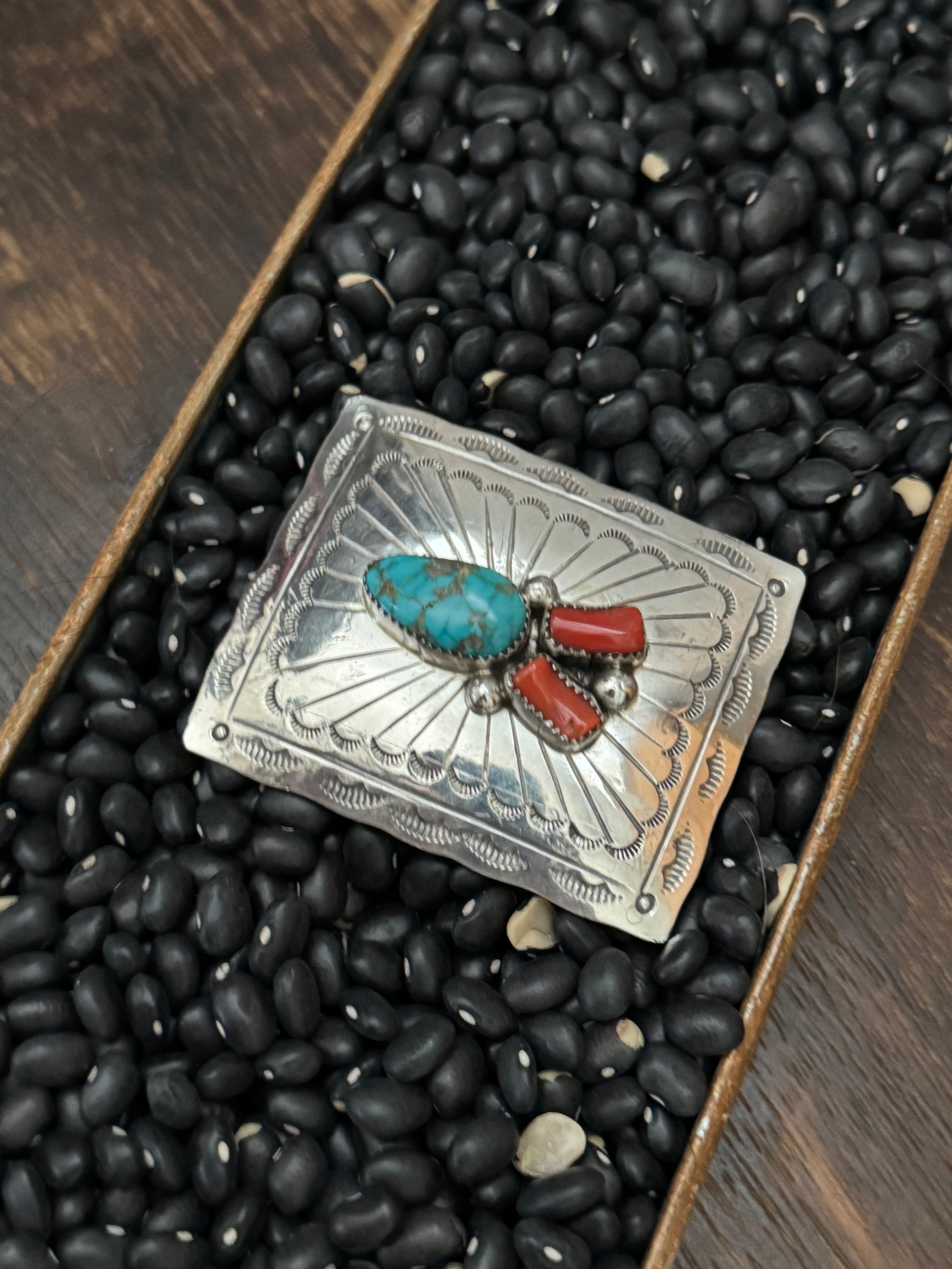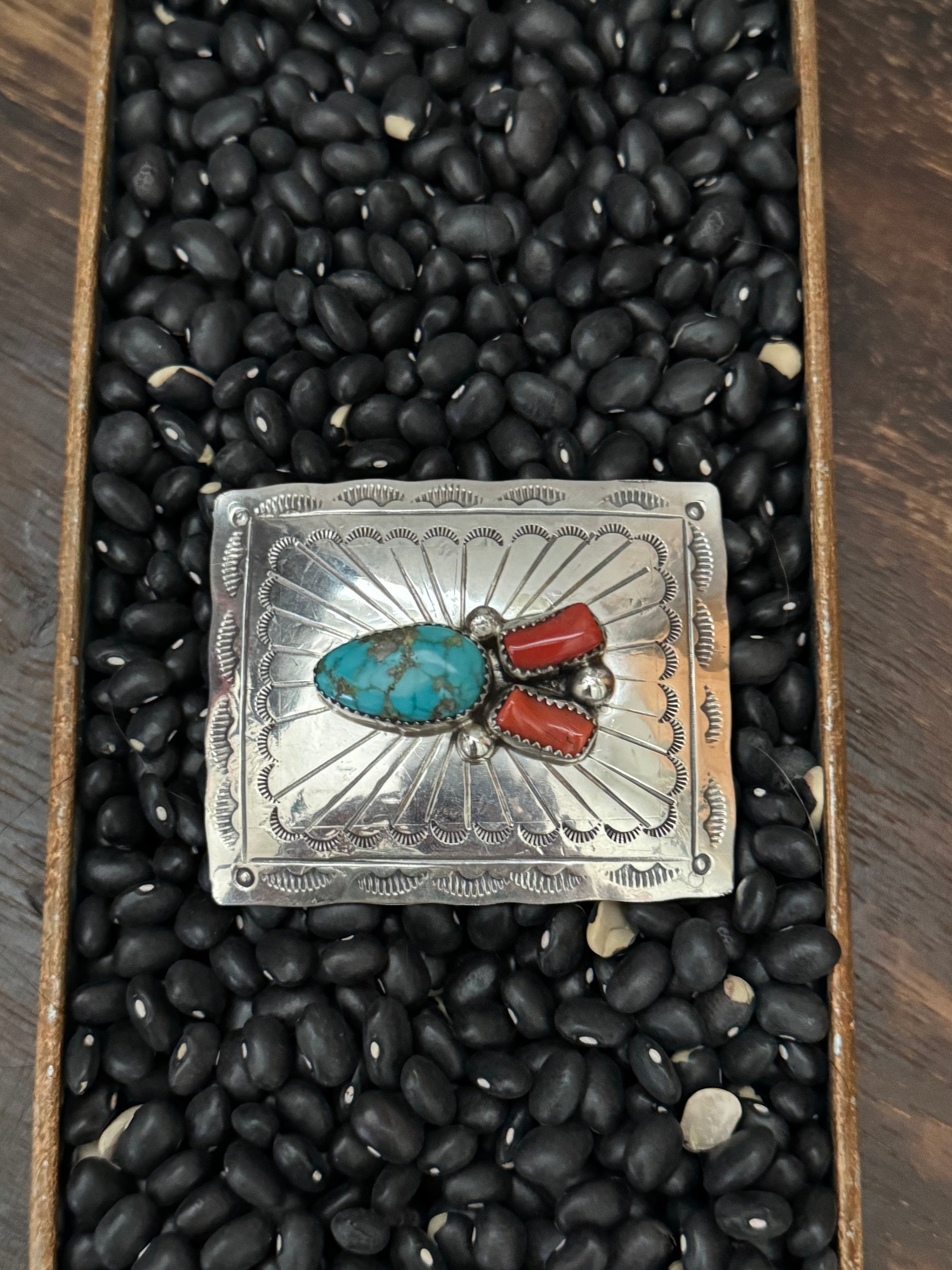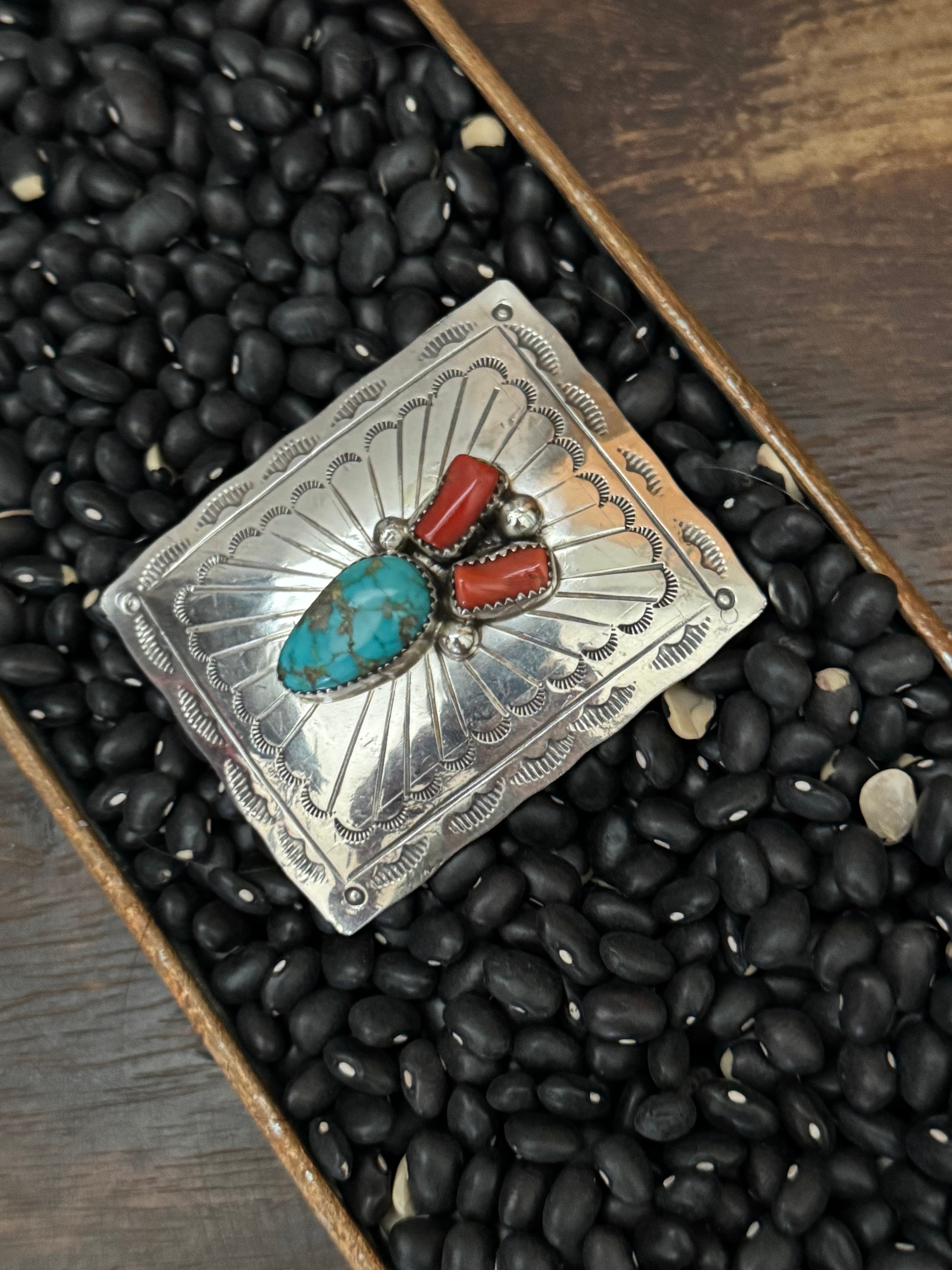 Navajo Made Multi Stone & Sterling Silver Buckle. It measures 2 5/8 inches long and 2 1/8 inches wide.