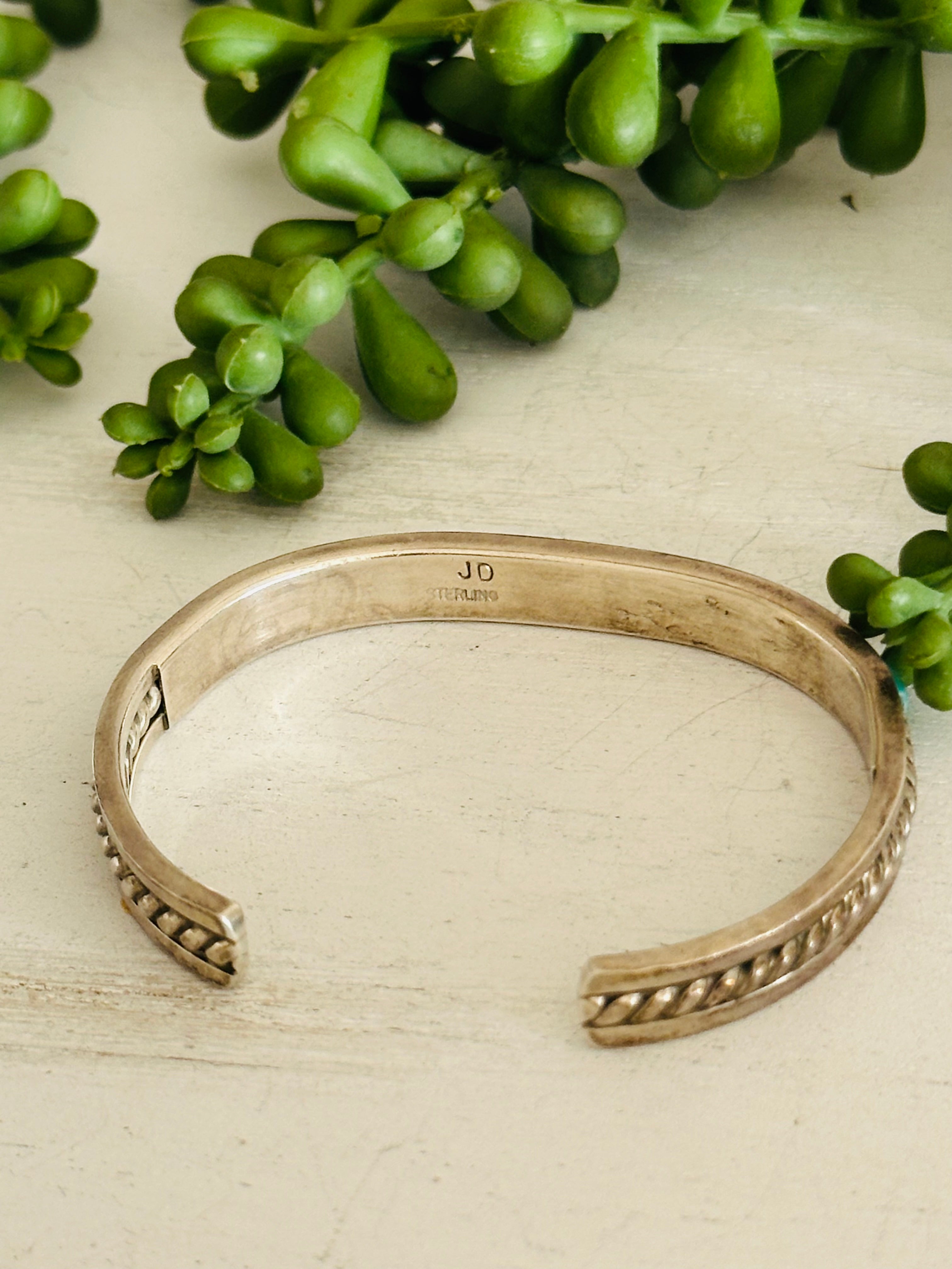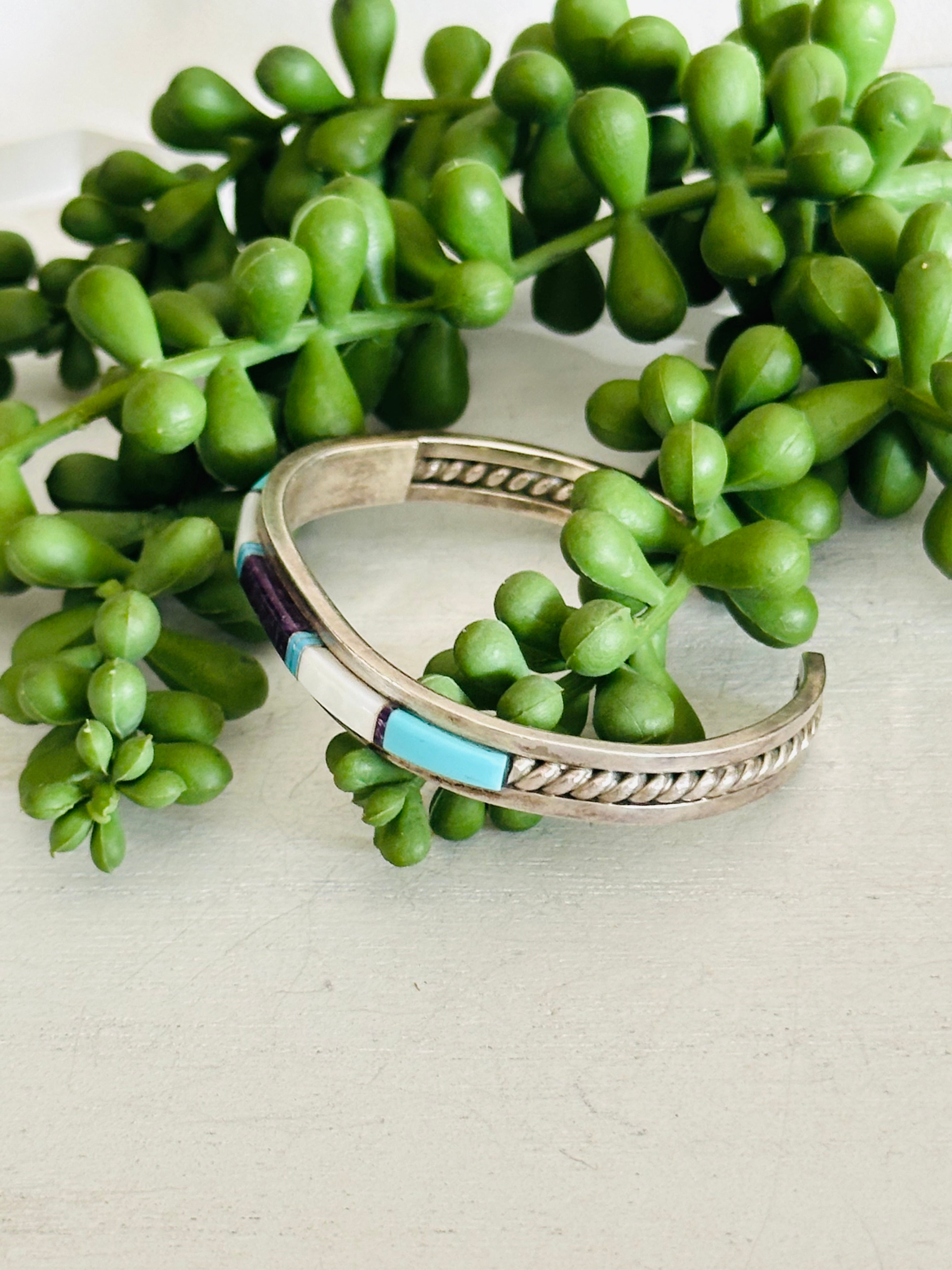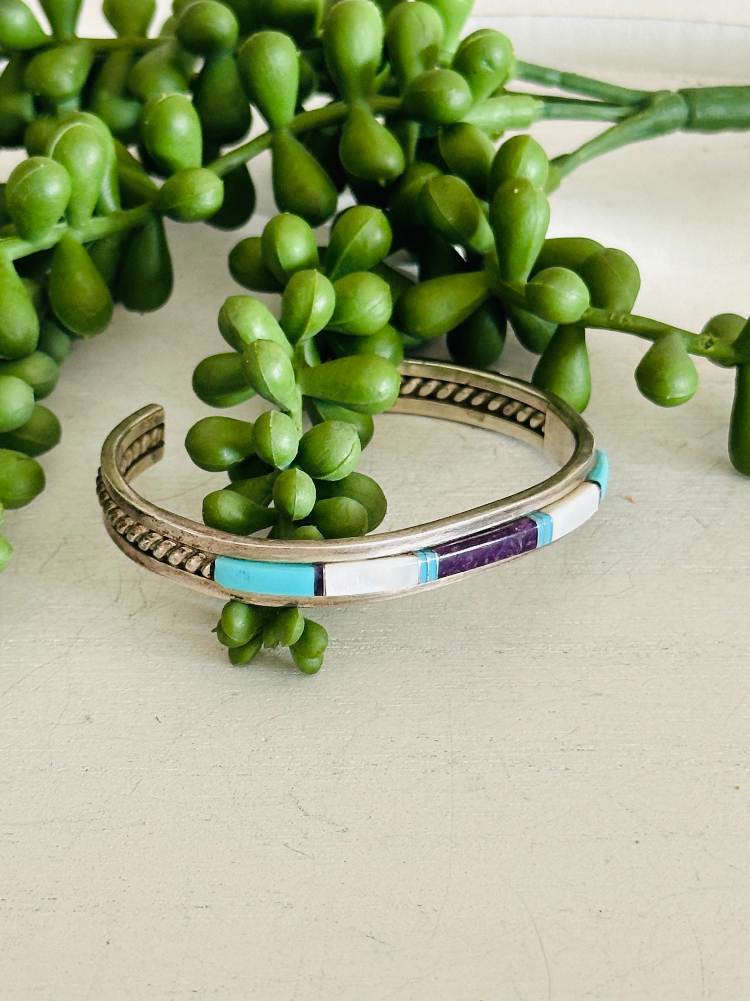 Navajo Made Multi Stone & Sterling Silver Inlay Cuff Bracelet. It measures 1/4 of an inch wide with an inside circumference of 5 1/4 inches and a gap of 1 inch. Signed by artist and stamped sterling silver.