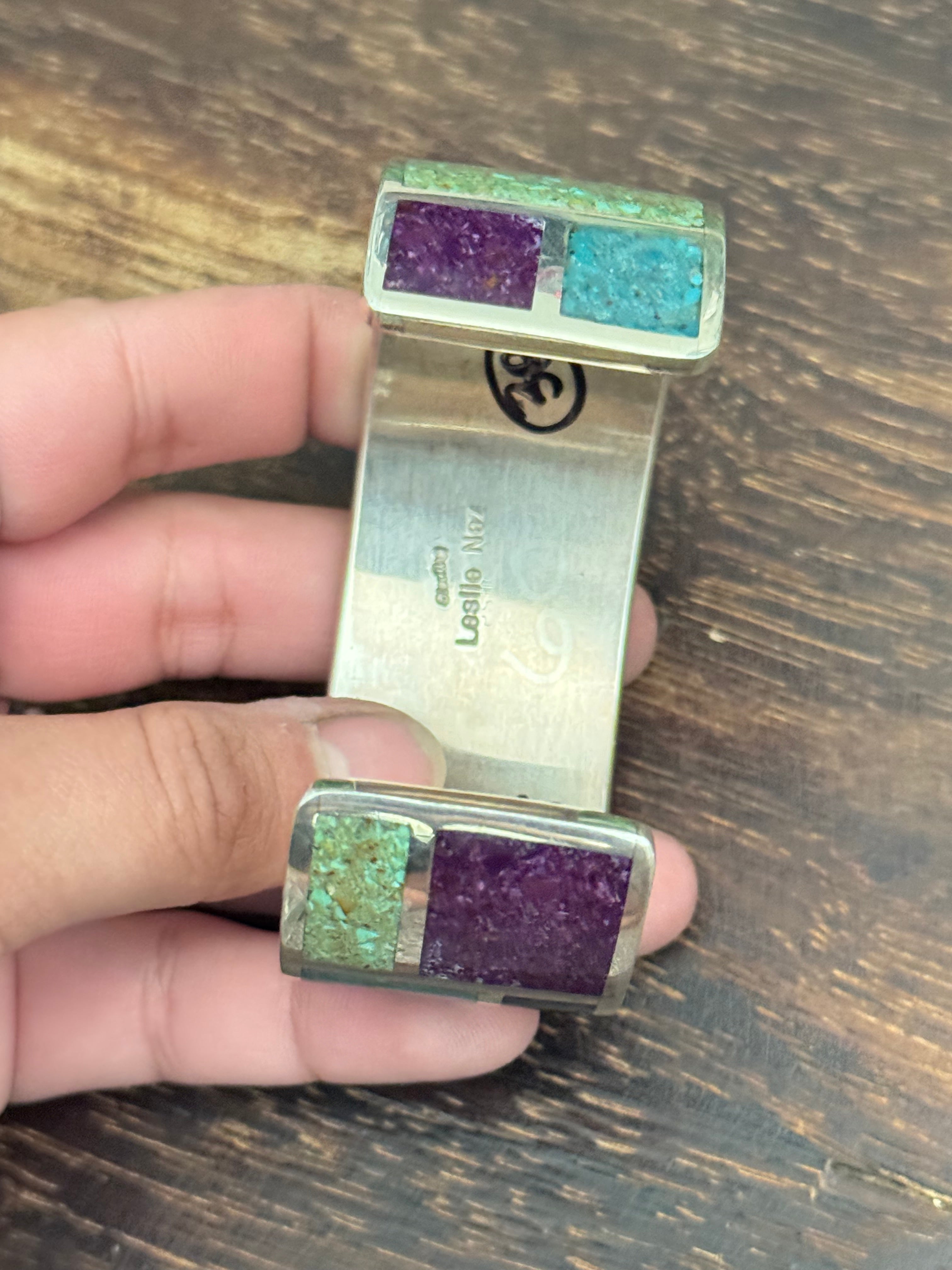 Leslie Nez Multi Stone & Sterling Silver Inlay Cuff Bracelet. It measures 1 1/8 inches wide with an inside circumference of 5 3/4 inches and a gap of 1 3/8 inches. Signed by artist and stamped sterling silver.