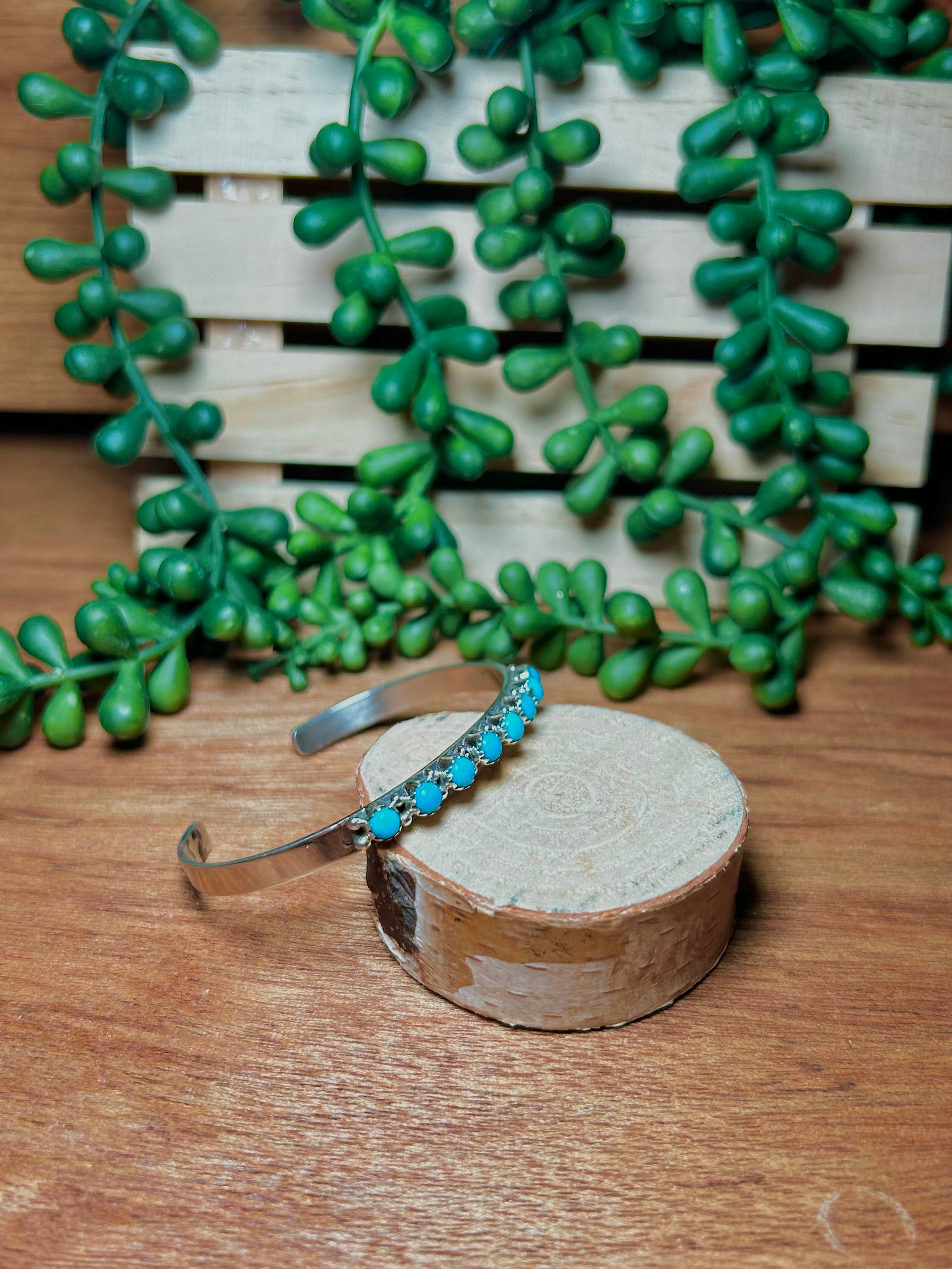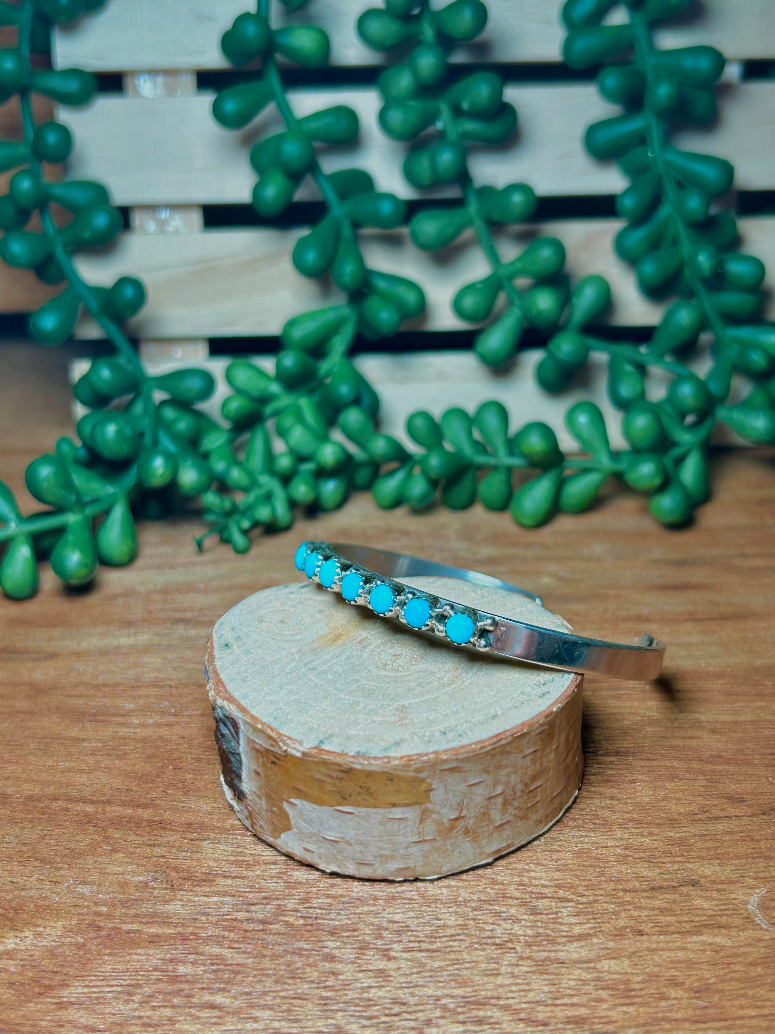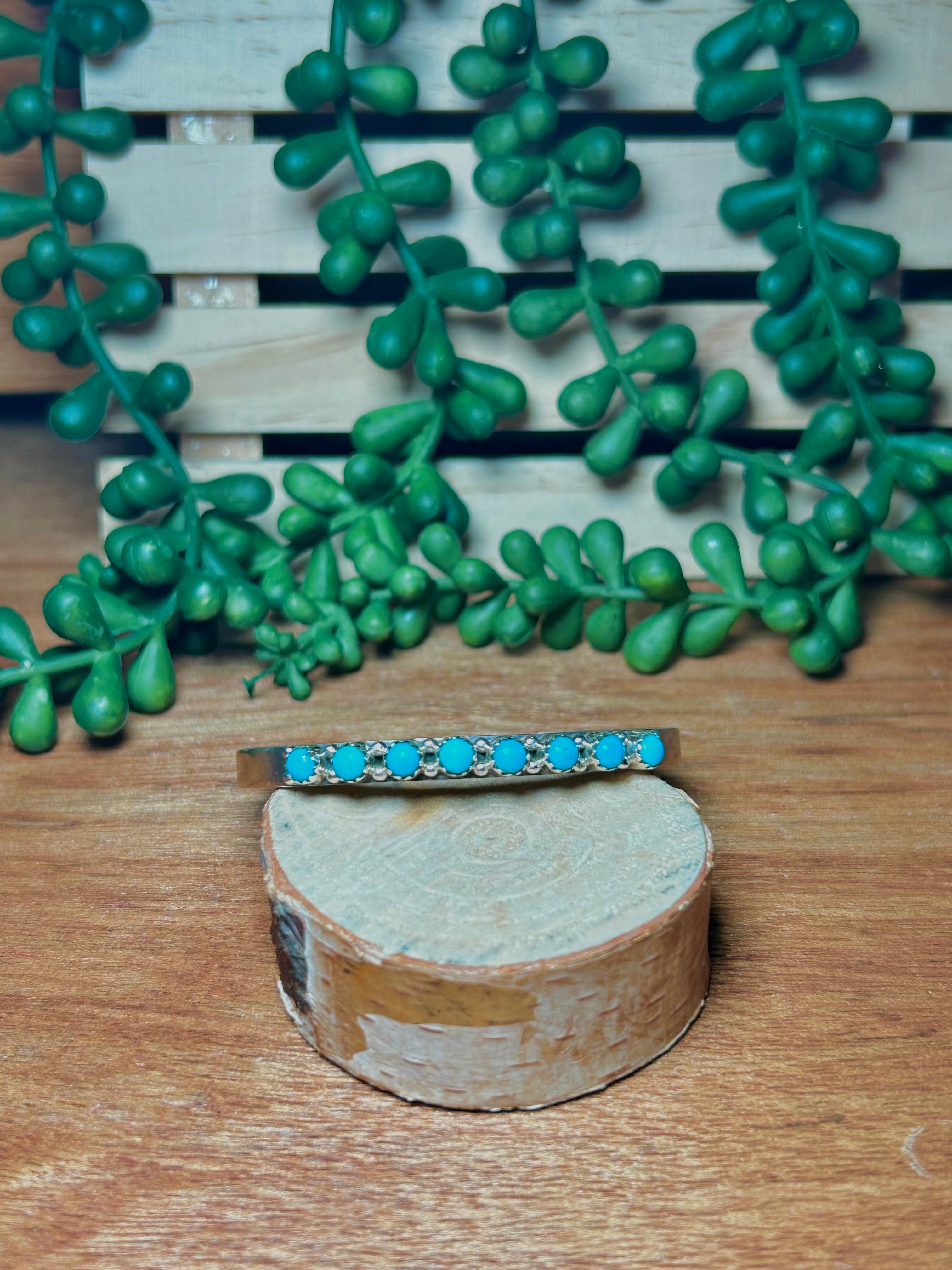 Navajo Made Kingman Turquoise & Sterling Silver Cuff Bracelet. It measures 1/4 of an inch wide with an inside circumference of 5 1/4 inches and a gap of 1 inch. Signed by artist and stamped sterling silver.