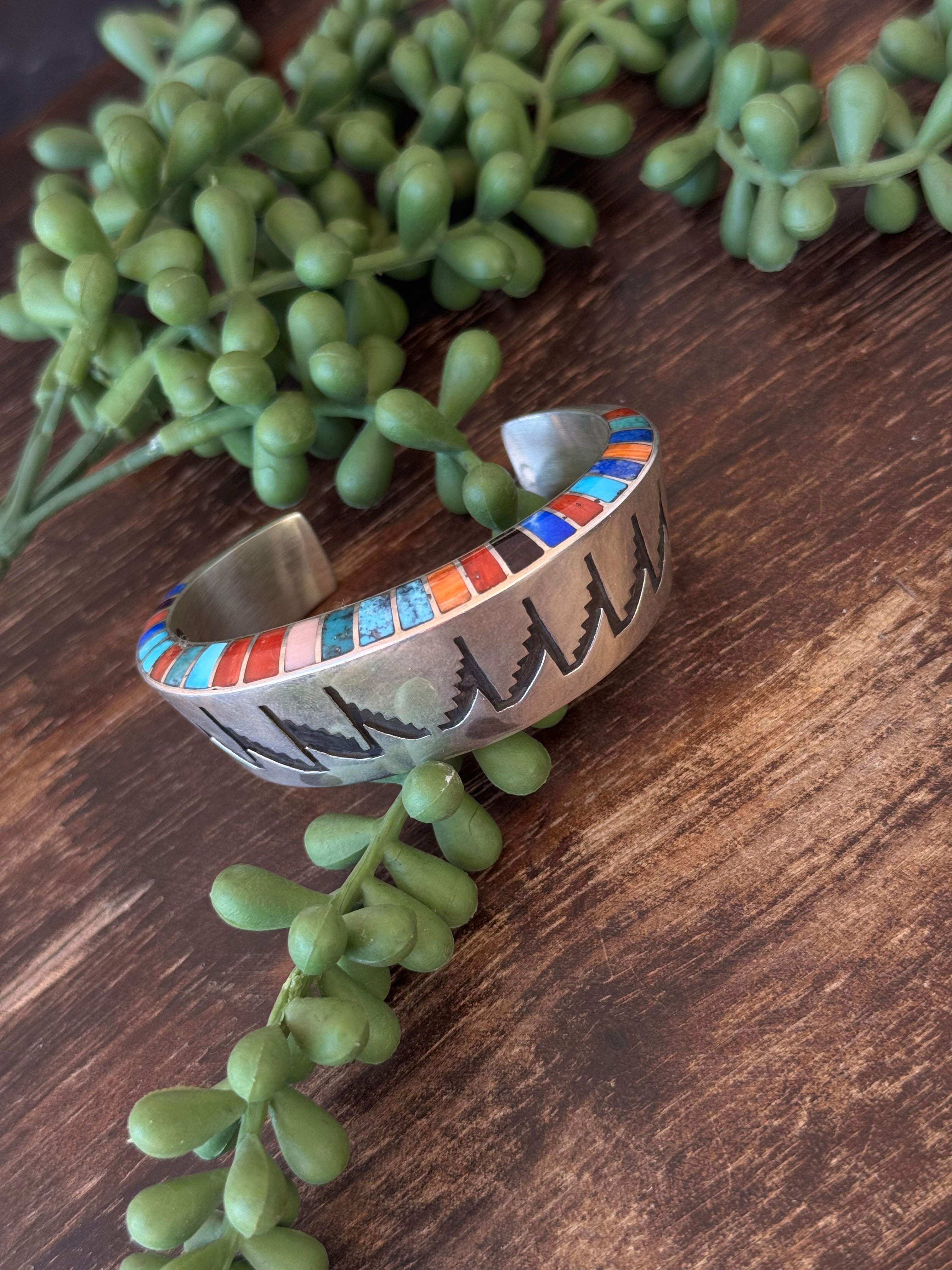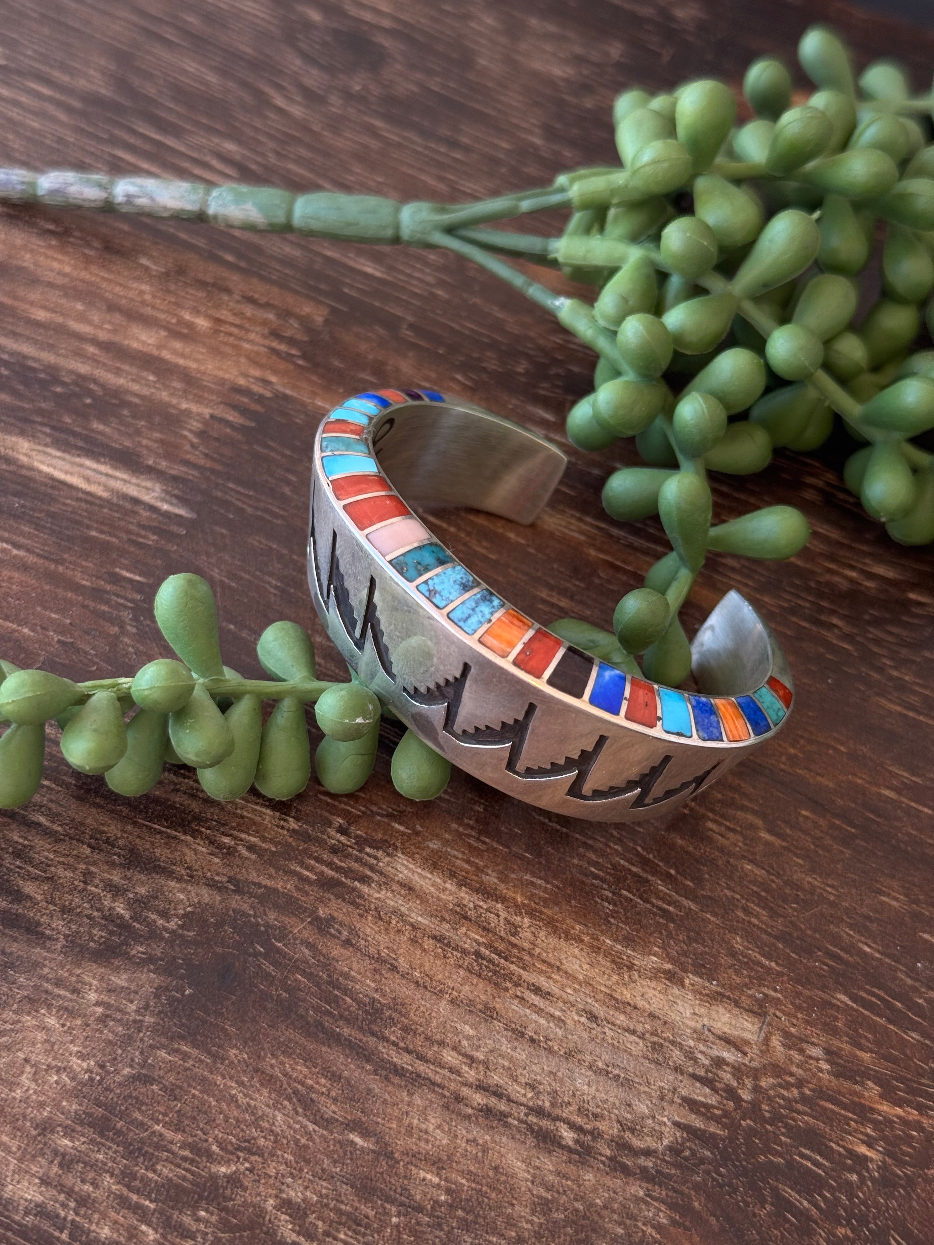 Navajo Made Multi Stone & Sterling Silver Inlay Cuff Bracelet