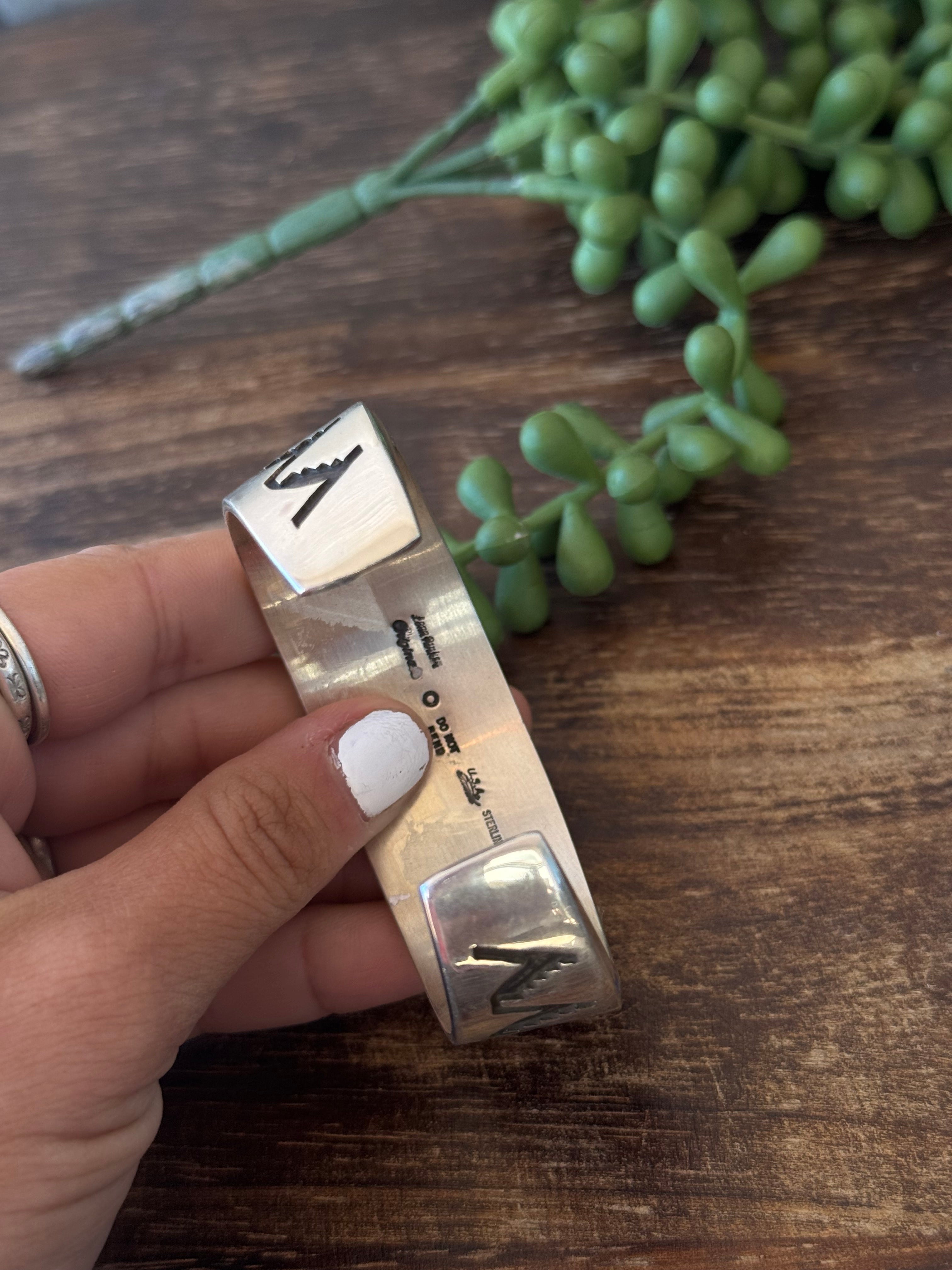 Navajo Made Multi Stone & Sterling Silver Inlay Cuff Bracelet. It measures 1 inch wide with an inside circumference of 5 3/8 inches and a gap of 1 1/8 inches. Signed by artist and stamped sterling silver.