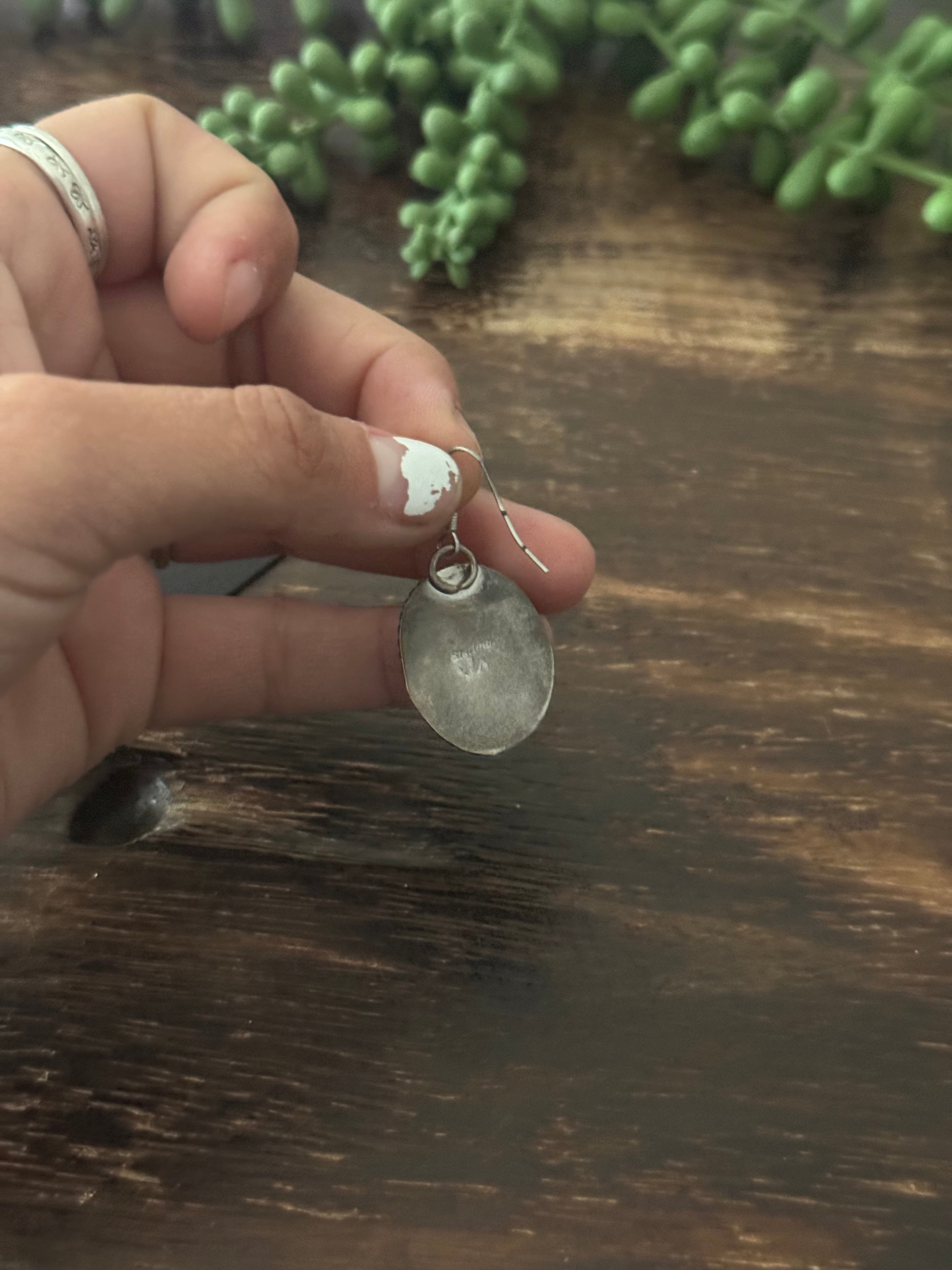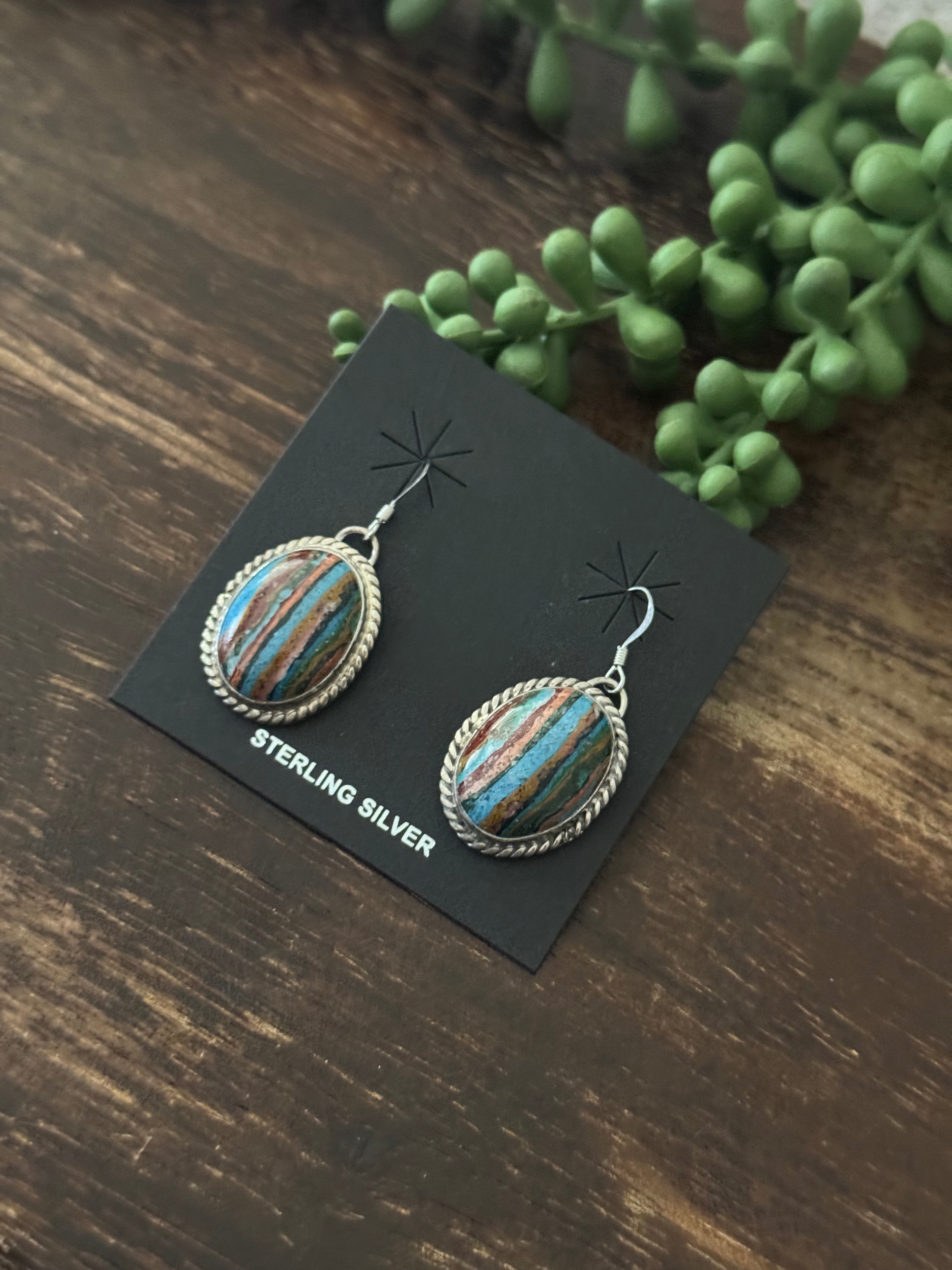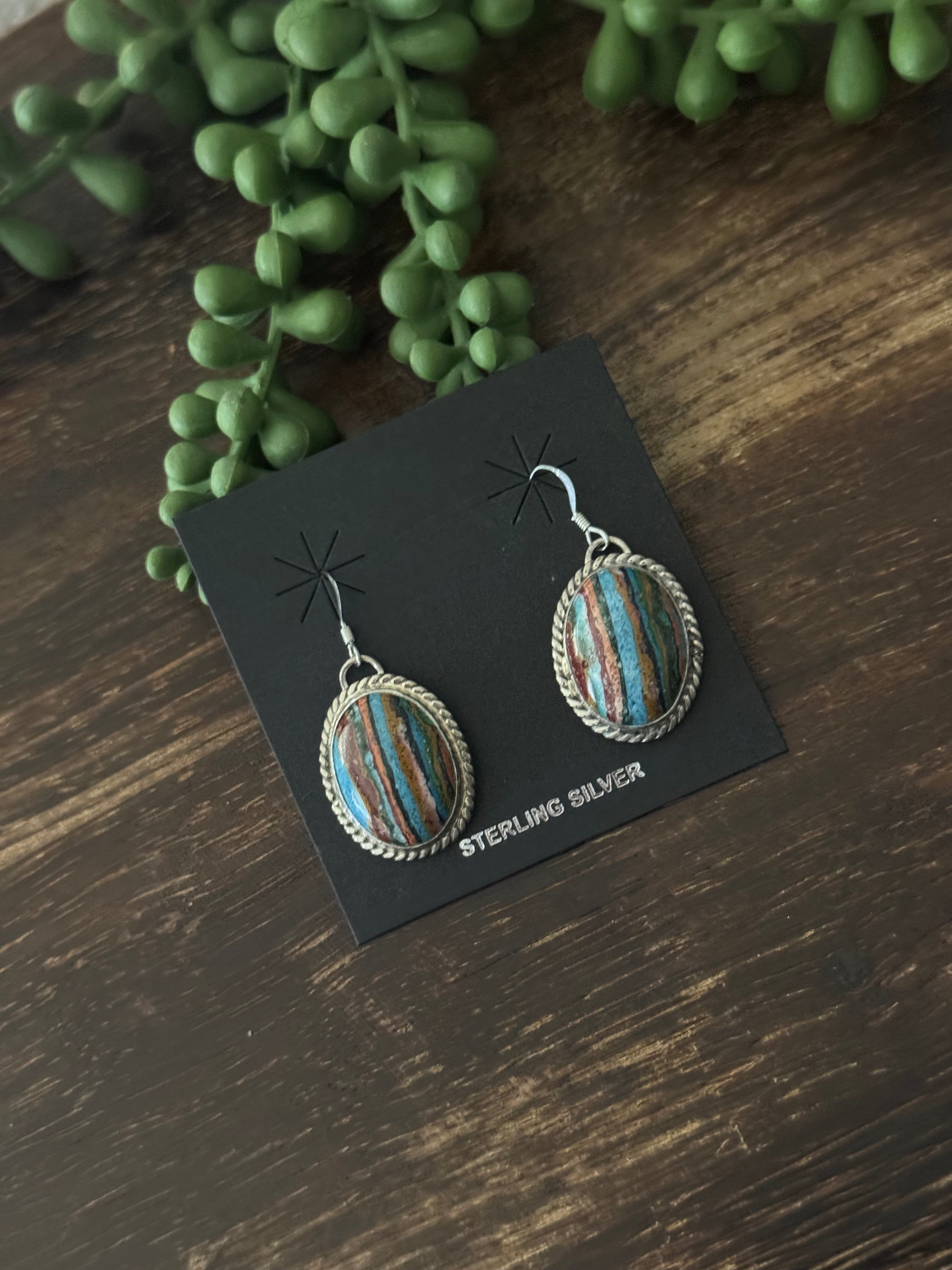 - Navajo Made Rainbow Obsidian & Sterling Silver Dangle Earrings. It measures 1 5/8 inches long and 3/4 of an inch wide. Signed by the artist and stamped sterling silver.