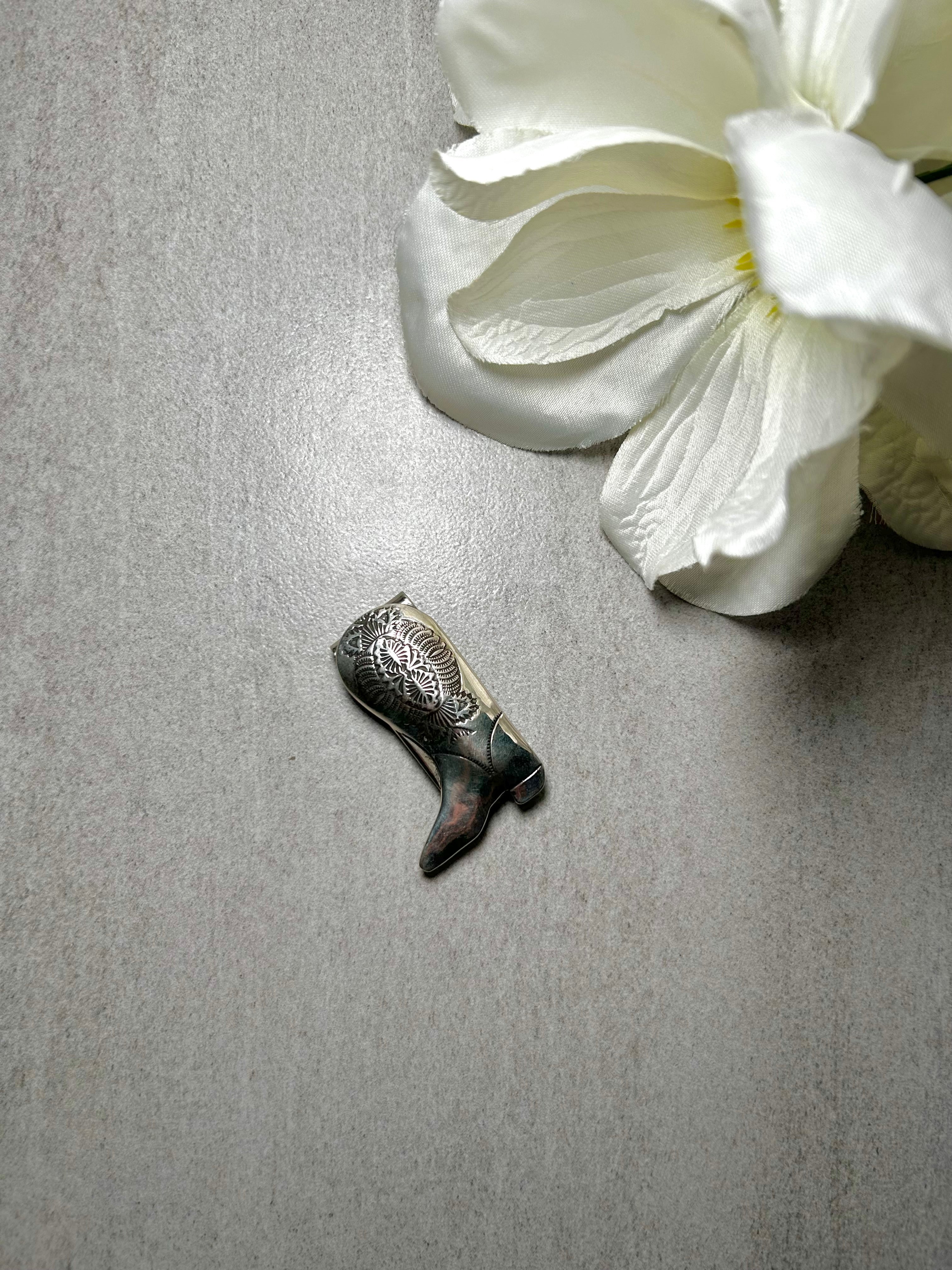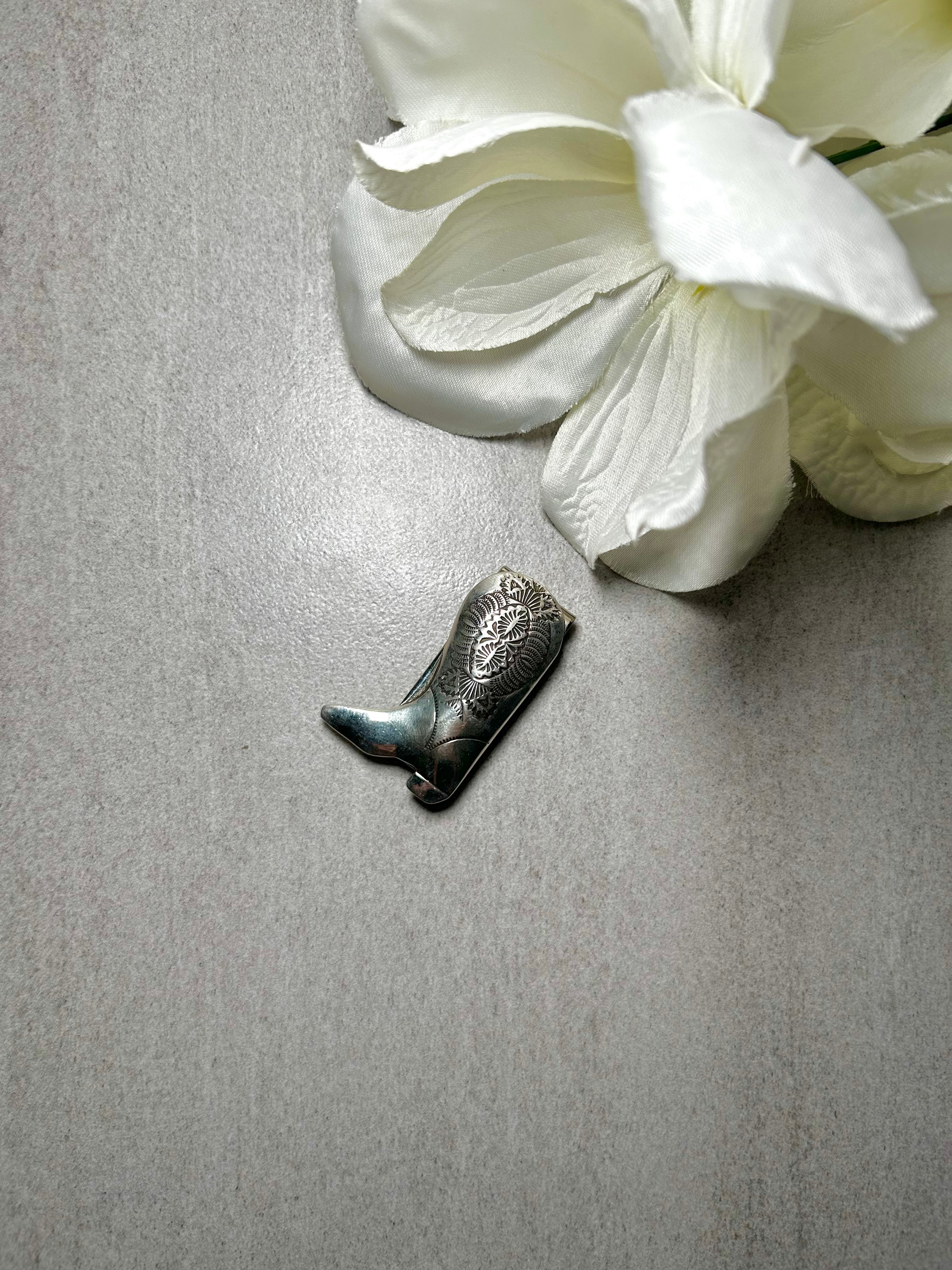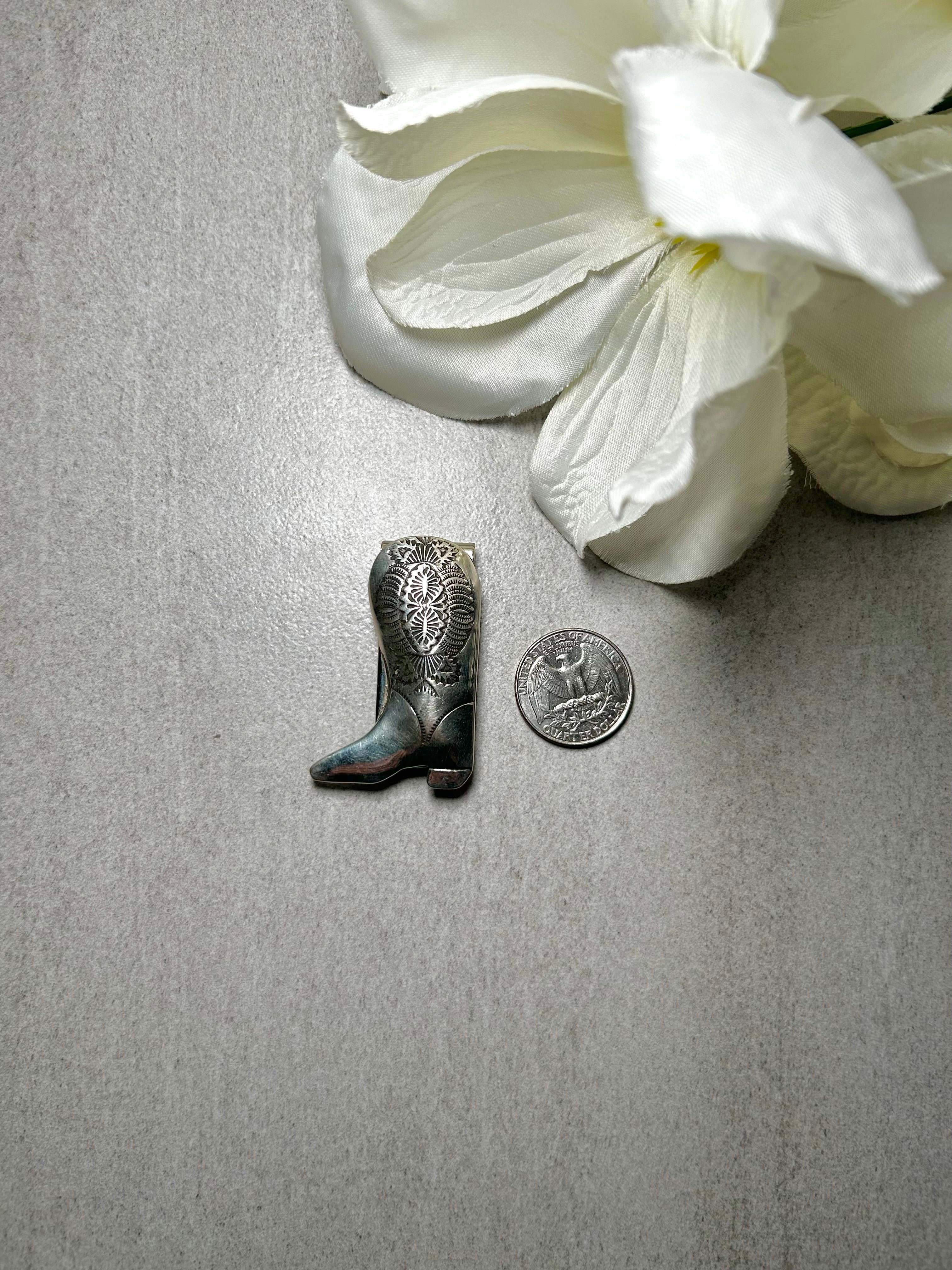 Navajo Made Sterling Silver Money Clip. It measures 2 inches long and 1 1/4 inches wide. Signed by artist and stamped sterling silver.