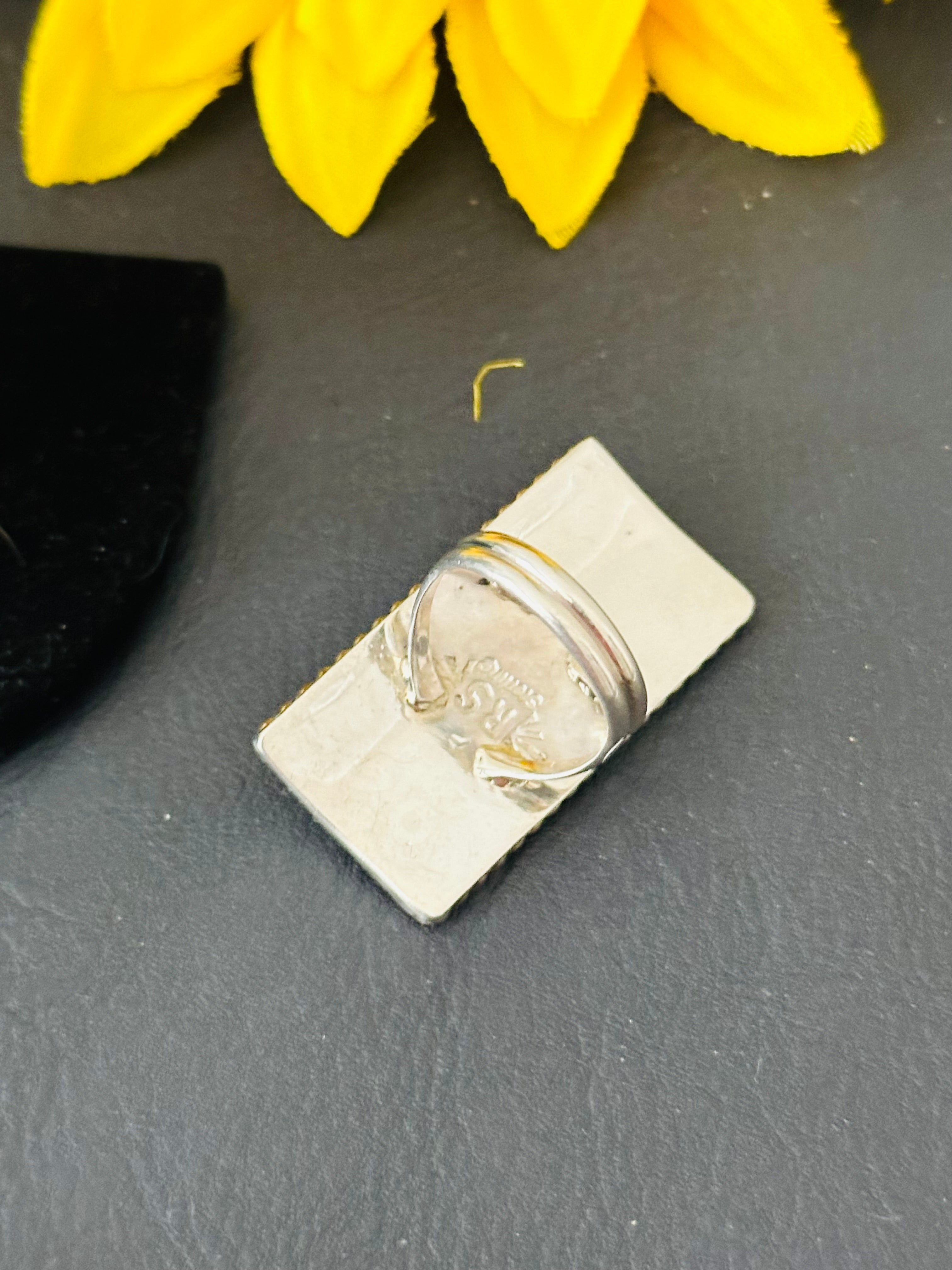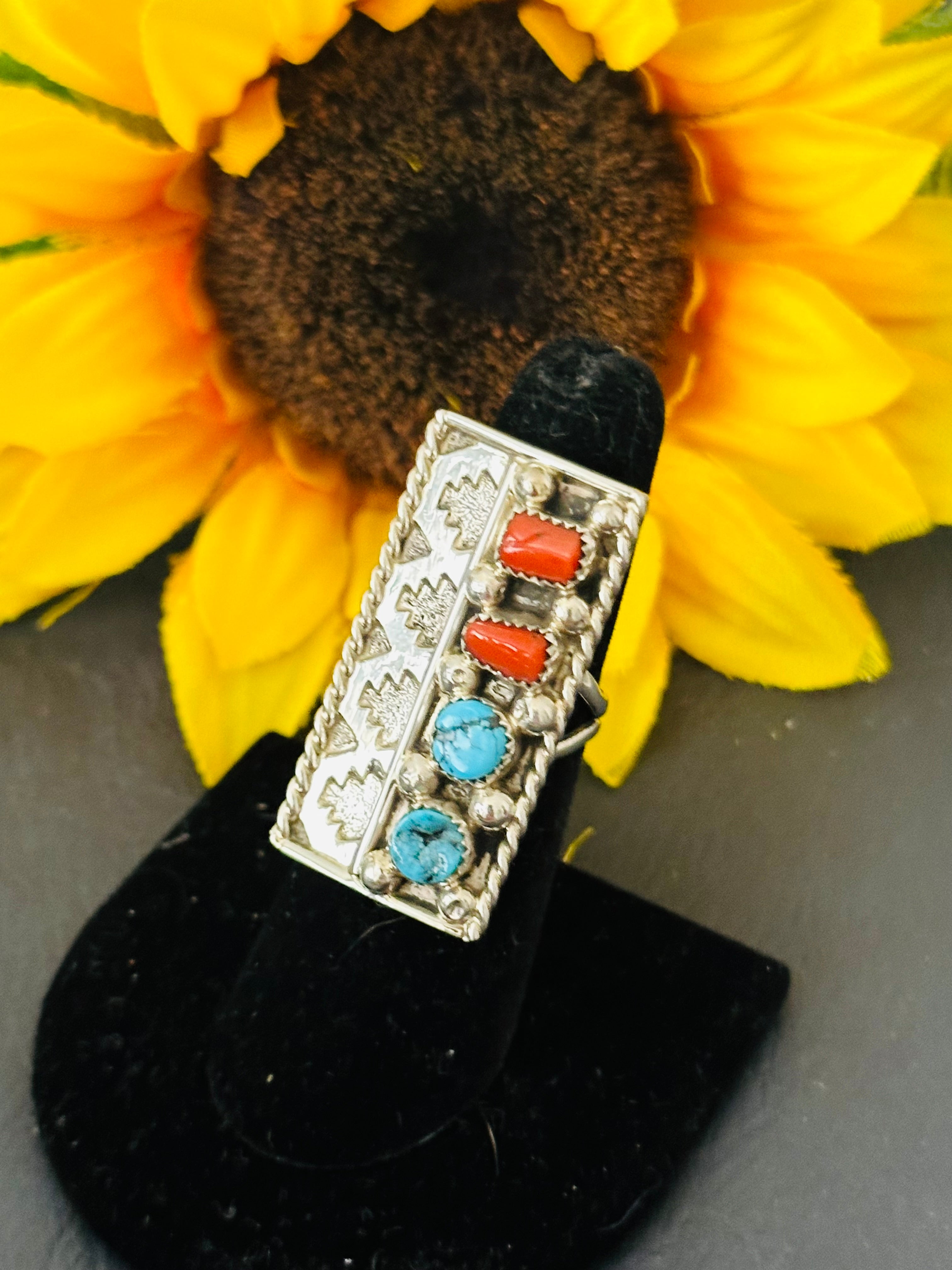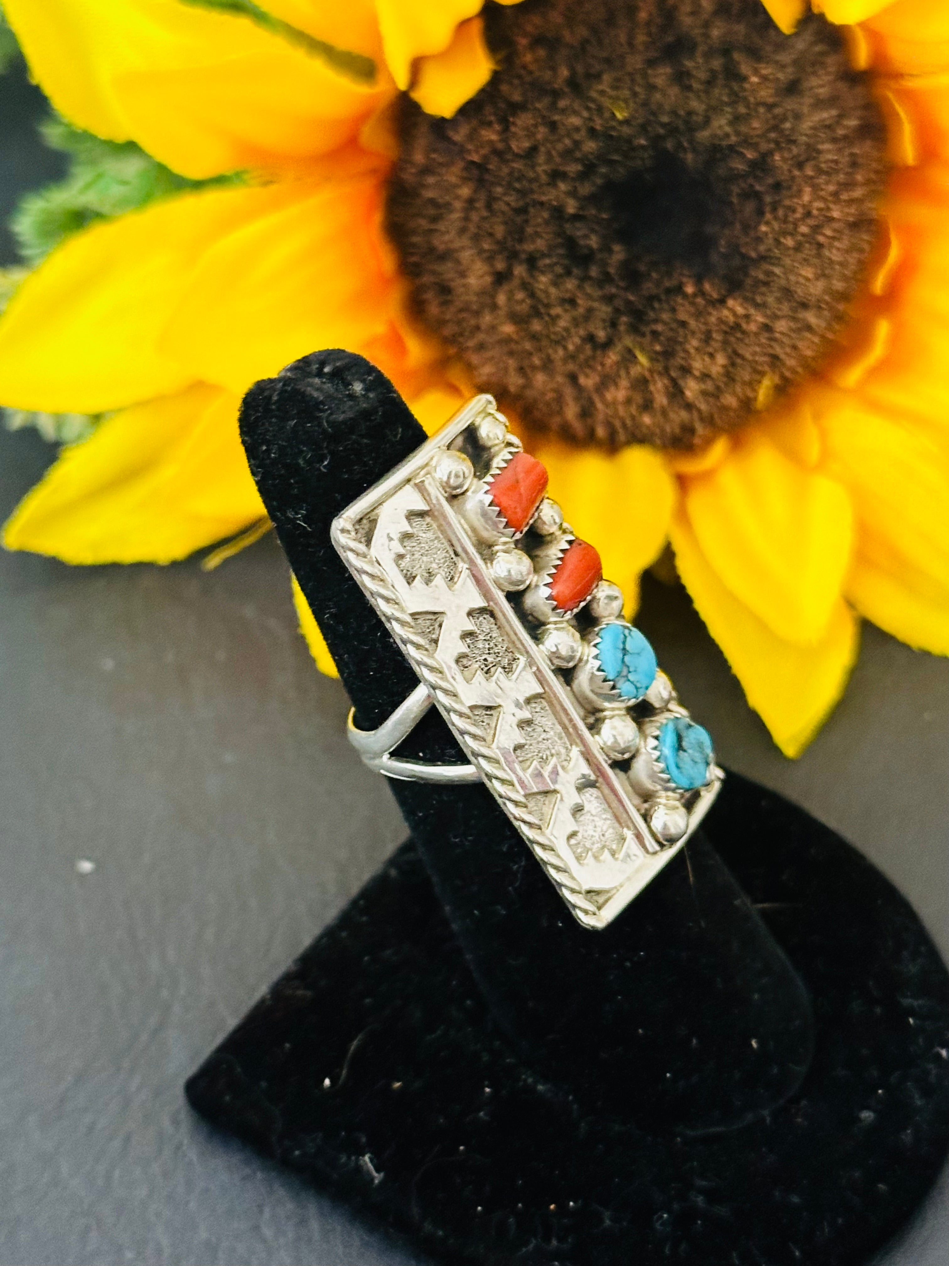 Navajo Made Multi Stone & Sterling Silver Ring Size 6.25. It measures 1 1/2 inches long and 7/8 of an inch wide. Signed by the artist and stamped sterling silver.