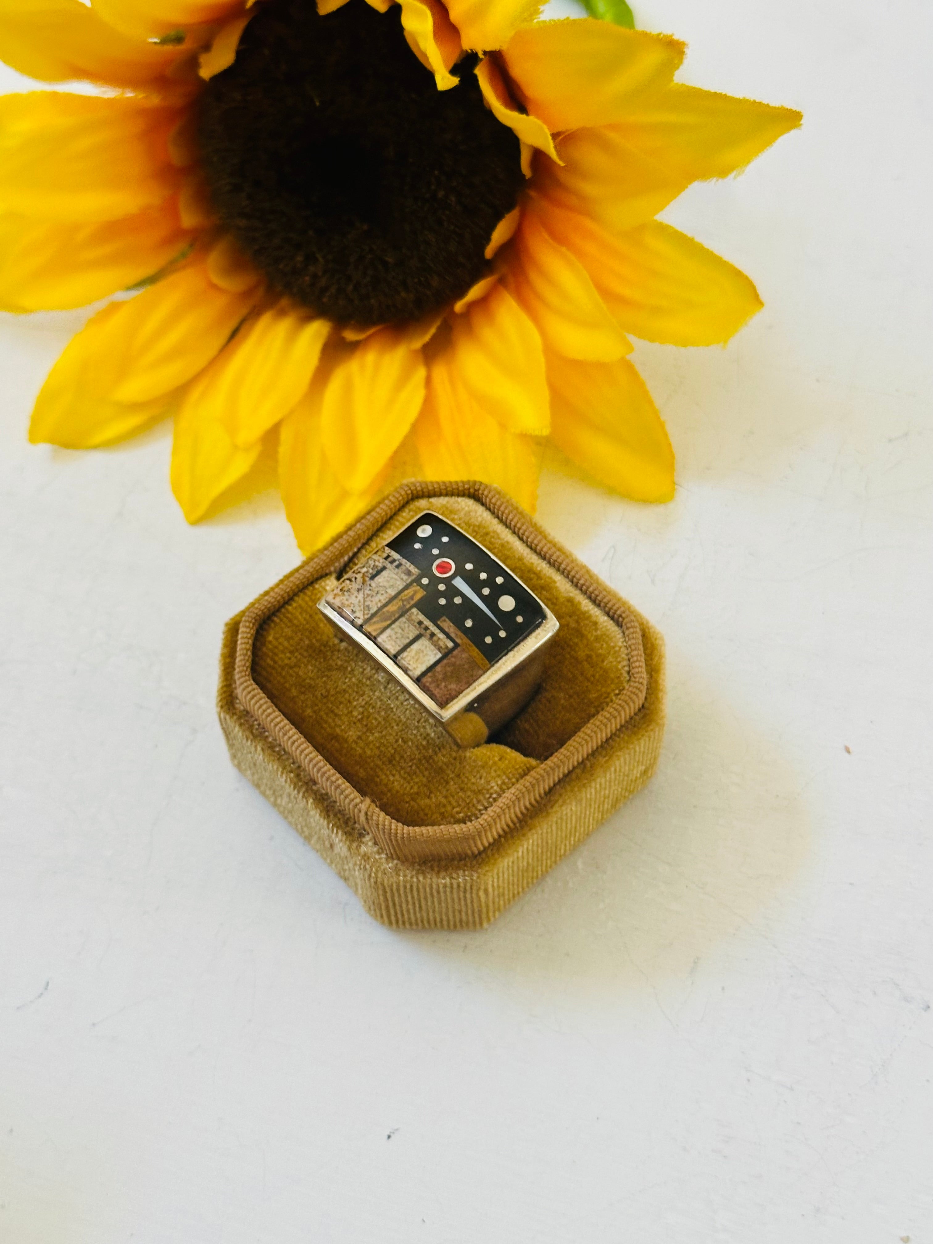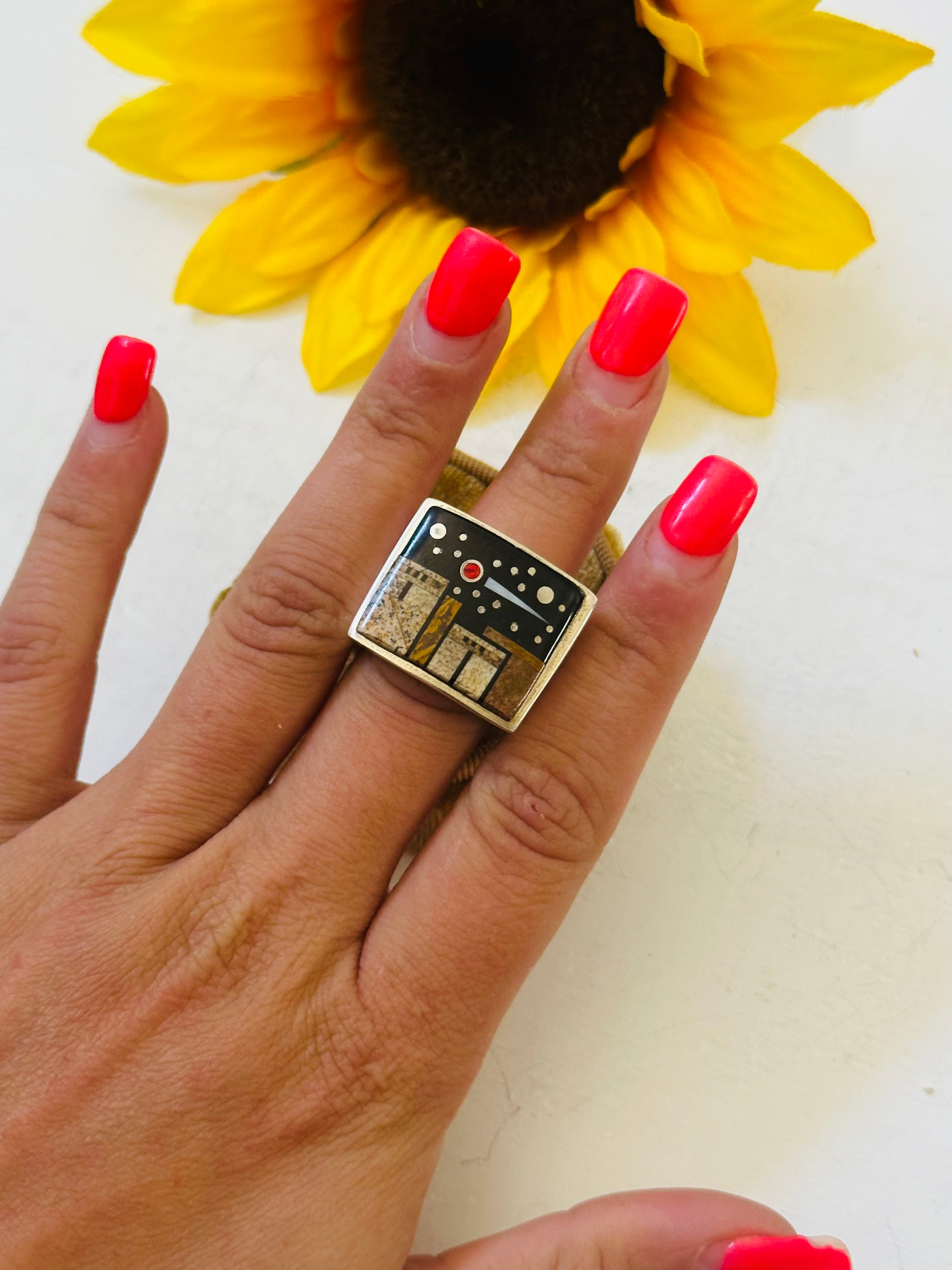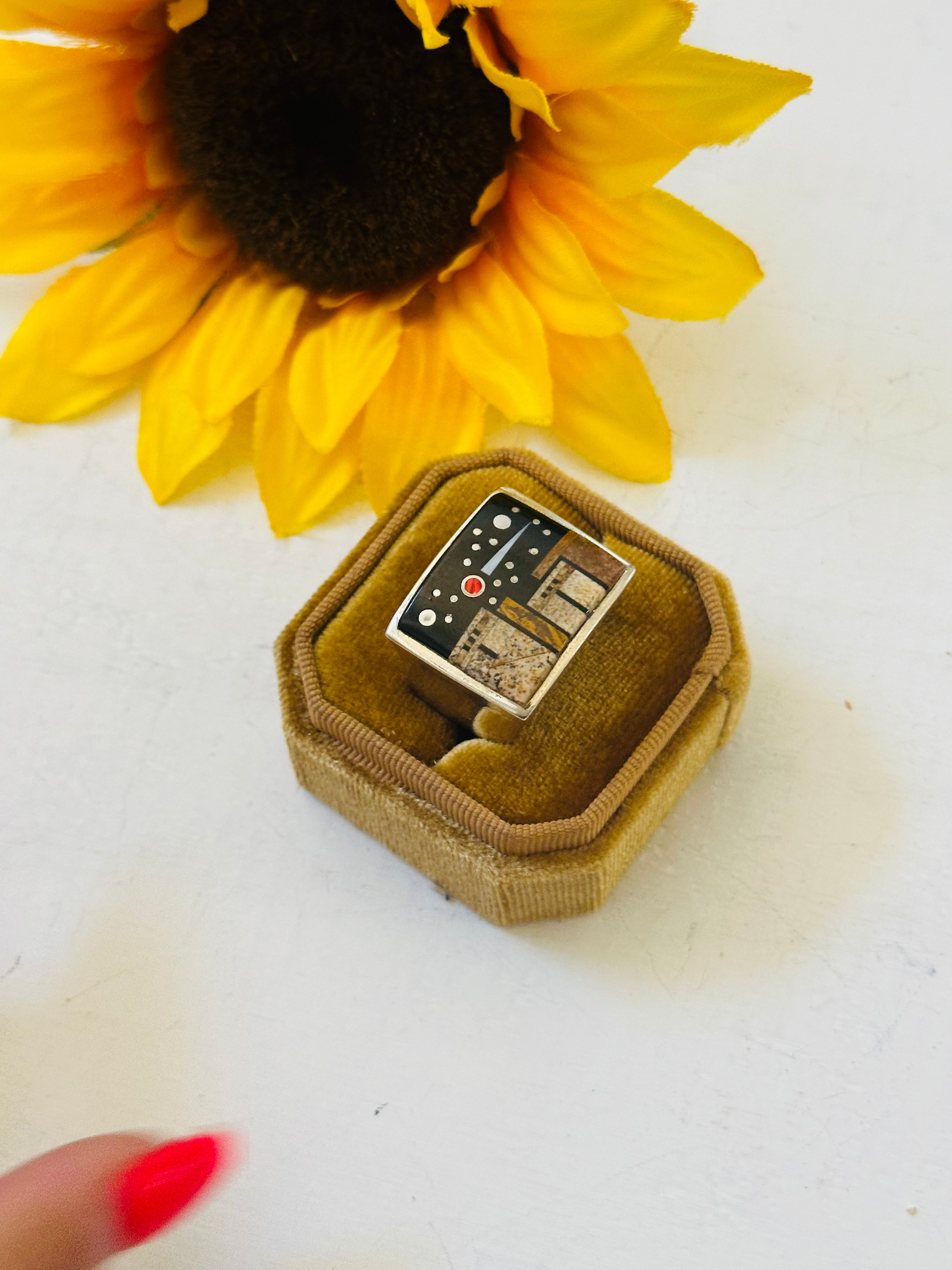 Beautiful ring. Clayton Tom Multi Stone & Sterling Silver Inlay Ring Size 10. It measures 1 inch long and 1 inch wide. Stamped sterling silver and signed.